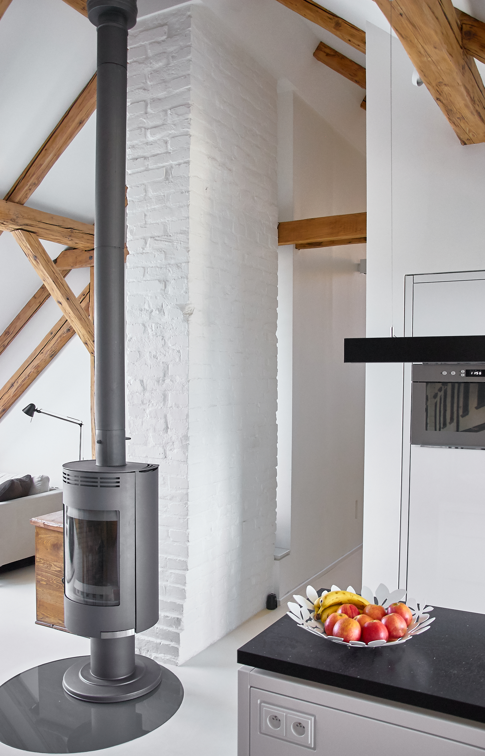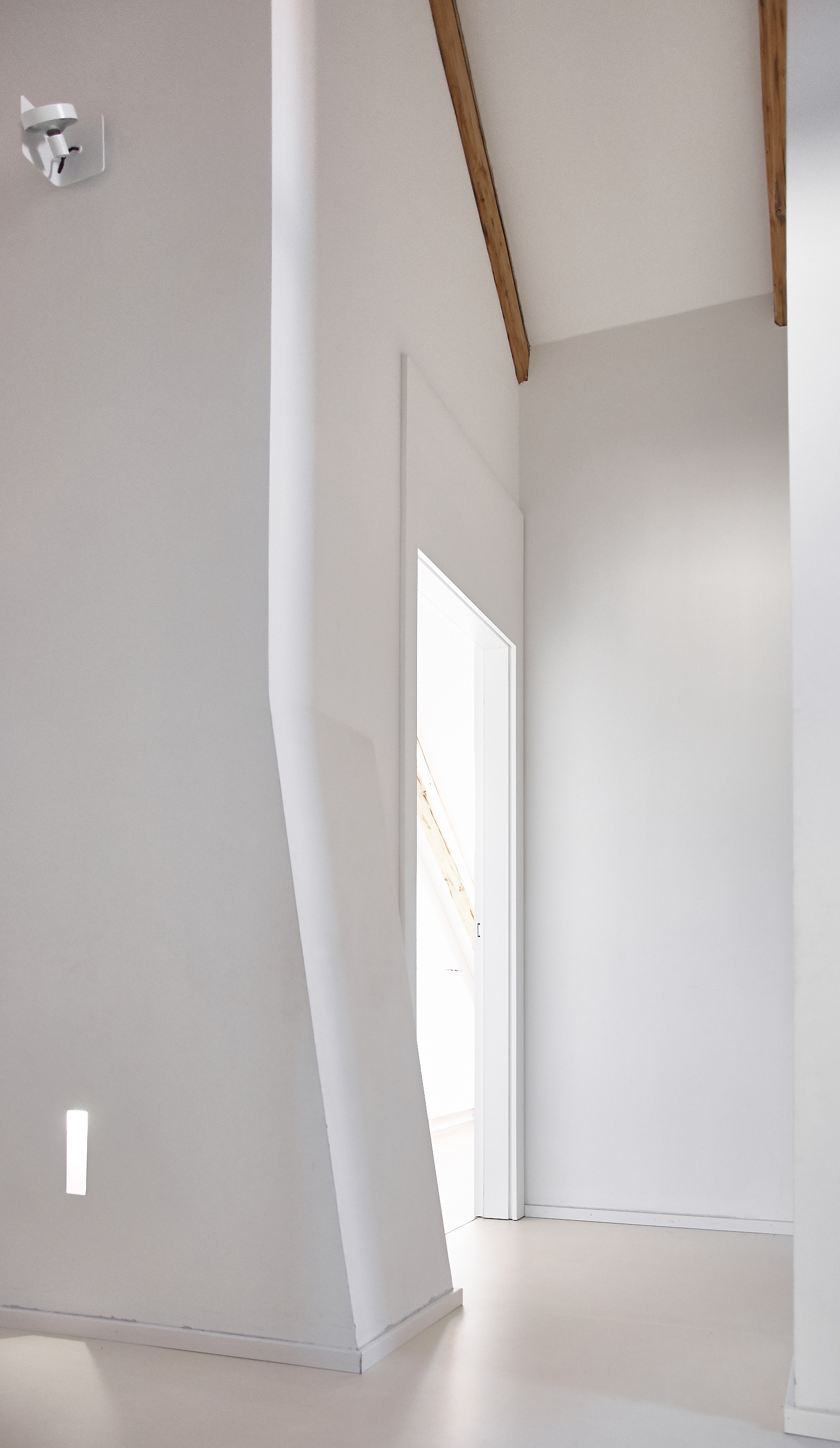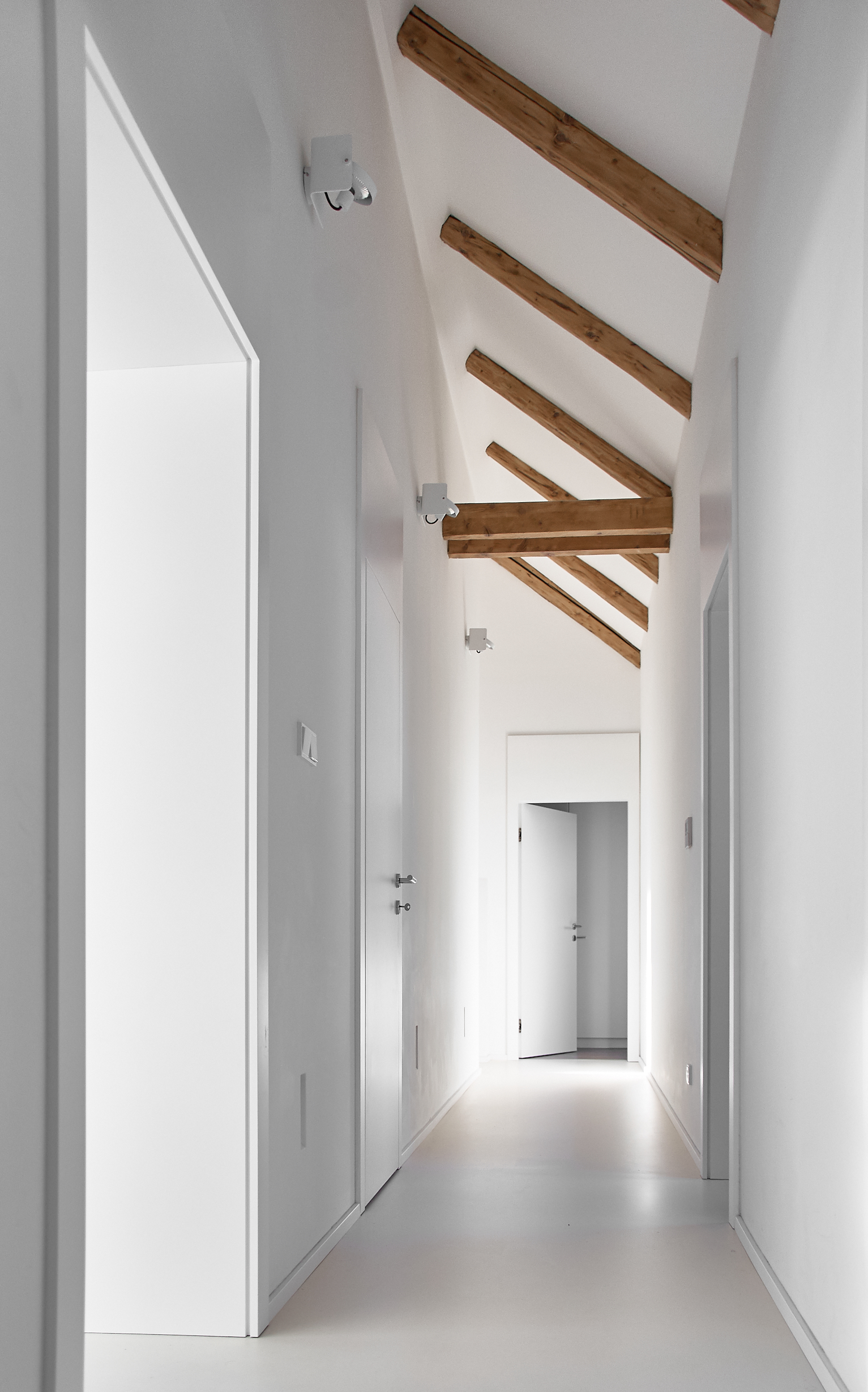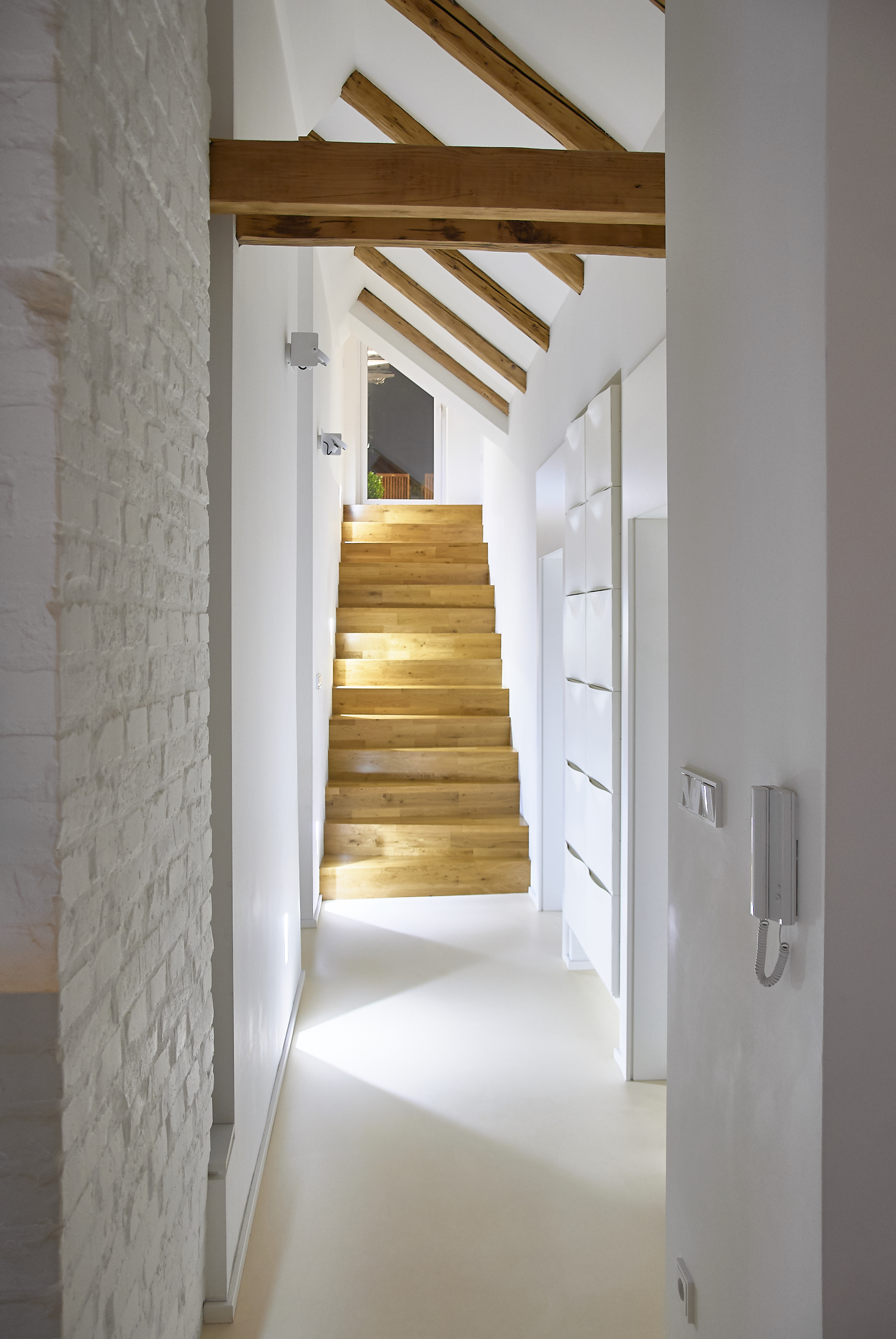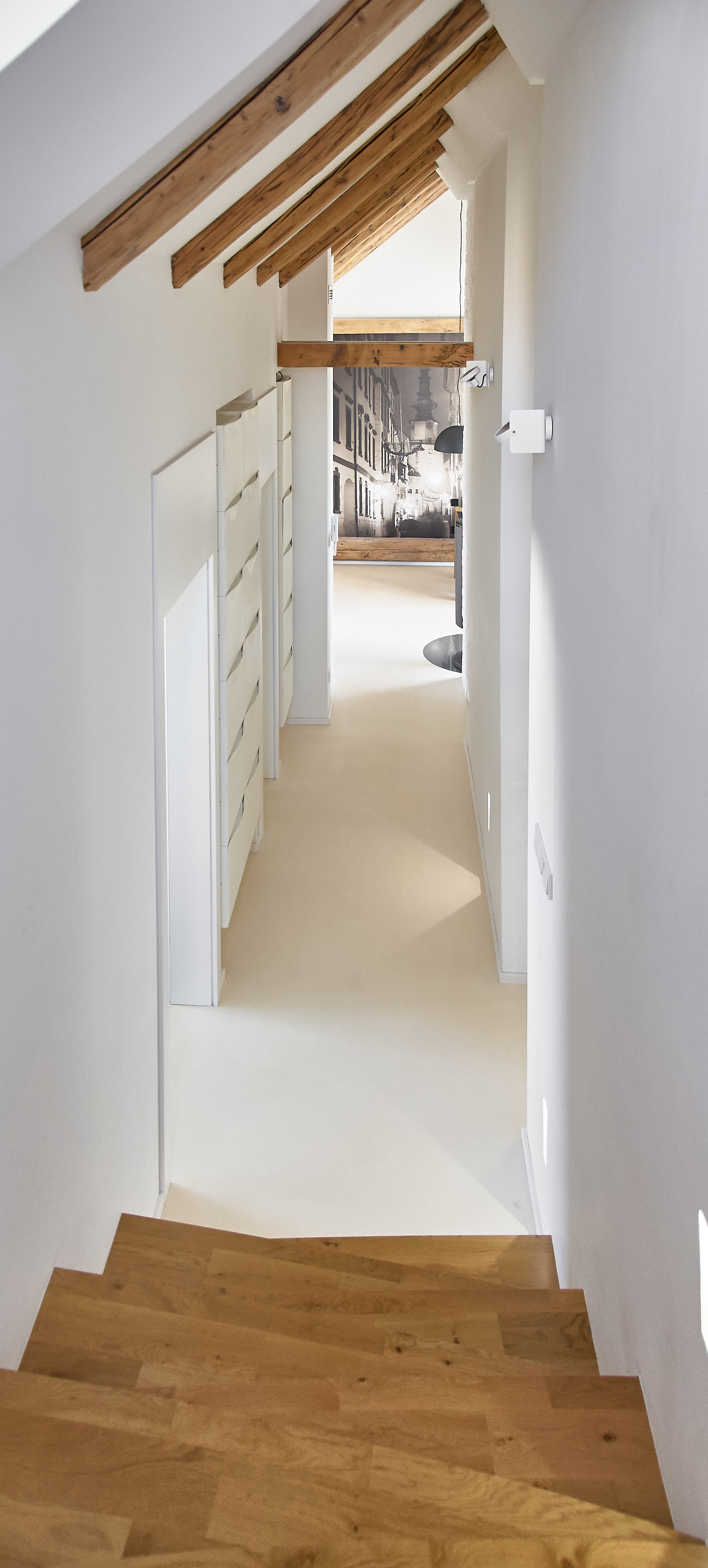 Otvorenie priestorov na plnú výšku krovu a dostatok svetla dodalo bytu vzdušnosť a pocitovo eliminuje zmenšenie objemu šikminami. Priznaný krov dáva interiéru svojský podkrovný charakter. Je jeho dominantou a jednotiacim prvkom. Biela farba stien a biela epoxidová podlaha v dennej zóne zámerne podporuje dominanciu krovu. Drevená podlaha v spálňach prináša priestorom komornejší charakter. V duchu presvedčenia, že farbu do priestoru prinesie jeho užívateľ, bola zvolená jednoduchá farebná schéma v kombinácii s prirodzeným výzorom použitých materiálov.