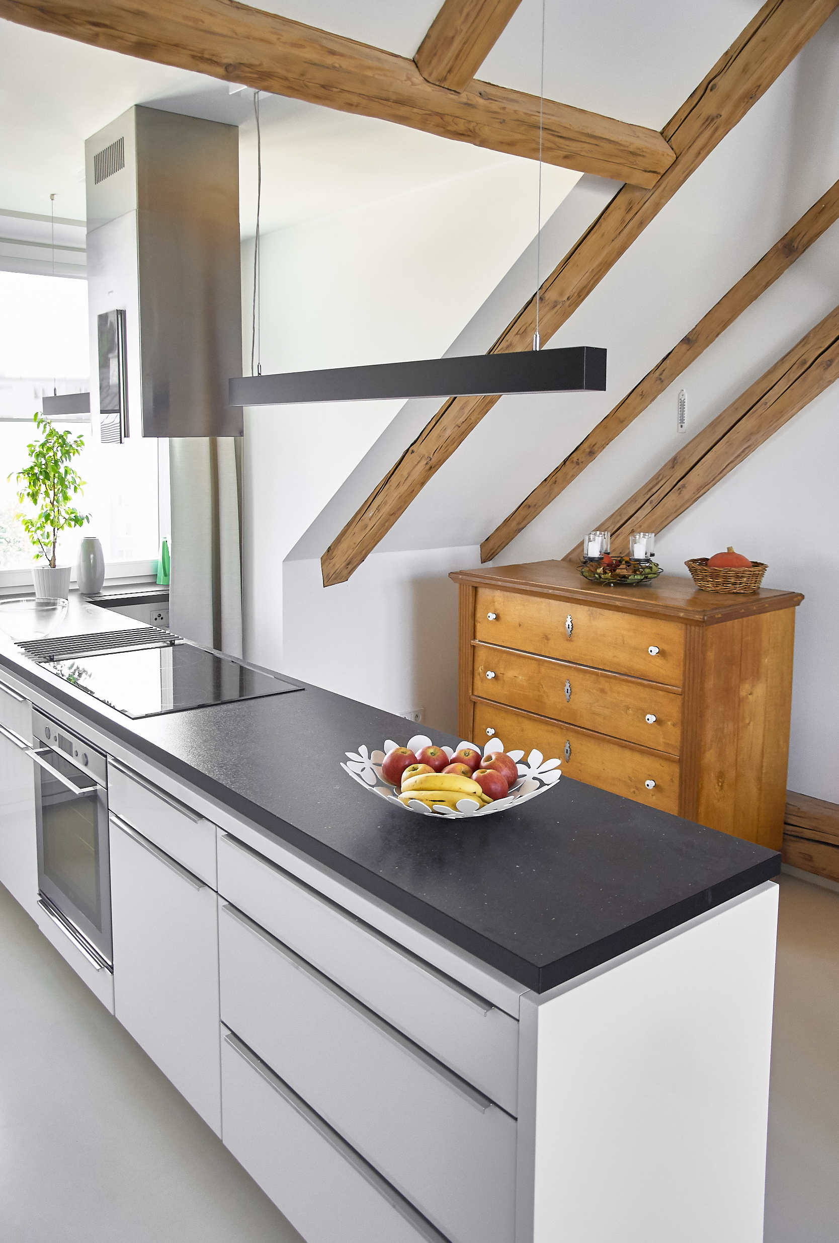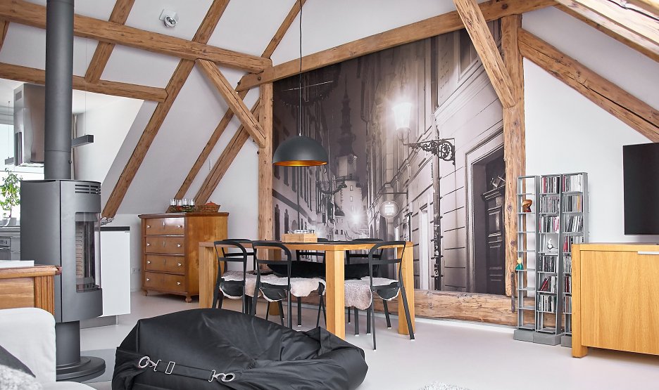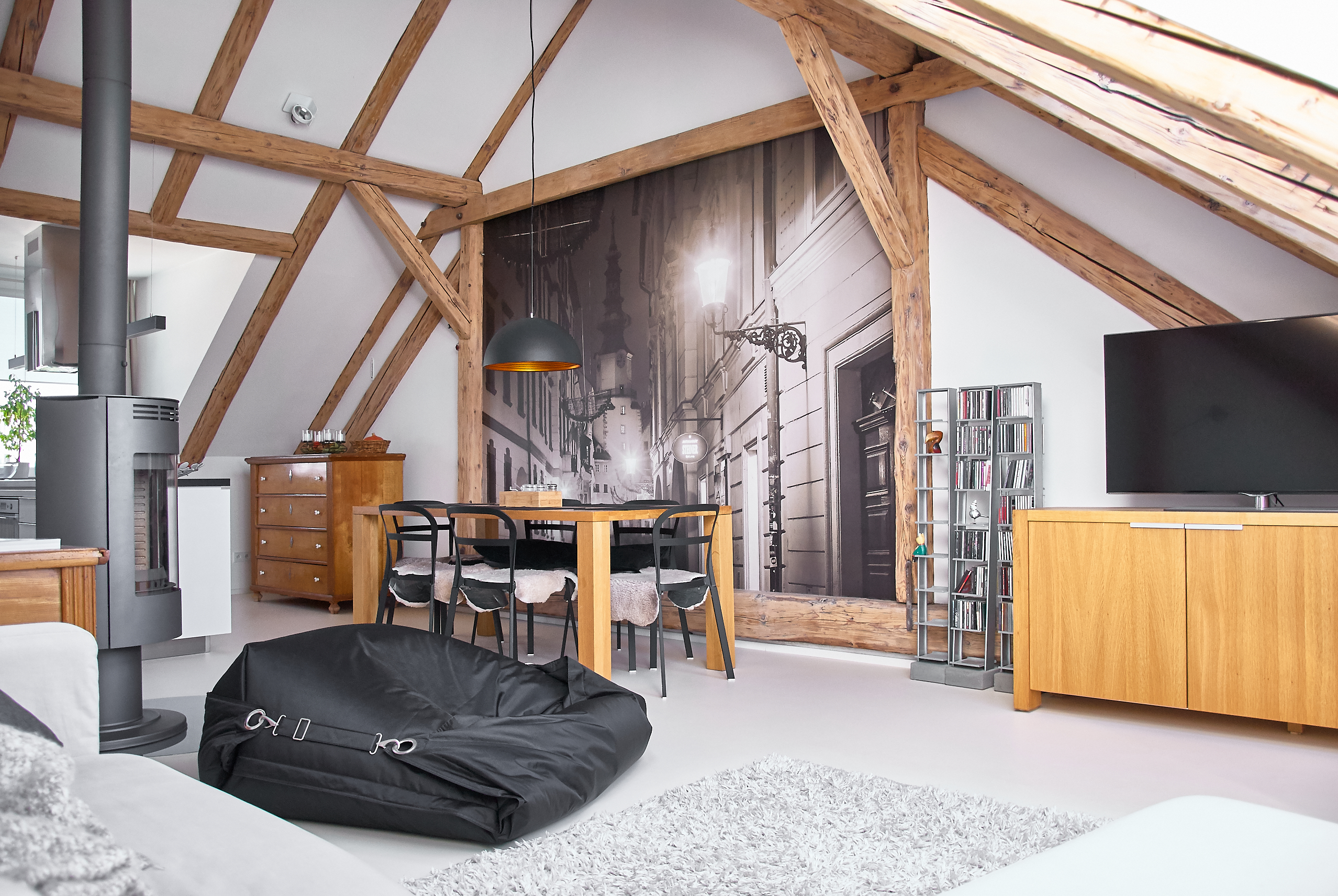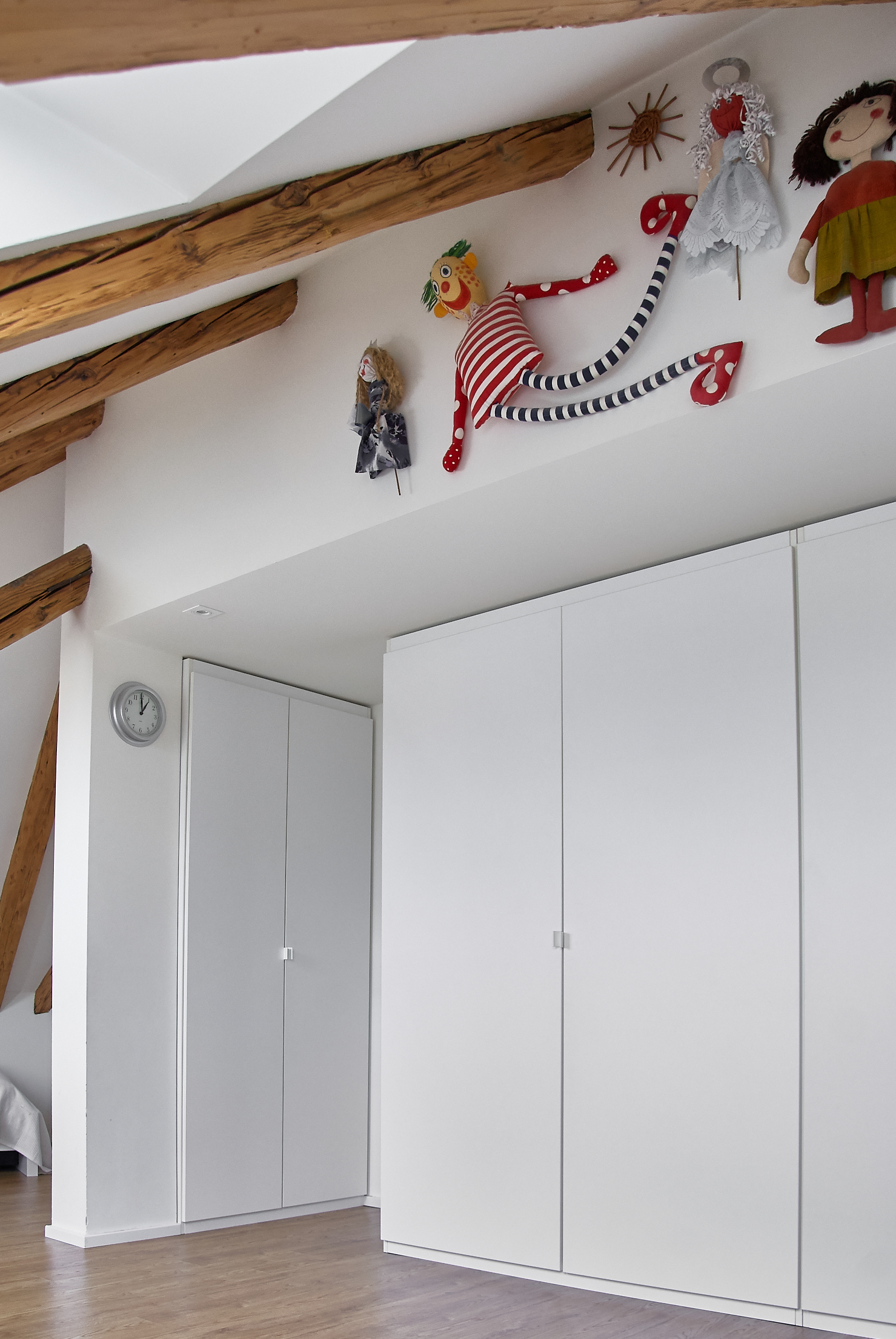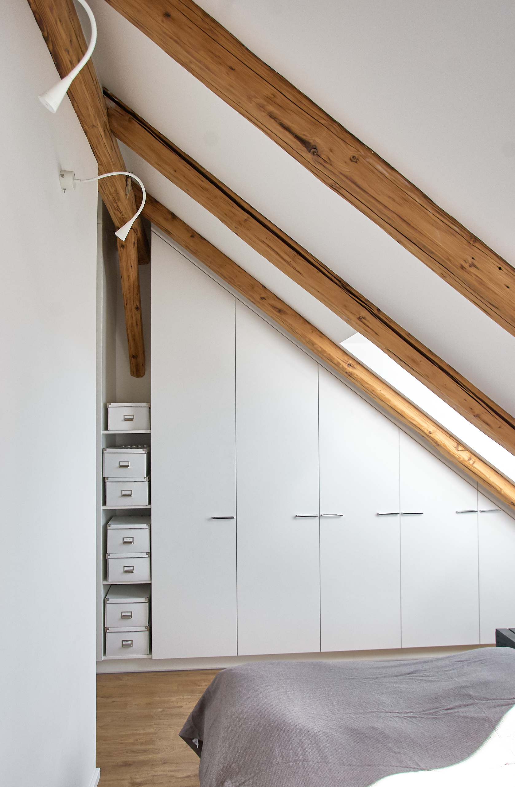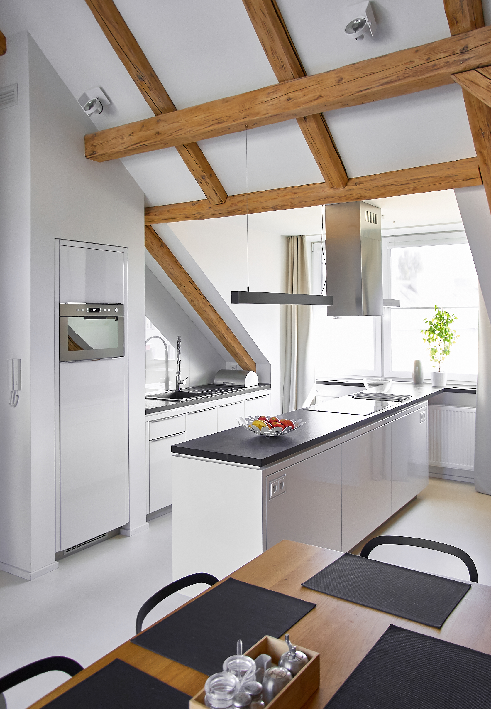 Otvorenie priestorov na plnú výšku krovu a dostatok svetla dodalo bytu vzdušnosť a pocitovo eliminuje zmenšenie objemu šikminami. Priznaný krov dáva interiéru svojský podkrovný charakter. Je jeho dominantou a jednotiacim prvkom. Biela farba stien a biela epoxidová podlaha v dennej zóne zámerne podporuje dominanciu krovu. Drevená podlaha v spálňach prináša priestorom komornejší charakter. V duchu presvedčenia, že farbu do priestoru prinesie jeho užívateľ, bola zvolená jednoduchá farebná schéma v kombinácii s prirodzeným výzorom použitých materiálov.