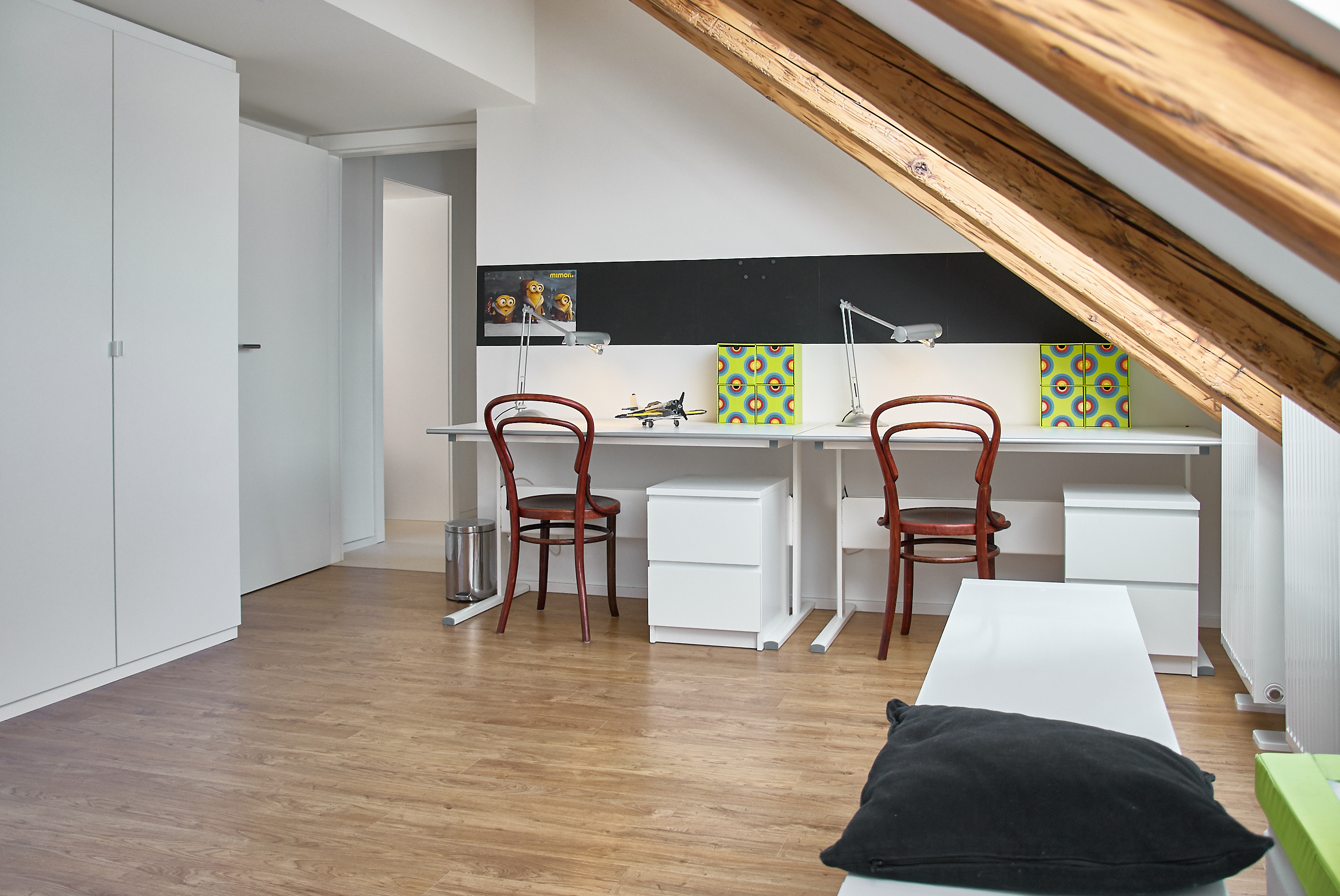 Výsledkom je podkrovný byt so strešnou terasou, ktorý vznikol pre štvorčlennú rodinu. Kostrou bytu je chodba pôdorysného tvaru Z, vedená pozdĺž komínov. Na ňu sú napojené všetky ostatné priestory. Tvar povaly a poloha vstupu si vyžiadali umiestnenie hlavného obytného priestoru do vzdialenejšej časti podkrovia. Tým došlo k netypickému umiestneniu nočnej zóny pri vstupe do bytu.