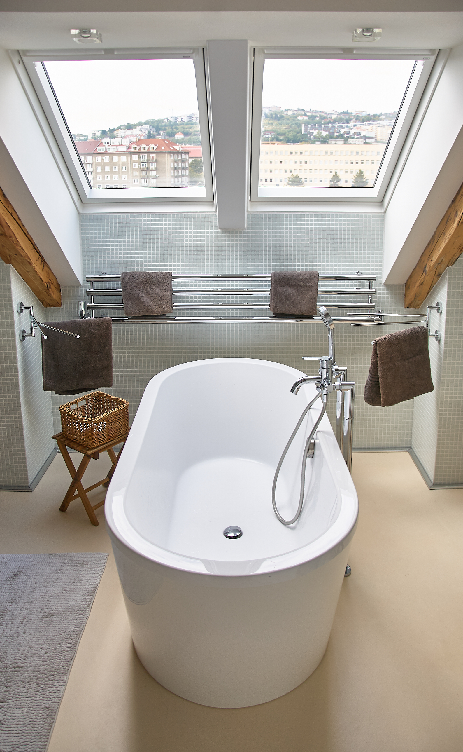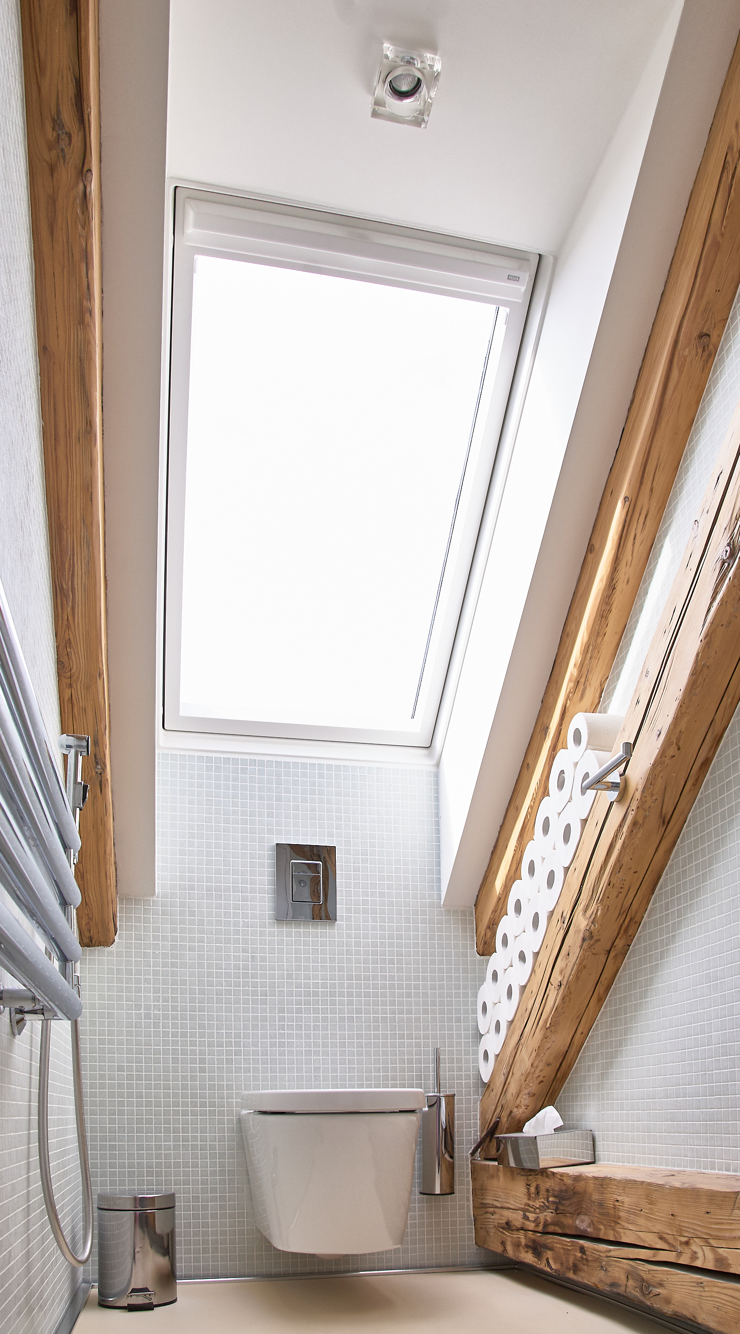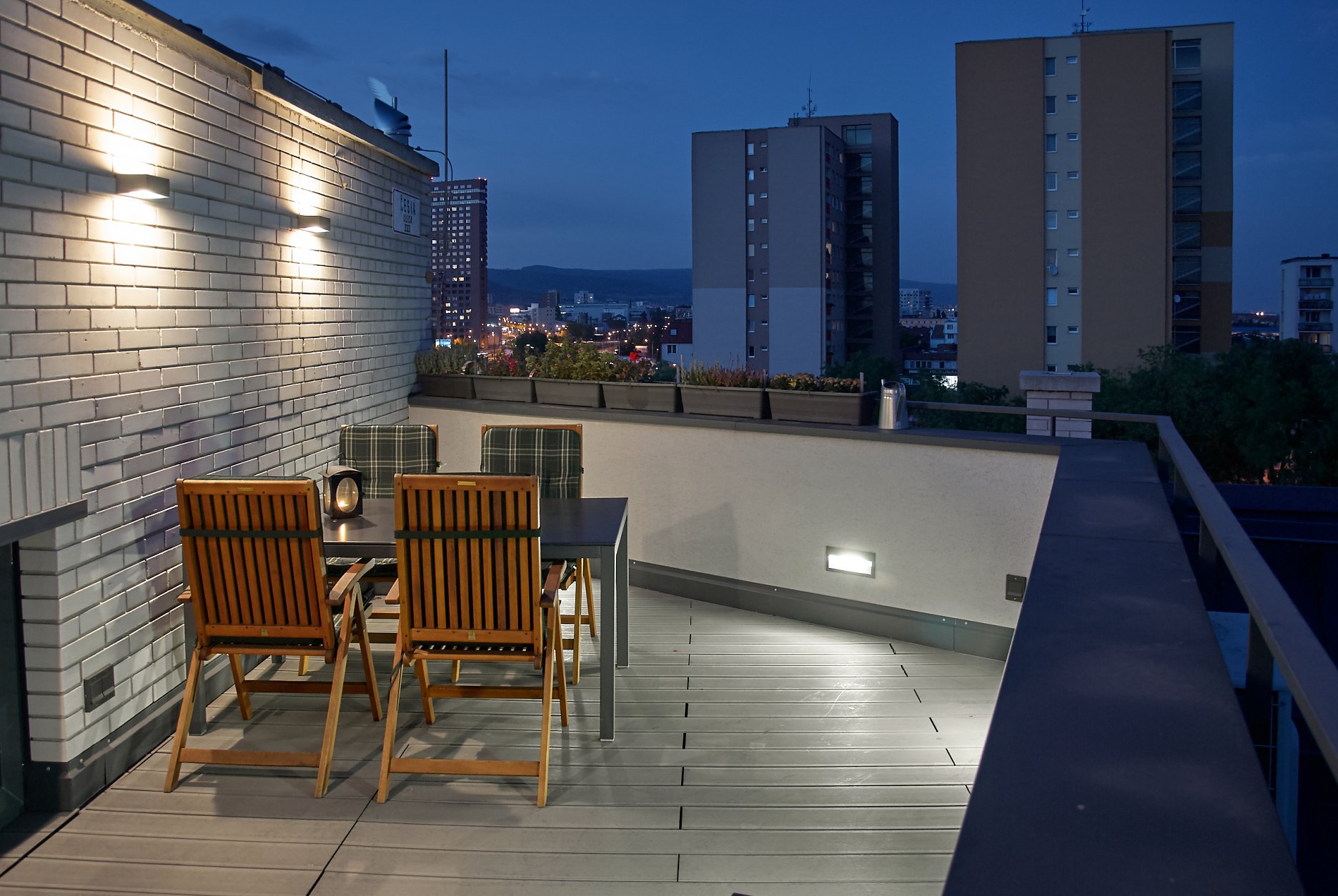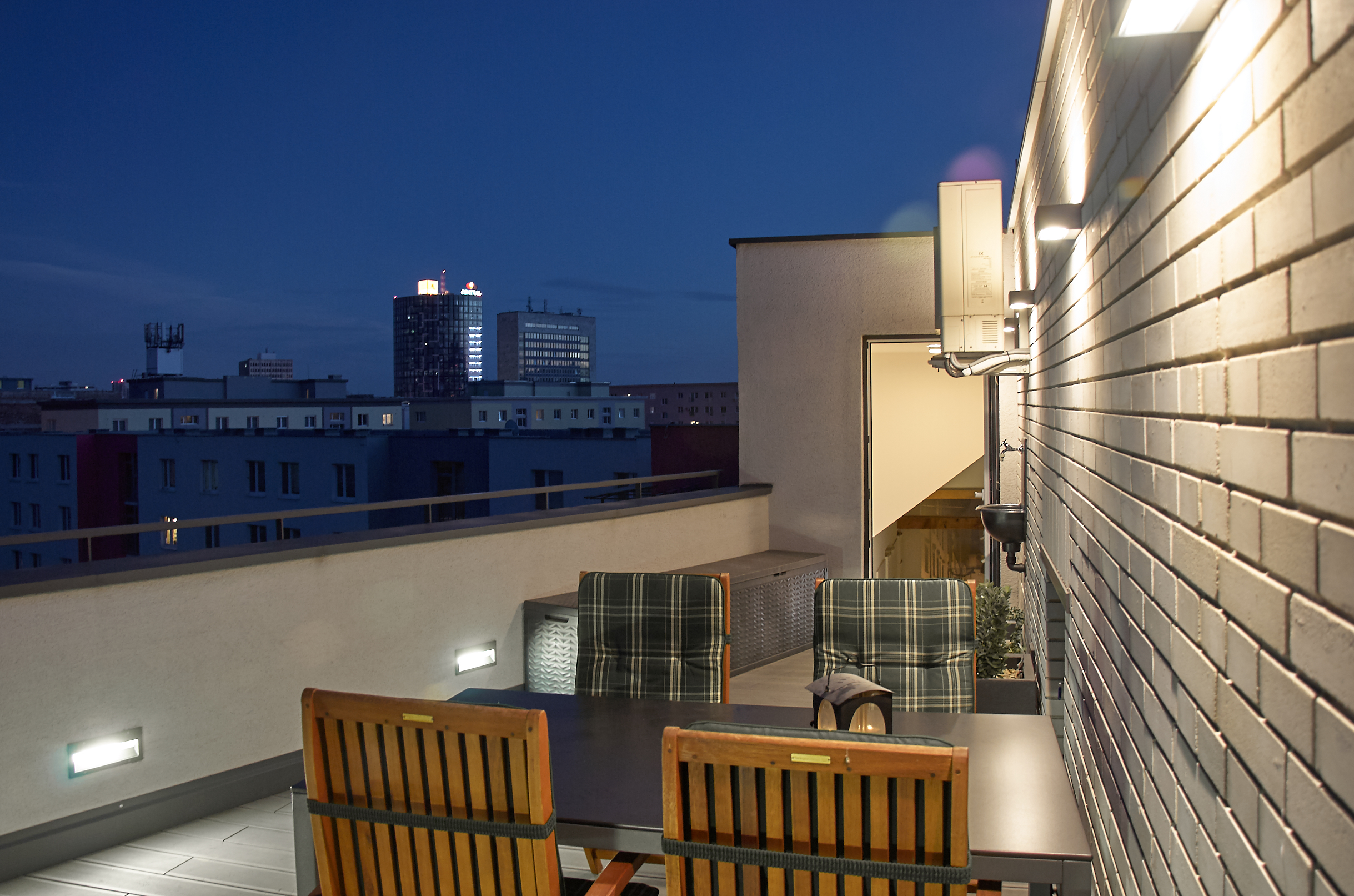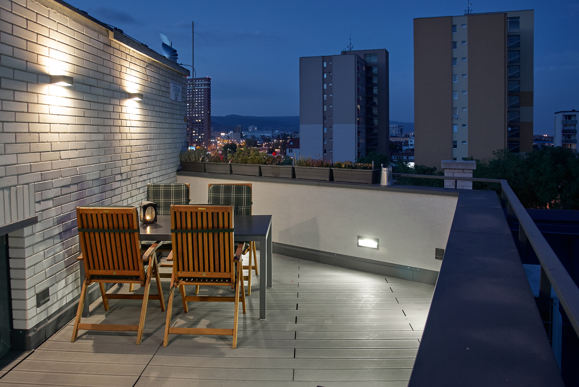 Časť šikmej strechy nad vstupom do bytu bola nahradená strešnou terasou prístupnou mlynárskymi schodmi z chodby. Vloženie medzistropu v časti detskej izby umožnilo vytvoriť pre strešnú terasu malý sklad.