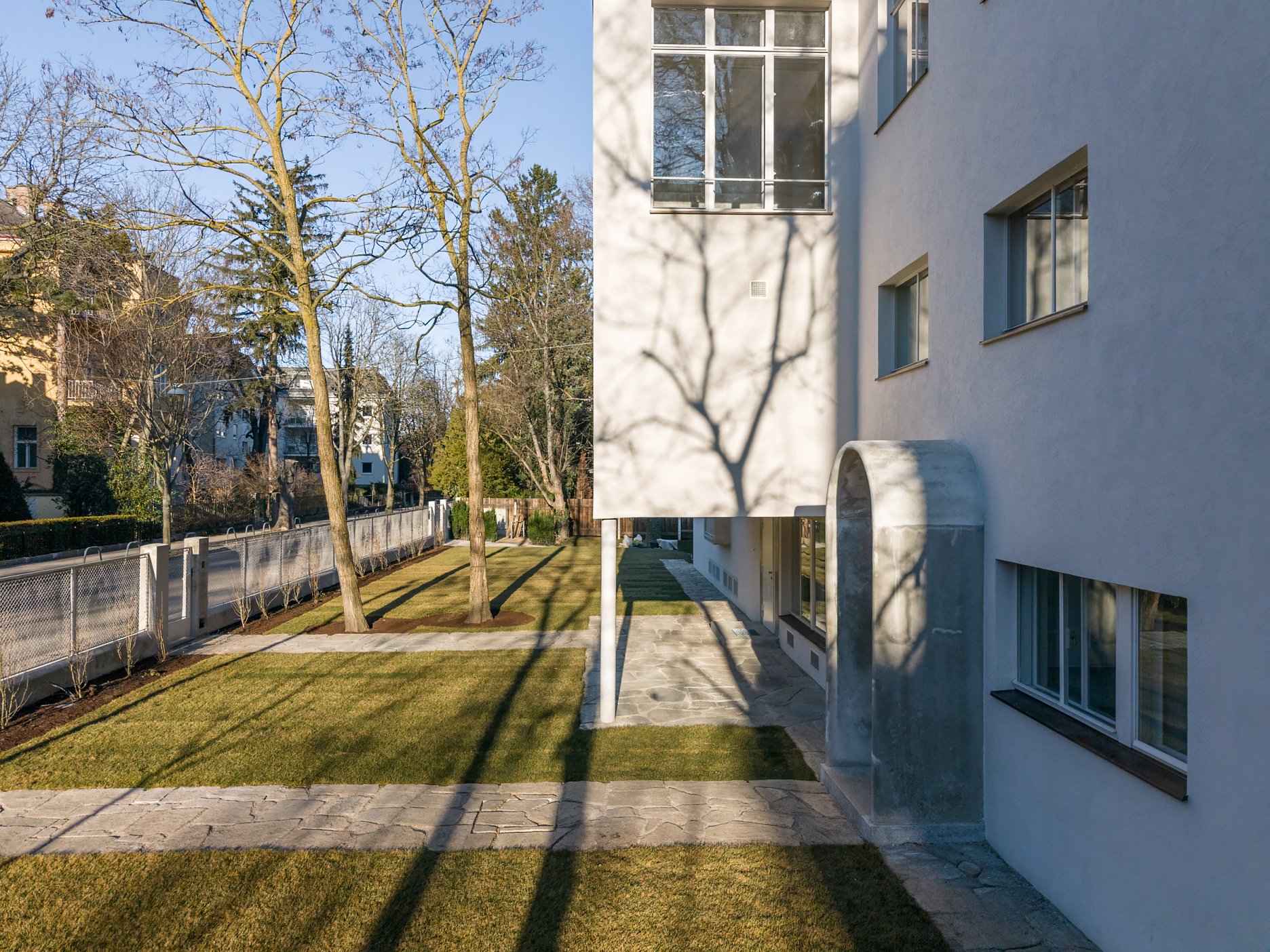 Súčasťou obnovy je aj revitalizácia záhrady. Návrh pracuje s historickým kontextom pozemku a posilňuje vzťah domu a exteriéru – prirodzene nadväzujúc na Frankovu koncepciu, v ktorej je príroda integrálnou súčasťou bývania. Pozornosť sa venovala aj zachovaniu existujúcich drevín a obnove významných stromov pri vile.