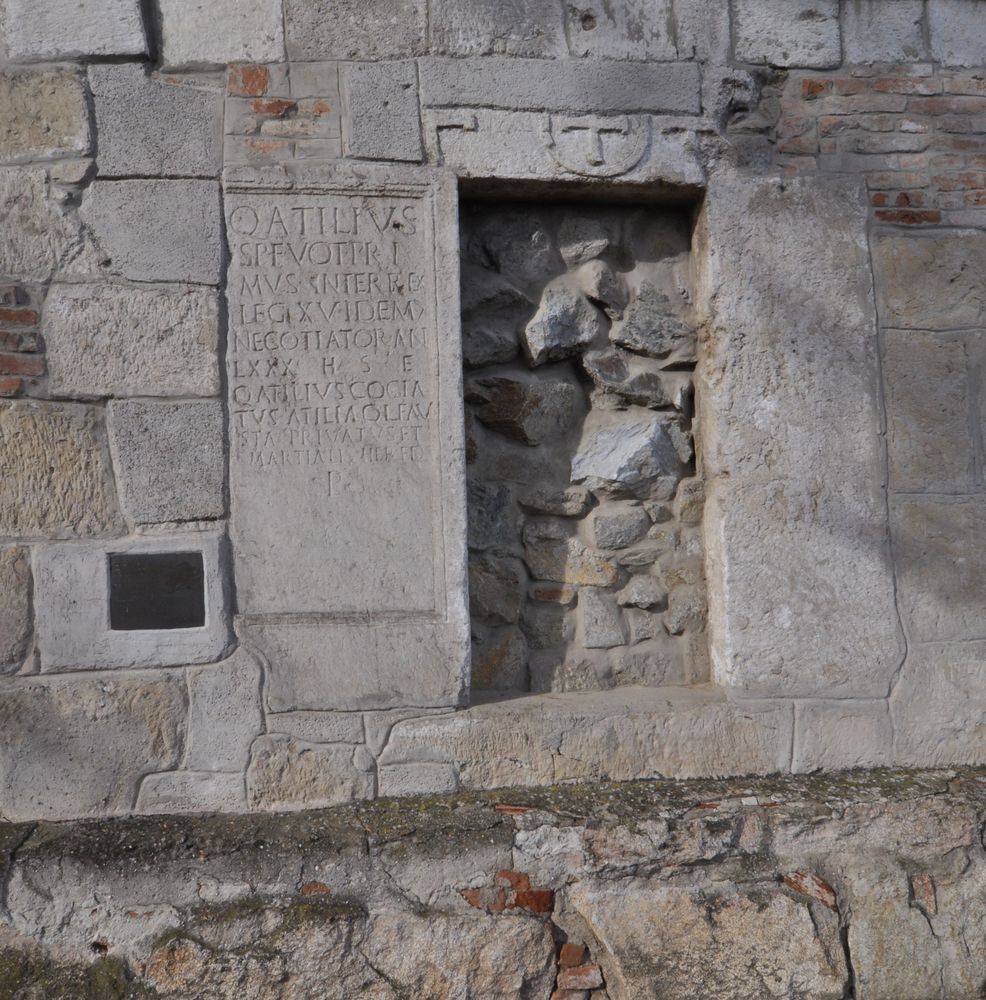 Ľavý náhrobný kameň portálu patrí rímskemu stotníkovi a obchodníkovi Quintovi Atiliovi Primovi a pochádza z obdobia rokov 90 - 130 po Kr. Nápis na ňom predstavuje najstaršiu písomnú pamiatku svojho druhu na Slovensku. Nevieme, kedy bol do steny kostola zamurovaný. Nie je vylúčené, že nápis alebo výzdobu nesie aj pravý náhrobný kameň, mohlo však ísť o "ideologicky" nevhodný obsah, pripomínajúci rímske náboženstvo. To by vysvetľovalo, prečo bol zamurovaný opačne.