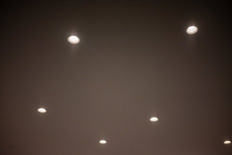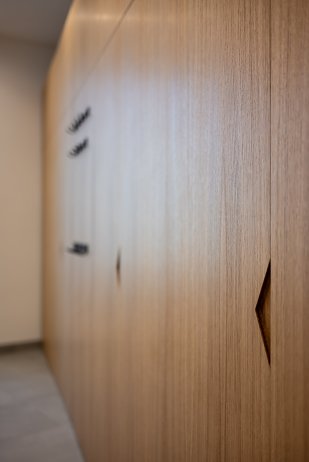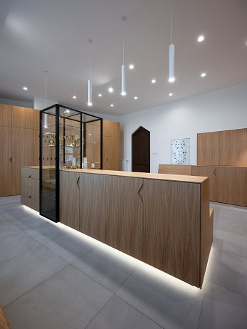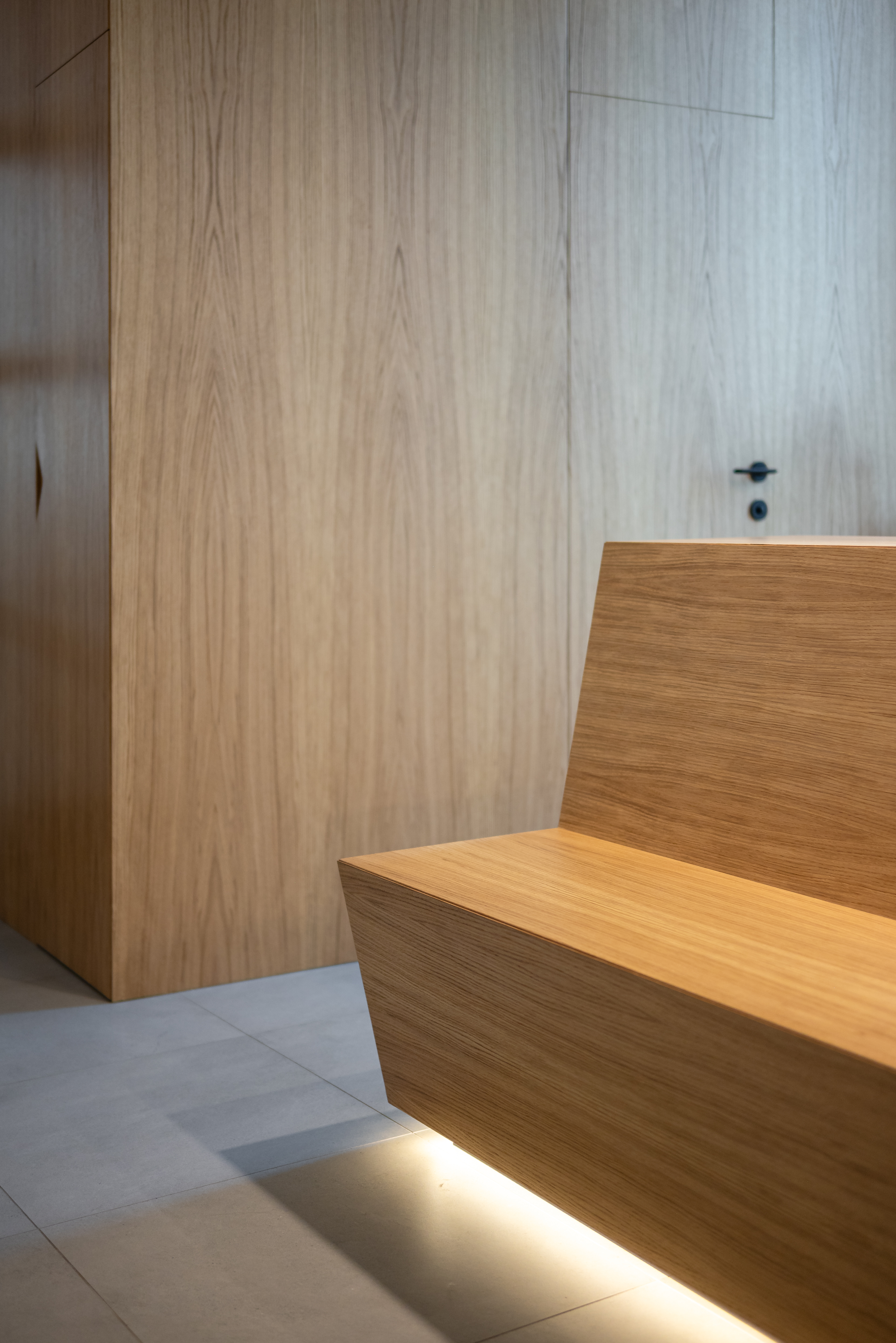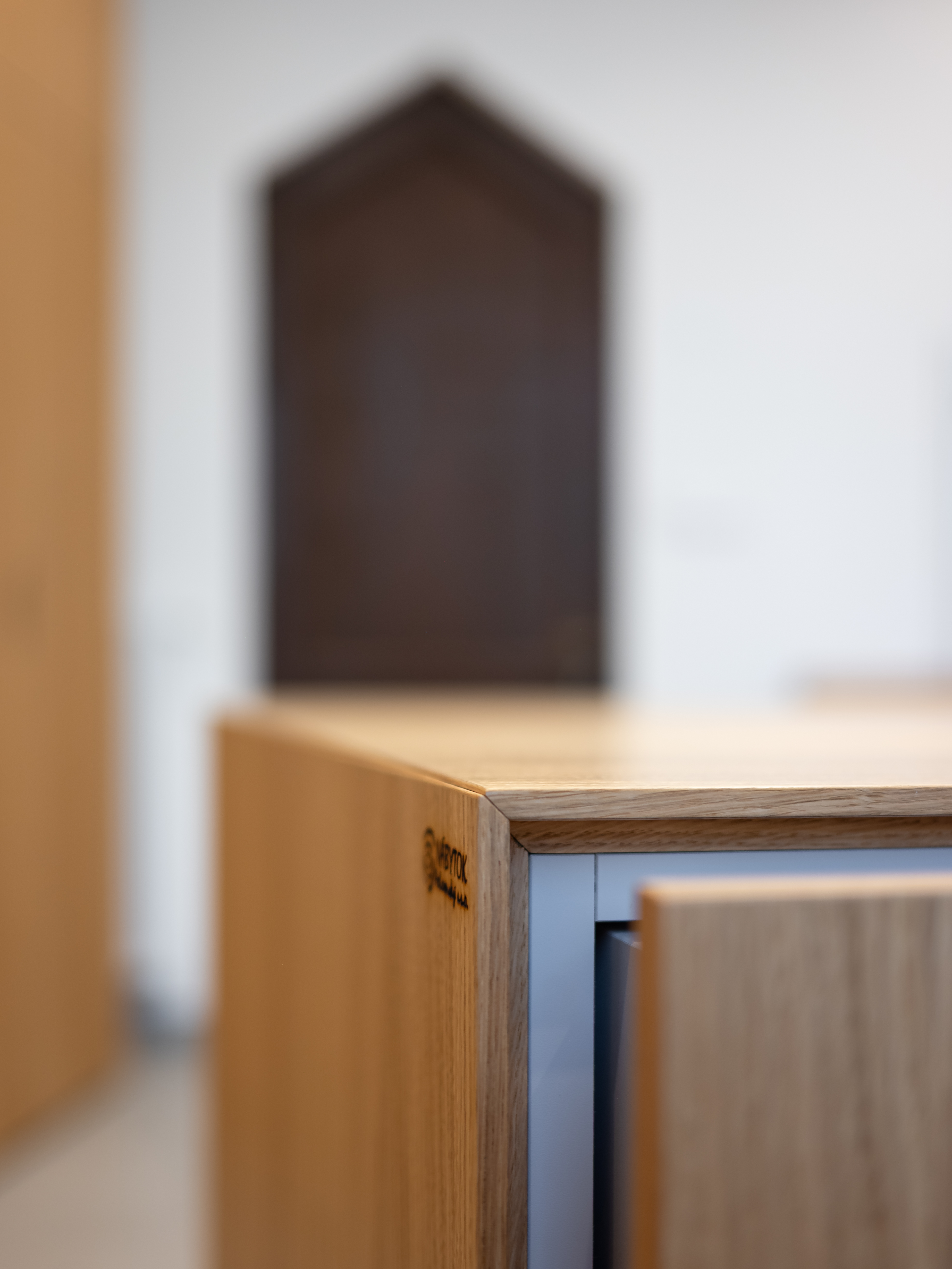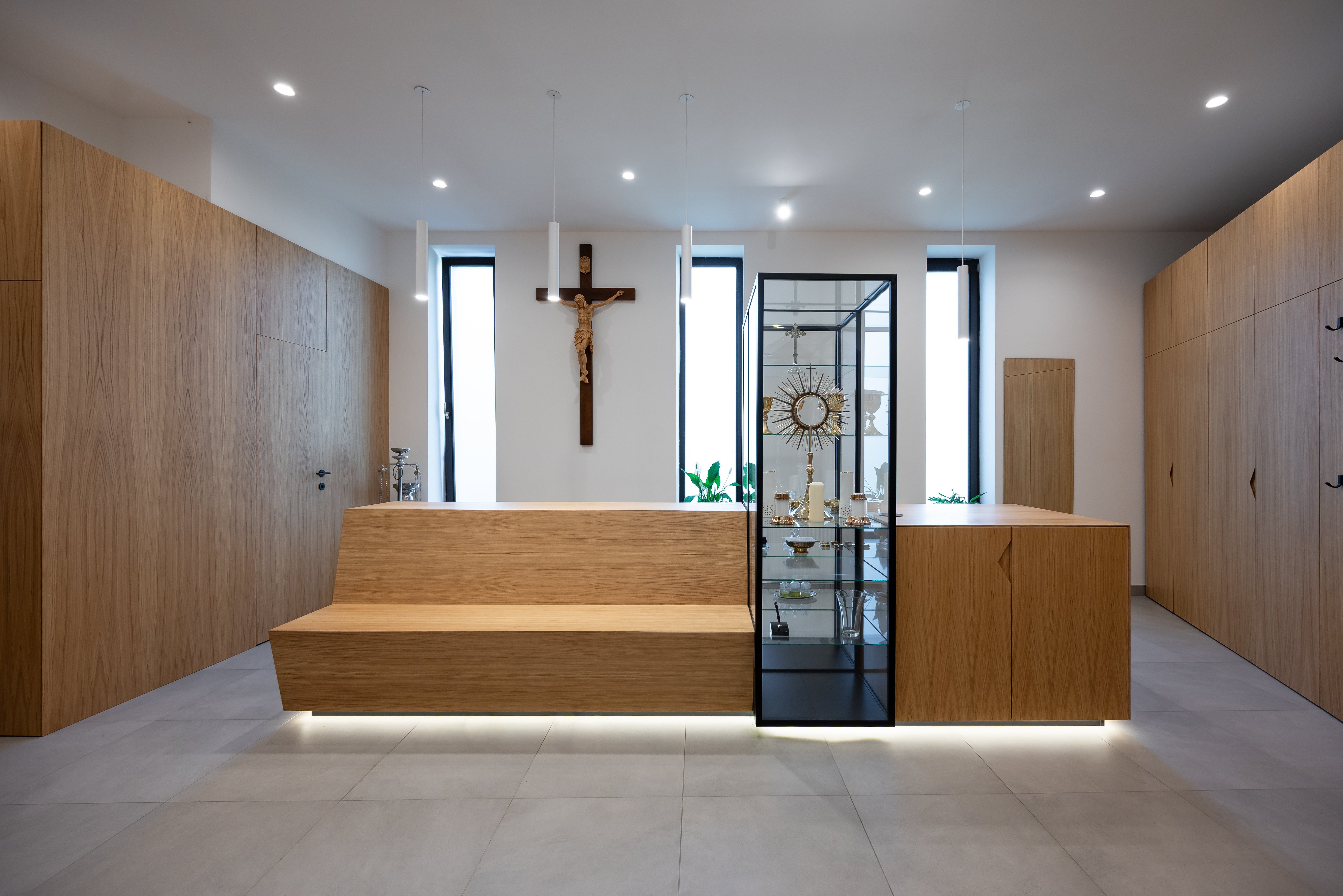 Precízne vyrobené stolárske výrobky dotvárajú stropné osvetlenia nad celou sakristiou. Zavesené svietidla sú akcentované nad ostrovčekom a priestorom pre lektorov.