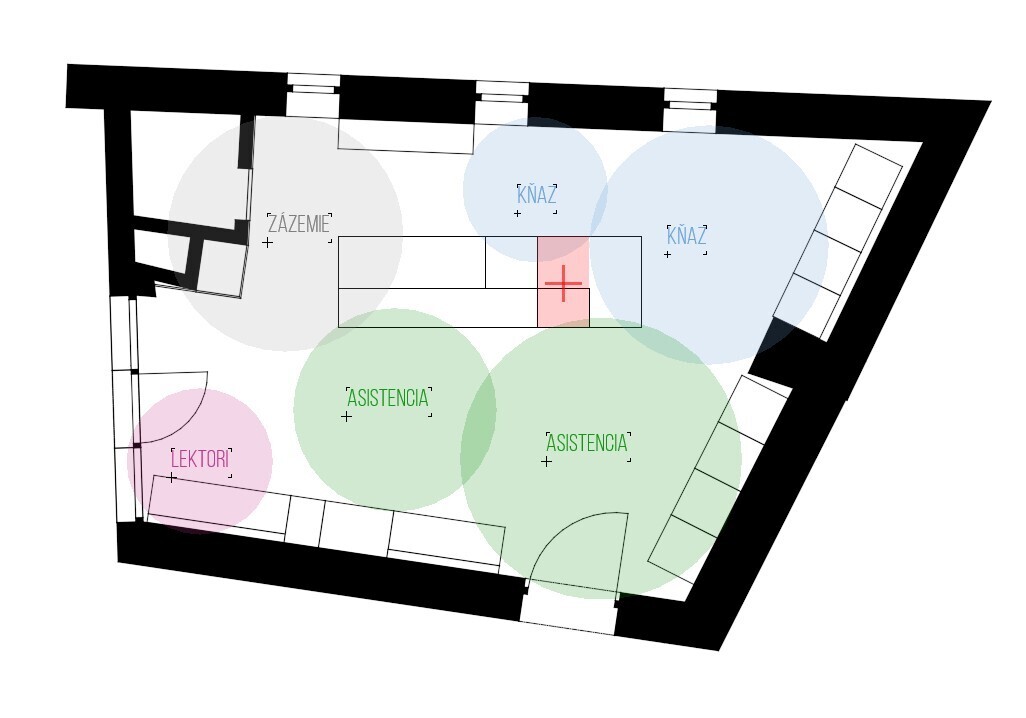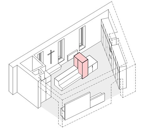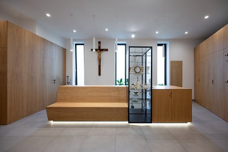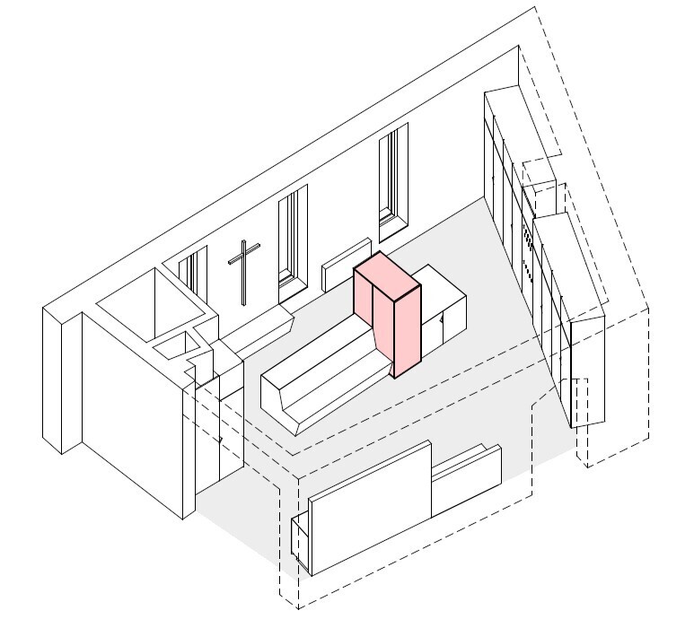 Tak ako v každom chráme je stredobodom bohostánok (Kristus), aj v tomto priestore sme sa snažili dať do stredu duchovnú podstatu (Krista). Podarilo sa nám to pomocou ostrova, ktorý je umiestnený v centrálnej časti a plní primárnu funkciu. Akcentom ostrova je presklená vitrína, v ktorej sú uložené najdôležitejšie predmety na slávenie bohoslužby (kalich, chlieb, víno, monštrancia a pod.). Ostrov je doplnení o sedenie pre asistenciu a priestor pre kňaza. Umiestnenie solitéru logicky rozdeľuje priestor na ďalšie funkcie, ktoré sú doplnené o vstavané nábytky (priestor pre kňaza, asistenciu a lektorov, úložné priestory, wc a pod.)
