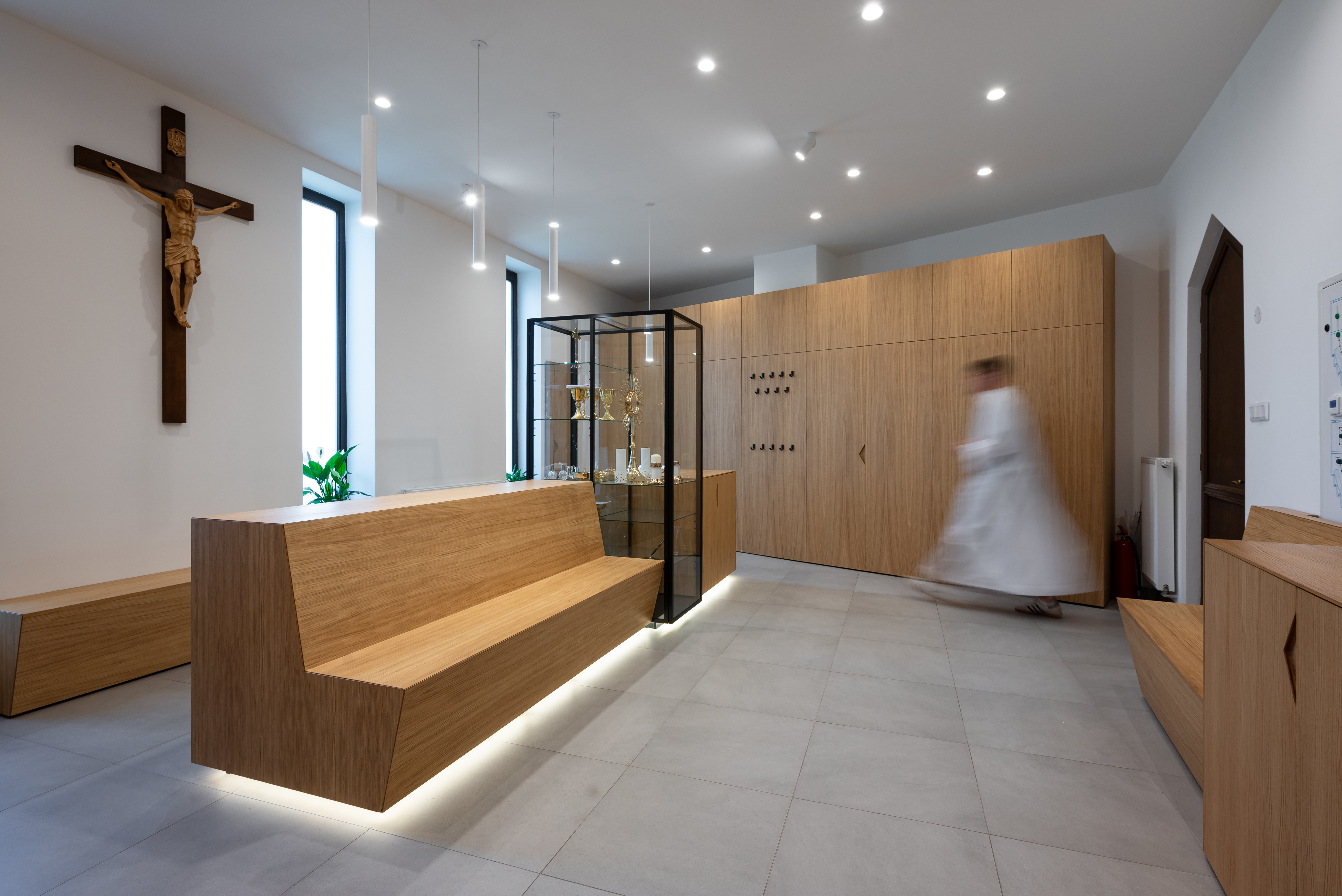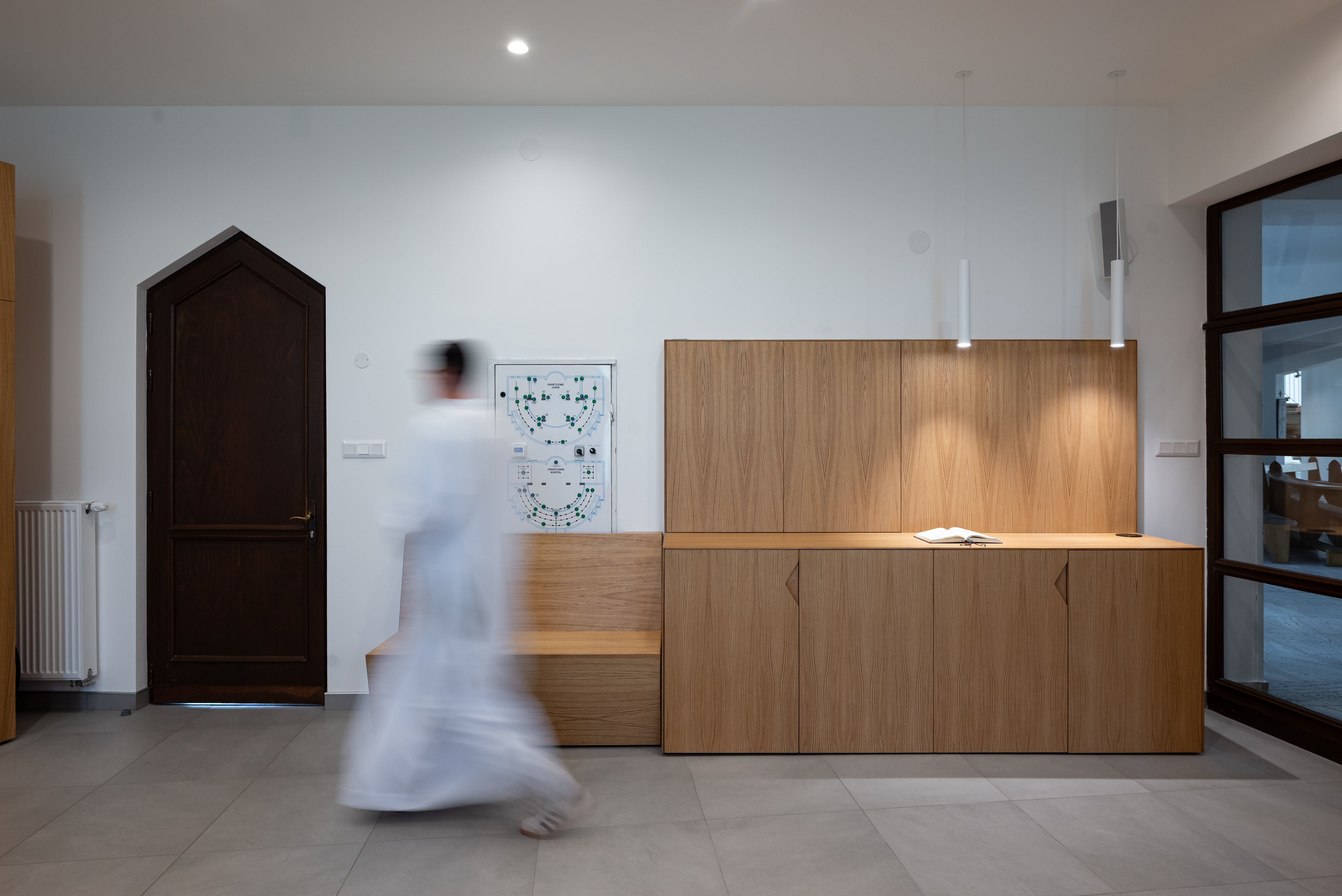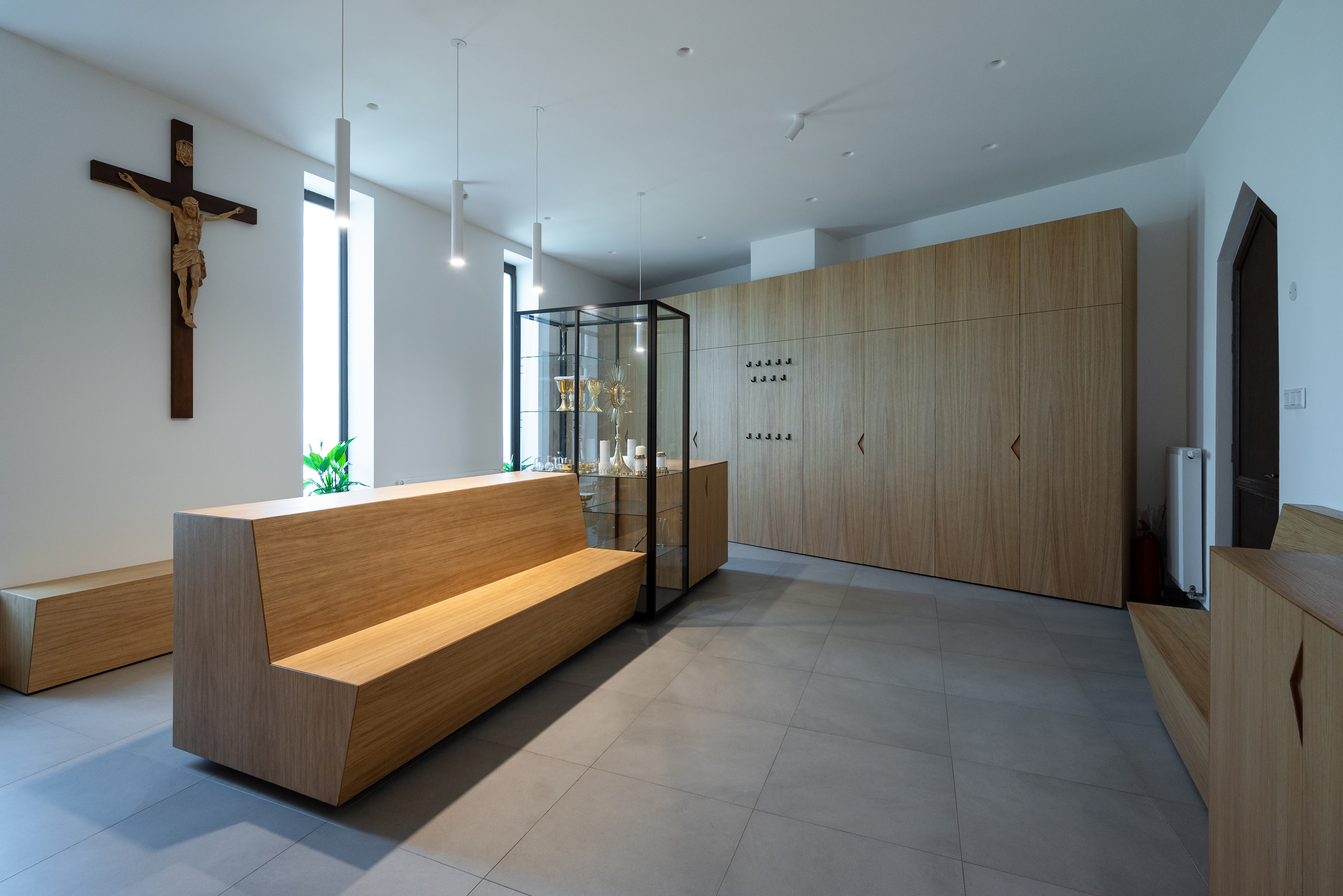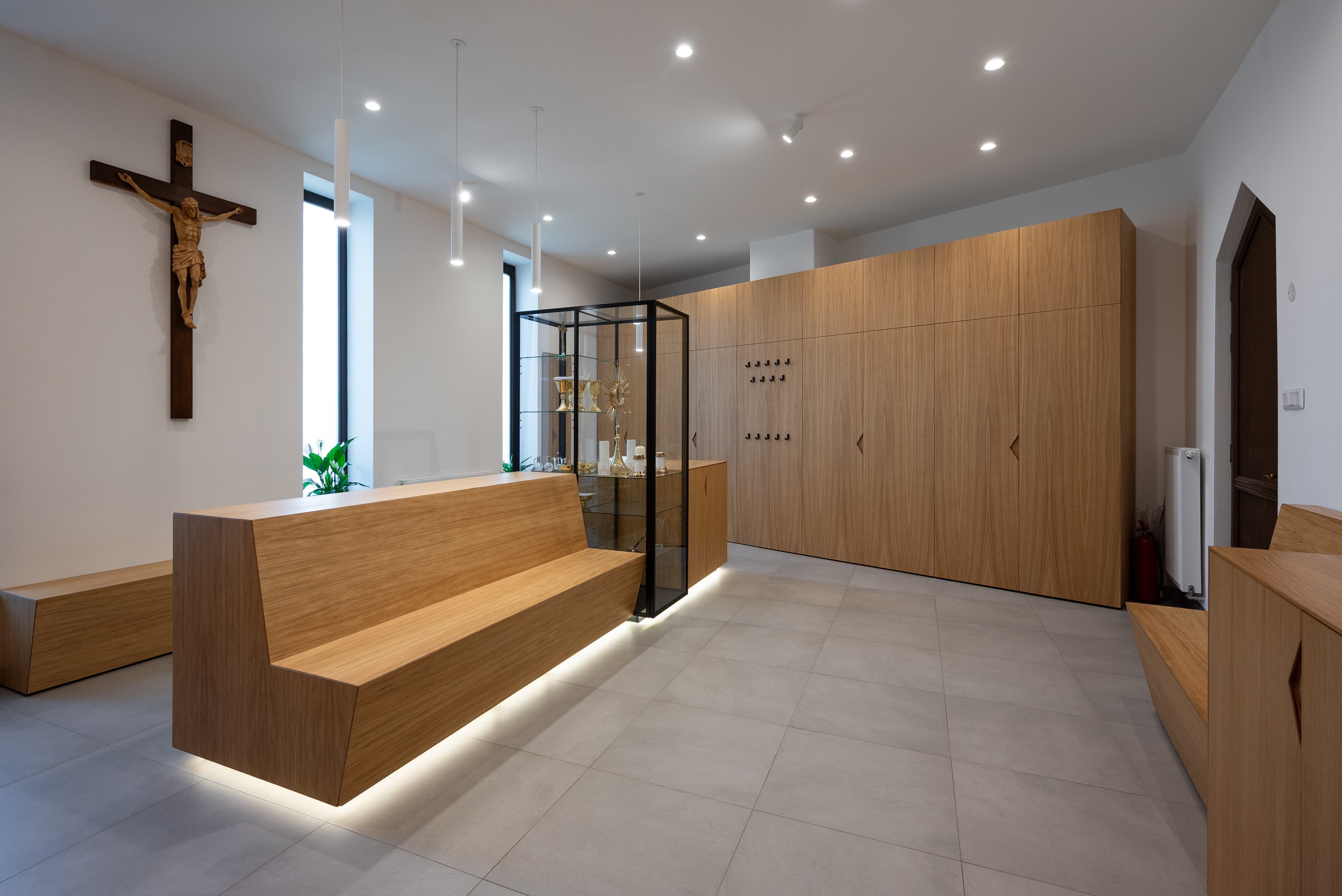 Keď som sa prvýkrát stretol s miestnym kňazom, ktorý ma oslovil s návrhom nábytku do sakristie (pretože starý nábytok už nevyhovoval), nevedeli sme, že nakoniec z toho bude rekonštrukcia, ktorá radikálne zmení jej pôvodnú podobu. Špecifické nebolo iba zadanie, ale aj celkový pôdorys.