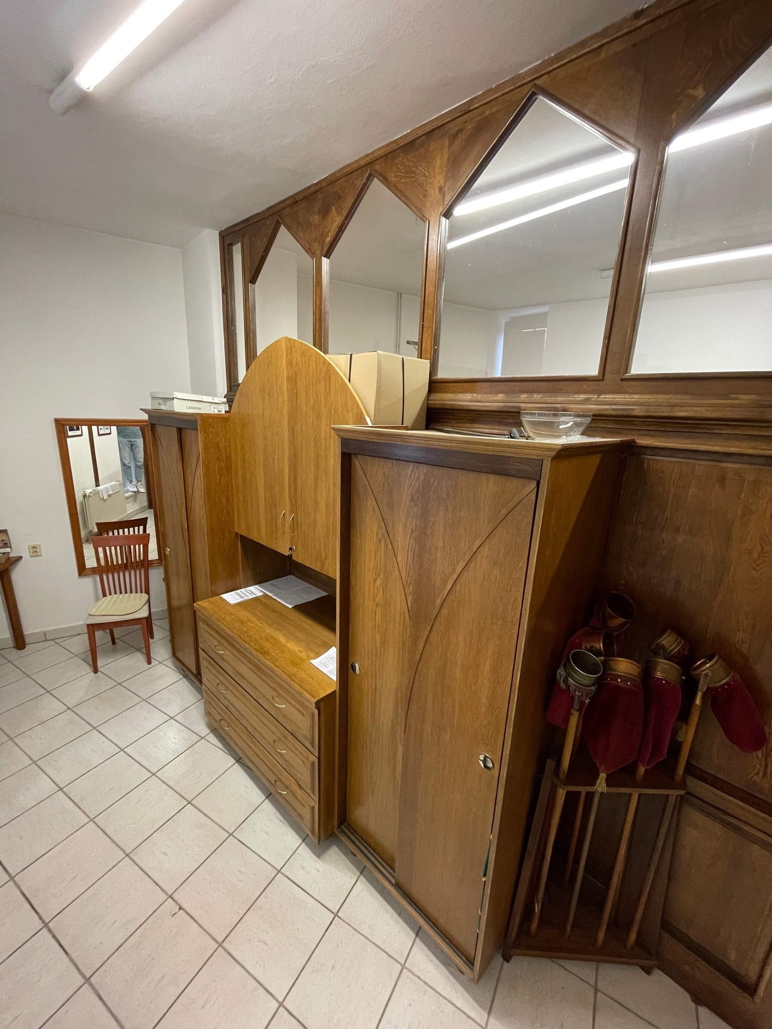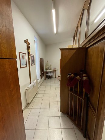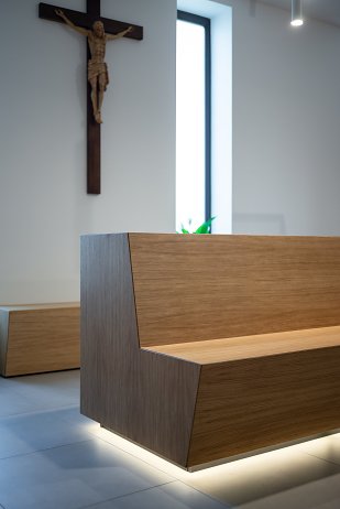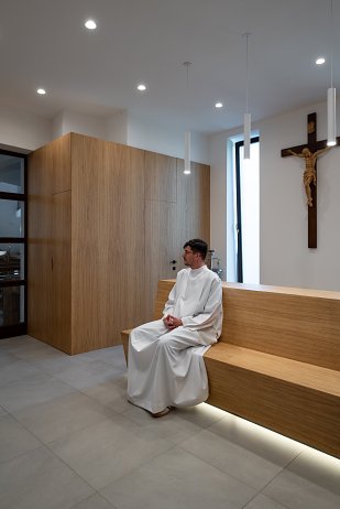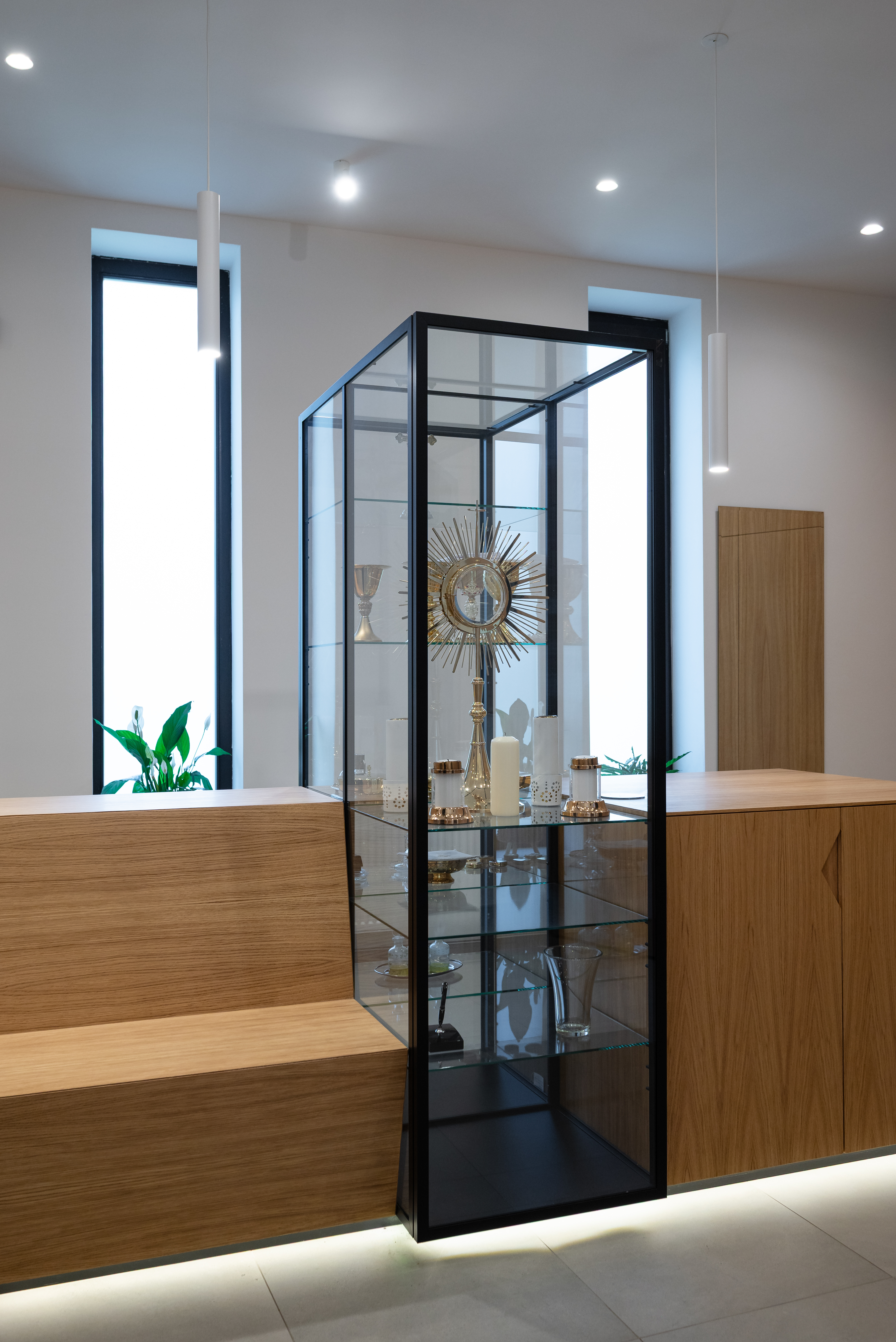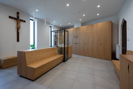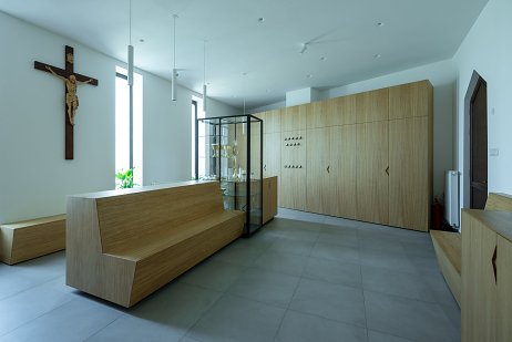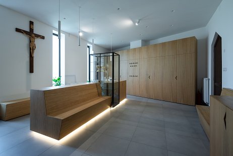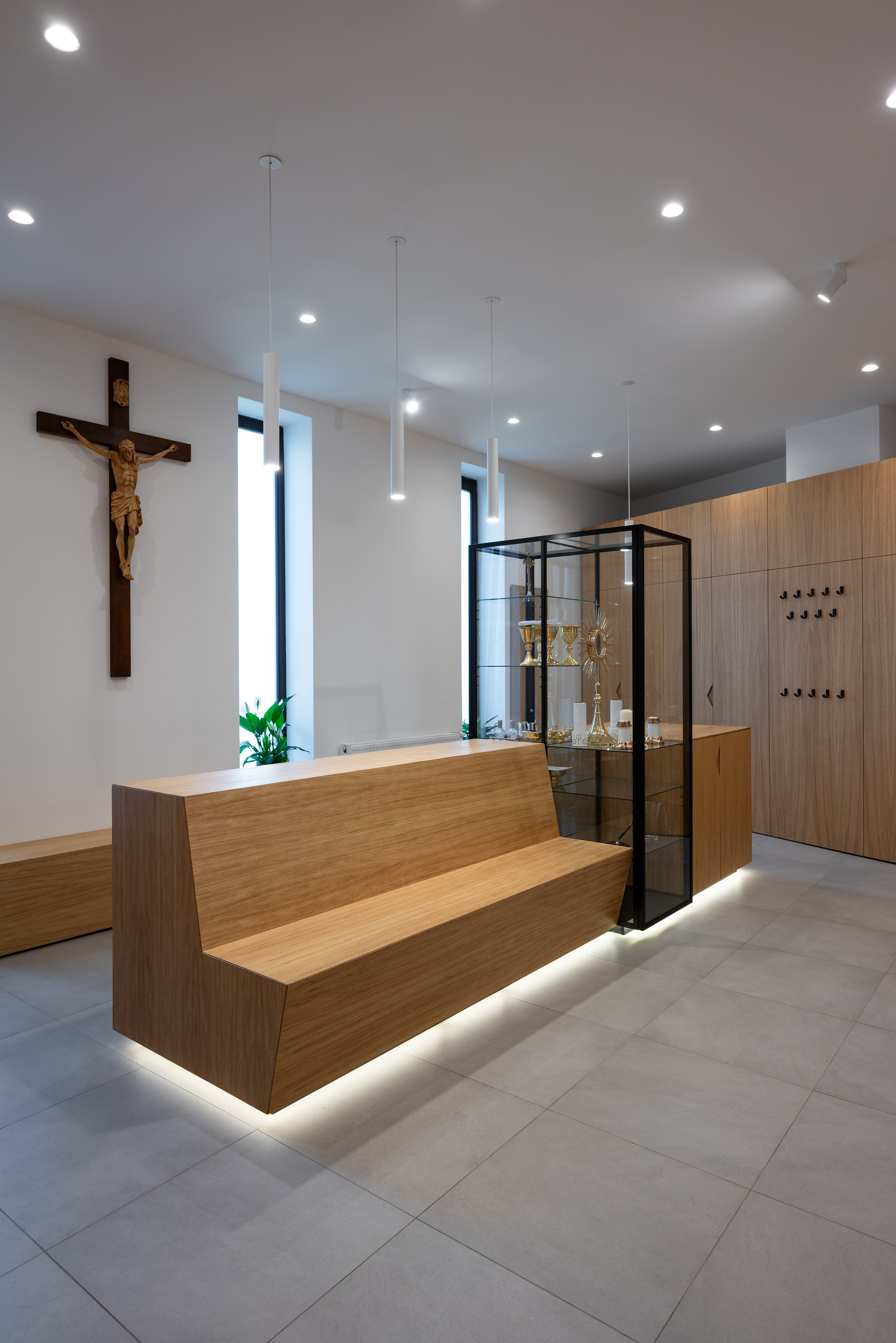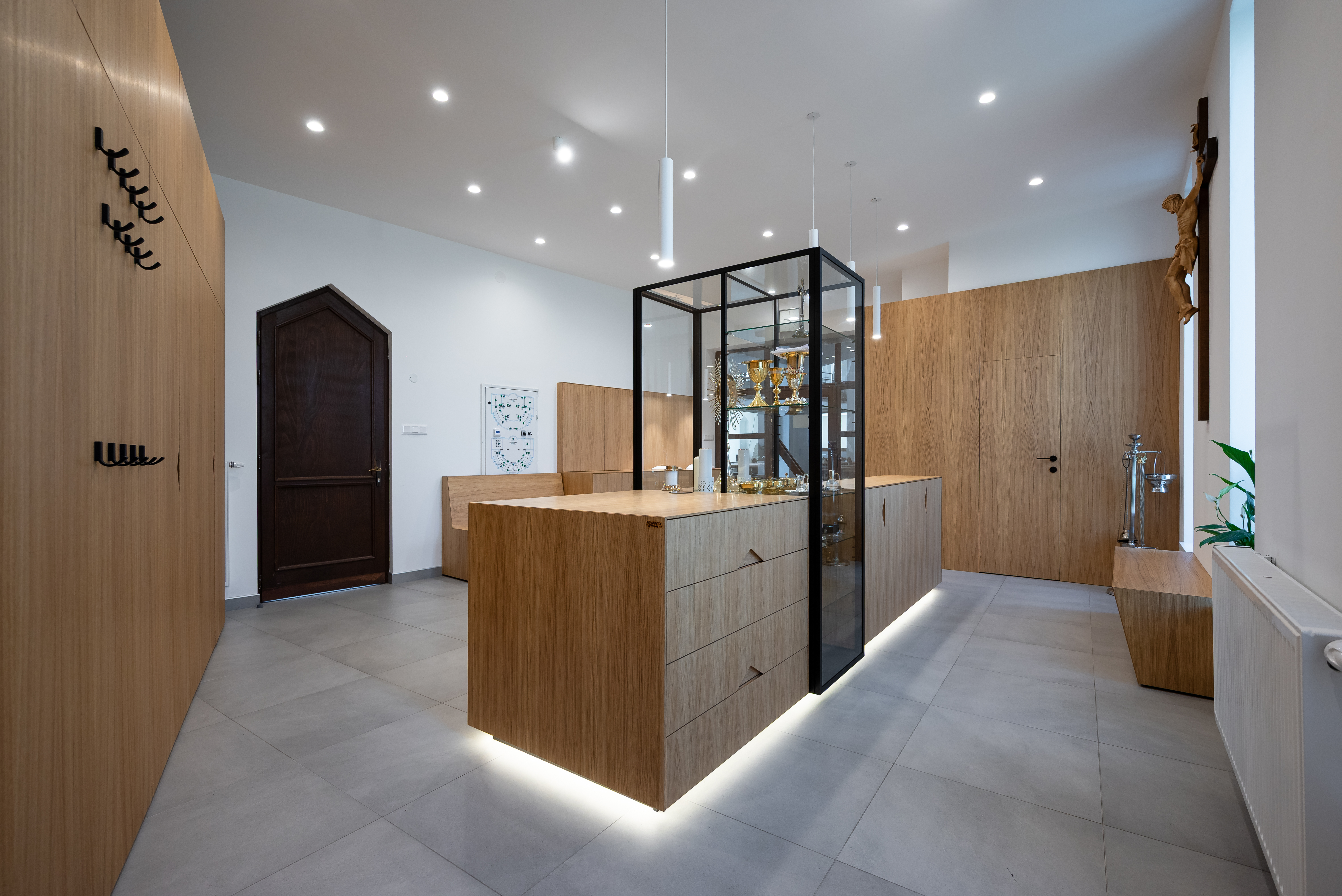Keď som sa prvýkrát stretol s miestnym kňazom, ktorý ma oslovil s návrhom nábytku do sakristie (pretože starý nábytok už nevyhovoval), nevedeli sme, že nakoniec z toho bude rekonštrukcia, ktorá radikálne zmení jej pôvodnú podobu. Špecifické nebolo iba zadanie, ale aj celkový pôdorys.