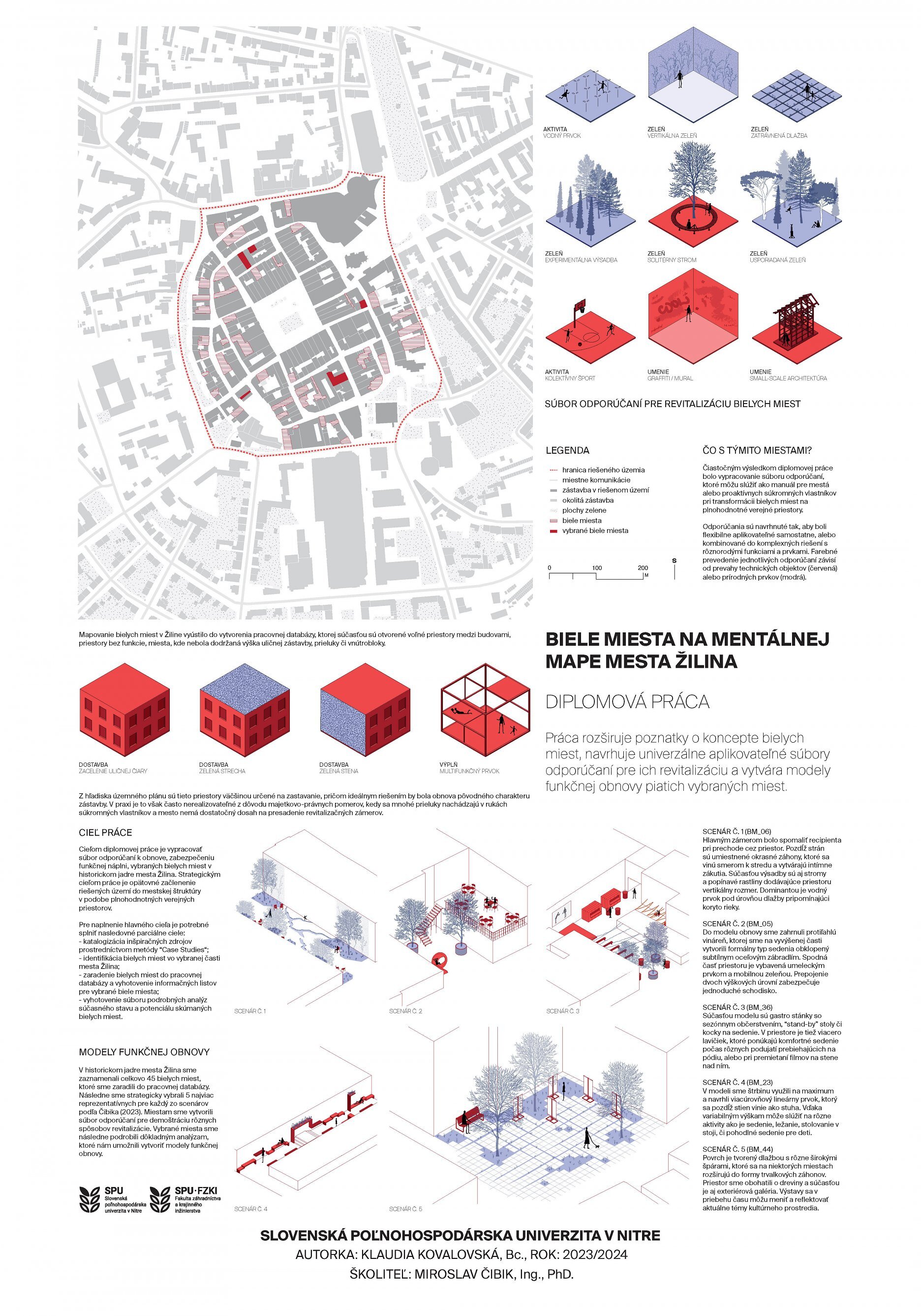Dnes priblížime prácu "Biele miesta na mentálnej mape mesta Žilina", ktorá vznikla na pôde Fakulty záhradníctva a krajinného inžinierstva SPU v Nitre pod vedením Miroslava Čibika. Diplomantka Klaudia Hamacková sa vnej zameriava na nevyužité priestory a prieluky v historickom centre Žiliny. Navrhuje modely funkčného využitia vybraných lokalít a ich začlenenia do organizmu mesta.