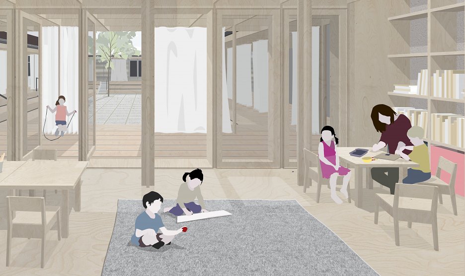 Funkčná schéma objektu je založená na protipóloch dvoch vzdialených generácií. Zatiaľ čo hmota na juhozápadnej strane átria funguje ako materská škola (neskôr možno odčleniť malotriedku), severozápadná strana obsahuje ubytovacie jednotky domova sociálnych služieb. Práve hlavný priestor bývalej školy vytvára miesto prelínania aktivít týchto skupín. Priestor zdieľaný celou komunitou formuje podnety pre interakciu. Jednoducho obsluhovaný jednou či dvoma osobami funguje ako denný stacionár pre seniorov, no zároveň zastrešuje aj knižnicu, herňu, jedáleň, kaviareň, prednáškovú miestnosť, infopoint a recepciu (pre projekt „Priedomia“). Pomerne veľká univerzálnosť je docielená voľným pôdorysom a textilnými závesmi. Priestor má priame spojenie s platóm okolo dvora a s tribúnou na severnej strane. V juhovýchodnej časti pozemku sú na ochodzu napojené bezbariérové byty, pre ľudí, ktorí požadujú väčšiu mieru samostatnosti. Objekt pekárne sa smerom do dvora otvára predajňou pečiva, zatiaľ čo priestory chránenej dielne a prípravy pečiva sú orientované do hospodárskeho dvora.