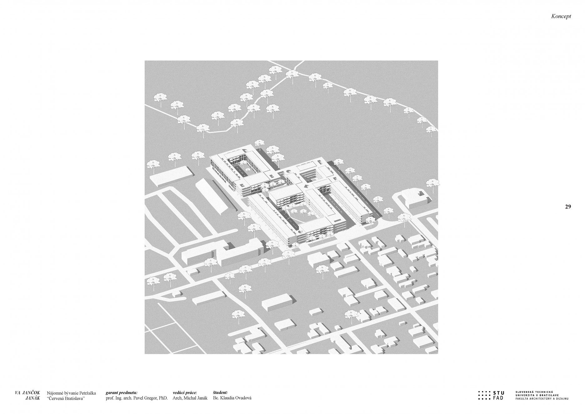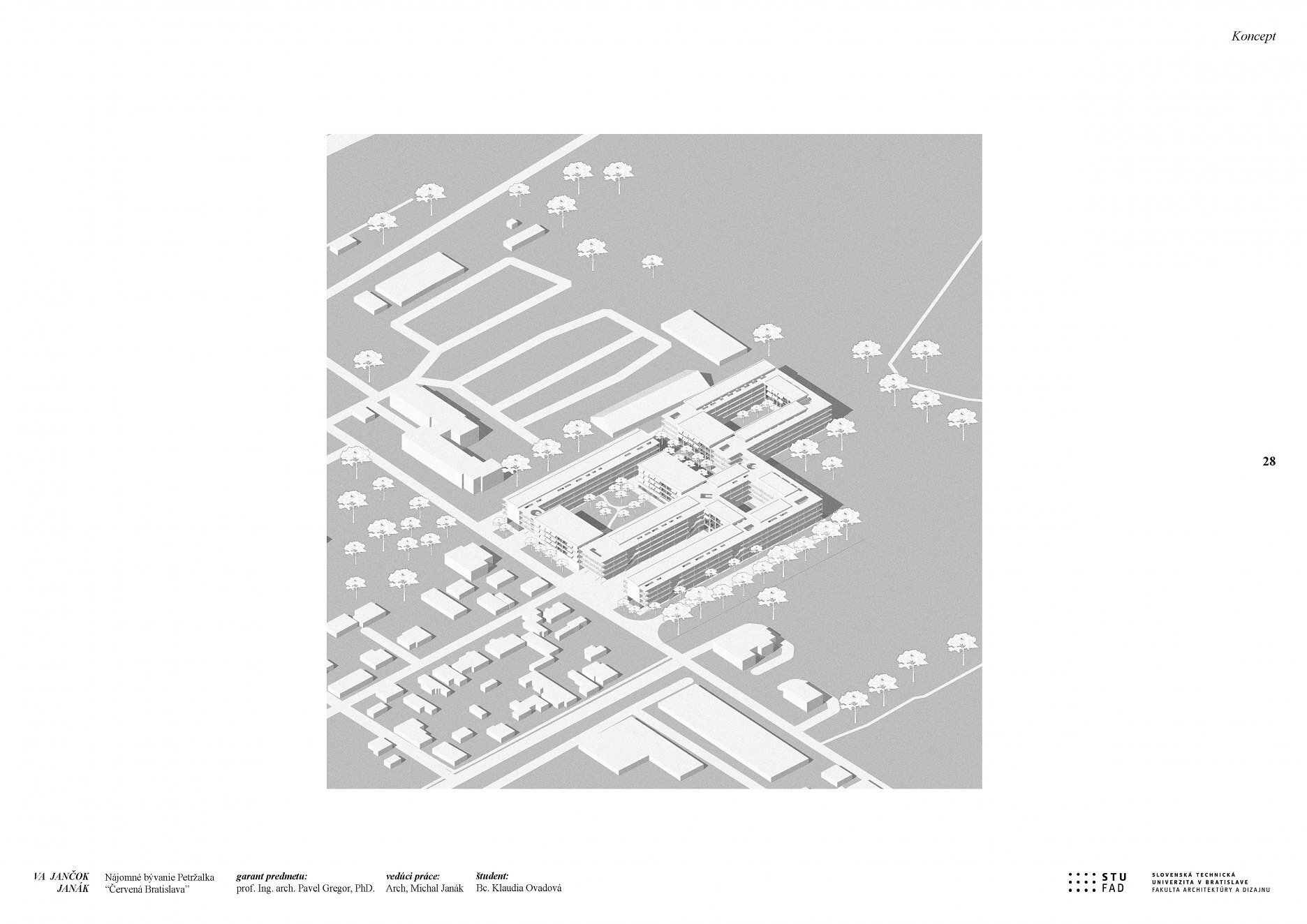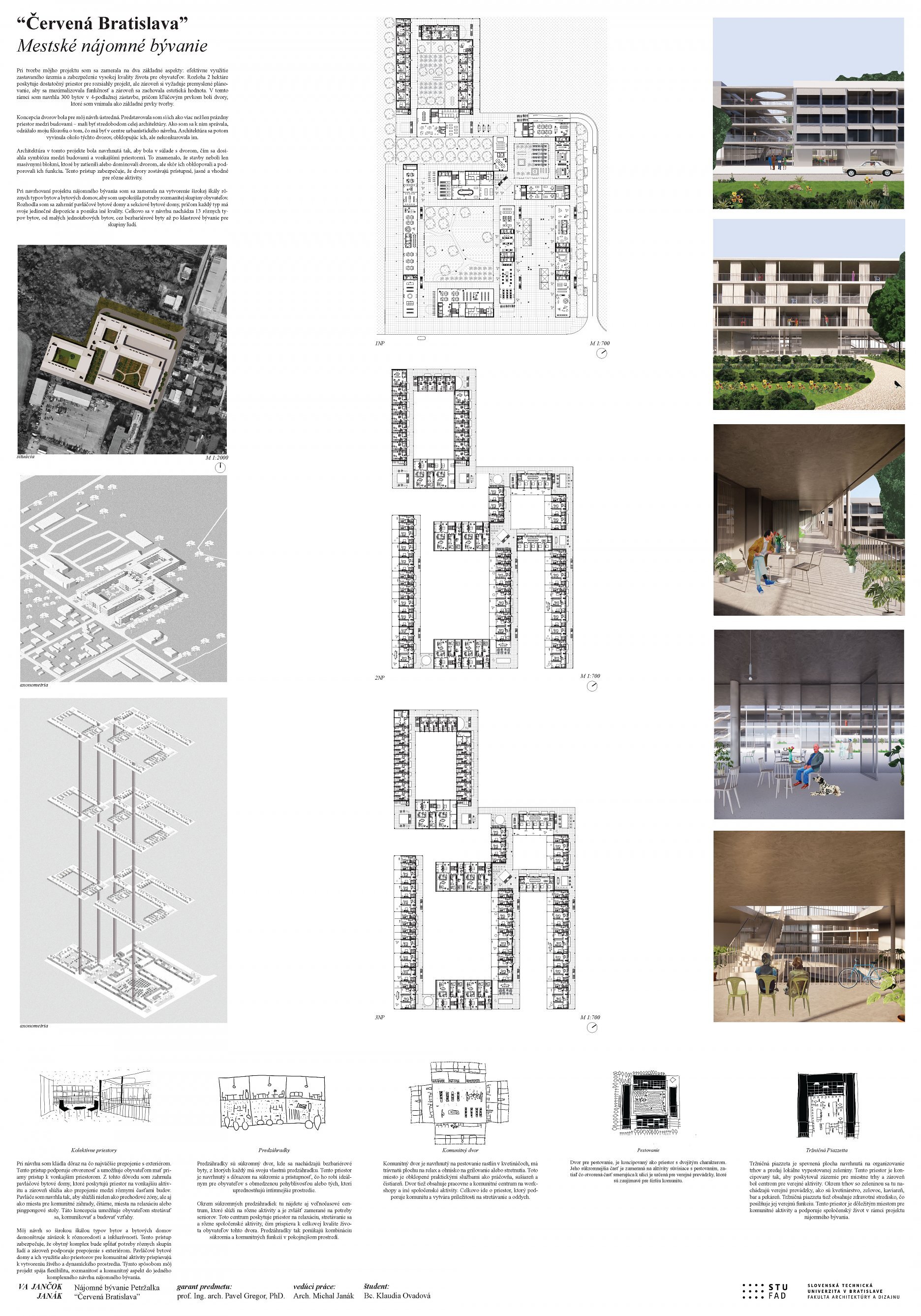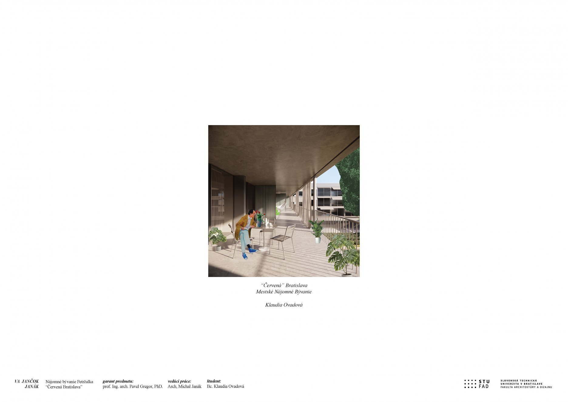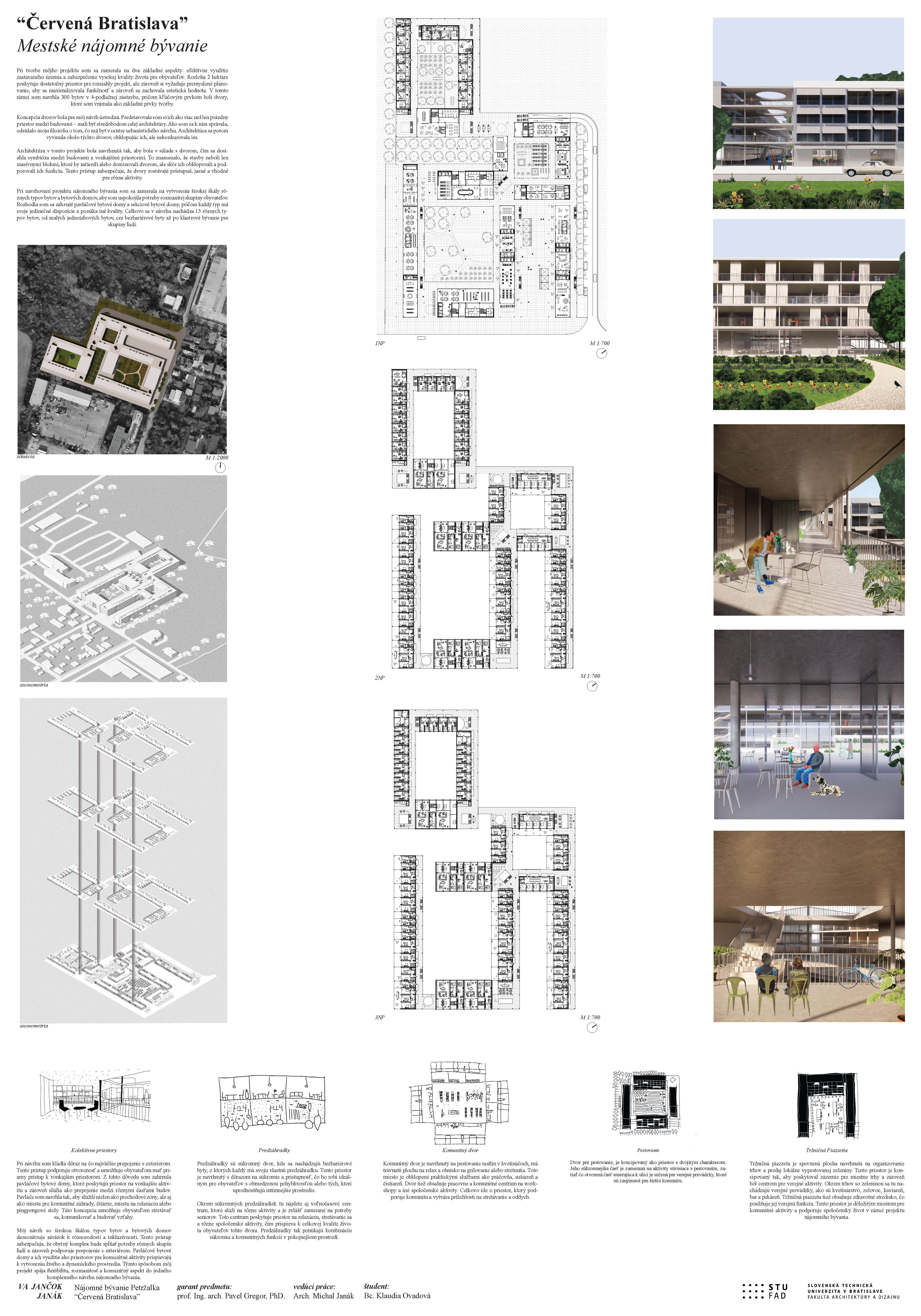 Dnes priblížime prácu "Červená Bratislava: Mestské nájomné bývanie, lokalita Varšavská", ktorá vznikla na pôde Fakulty architektúry a dizajnu STU v Bratislave pod vedením Michala Janáka. Klaudia Ovadová sa zaoberá témou mestského nájomného bývania na Kaukazskej ulici v Starej Petržalke, inšpirovaného fenoménom "Červená Viedeň". Práca skúma historické aspekty sociálneho bývania a aplikuje ich na súčasný kontext, pričom zdôrazňuje význam komunitného života a udržateľnosti v mestskom plánovaní. Výsledkom je návrh, ktorý má za cieľ poskytnúť kvalitné bývanie a zároveň podporovať spoločenské väzby. Autorka vypĺňa dvojhektárový pozemok štvorpodlažnou blokovou zástavbou s 300 bytmi, pričom kladie dôraz na efektívne využitie priestoru. Kľúčovým prvkom je päť odlišných dvorov, ktoré spájajú súkromné a verejné funkcie: súkromná časť umožňuje pestovanie rastlín, zatiaľčo verejná časť obsahuje tržničnú piazzetu s vybavenosťou. Predzáhradky rozširujú bezbariérové byty o vlastné vonkajšie priestory. Pavlačové bytové domy ponúkajú prístup k vonkajším aktivitám v podobe "kĺbov" a slúžia ako miesta pre komunitné záhrady, čitárne a relaxačné zóny.