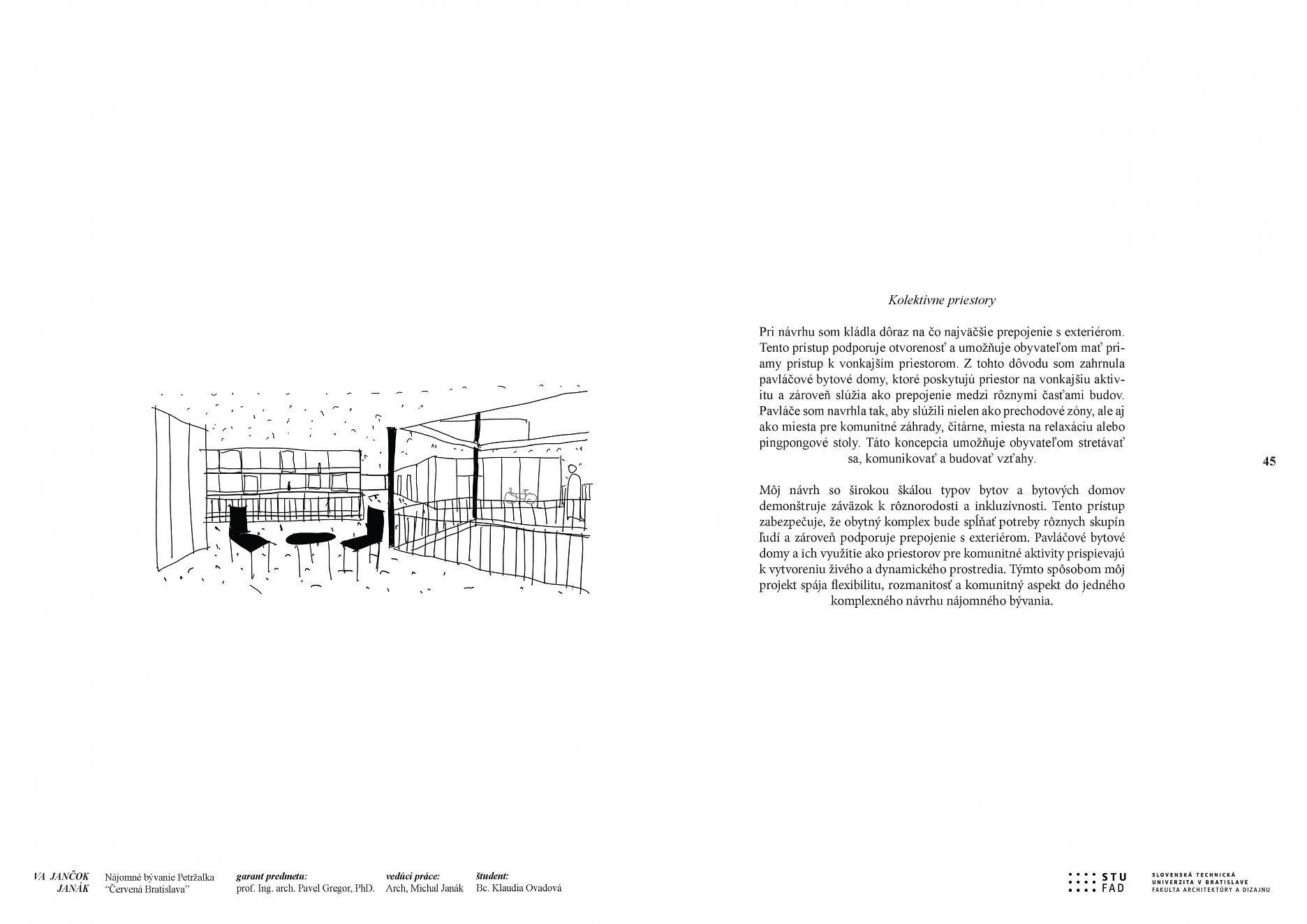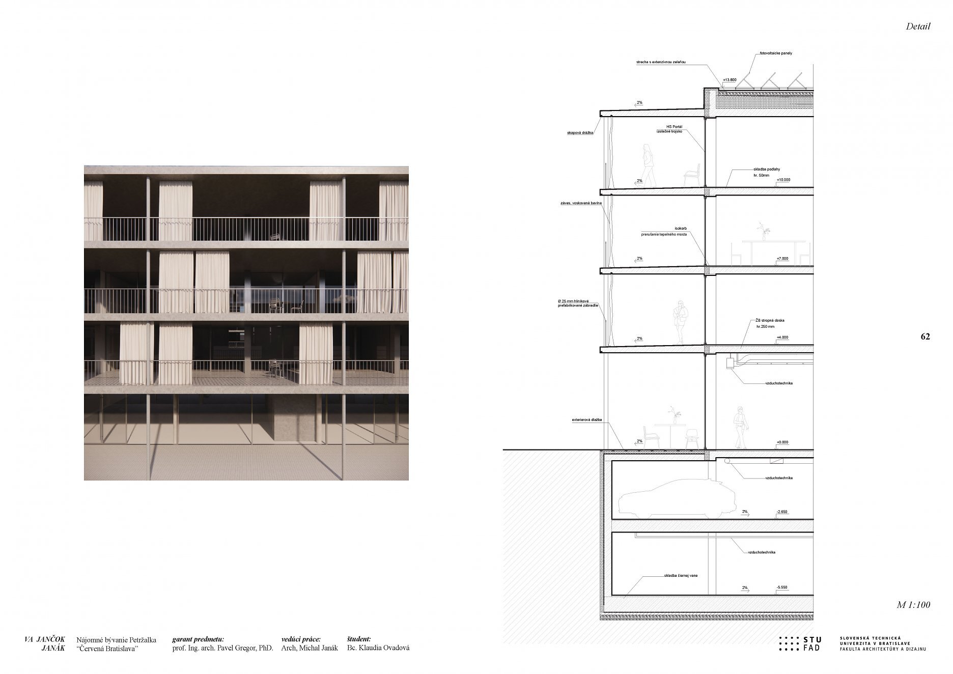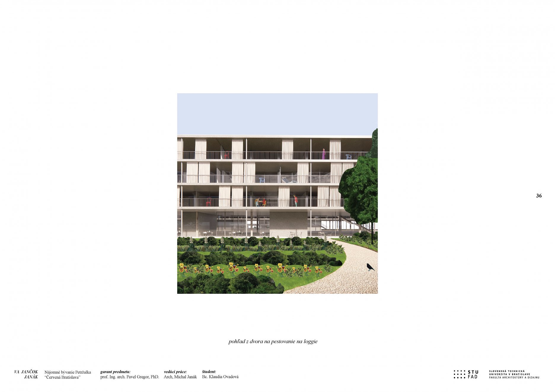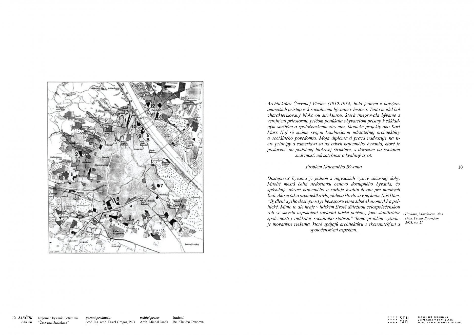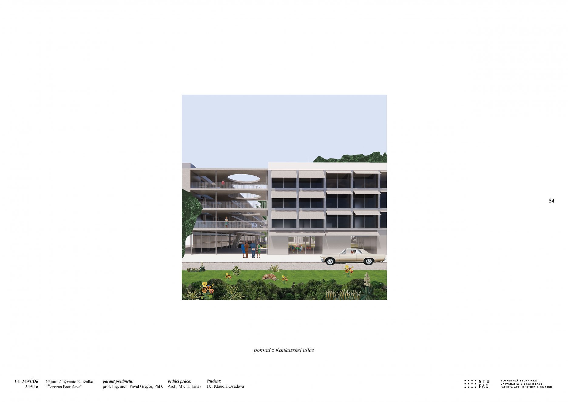 Dnes priblížime prácu "Červená Bratislava: Mestské nájomné bývanie, lokalita Varšavská", ktorá vznikla na pôde Fakulty architektúry a dizajnu STU v Bratislave pod vedením Michala Janáka. Klaudia Ovadová sa zaoberá témou mestského nájomného bývania na Kaukazskej ulici v Starej Petržalke, inšpirovaného fenoménom "Červená Viedeň". Práca skúma historické aspekty sociálneho bývania a aplikuje ich na súčasný kontext, pričom zdôrazňuje význam komunitného života a udržateľnosti v mestskom plánovaní. Výsledkom je návrh, ktorý má za cieľ poskytnúť kvalitné bývanie a zároveň podporovať spoločenské väzby. Autorka vypĺňa dvojhektárový pozemok štvorpodlažnou blokovou zástavbou s 300 bytmi, pričom kladie dôraz na efektívne využitie priestoru. Kľúčovým prvkom je päť odlišných dvorov, ktoré spájajú súkromné a verejné funkcie: súkromná časť umožňuje pestovanie rastlín, zatiaľčo verejná časť obsahuje tržničnú piazzetu s vybavenosťou. Predzáhradky rozširujú bezbariérové byty o vlastné vonkajšie priestory. Pavlačové bytové domy ponúkajú prístup k vonkajším aktivitám v podobe "kĺbov" a slúžia ako miesta pre komunitné záhrady, čitárne a relaxačné zóny.
