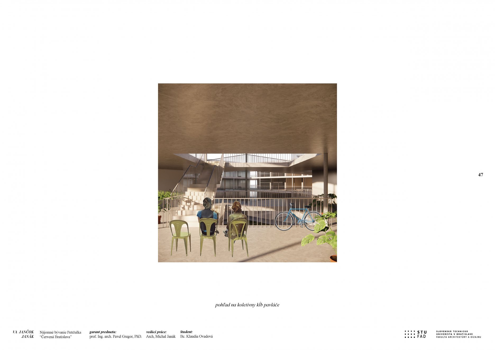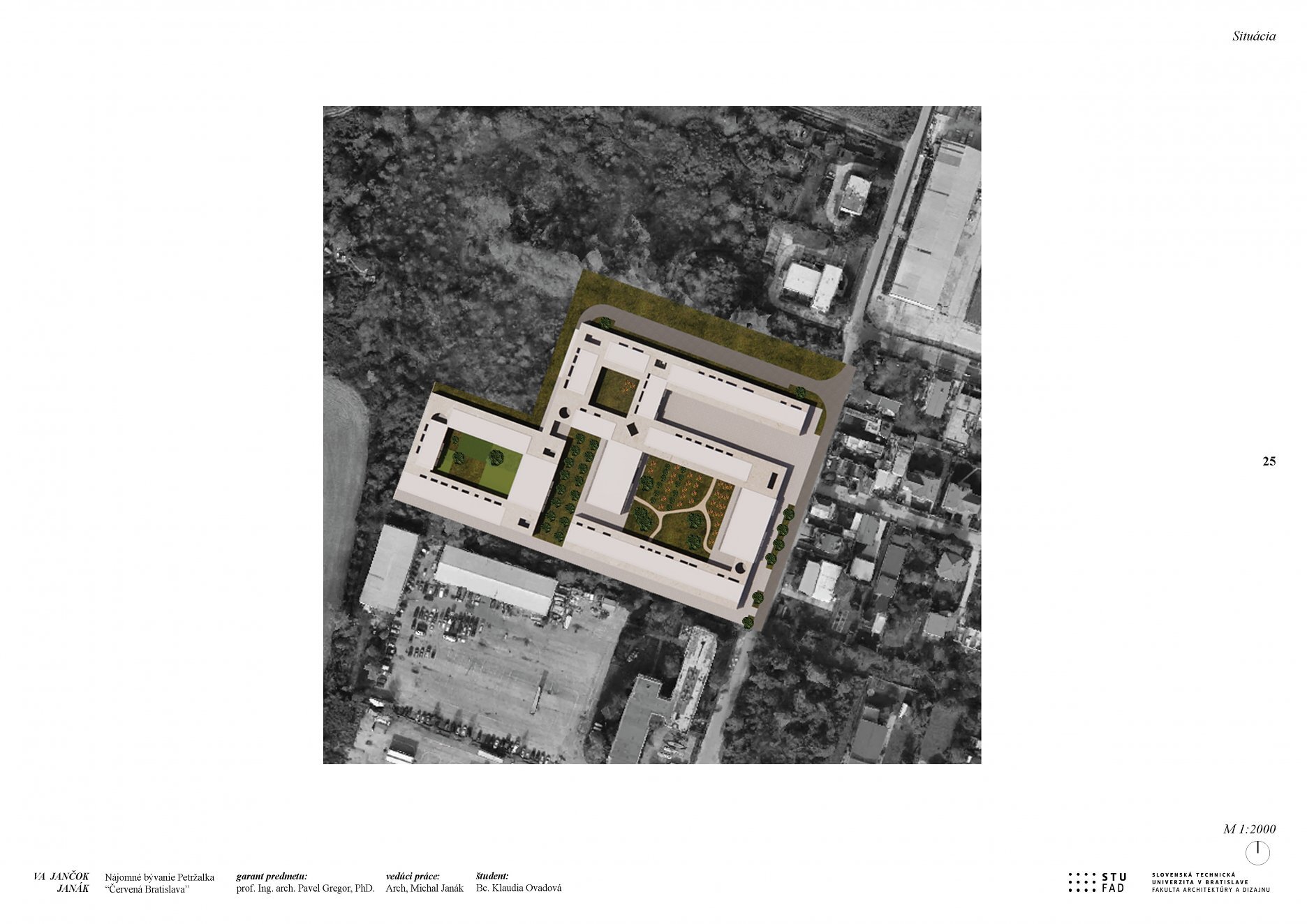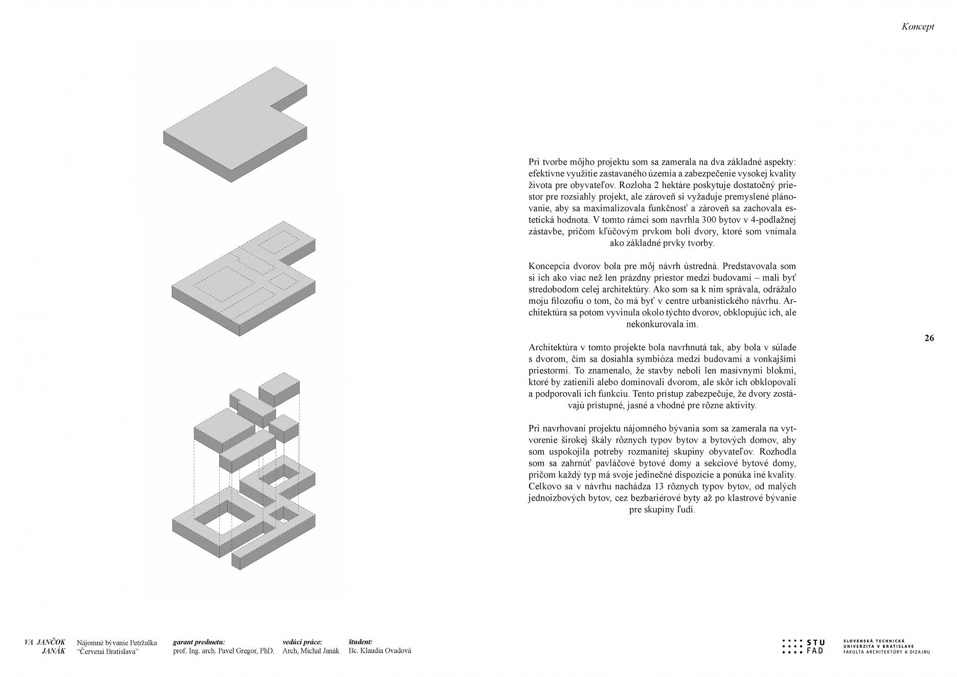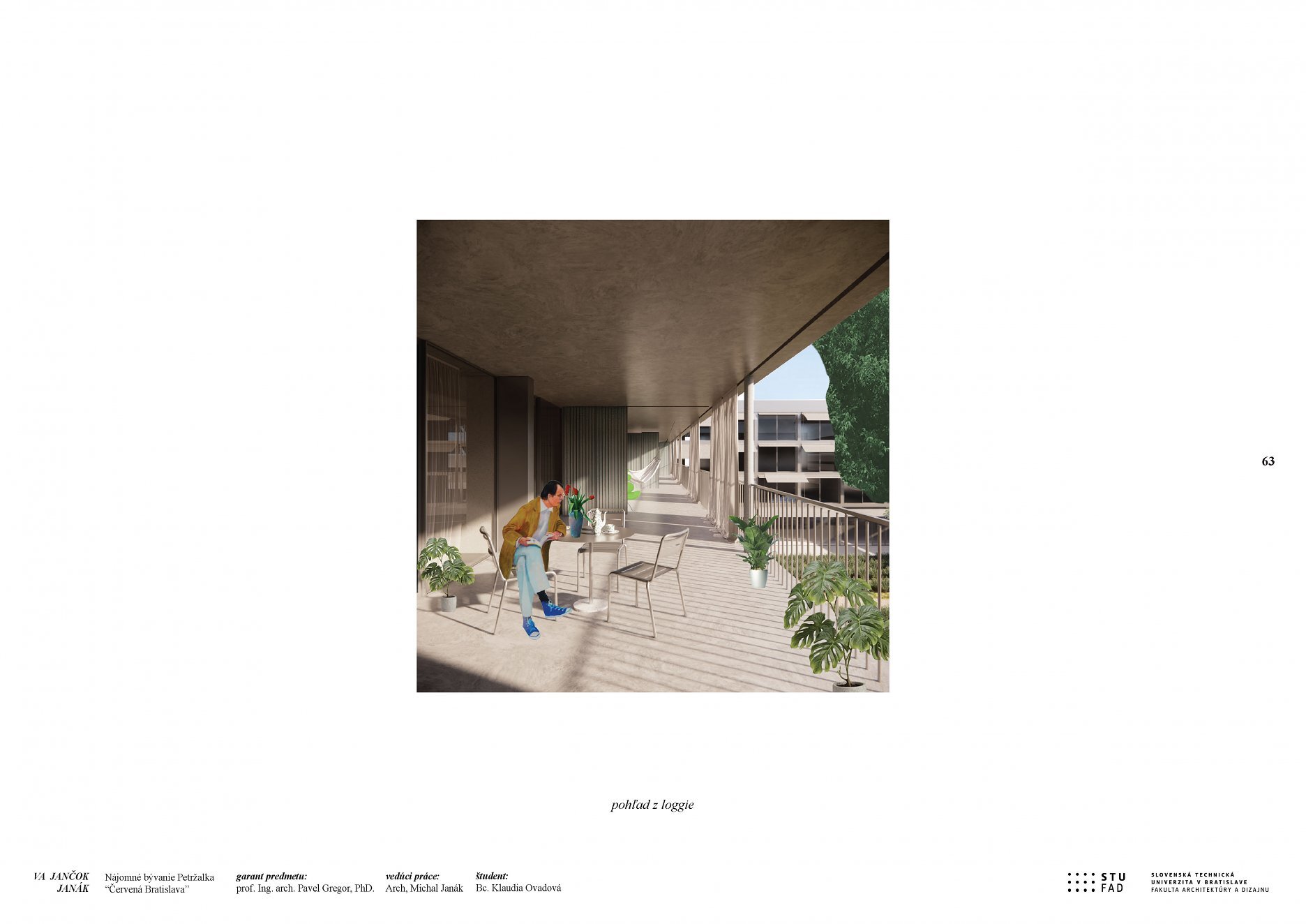 Dnes priblížime prácu "Červená Bratislava: Mestské nájomné bývanie, lokalita Varšavská", ktorá vznikla na pôde Fakulty architektúry a dizajnu STU v Bratislave pod vedením Michala Janáka. Klaudia Ovadová sa zaoberá témou mestského nájomného bývania na Kaukazskej ulici v Starej Petržalke, inšpirovaného fenoménom "Červená Viedeň". Práca skúma historické aspekty sociálneho bývania a aplikuje ich na súčasný kontext, pričom zdôrazňuje význam komunitného života a udržateľnosti v mestskom plánovaní. Výsledkom je návrh, ktorý má za cieľ poskytnúť kvalitné bývanie a zároveň podporovať spoločenské väzby. Autorka vypĺňa dvojhektárový pozemok štvorpodlažnou blokovou zástavbou s 300 bytmi, pričom kladie dôraz na efektívne využitie priestoru. Kľúčovým prvkom je päť odlišných dvorov, ktoré spájajú súkromné a verejné funkcie: súkromná časť umožňuje pestovanie rastlín, zatiaľčo verejná časť obsahuje tržničnú piazzetu s vybavenosťou. Predzáhradky rozširujú bezbariérové byty o vlastné vonkajšie priestory. Pavlačové bytové domy ponúkajú prístup k vonkajším aktivitám v podobe "kĺbov" a slúžia ako miesta pre komunitné záhrady, čitárne a relaxačné zóny.