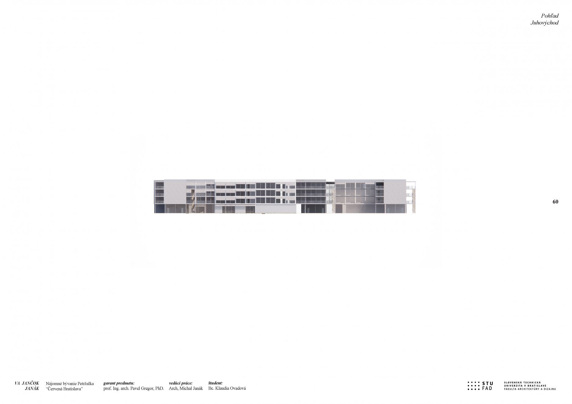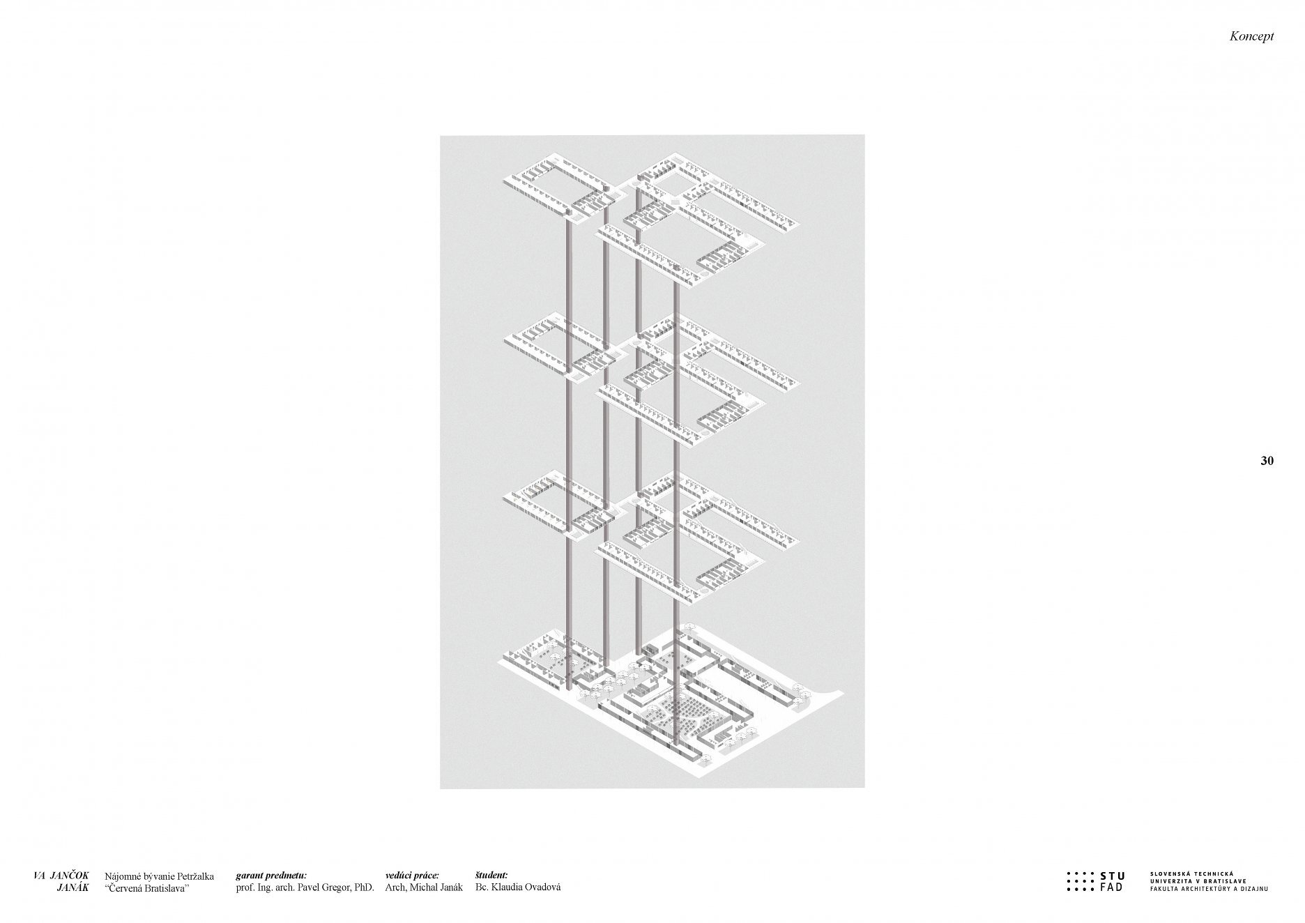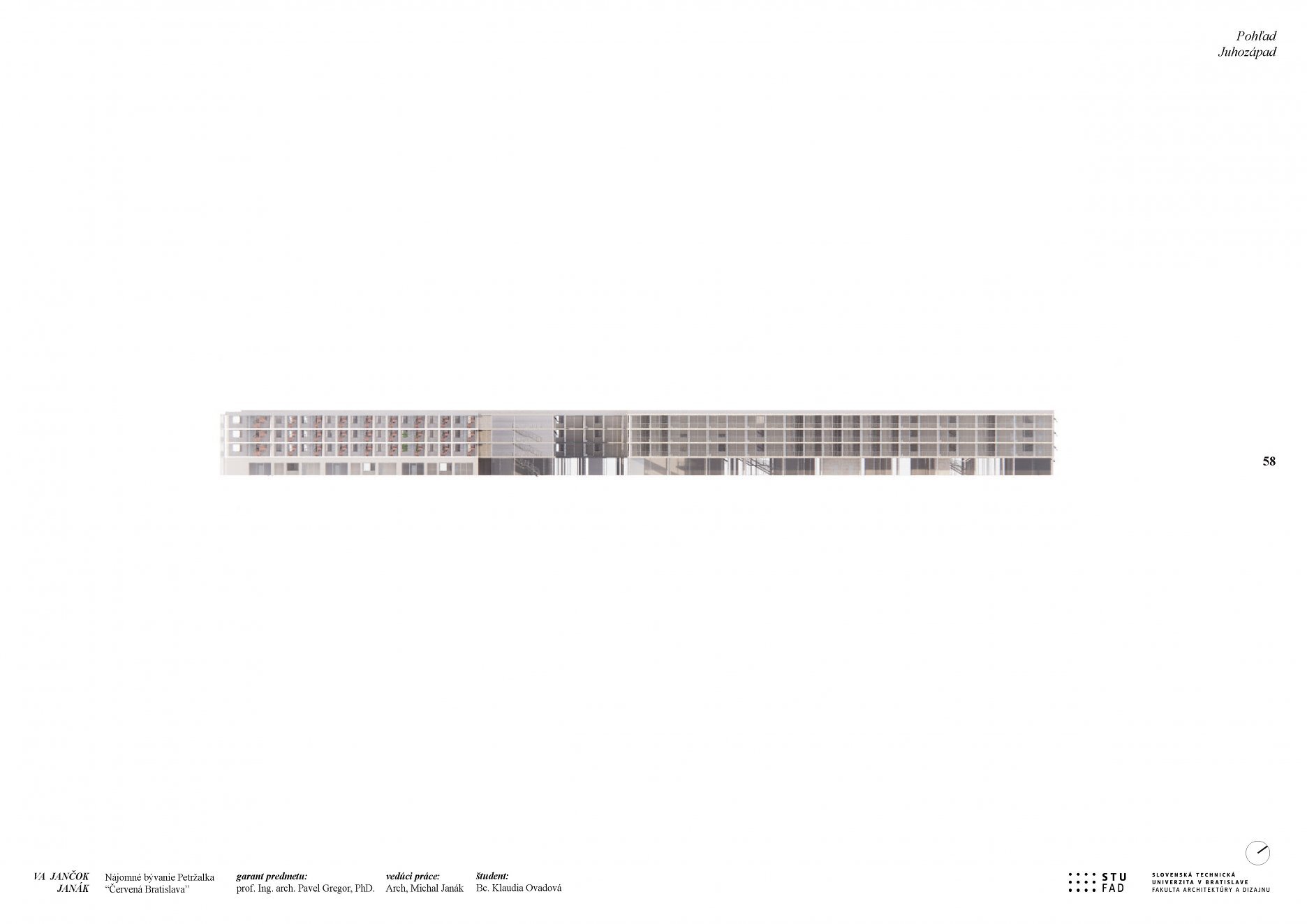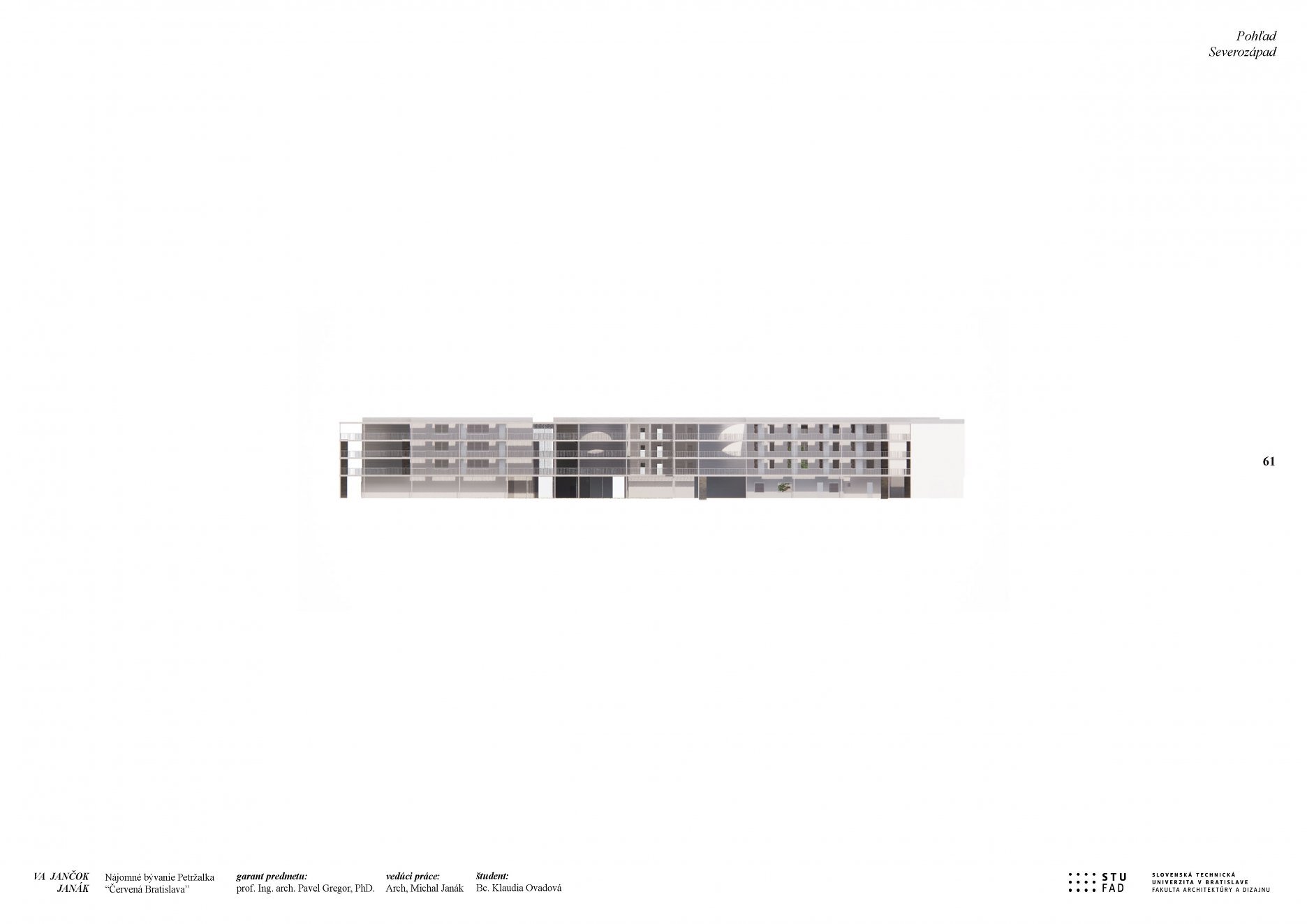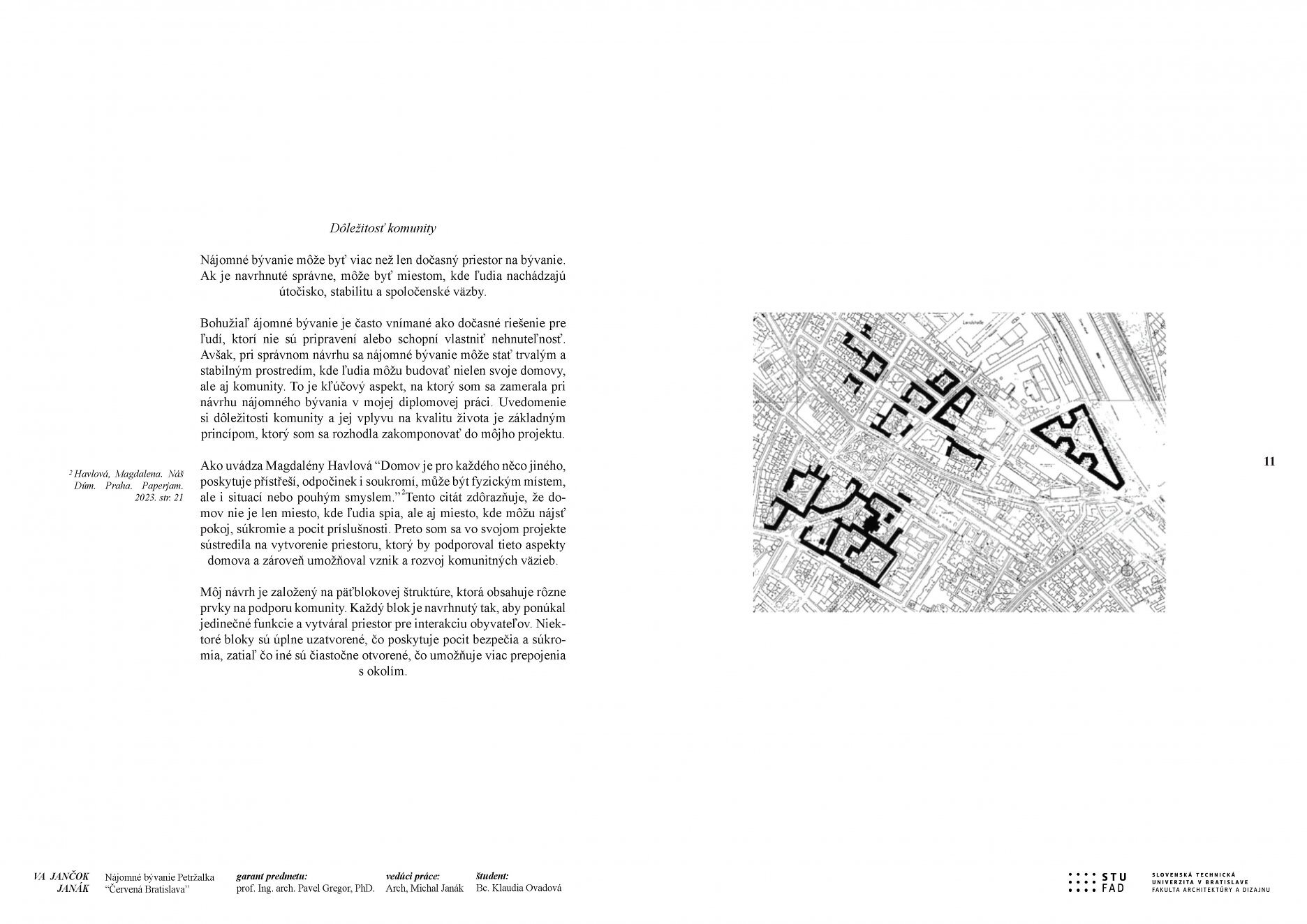 Dnes priblížime prácu "Červená Bratislava: Mestské nájomné bývanie, lokalita Varšavská", ktorá vznikla na pôde Fakulty architektúry a dizajnu STU v Bratislave pod vedením Michala Janáka. Klaudia Ovadová sa zaoberá témou mestského nájomného bývania na Kaukazskej ulici v Starej Petržalke, inšpirovaného fenoménom "Červená Viedeň". Práca skúma historické aspekty sociálneho bývania a aplikuje ich na súčasný kontext, pričom zdôrazňuje význam komunitného života a udržateľnosti v mestskom plánovaní. Výsledkom je návrh, ktorý má za cieľ poskytnúť kvalitné bývanie a zároveň podporovať spoločenské väzby. Autorka vypĺňa dvojhektárový pozemok štvorpodlažnou blokovou zástavbou s 300 bytmi, pričom kladie dôraz na efektívne využitie priestoru. Kľúčovým prvkom je päť odlišných dvorov, ktoré spájajú súkromné a verejné funkcie: súkromná časť umožňuje pestovanie rastlín, zatiaľčo verejná časť obsahuje tržničnú piazzetu s vybavenosťou. Predzáhradky rozširujú bezbariérové byty o vlastné vonkajšie priestory. Pavlačové bytové domy ponúkajú prístup k vonkajším aktivitám v podobe "kĺbov" a slúžia ako miesta pre komunitné záhrady, čitárne a relaxačné zóny.