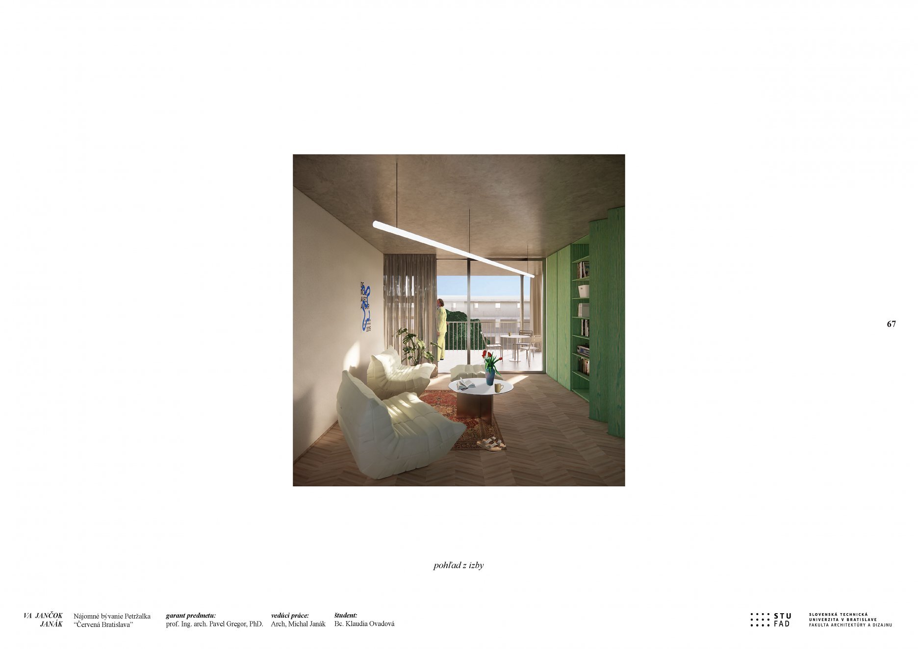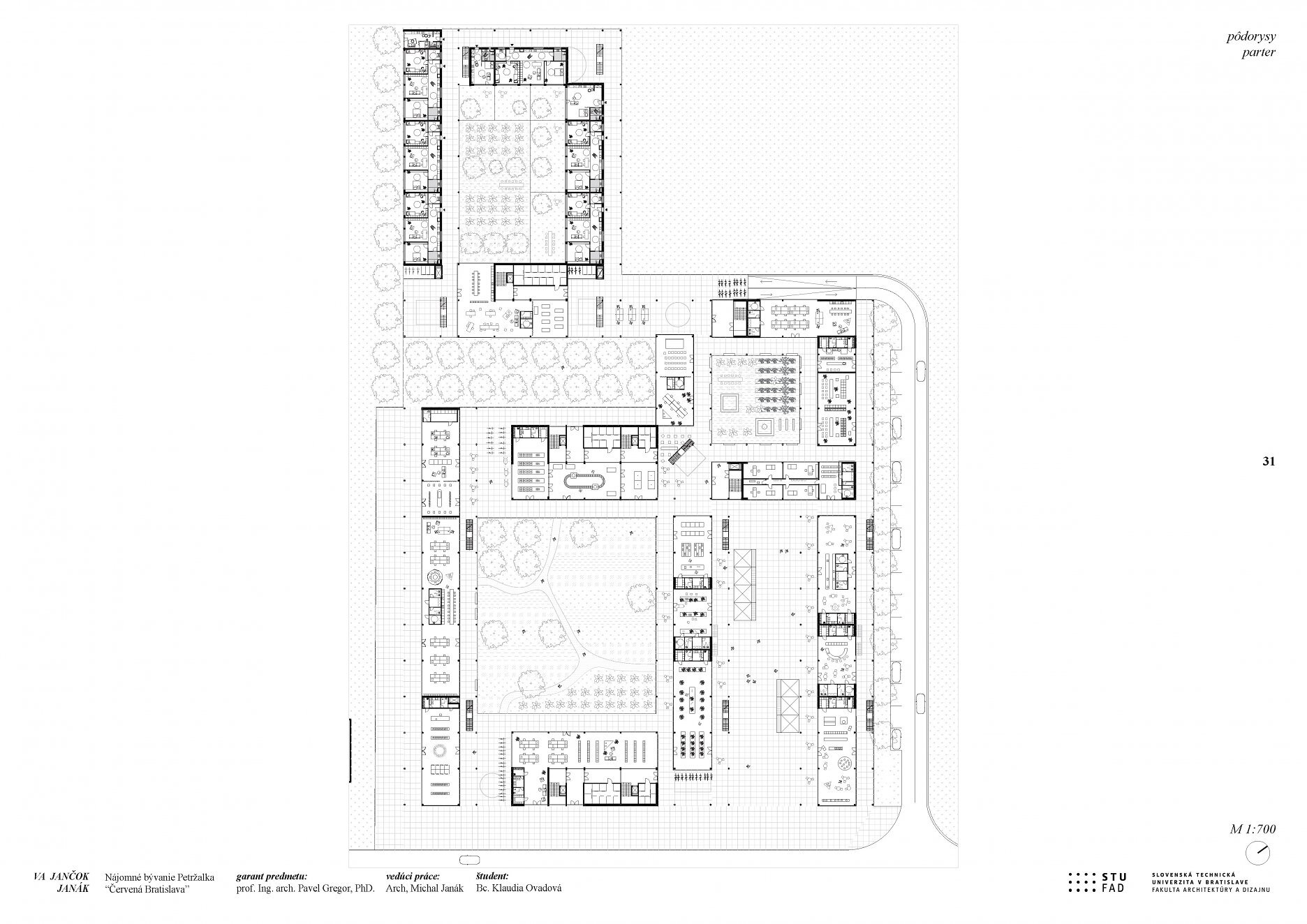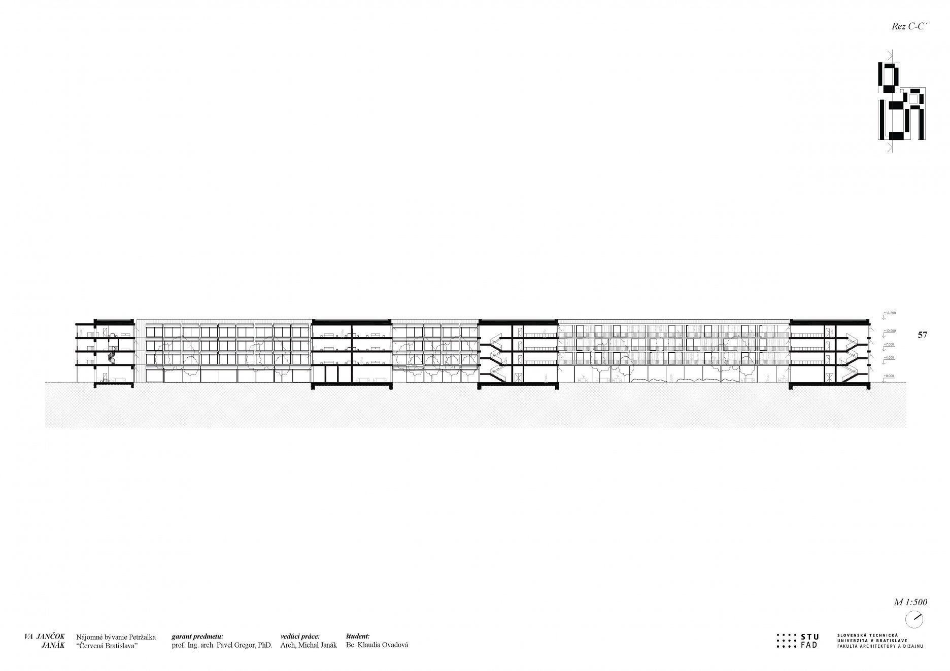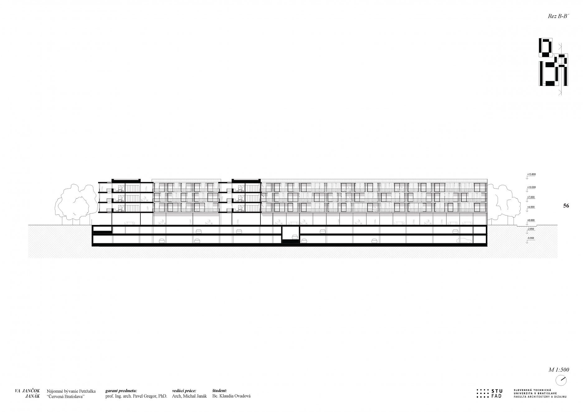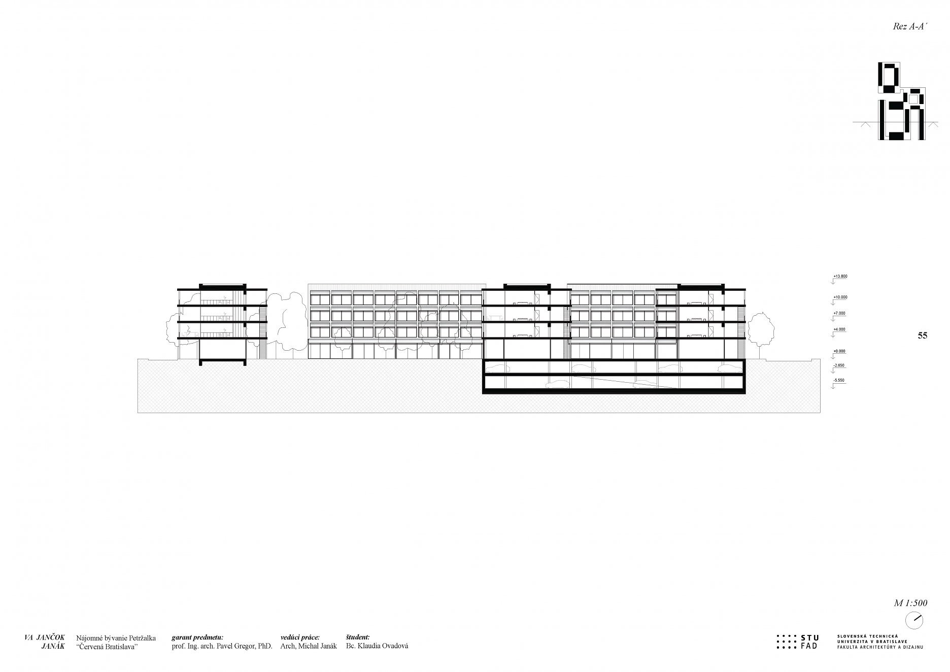 Dnes priblížime prácu "Červená Bratislava: Mestské nájomné bývanie, lokalita Varšavská", ktorá vznikla na pôde Fakulty architektúry a dizajnu STU v Bratislave pod vedením Michala Janáka. Klaudia Ovadová sa zaoberá témou mestského nájomného bývania na Kaukazskej ulici v Starej Petržalke, inšpirovaného fenoménom "Červená Viedeň". Práca skúma historické aspekty sociálneho bývania a aplikuje ich na súčasný kontext, pričom zdôrazňuje význam komunitného života a udržateľnosti v mestskom plánovaní. Výsledkom je návrh, ktorý má za cieľ poskytnúť kvalitné bývanie a zároveň podporovať spoločenské väzby. Autorka vypĺňa dvojhektárový pozemok štvorpodlažnou blokovou zástavbou s 300 bytmi, pričom kladie dôraz na efektívne využitie priestoru. Kľúčovým prvkom je päť odlišných dvorov, ktoré spájajú súkromné a verejné funkcie: súkromná časť umožňuje pestovanie rastlín, zatiaľčo verejná časť obsahuje tržničnú piazzetu s vybavenosťou. Predzáhradky rozširujú bezbariérové byty o vlastné vonkajšie priestory. Pavlačové bytové domy ponúkajú prístup k vonkajším aktivitám v podobe "kĺbov" a slúžia ako miesta pre komunitné záhrady, čitárne a relaxačné zóny.