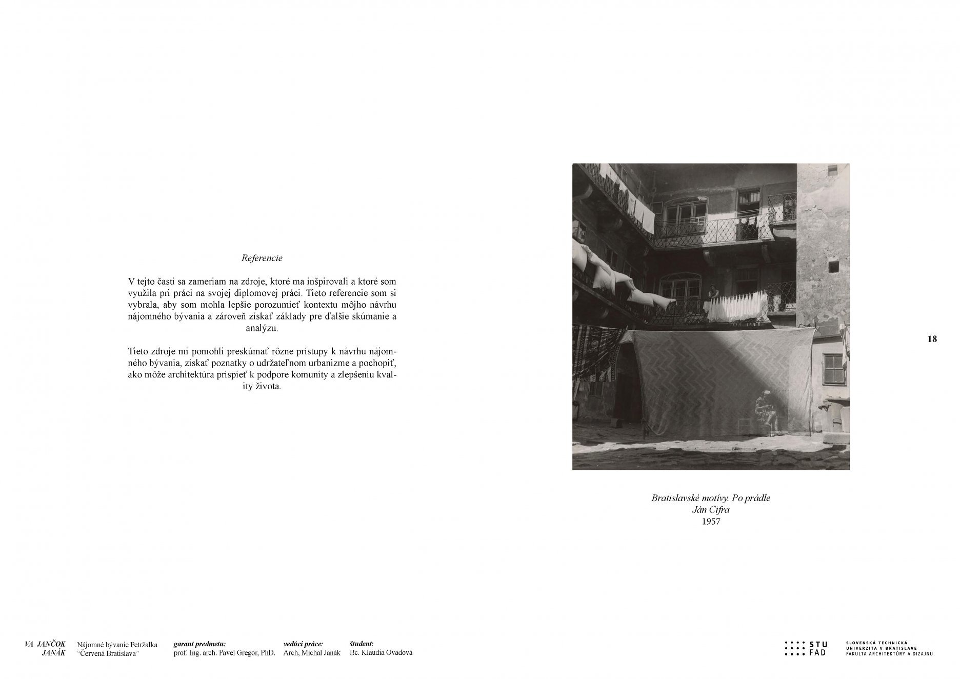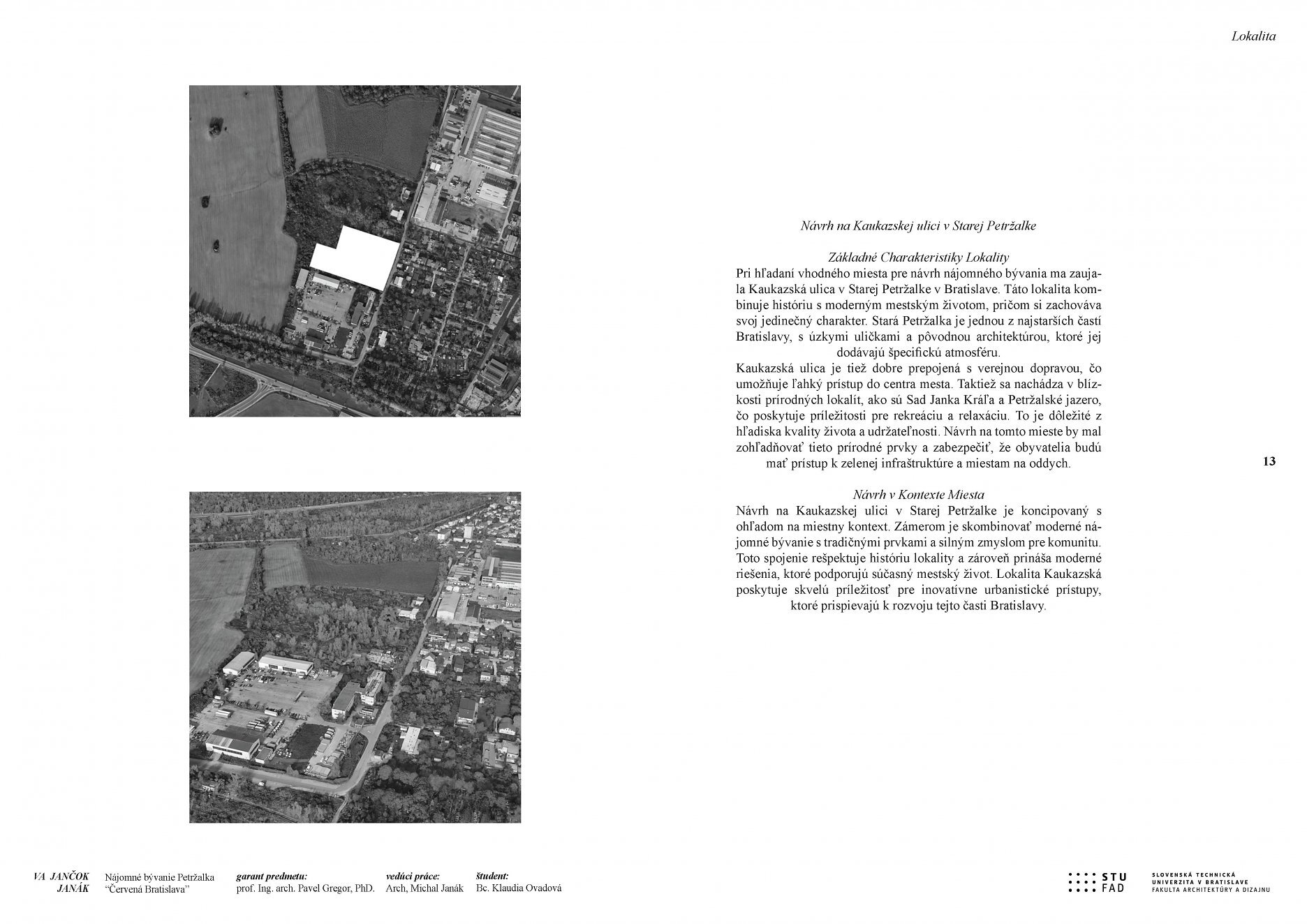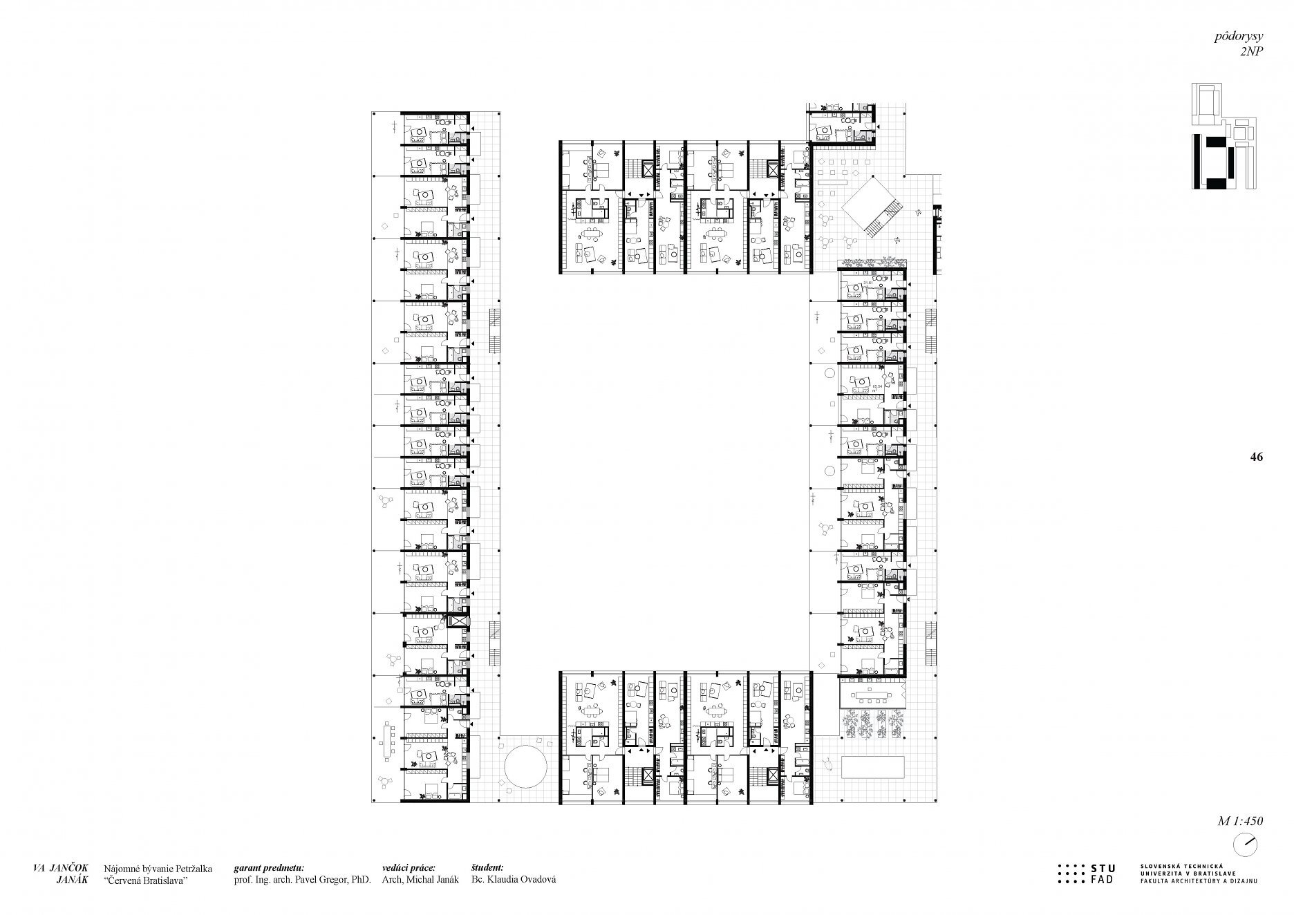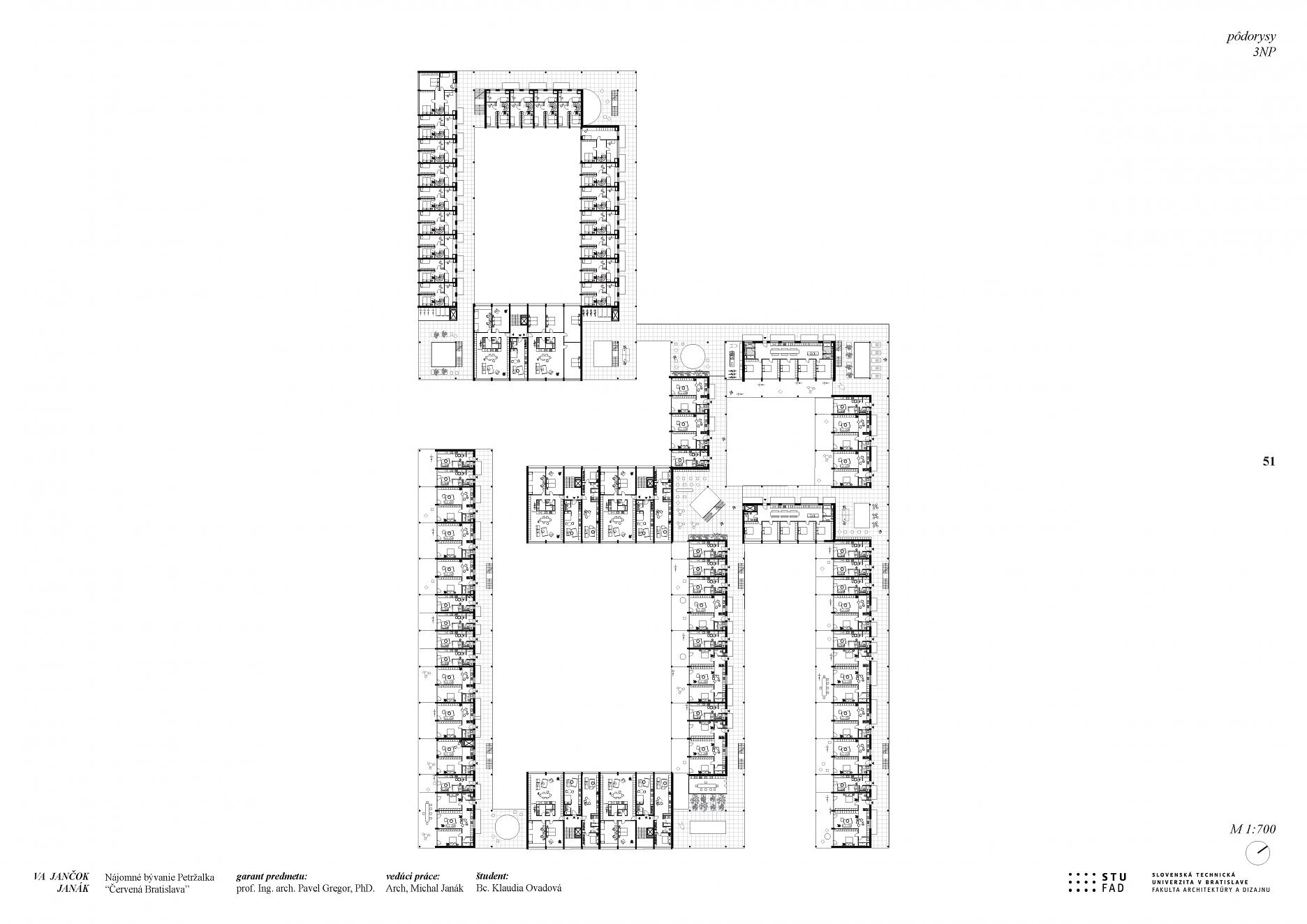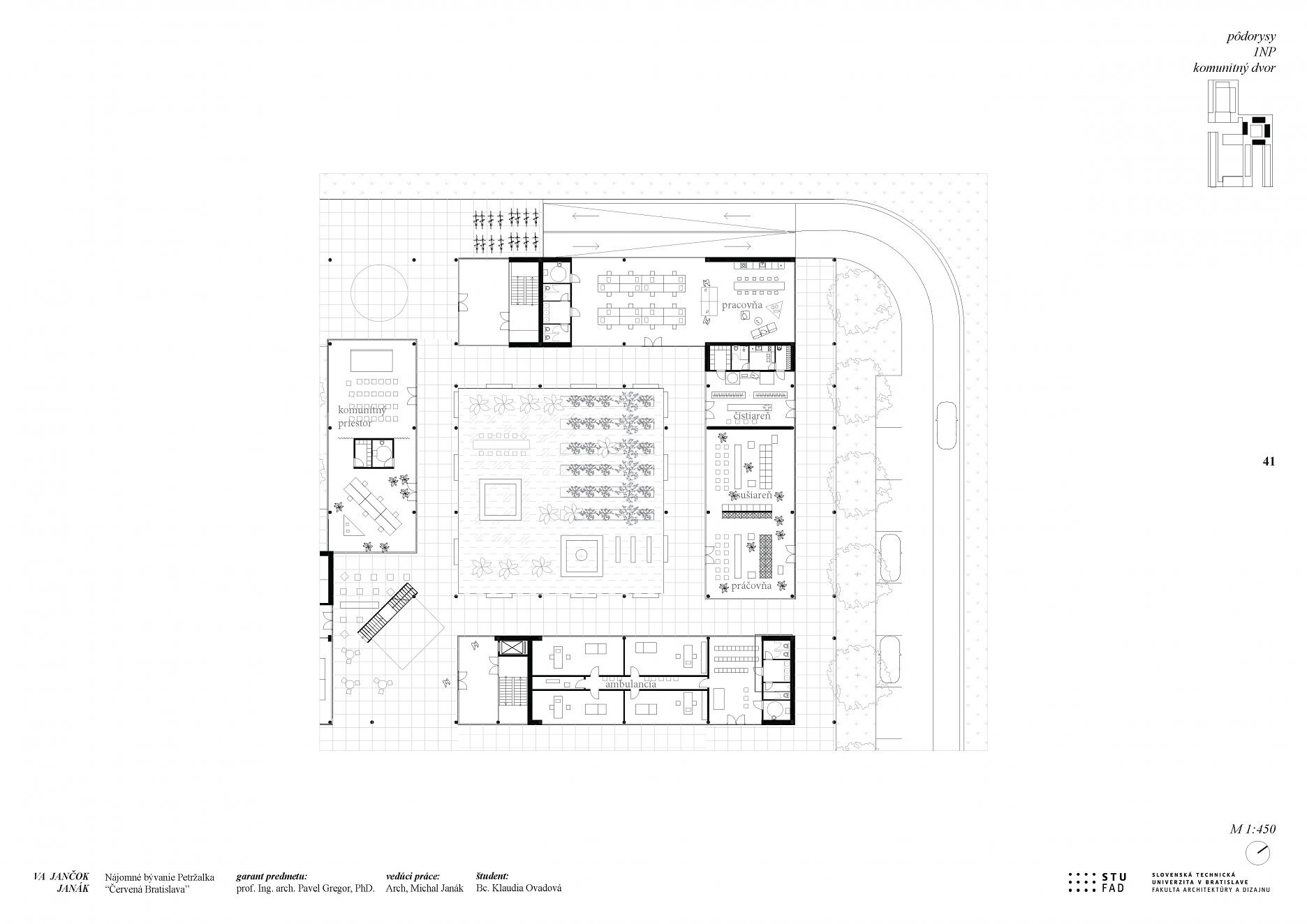 Dnes priblížime prácu "Červená Bratislava: Mestské nájomné bývanie, lokalita Varšavská", ktorá vznikla na pôde Fakulty architektúry a dizajnu STU v Bratislave pod vedením Michala Janáka. Klaudia Ovadová sa zaoberá témou mestského nájomného bývania na Kaukazskej ulici v Starej Petržalke, inšpirovaného fenoménom "Červená Viedeň". Práca skúma historické aspekty sociálneho bývania a aplikuje ich na súčasný kontext, pričom zdôrazňuje význam komunitného života a udržateľnosti v mestskom plánovaní. Výsledkom je návrh, ktorý má za cieľ poskytnúť kvalitné bývanie a zároveň podporovať spoločenské väzby. Autorka vypĺňa dvojhektárový pozemok štvorpodlažnou blokovou zástavbou s 300 bytmi, pričom kladie dôraz na efektívne využitie priestoru. Kľúčovým prvkom je päť odlišných dvorov, ktoré spájajú súkromné a verejné funkcie: súkromná časť umožňuje pestovanie rastlín, zatiaľčo verejná časť obsahuje tržničnú piazzetu s vybavenosťou. Predzáhradky rozširujú bezbariérové byty o vlastné vonkajšie priestory. Pavlačové bytové domy ponúkajú prístup k vonkajším aktivitám v podobe "kĺbov" a slúžia ako miesta pre komunitné záhrady, čitárne a relaxačné zóny.