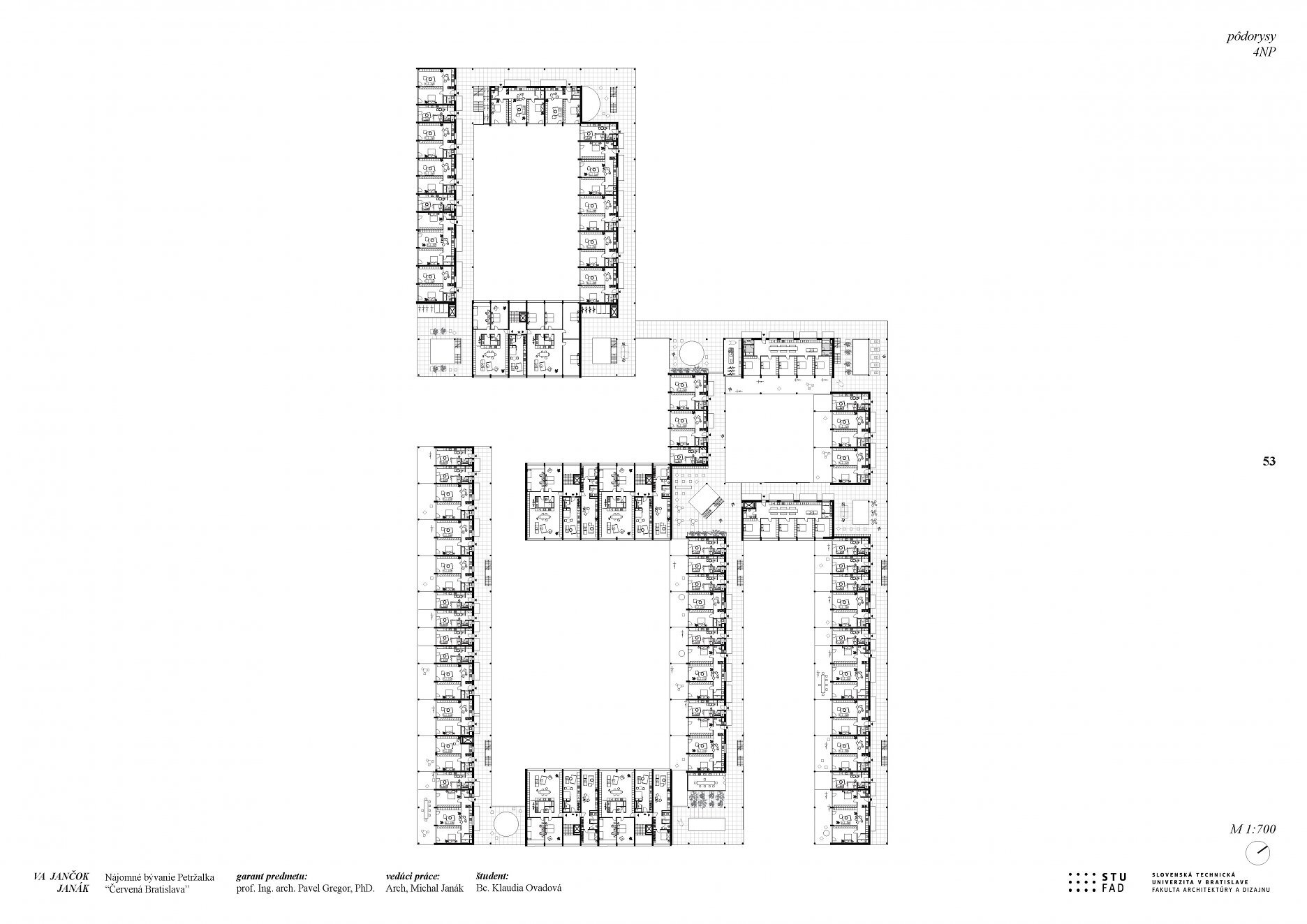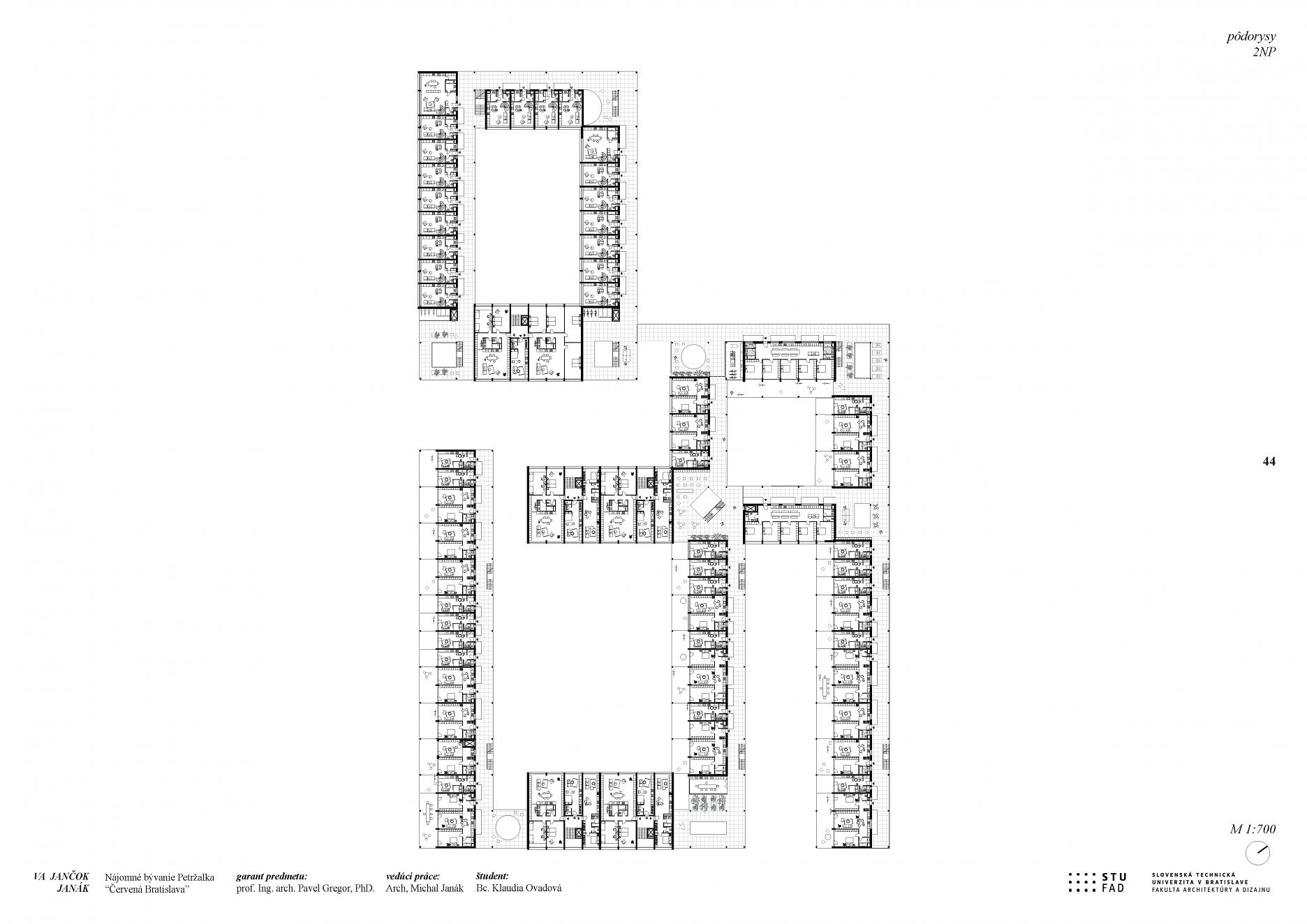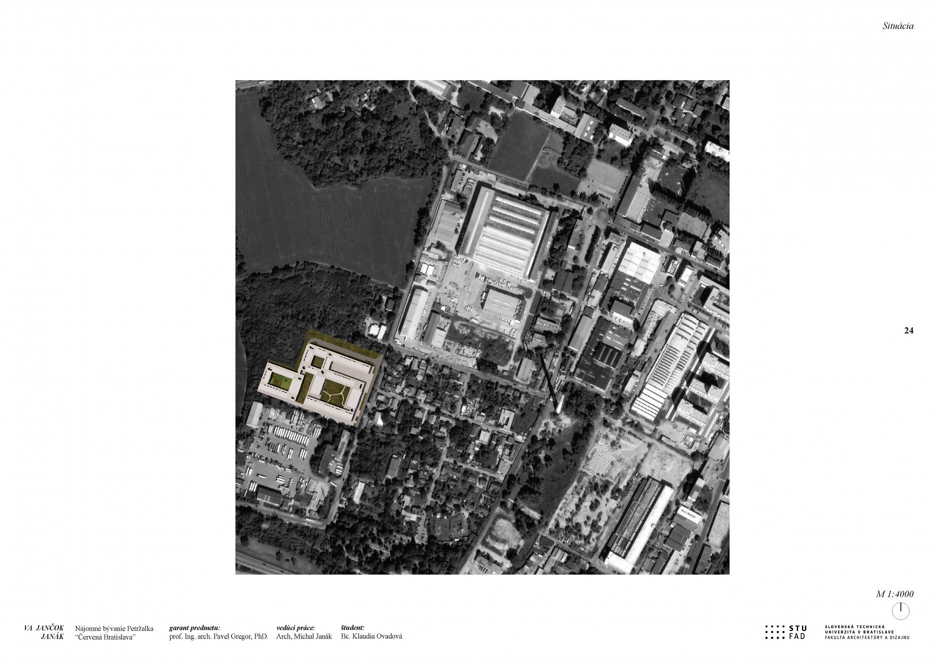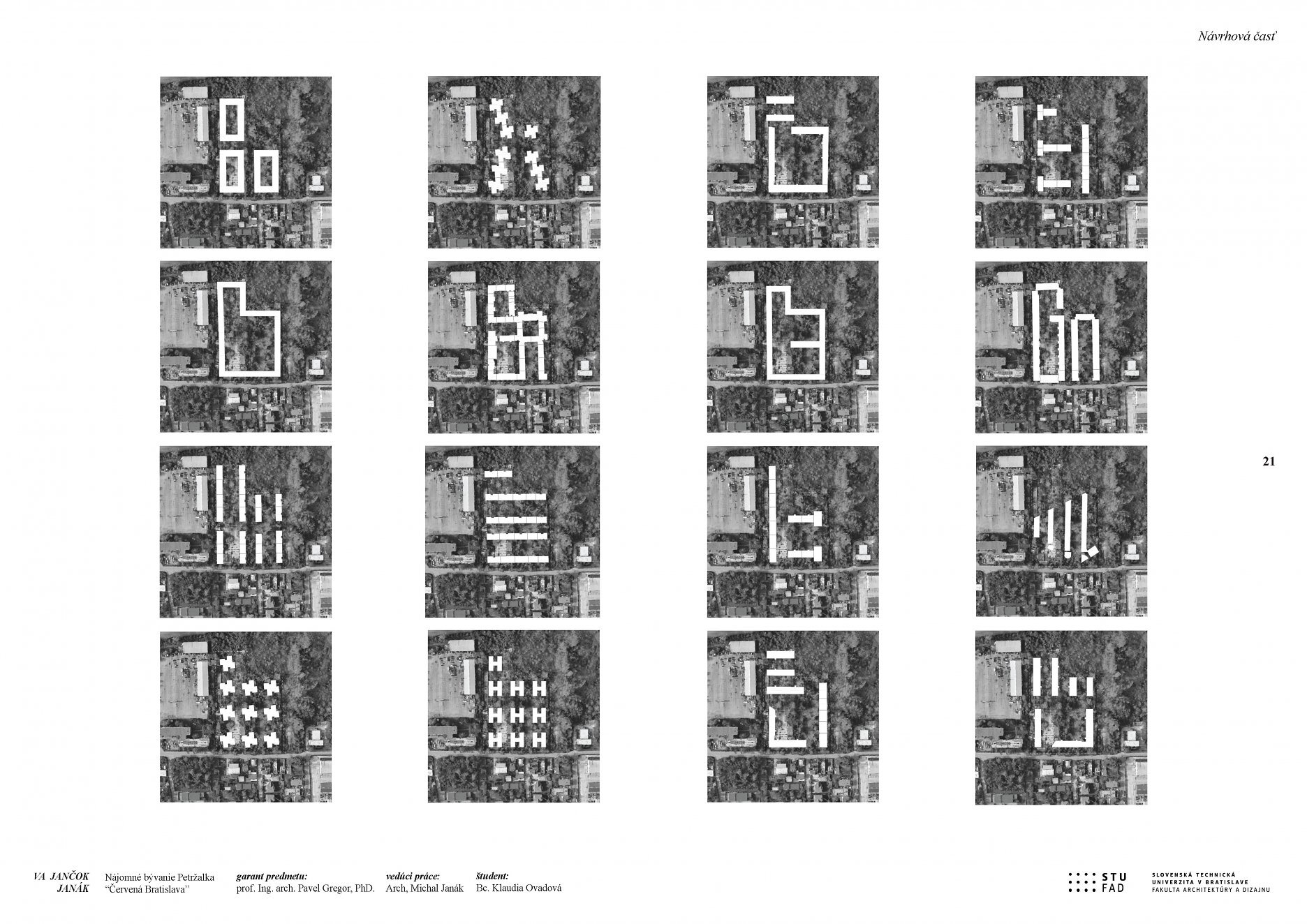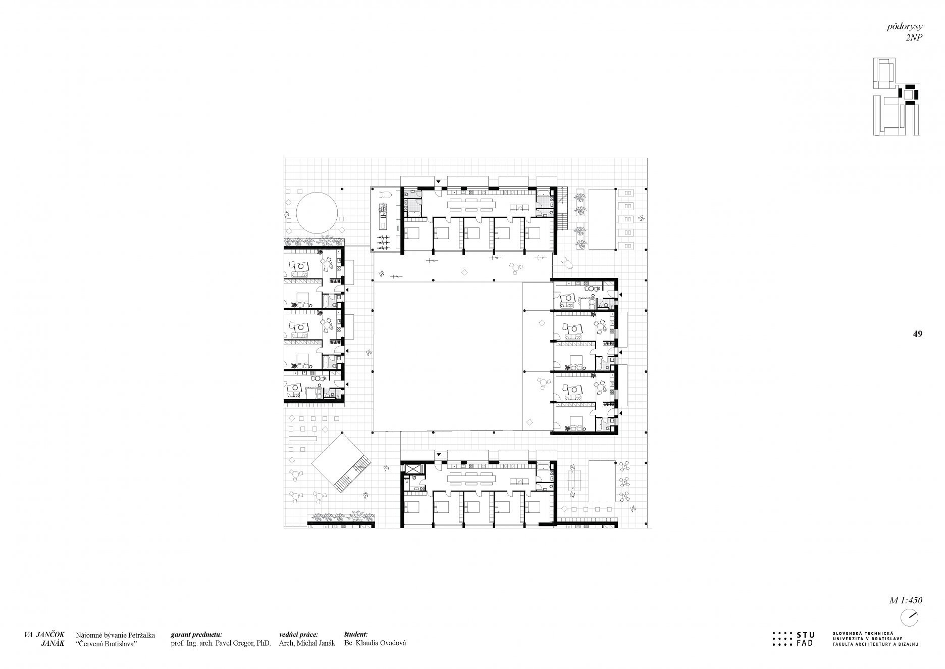 Dnes priblížime prácu "Červená Bratislava: Mestské nájomné bývanie, lokalita Varšavská", ktorá vznikla na pôde Fakulty architektúry a dizajnu STU v Bratislave pod vedením Michala Janáka. Klaudia Ovadová sa zaoberá témou mestského nájomného bývania na Kaukazskej ulici v Starej Petržalke, inšpirovaného fenoménom "Červená Viedeň". Práca skúma historické aspekty sociálneho bývania a aplikuje ich na súčasný kontext, pričom zdôrazňuje význam komunitného života a udržateľnosti v mestskom plánovaní. Výsledkom je návrh, ktorý má za cieľ poskytnúť kvalitné bývanie a zároveň podporovať spoločenské väzby. Autorka vypĺňa dvojhektárový pozemok štvorpodlažnou blokovou zástavbou s 300 bytmi, pričom kladie dôraz na efektívne využitie priestoru. Kľúčovým prvkom je päť odlišných dvorov, ktoré spájajú súkromné a verejné funkcie: súkromná časť umožňuje pestovanie rastlín, zatiaľčo verejná časť obsahuje tržničnú piazzetu s vybavenosťou. Predzáhradky rozširujú bezbariérové byty o vlastné vonkajšie priestory. Pavlačové bytové domy ponúkajú prístup k vonkajším aktivitám v podobe "kĺbov" a slúžia ako miesta pre komunitné záhrady, čitárne a relaxačné zóny.