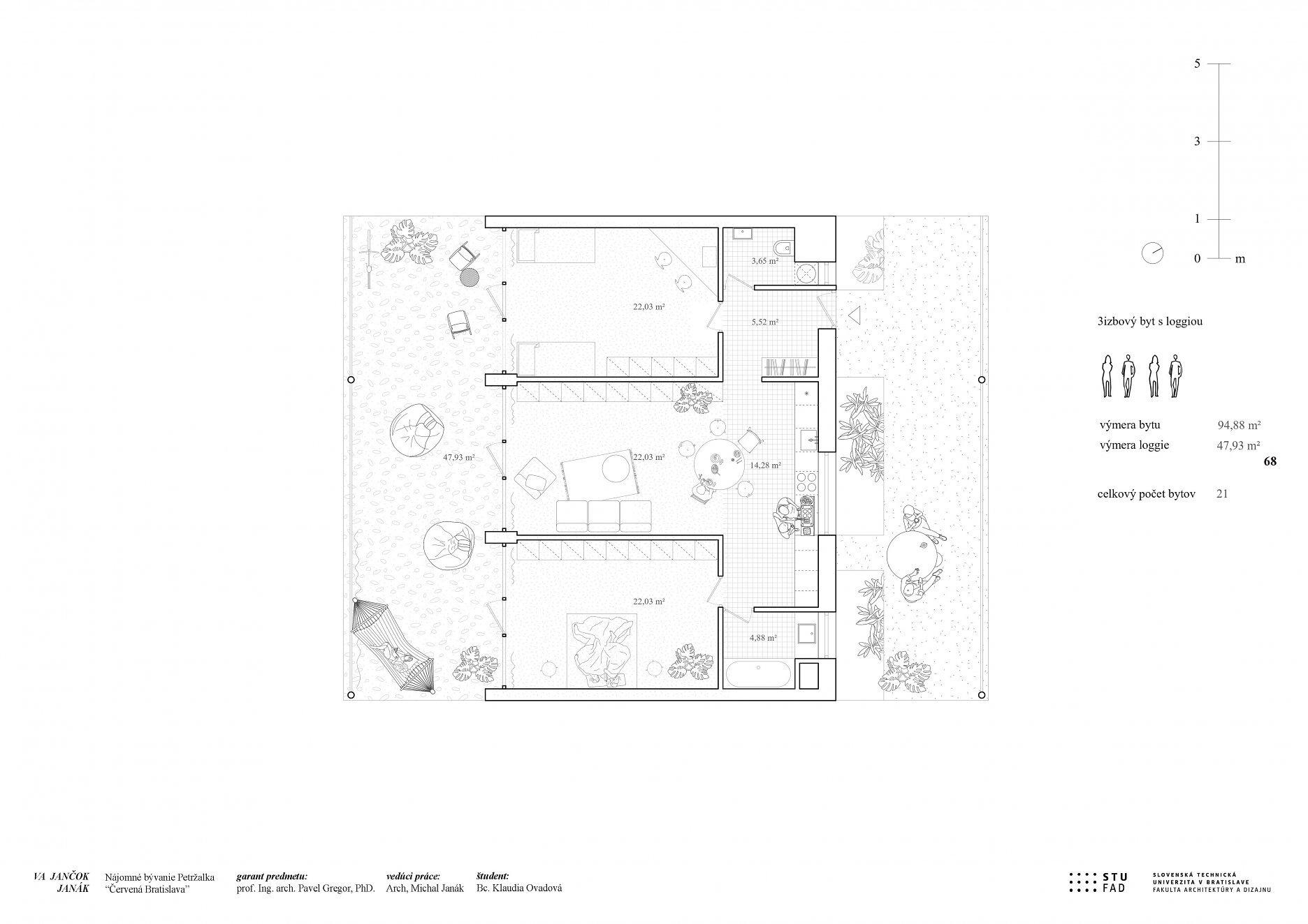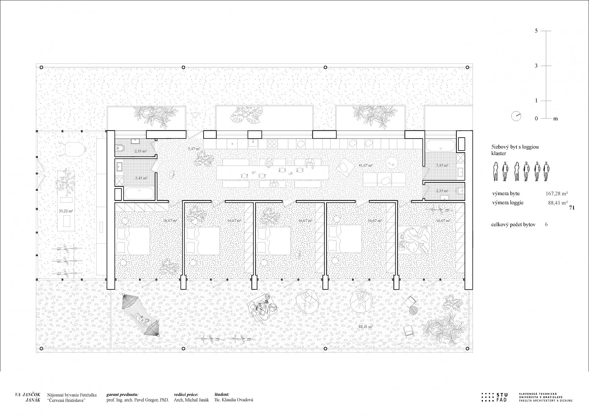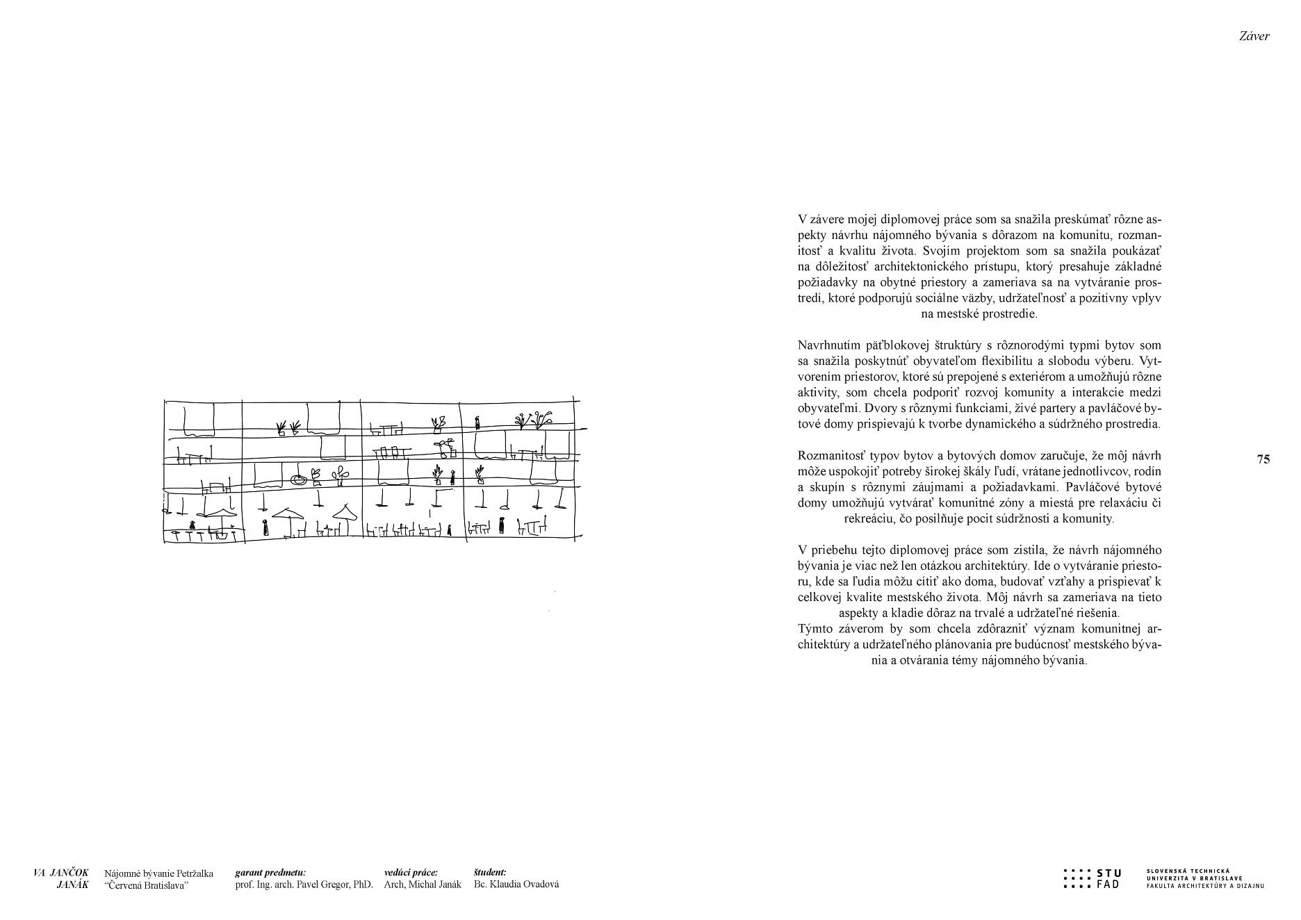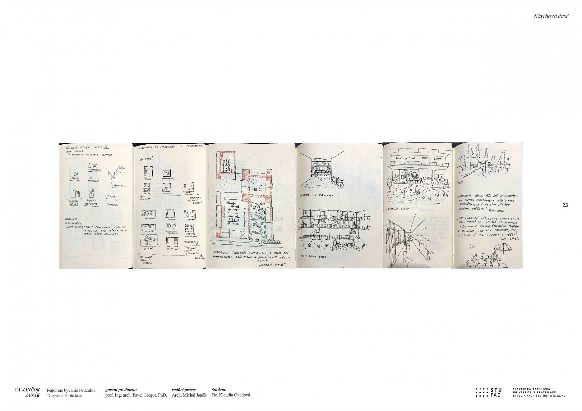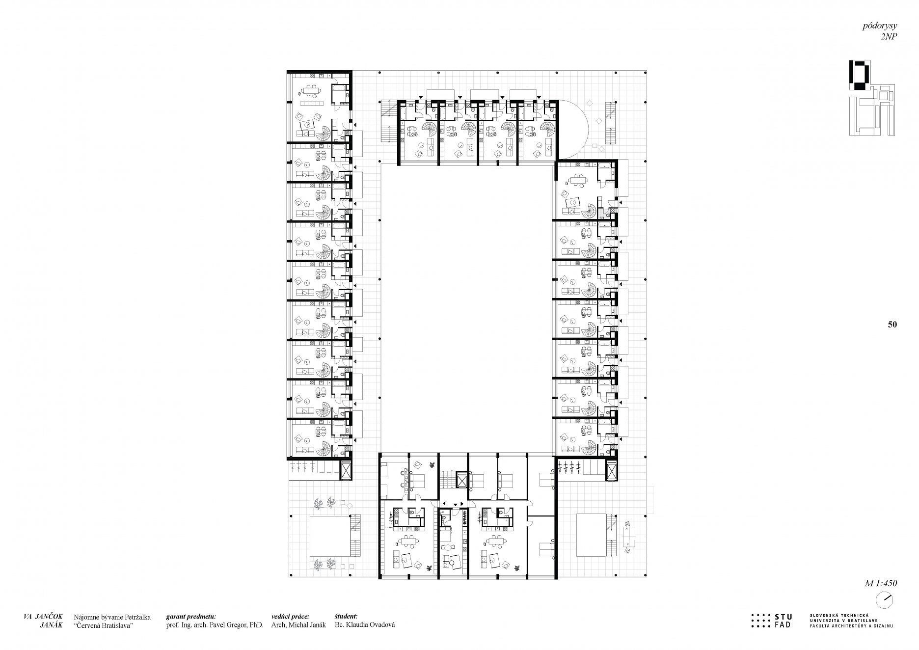 Dnes priblížime prácu "Červená Bratislava: Mestské nájomné bývanie, lokalita Varšavská", ktorá vznikla na pôde Fakulty architektúry a dizajnu STU v Bratislave pod vedením Michala Janáka. Klaudia Ovadová sa zaoberá témou mestského nájomného bývania na Kaukazskej ulici v Starej Petržalke, inšpirovaného fenoménom "Červená Viedeň". Práca skúma historické aspekty sociálneho bývania a aplikuje ich na súčasný kontext, pričom zdôrazňuje význam komunitného života a udržateľnosti v mestskom plánovaní. Výsledkom je návrh, ktorý má za cieľ poskytnúť kvalitné bývanie a zároveň podporovať spoločenské väzby. Autorka vypĺňa dvojhektárový pozemok štvorpodlažnou blokovou zástavbou s 300 bytmi, pričom kladie dôraz na efektívne využitie priestoru. Kľúčovým prvkom je päť odlišných dvorov, ktoré spájajú súkromné a verejné funkcie: súkromná časť umožňuje pestovanie rastlín, zatiaľčo verejná časť obsahuje tržničnú piazzetu s vybavenosťou. Predzáhradky rozširujú bezbariérové byty o vlastné vonkajšie priestory. Pavlačové bytové domy ponúkajú prístup k vonkajším aktivitám v podobe "kĺbov" a slúžia ako miesta pre komunitné záhrady, čitárne a relaxačné zóny.