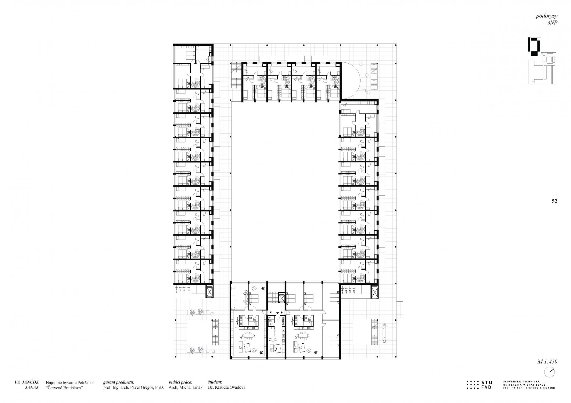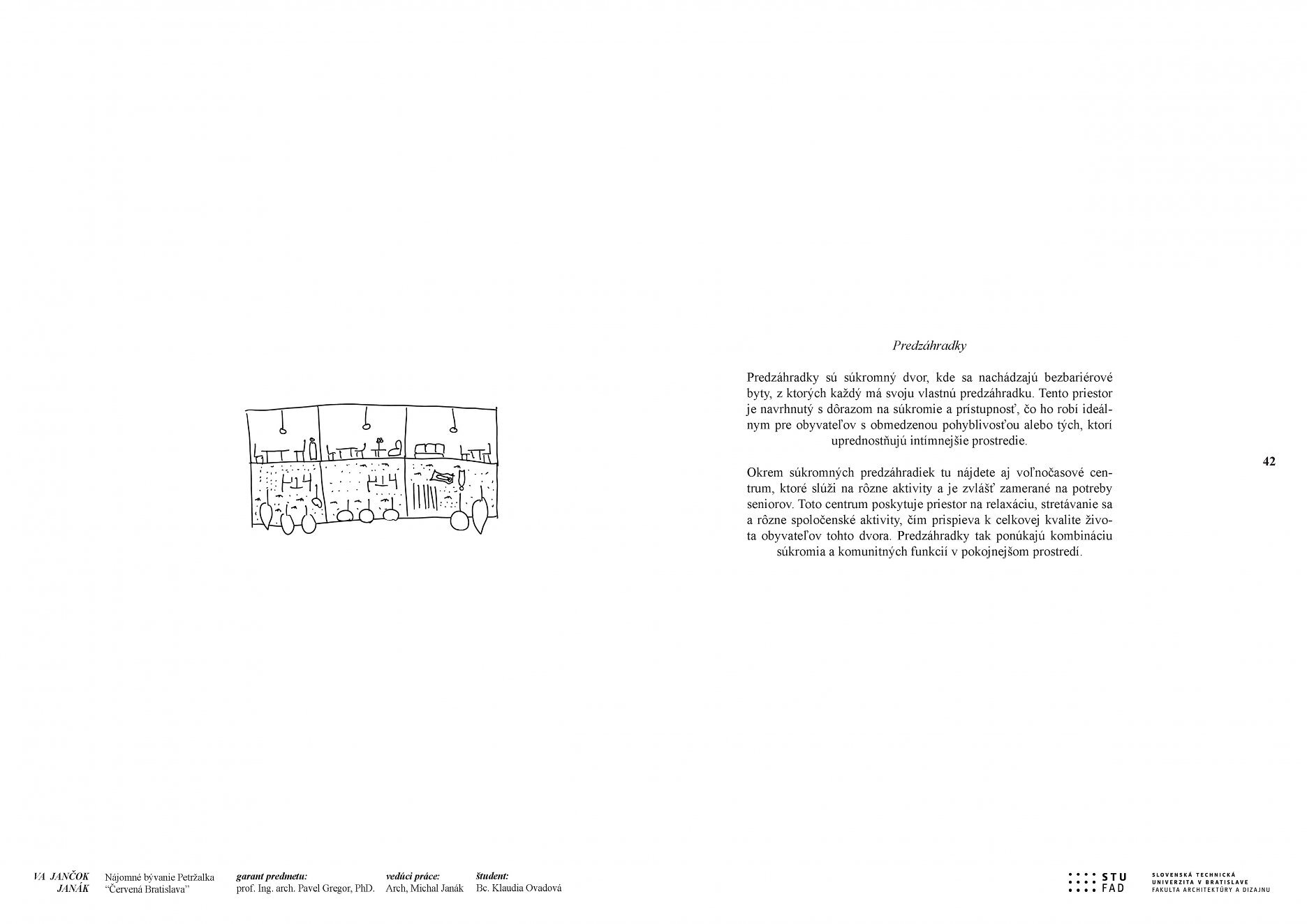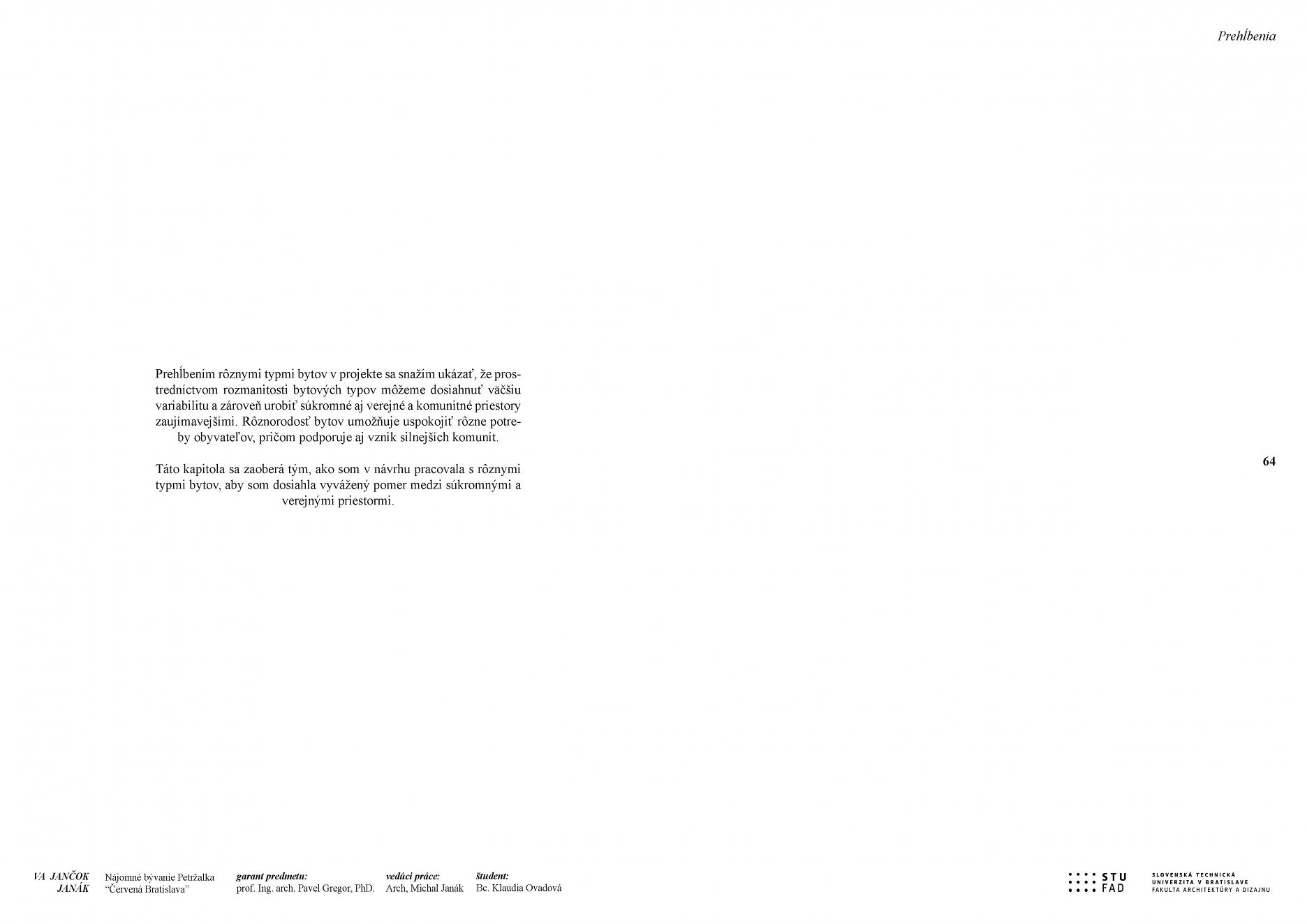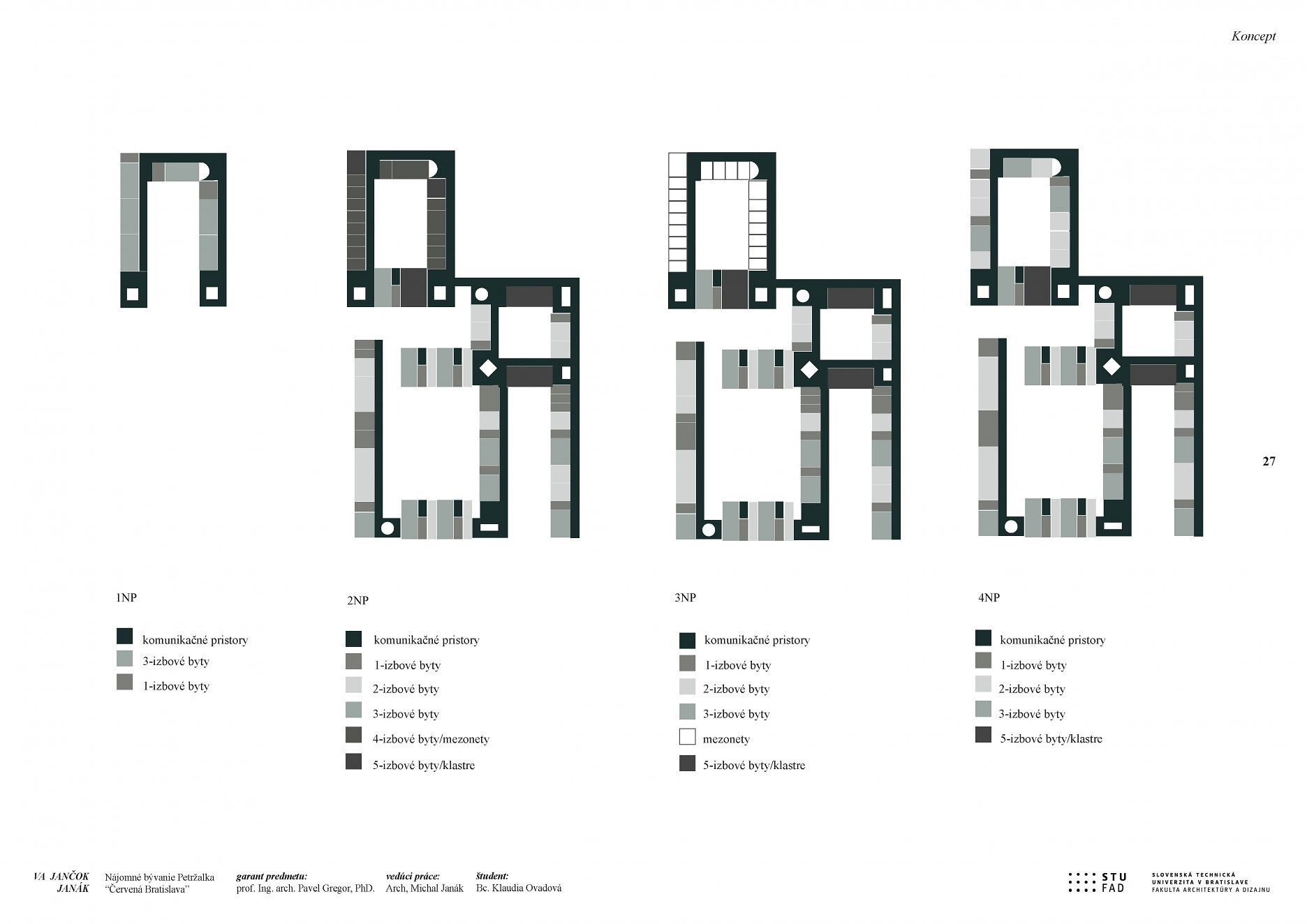 Dnes priblížime prácu "Červená Bratislava: Mestské nájomné bývanie, lokalita Varšavská", ktorá vznikla na pôde Fakulty architektúry a dizajnu STU v Bratislave pod vedením Michala Janáka. Klaudia Ovadová sa zaoberá témou mestského nájomného bývania na Kaukazskej ulici v Starej Petržalke, inšpirovaného fenoménom "Červená Viedeň". Práca skúma historické aspekty sociálneho bývania a aplikuje ich na súčasný kontext, pričom zdôrazňuje význam komunitného života a udržateľnosti v mestskom plánovaní. Výsledkom je návrh, ktorý má za cieľ poskytnúť kvalitné bývanie a zároveň podporovať spoločenské väzby. Autorka vypĺňa dvojhektárový pozemok štvorpodlažnou blokovou zástavbou s 300 bytmi, pričom kladie dôraz na efektívne využitie priestoru. Kľúčovým prvkom je päť odlišných dvorov, ktoré spájajú súkromné a verejné funkcie: súkromná časť umožňuje pestovanie rastlín, zatiaľčo verejná časť obsahuje tržničnú piazzetu s vybavenosťou. Predzáhradky rozširujú bezbariérové byty o vlastné vonkajšie priestory. Pavlačové bytové domy ponúkajú prístup k vonkajším aktivitám v podobe "kĺbov" a slúžia ako miesta pre komunitné záhrady, čitárne a relaxačné zóny.