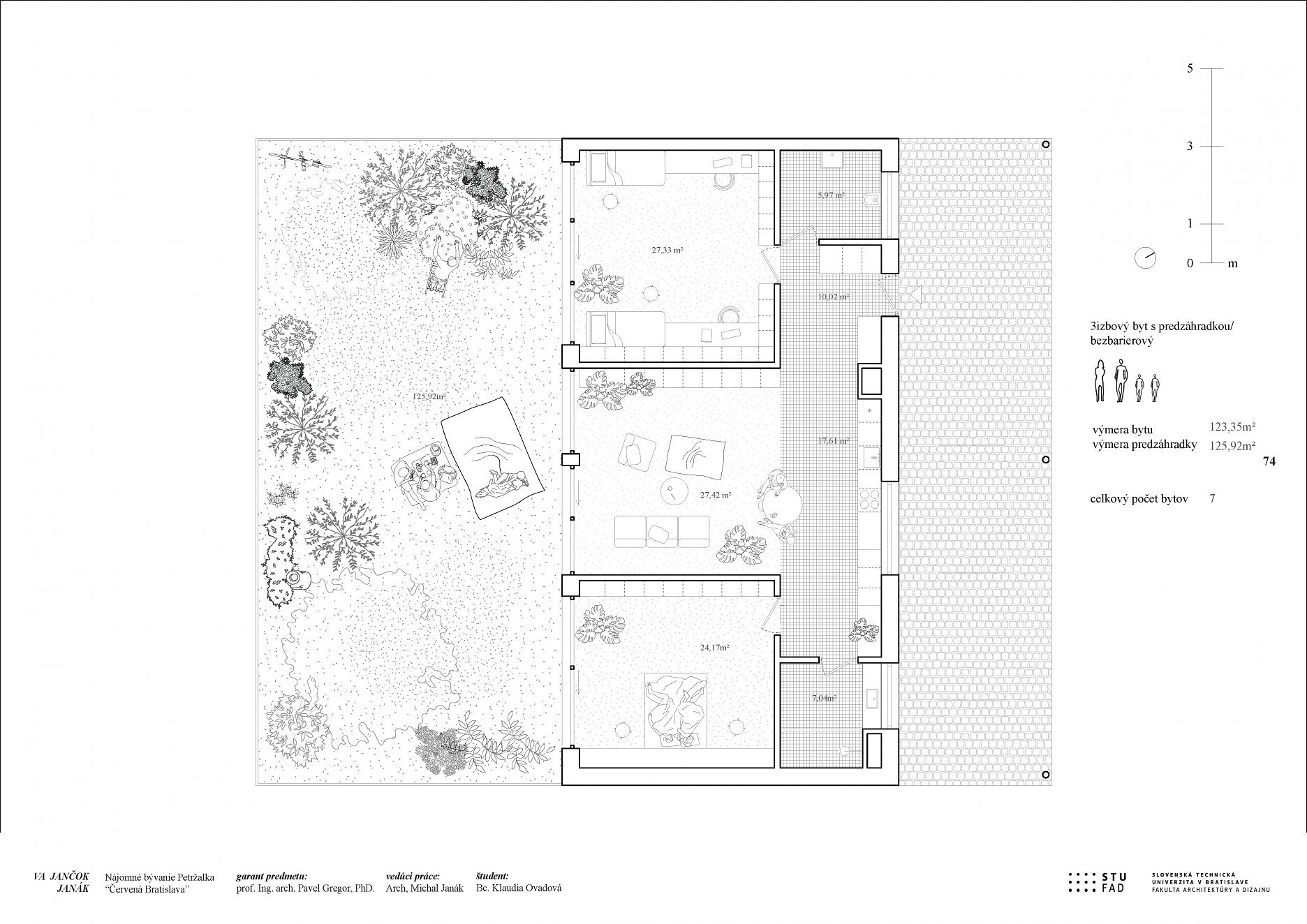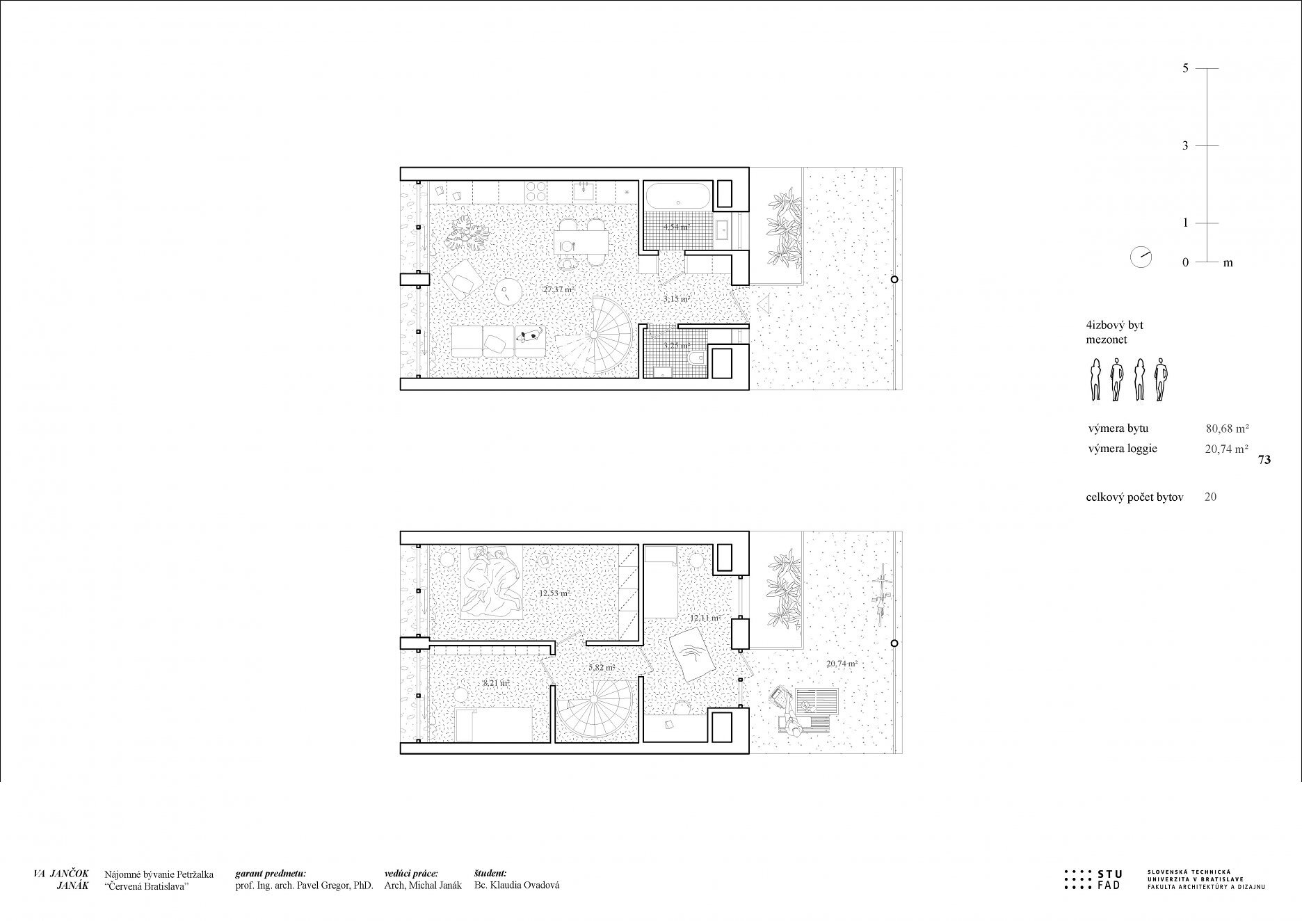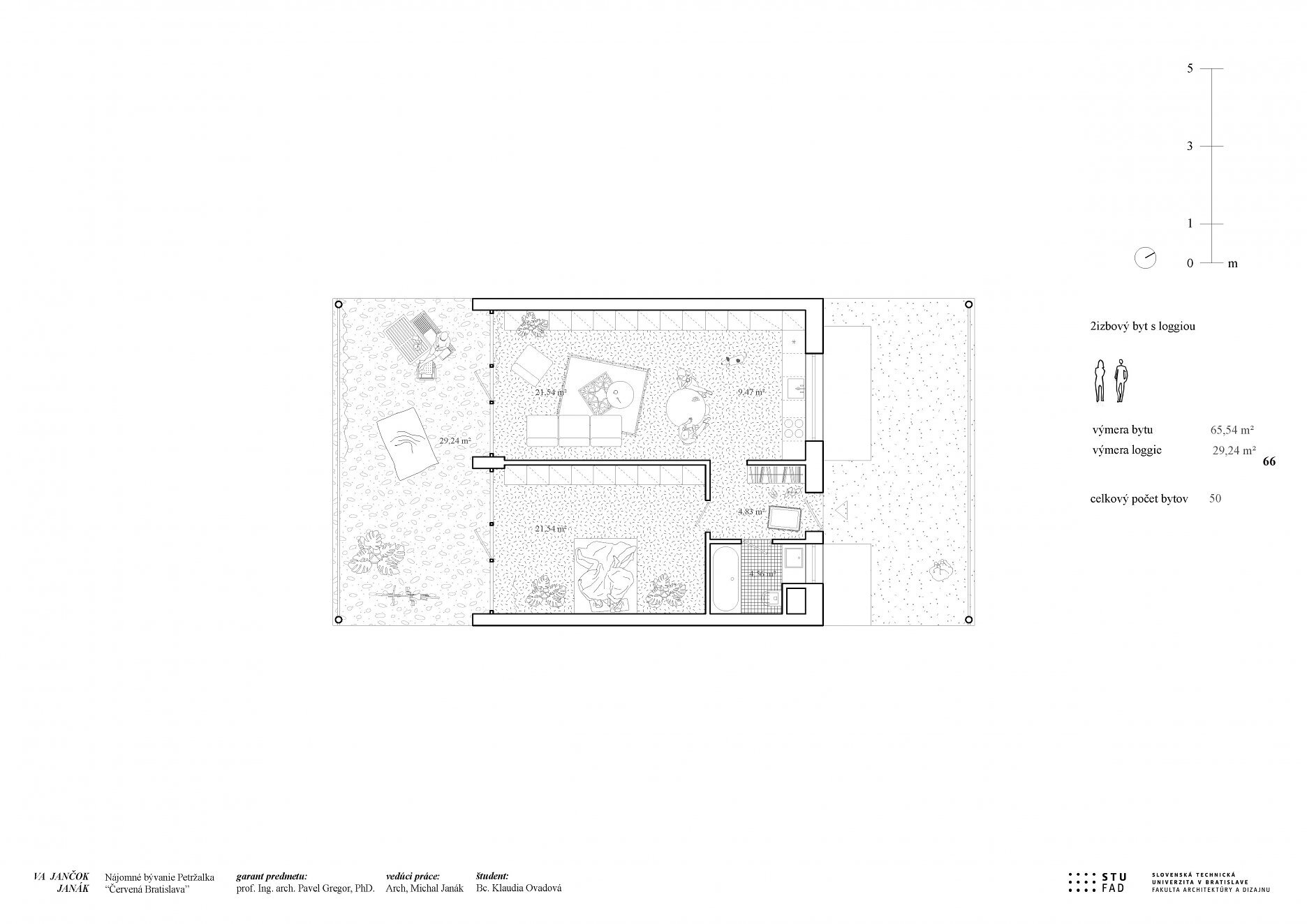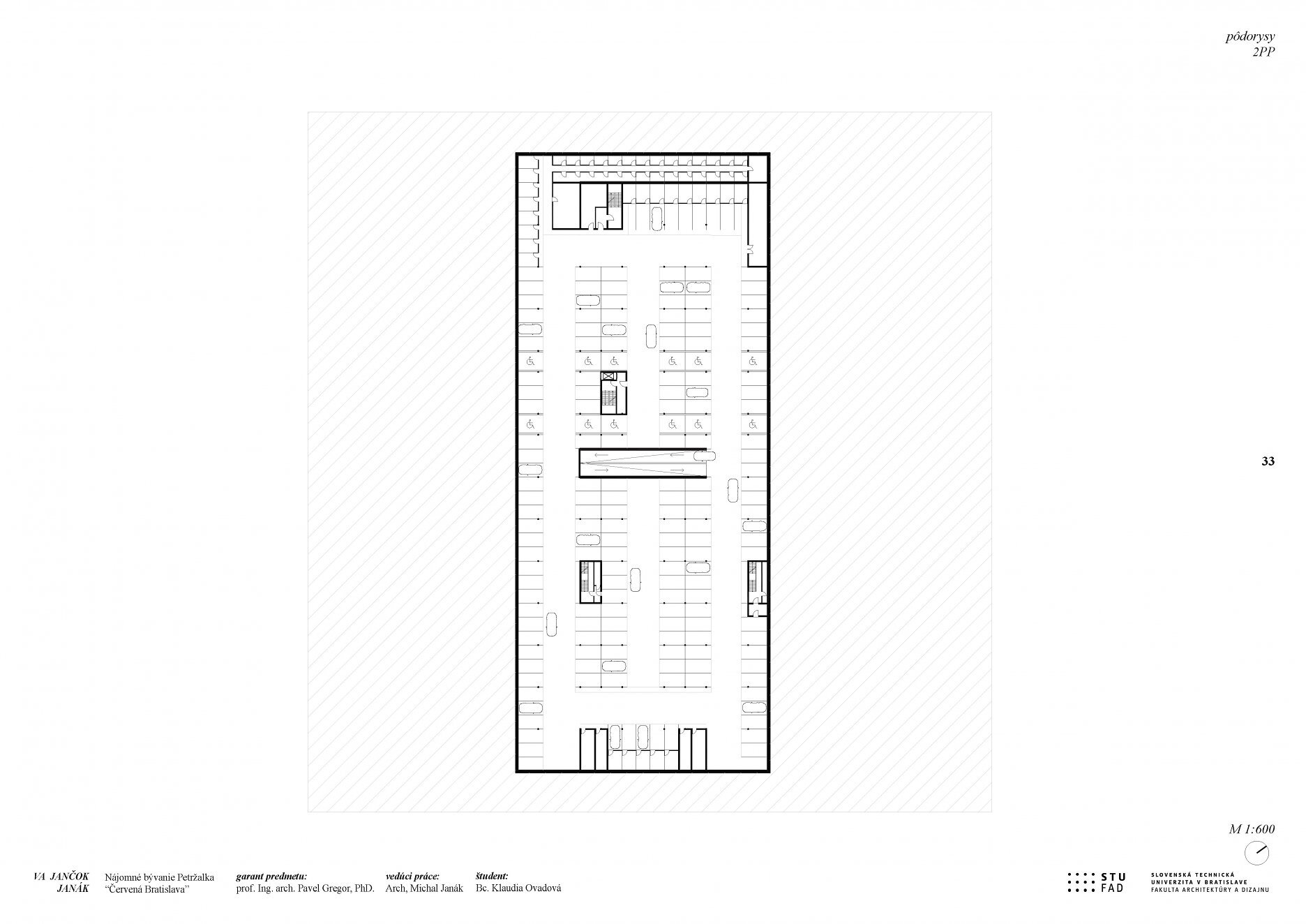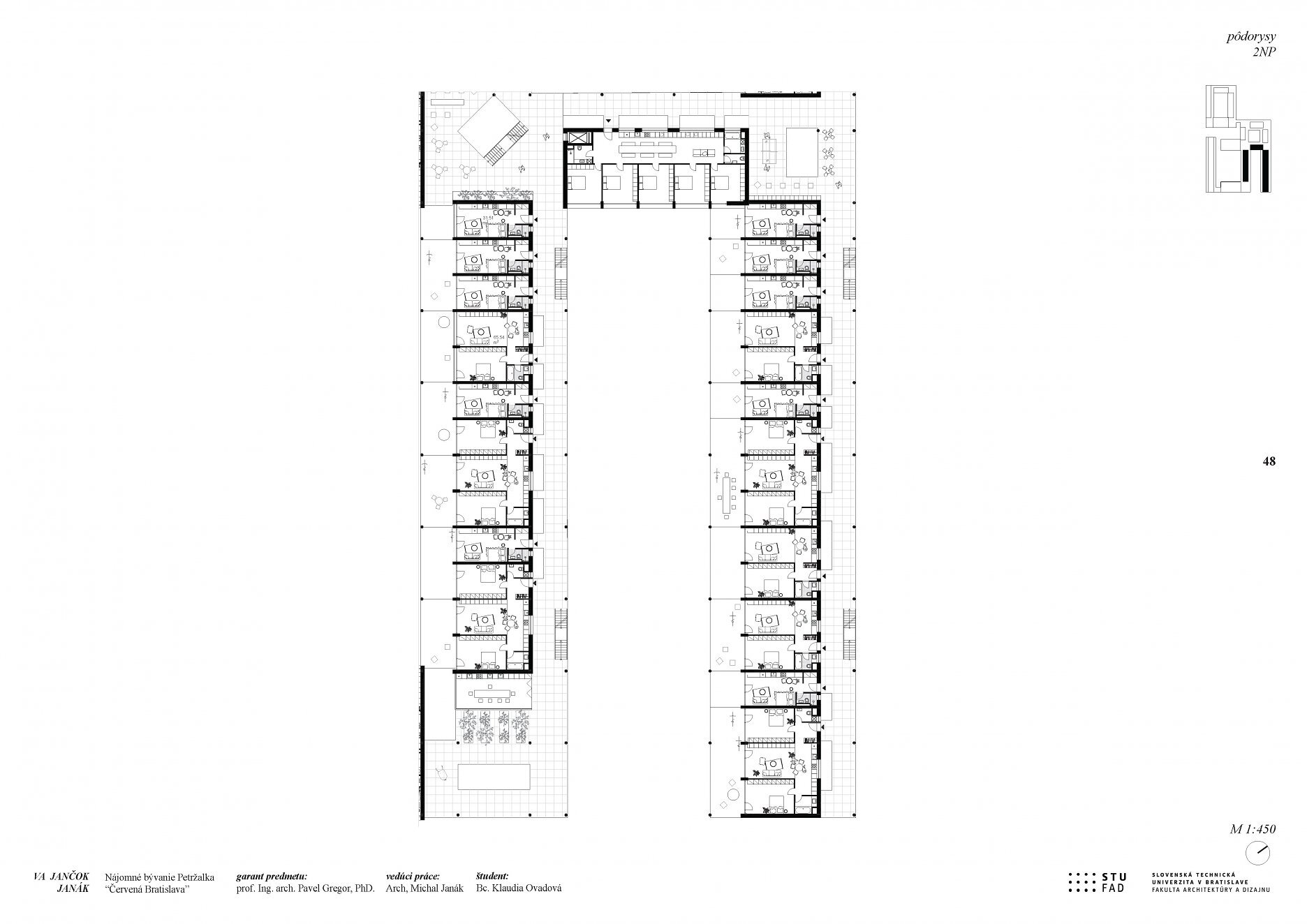 Dnes priblížime prácu "Červená Bratislava: Mestské nájomné bývanie, lokalita Varšavská", ktorá vznikla na pôde Fakulty architektúry a dizajnu STU v Bratislave pod vedením Michala Janáka. Klaudia Ovadová sa zaoberá témou mestského nájomného bývania na Kaukazskej ulici v Starej Petržalke, inšpirovaného fenoménom "Červená Viedeň". Práca skúma historické aspekty sociálneho bývania a aplikuje ich na súčasný kontext, pričom zdôrazňuje význam komunitného života a udržateľnosti v mestskom plánovaní. Výsledkom je návrh, ktorý má za cieľ poskytnúť kvalitné bývanie a zároveň podporovať spoločenské väzby. Autorka vypĺňa dvojhektárový pozemok štvorpodlažnou blokovou zástavbou s 300 bytmi, pričom kladie dôraz na efektívne využitie priestoru. Kľúčovým prvkom je päť odlišných dvorov, ktoré spájajú súkromné a verejné funkcie: súkromná časť umožňuje pestovanie rastlín, zatiaľčo verejná časť obsahuje tržničnú piazzetu s vybavenosťou. Predzáhradky rozširujú bezbariérové byty o vlastné vonkajšie priestory. Pavlačové bytové domy ponúkajú prístup k vonkajším aktivitám v podobe "kĺbov" a slúžia ako miesta pre komunitné záhrady, čitárne a relaxačné zóny.