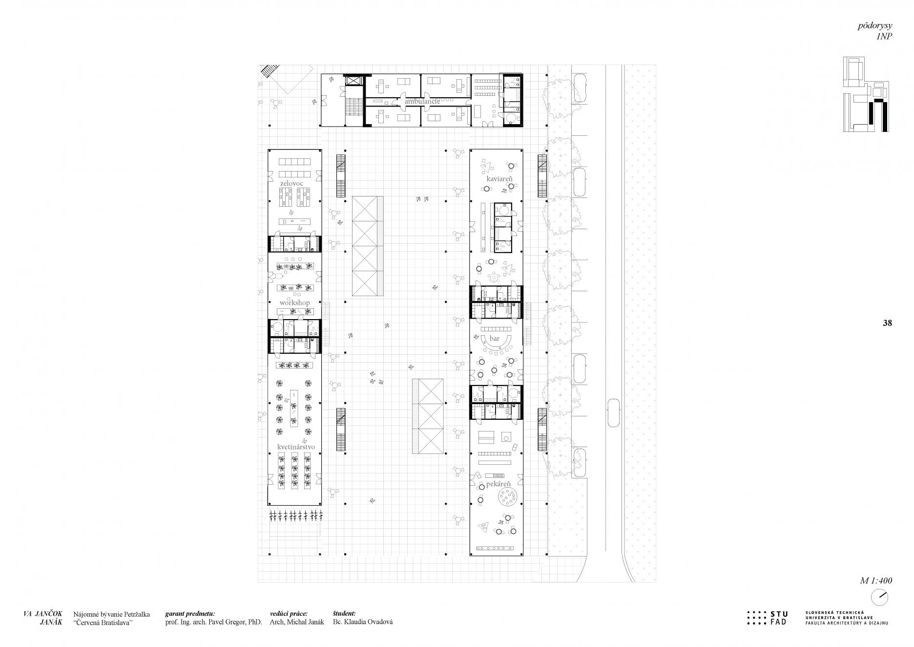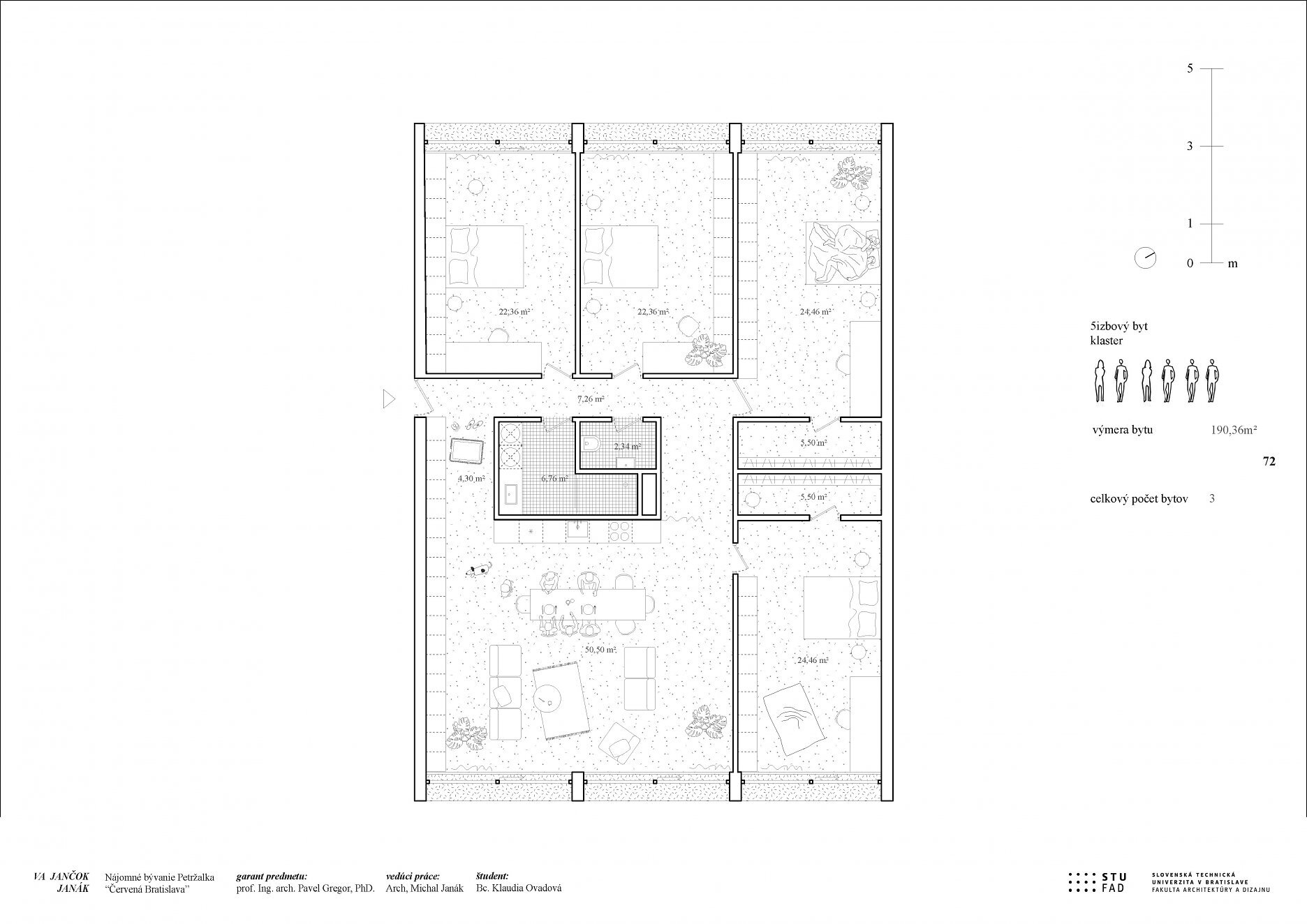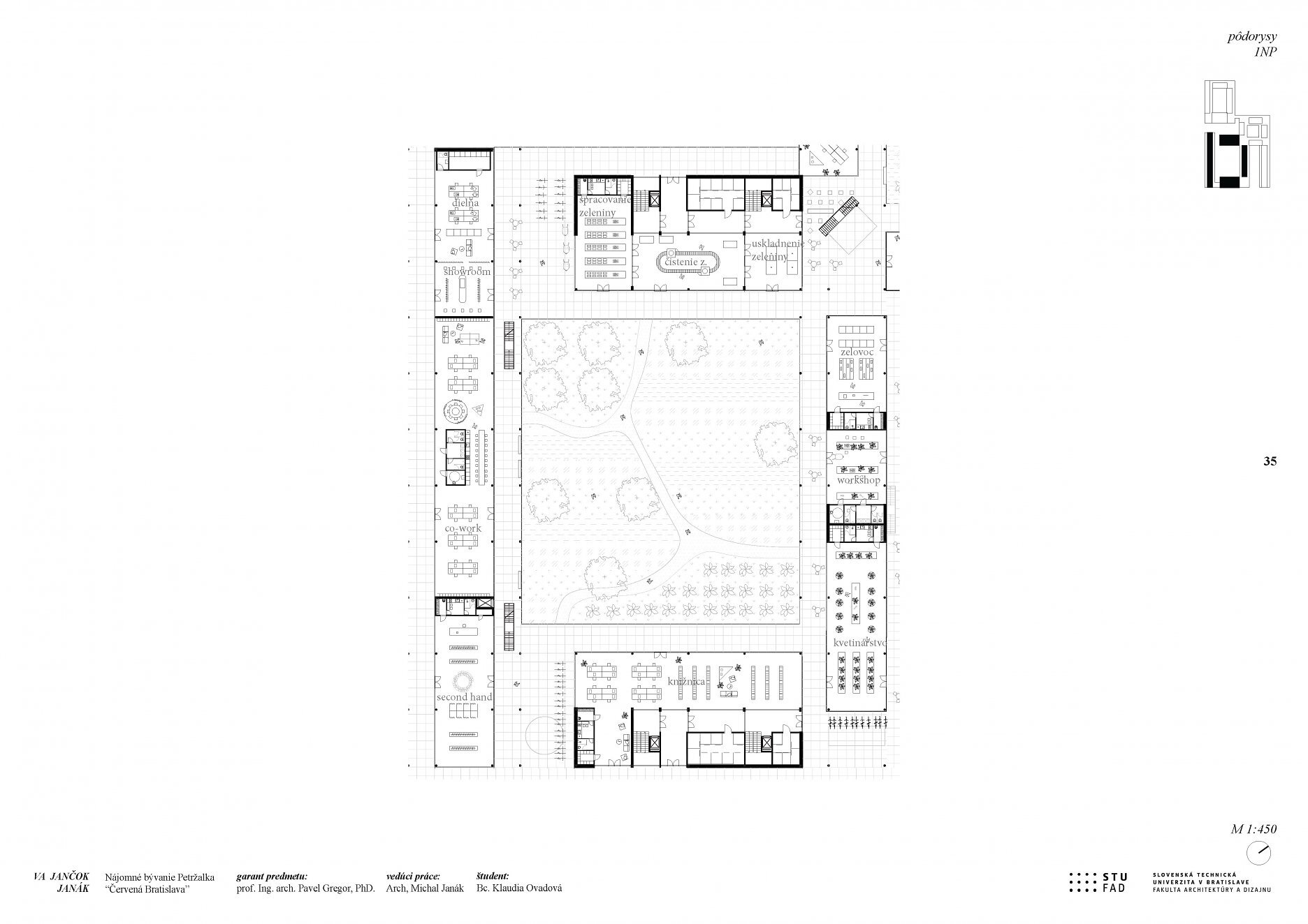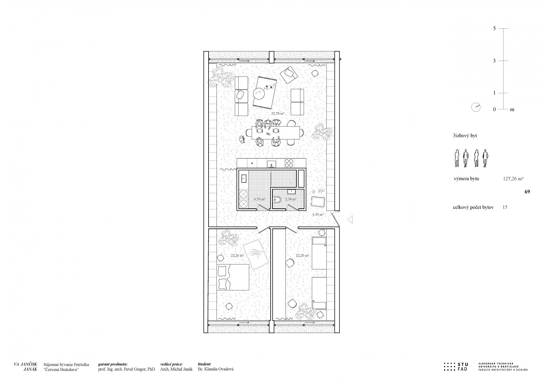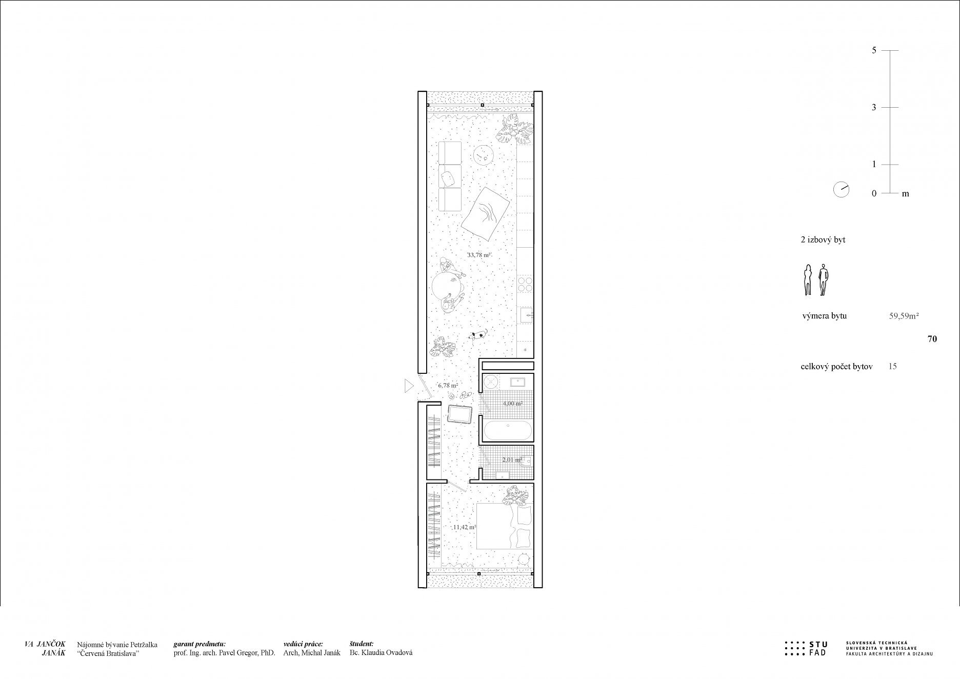 Dnes priblížime prácu "Červená Bratislava: Mestské nájomné bývanie, lokalita Varšavská", ktorá vznikla na pôde Fakulty architektúry a dizajnu STU v Bratislave pod vedením Michala Janáka. Klaudia Ovadová sa zaoberá témou mestského nájomného bývania na Kaukazskej ulici v Starej Petržalke, inšpirovaného fenoménom "Červená Viedeň". Práca skúma historické aspekty sociálneho bývania a aplikuje ich na súčasný kontext, pričom zdôrazňuje význam komunitného života a udržateľnosti v mestskom plánovaní. Výsledkom je návrh, ktorý má za cieľ poskytnúť kvalitné bývanie a zároveň podporovať spoločenské väzby. Autorka vypĺňa dvojhektárový pozemok štvorpodlažnou blokovou zástavbou s 300 bytmi, pričom kladie dôraz na efektívne využitie priestoru. Kľúčovým prvkom je päť odlišných dvorov, ktoré spájajú súkromné a verejné funkcie: súkromná časť umožňuje pestovanie rastlín, zatiaľčo verejná časť obsahuje tržničnú piazzetu s vybavenosťou. Predzáhradky rozširujú bezbariérové byty o vlastné vonkajšie priestory. Pavlačové bytové domy ponúkajú prístup k vonkajším aktivitám v podobe "kĺbov" a slúžia ako miesta pre komunitné záhrady, čitárne a relaxačné zóny.