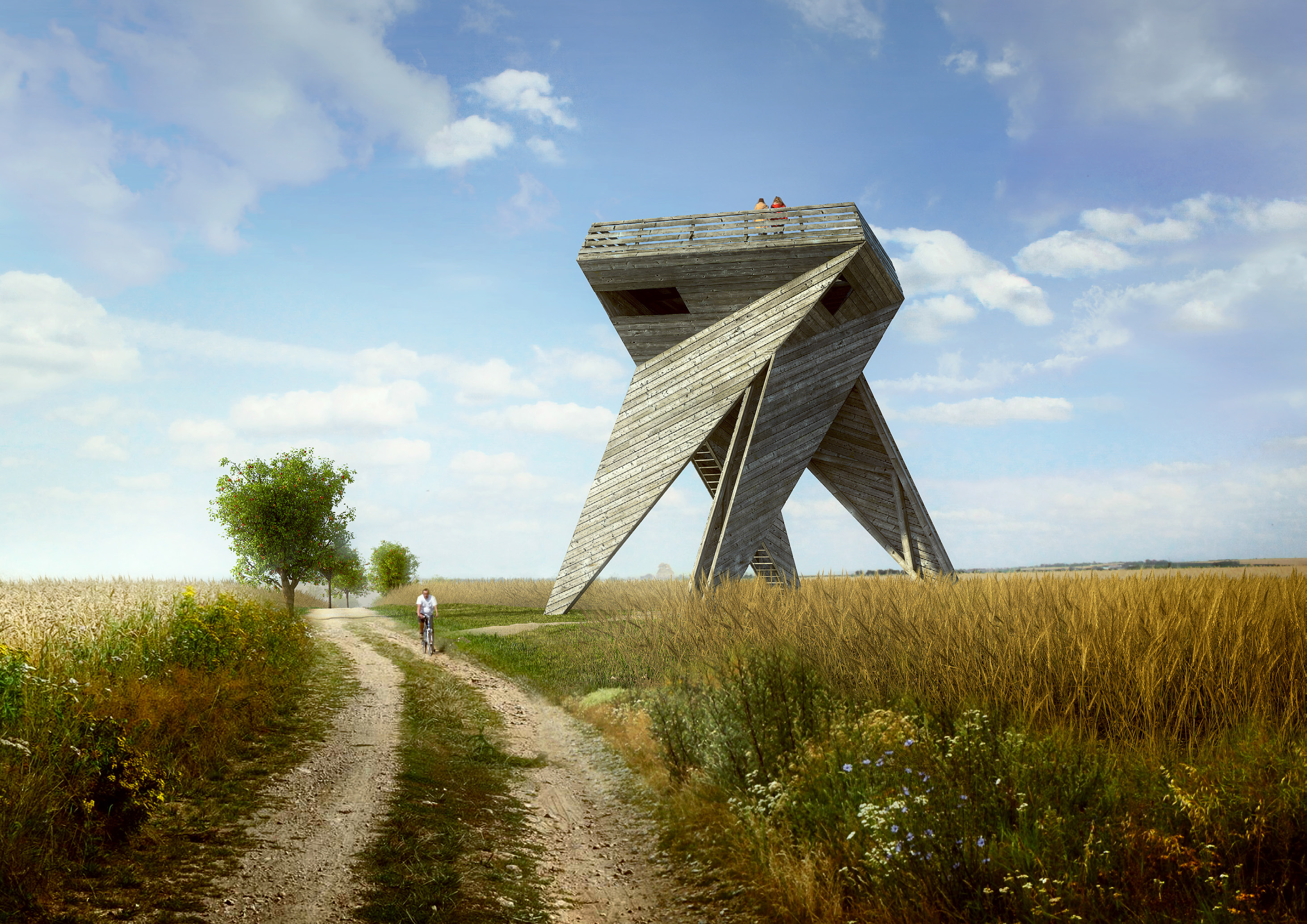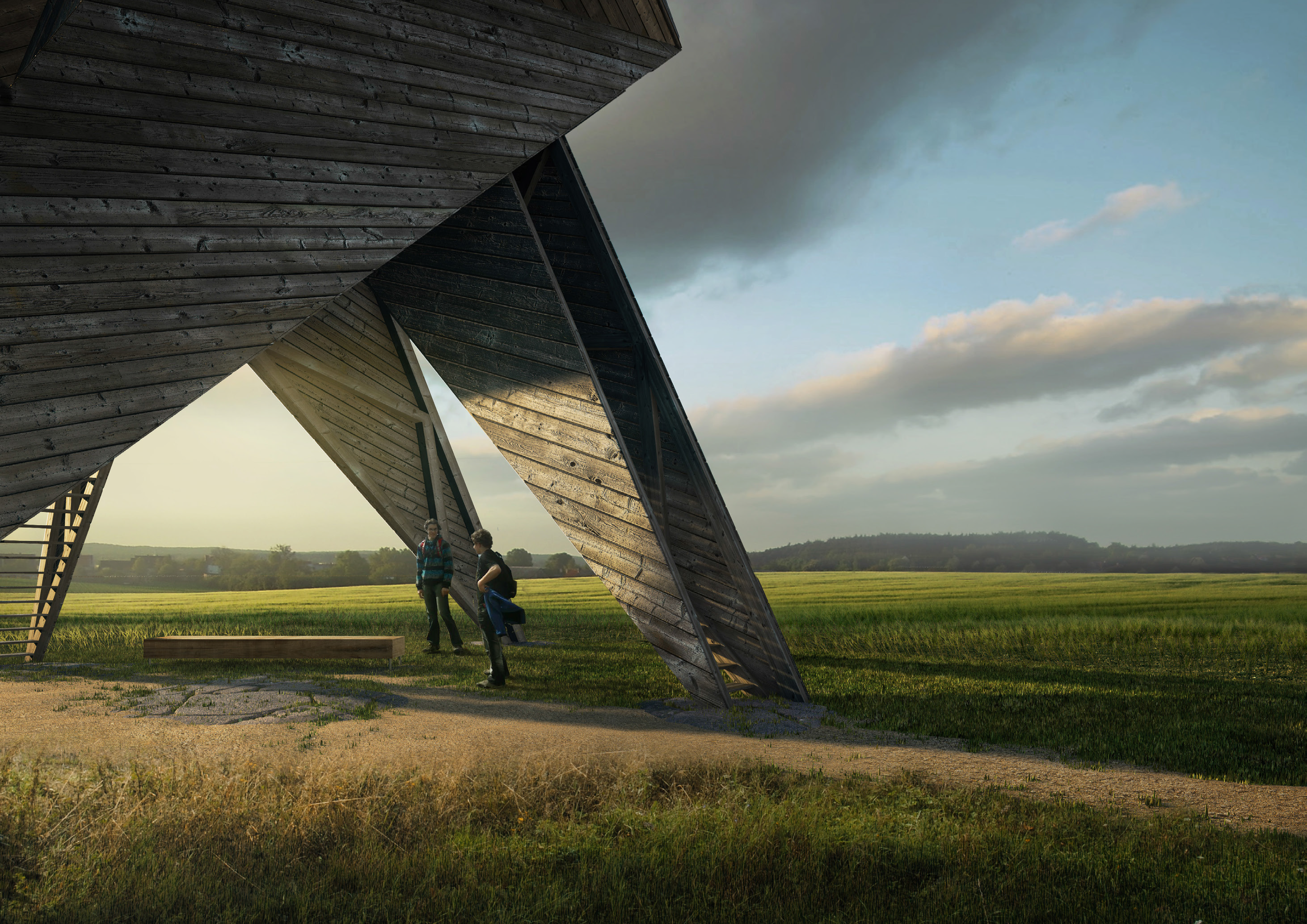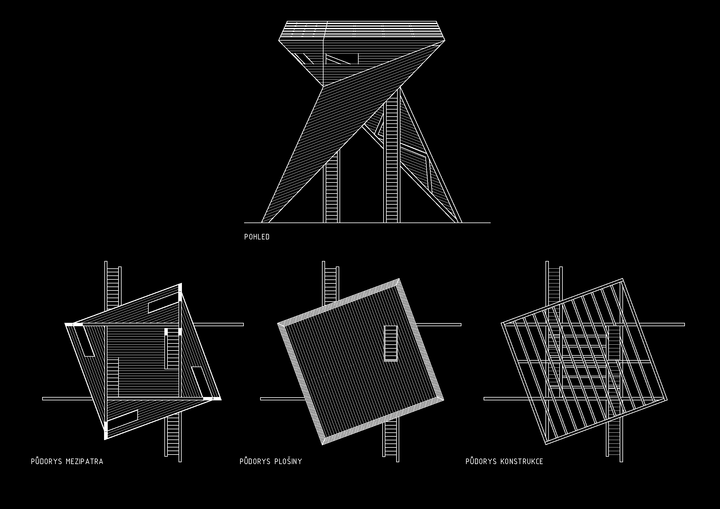 Základní rámec konstrukce rozhledny je složen ze čtyř dřevěných vazníků klasického tvaru, které vzájemným zaklesnutím vytvářejí dynamický dojem rotace. Přesto je konstrukce lapidární, vychází z elementární architektury posedu – čtyři stojiny zavětrované pomocí dalších čtyř fošen, základ tedy zůstává stejný. Stejně jako posed má i rozhledna zastřešenou část mezipatra, a to výšce 7,8 metrů. Vlastní vyhlídková plošina se pak nachází nad ním ve výšce 10,5 metrů. Pod rozhlednou vzniká krytý prostor, kde je možné posvačit ve stínu, přečkat déšť nebo se jen krátce zastavit.