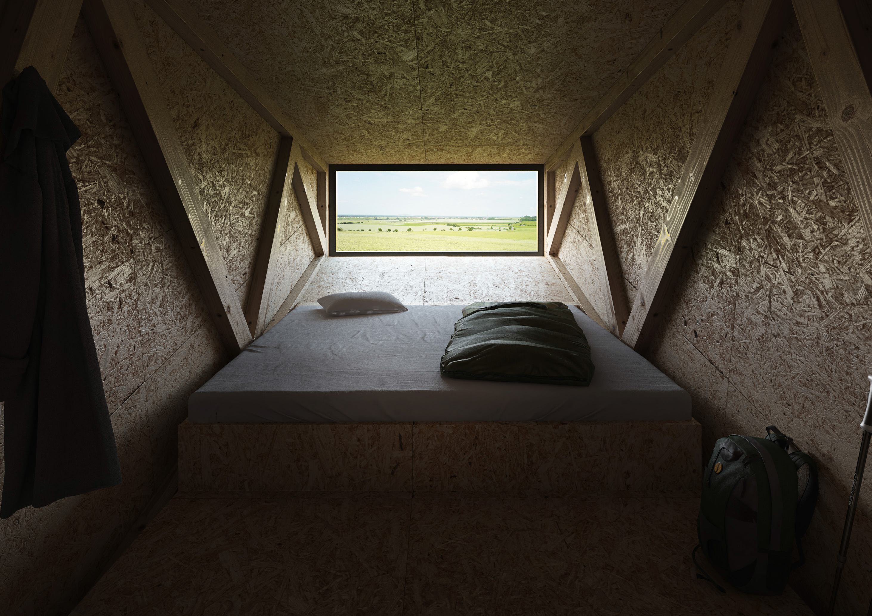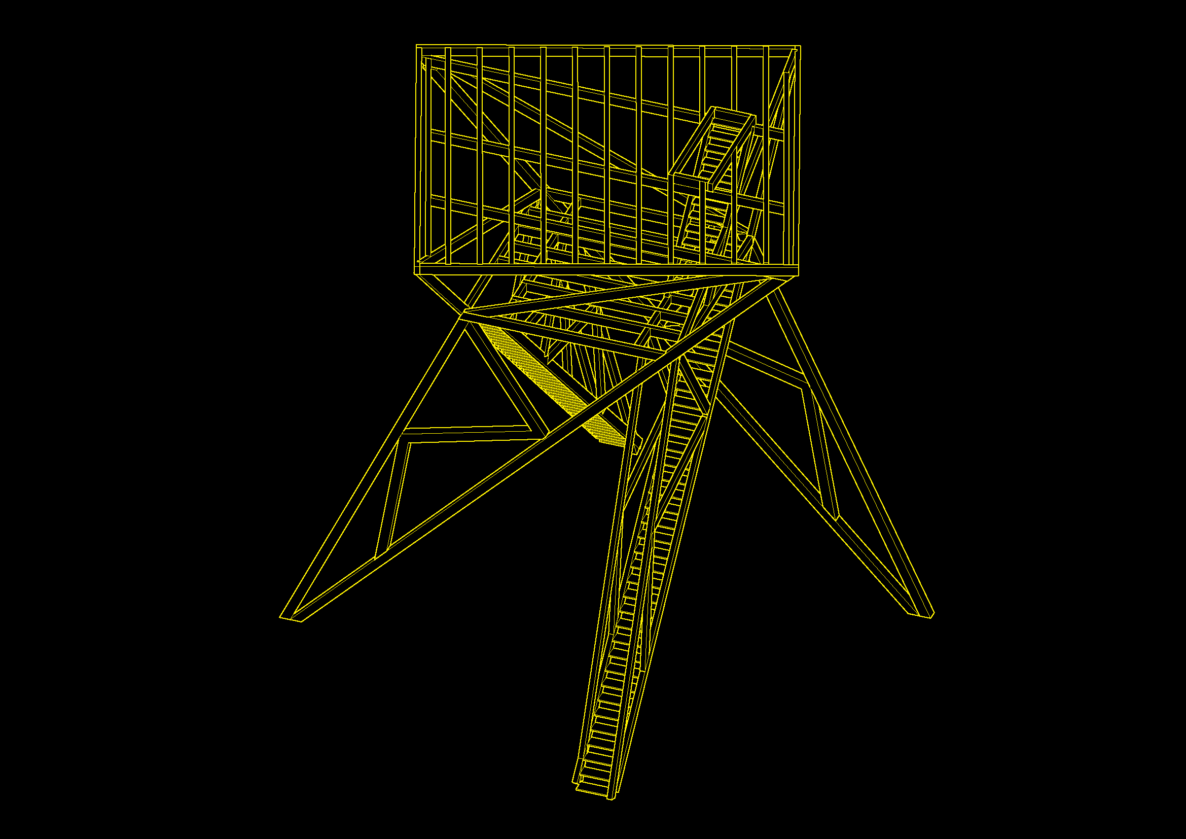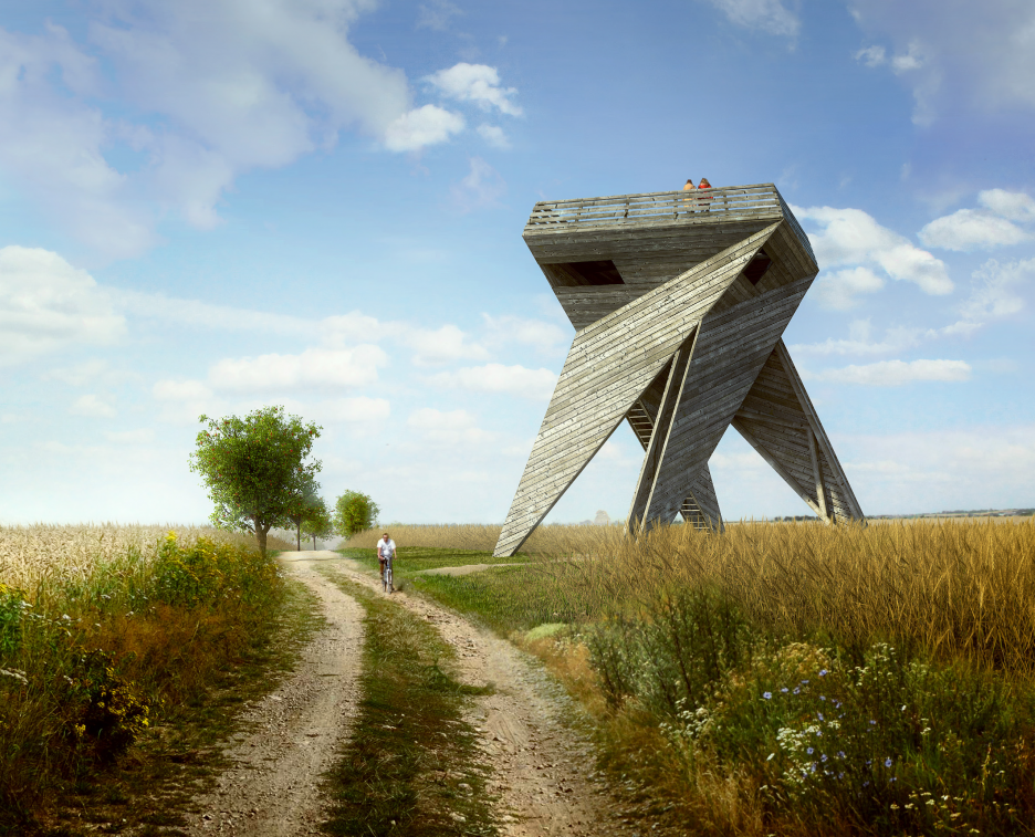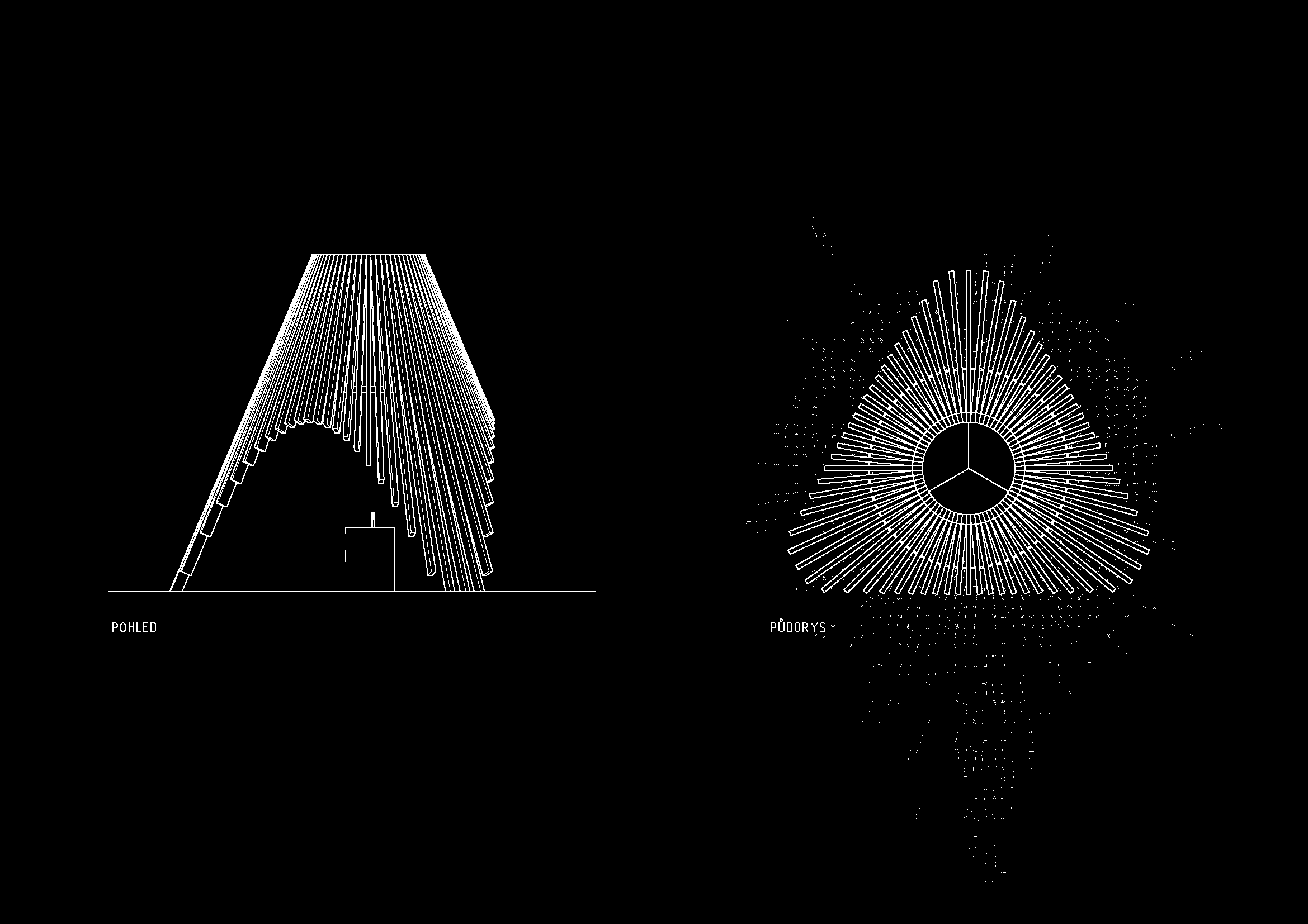 Základní rámec konstrukce rozhledny je složen ze čtyř dřevěných vazníků klasického tvaru, které vzájemným zaklesnutím vytvářejí dynamický dojem rotace. Přesto je konstrukce lapidární, vychází z elementární architektury posedu – čtyři stojiny zavětrované pomocí dalších čtyř fošen, základ tedy zůstává stejný. Stejně jako posed má i rozhledna zastřešenou část mezipatra, a to výšce 7,8 metrů. Vlastní vyhlídková plošina se pak nachází nad ním ve výšce 10,5 metrů. Pod rozhlednou vzniká krytý prostor, kde je možné posvačit ve stínu, přečkat déšť nebo se jen krátce zastavit.