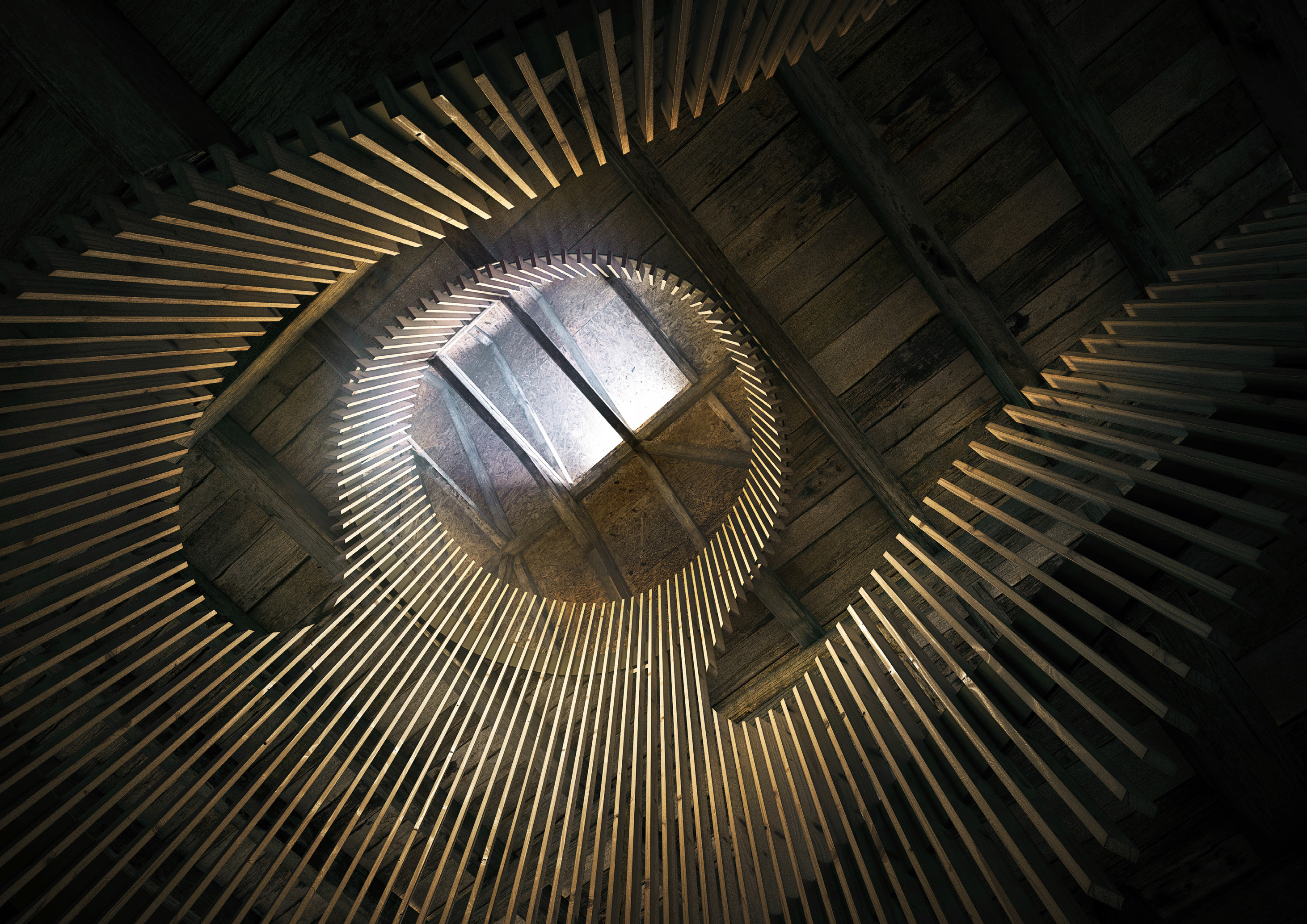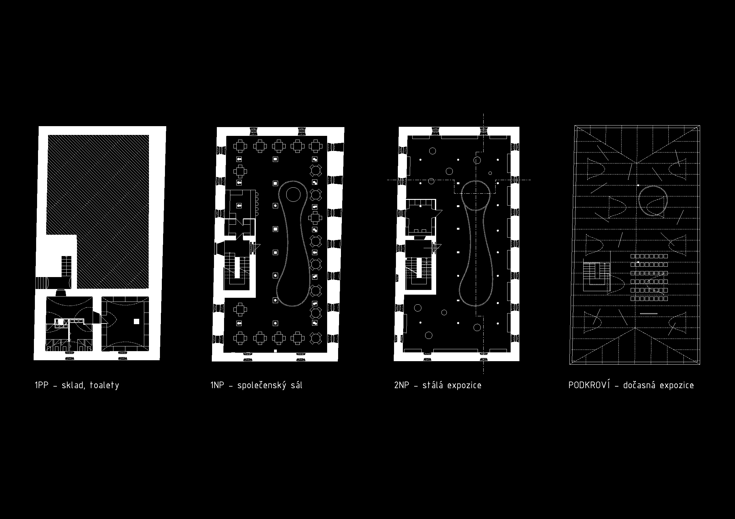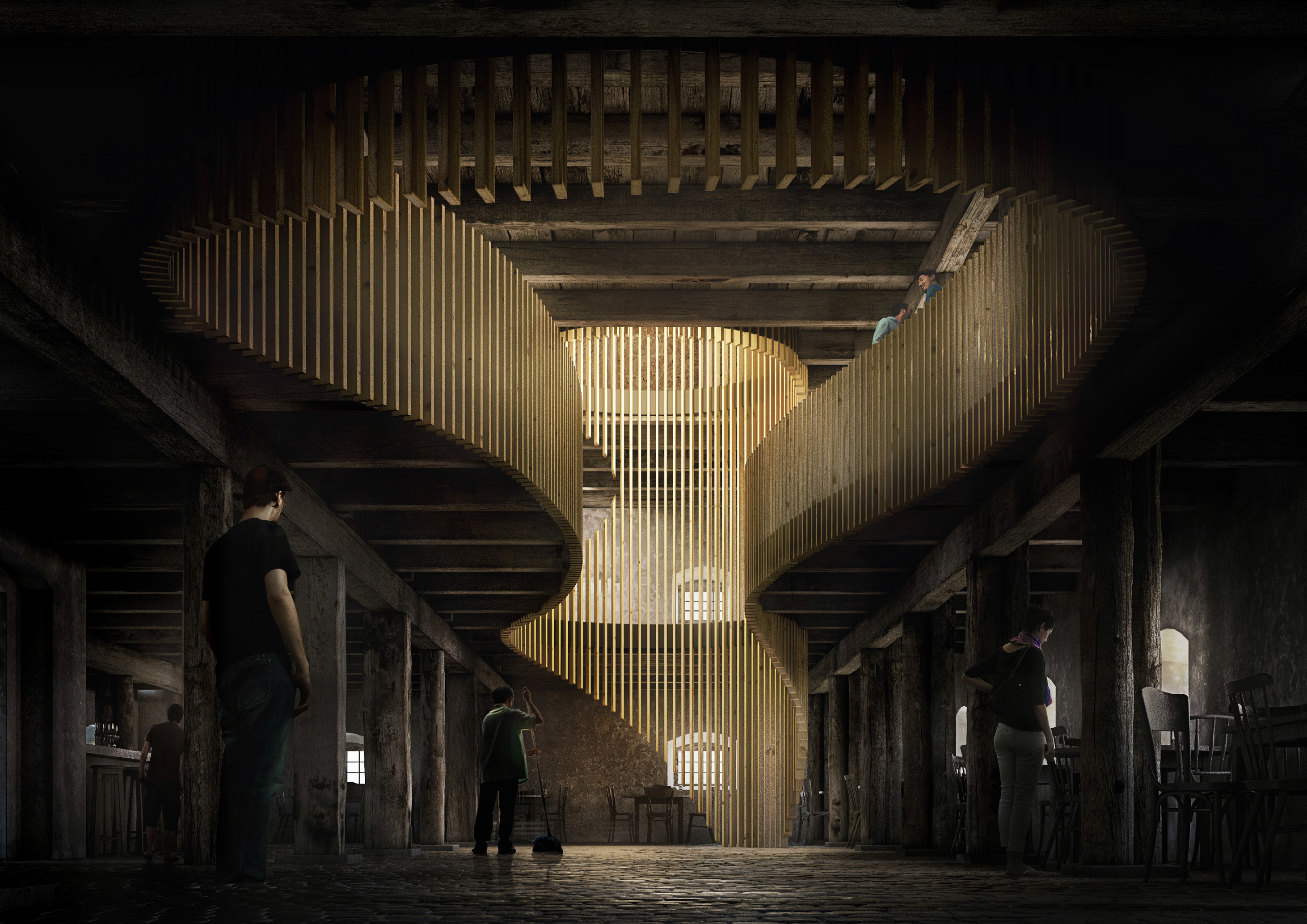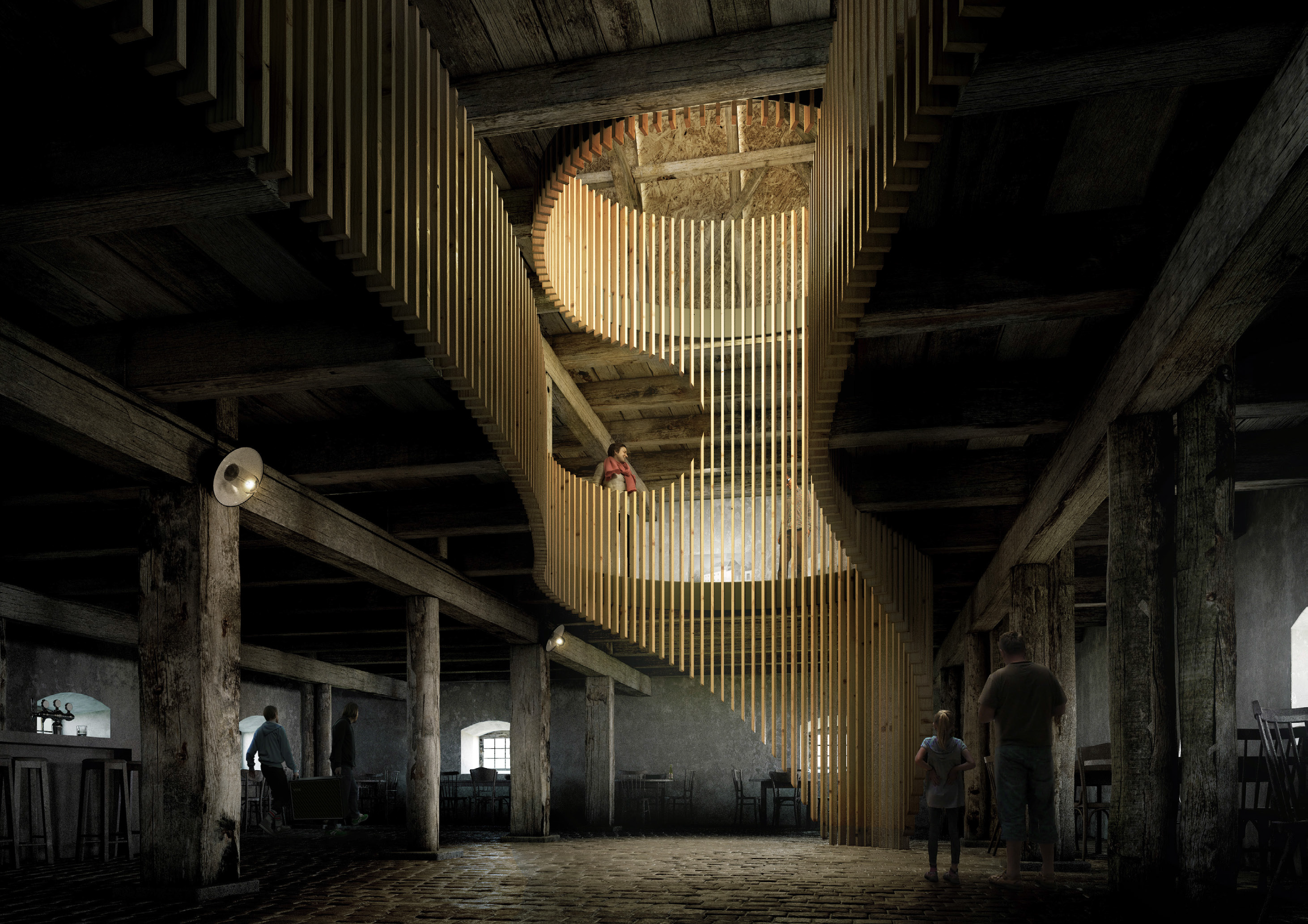 Hlavní motiv celé rekonstrukce je propojení jednotlivých pater sýpky a odstranění části dřevěné konstrukce. Při rekonstrukci podobných objektů se běžně přistupuje k této praxi, jelikož stávající přepatrování a světlá výška místností neposkytuje dostatečnou zkušenost z prostoru. Po vyzkoušení mnoha variant se jako nejvhodnější ukázaly zakřiveně tvarované prořezy, v kontrastu s pravidelností vnitřní dřevěné konstrukce. Vložené vertikální latě pak tvoří nejen zábradlí, ale dále plynule pokračují do dalších pater. Vzniká tak dřevěný objekt, který organicky propojuje všechny tři patra. V 2NP muzea vytváří galerijní ochoz a v 3NP pak menší kruhový průřez.