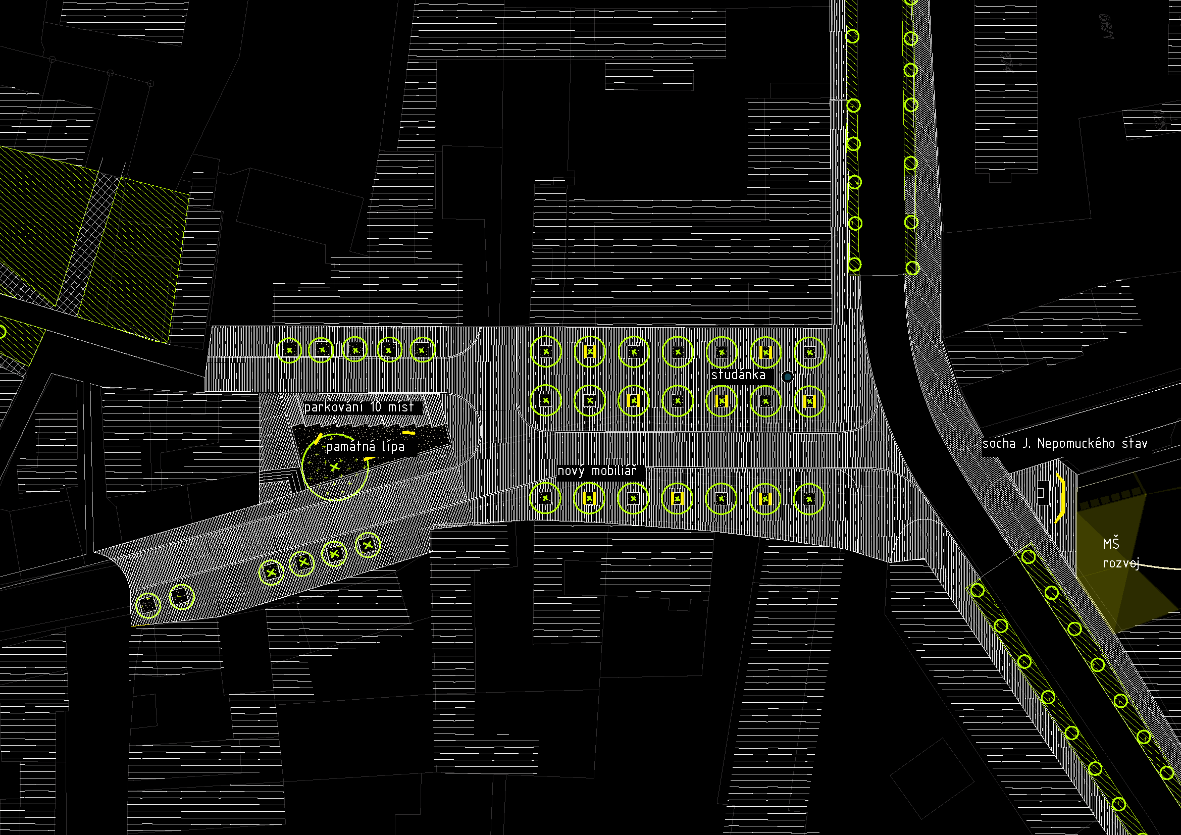 Je doplněn nový městský mobiliář, který je navržen ve stejném duchu jako mobiliář v parku. Osvětlení je řešeno jako spodní, osvěcující koruny vysázených stromů. Na místě sochy sv. Jana Nepomuckého, která byla v minulosti odstraněna, a posléze navrácena na jiné místo, je navržena kruhová fontána z místních materiálů (v obci je kamenolom).