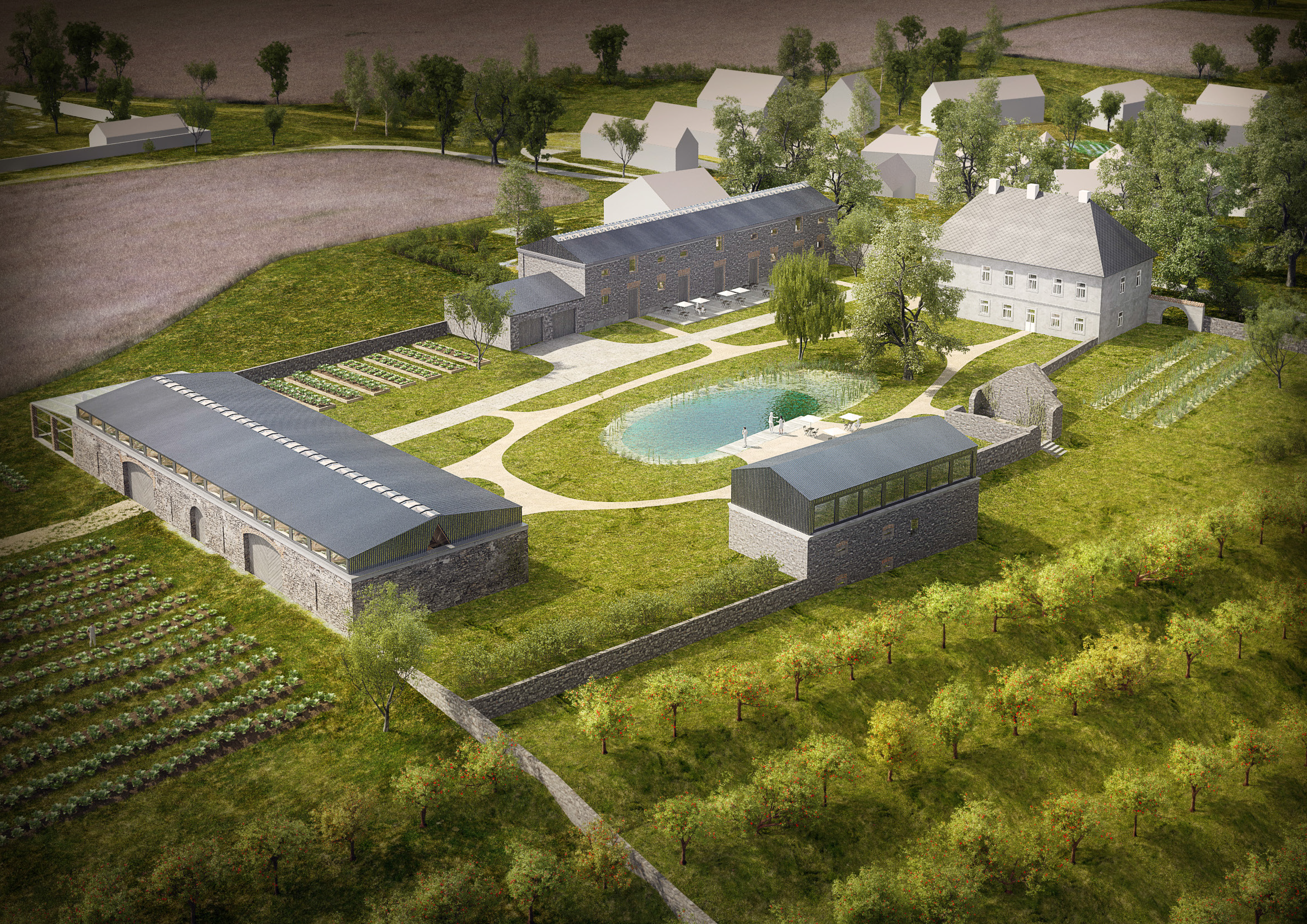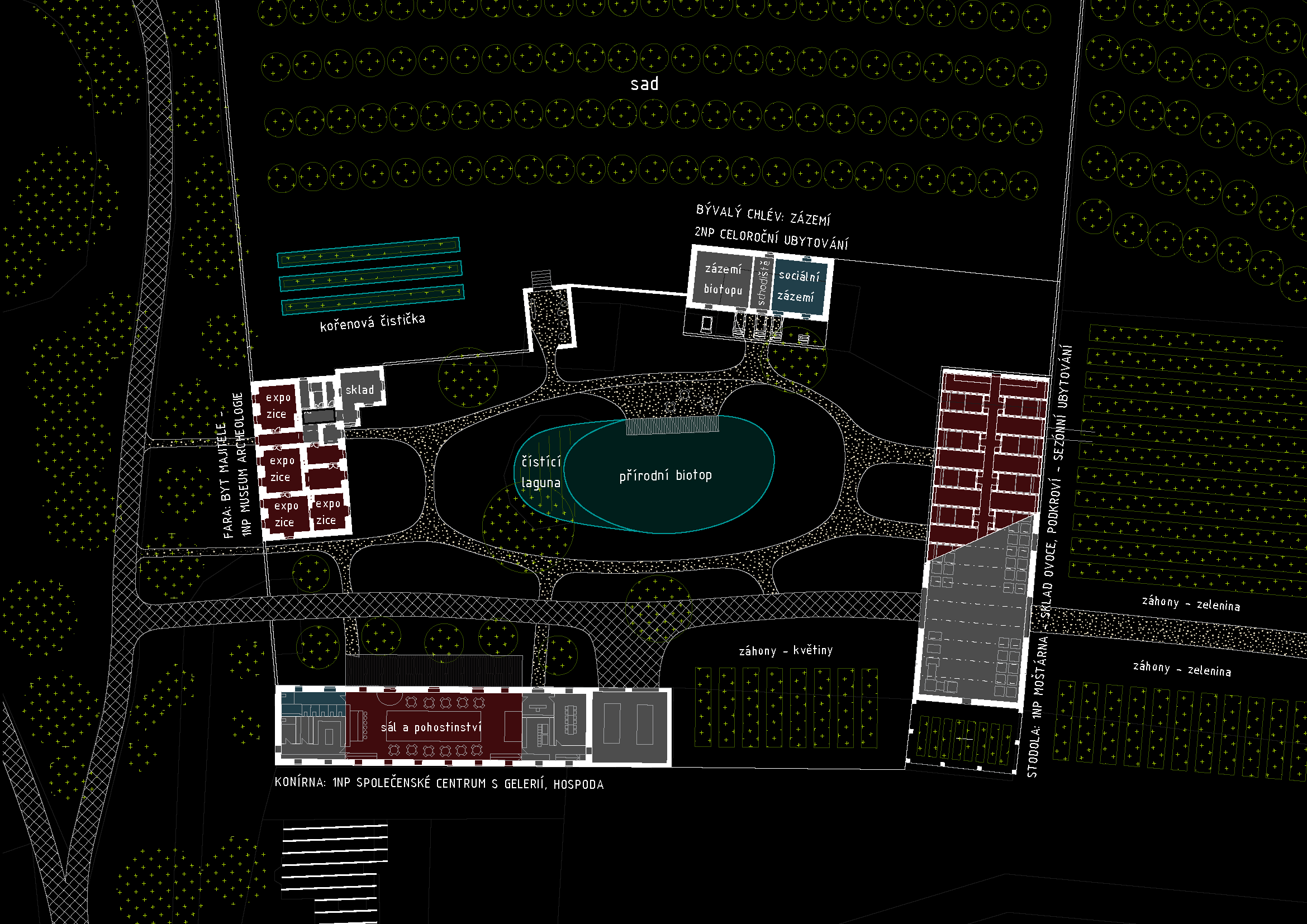Fara V 2NP a podkroví návrh počítá se zřízením bytu majitele usedlosti. Přízemí fary je věnováno expozici archeologie. Konírna: Dvě vestavby na opačných koncích interiéru vymezí centrální společenský sál. V první vestavbě jsou provoz hostince, technické a sociální zázemí. Ve druhé je zázemí podia, recepce a klubovna. Vrchní části obou vestaveb slouží jako galerie. K budově konírny také přiléhá budova garáží zemědělské techniky.