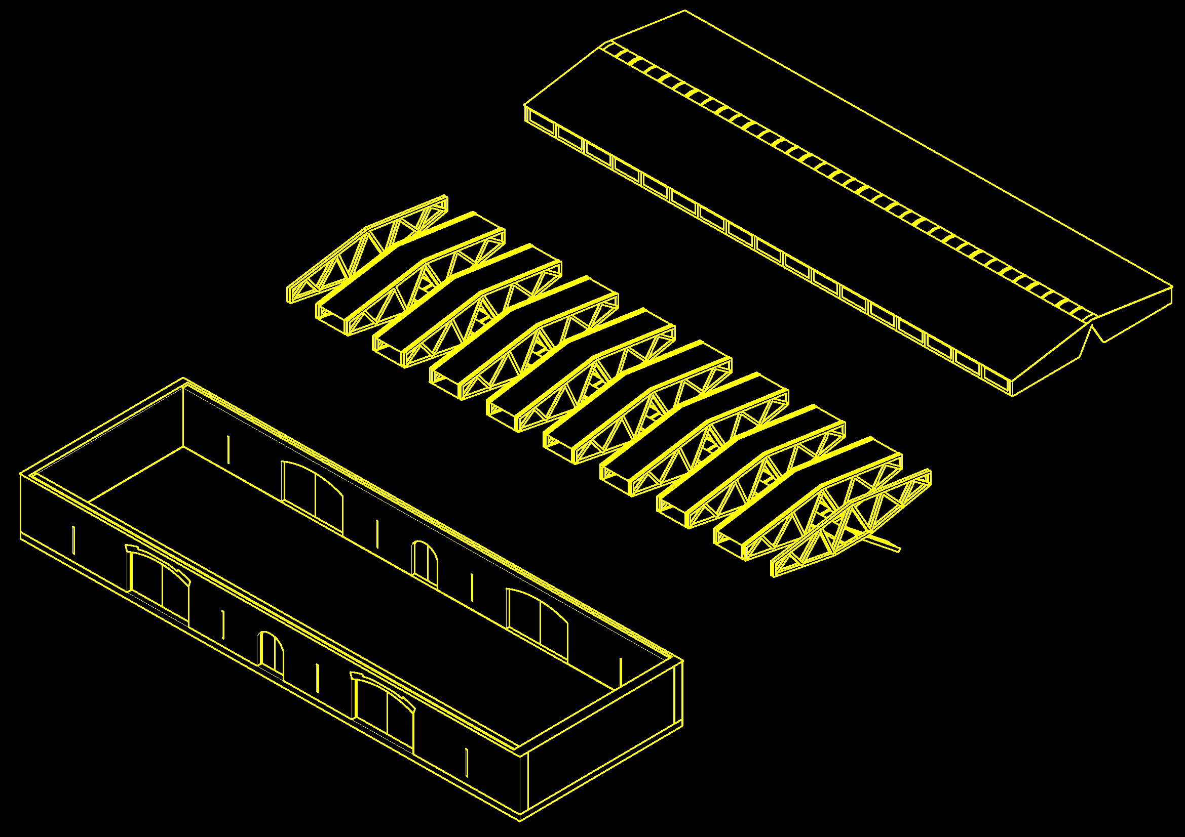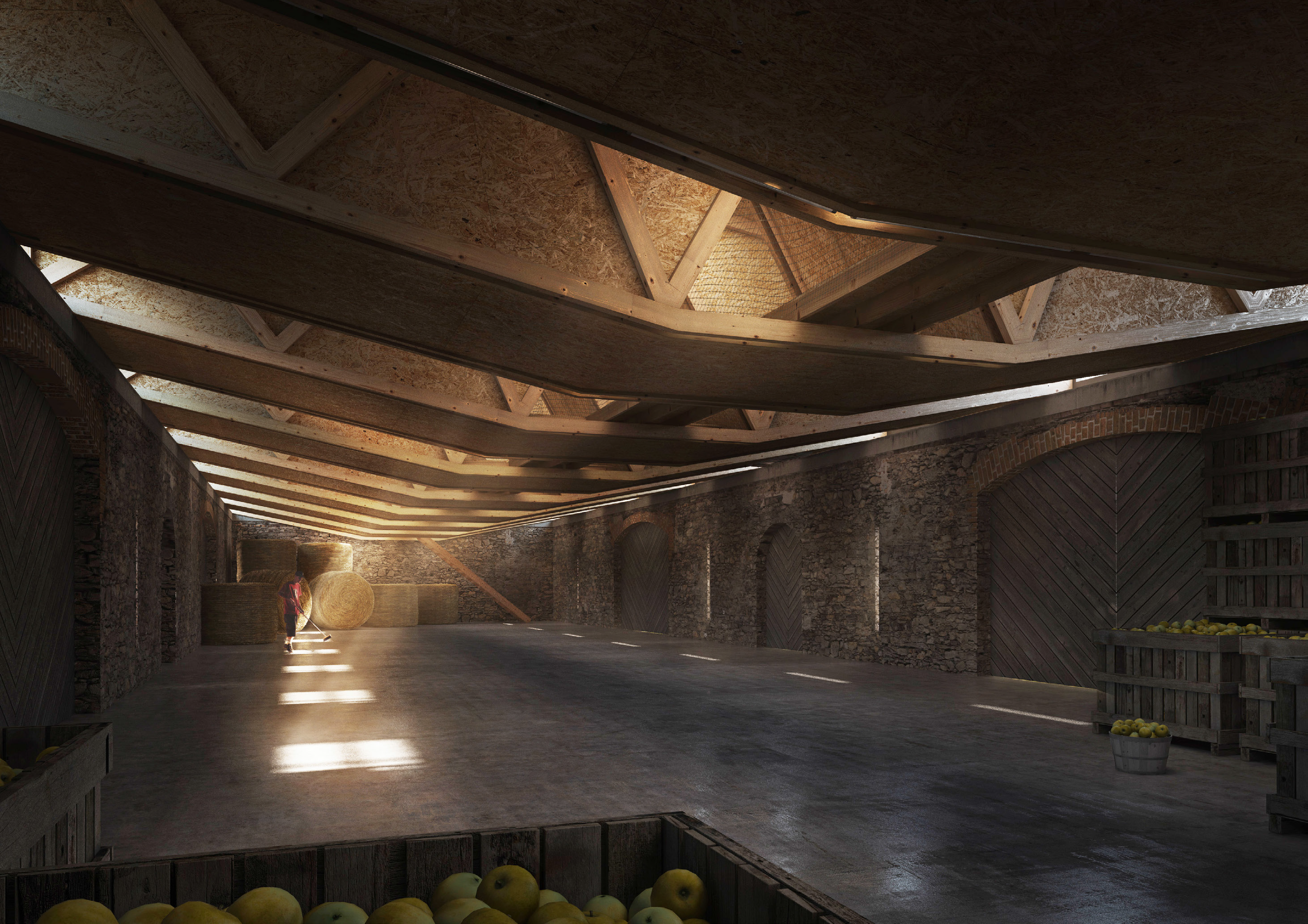 Stodola nabízí skvělý výhled do třešňového sadu a celého kraje, ideální pro pobyt návštěvníků. Po očištění a stabilizaci stávajícího zdiva dojde k postavení nové střešní konstrukce. Ta je navržena ze zdvojených dřevěných příhradových vazníků s roztečí 2,4 m. V roztečích mezi jednotlivými vazníky jsou “kajuty” pro sezónní ubytování návštěvníků, dostupné z centrálního ochozu. Prostor stodoly slouží jako sklad ovoce a moštárna. Ovocnářství zde má dlouhou tradici a výroba přírodních moštů se stane z jednou domén statku.