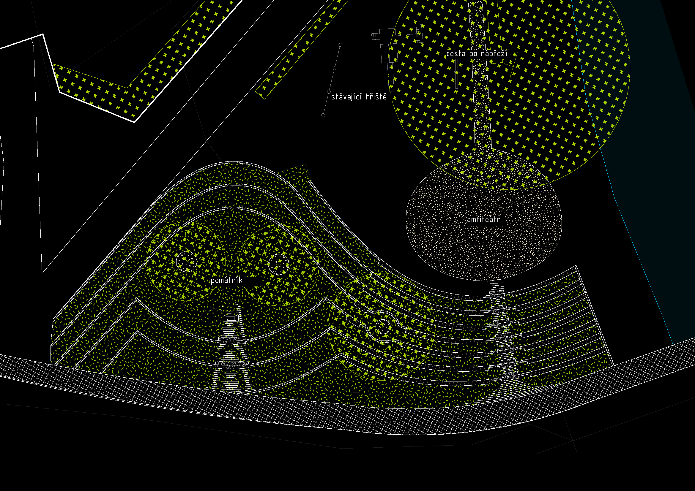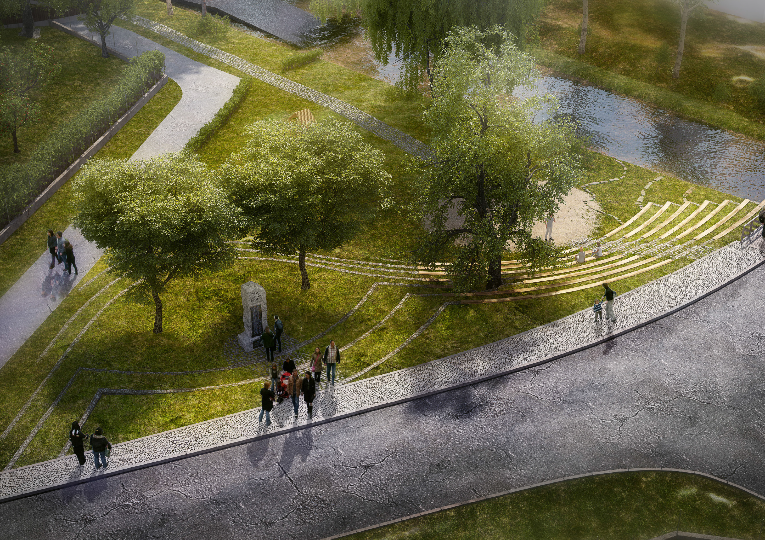 ve stávajícím stavu. Předně jsou odstraněna veškerá přehrazující oplocení a opěrné zídky. V druhém kroku došlo k vytvoření přírodního amfiteátru formou terasovitého uspořádání mostního valu. Po mezistupních amfiteátru lze volně sestoupit k potoku, a dále podle něj pokračovat v nově navržené cestě. Druhá část přímo navazuje na amfiteátr, jen se věnuje okolí pomníku. Stupně amfiteátru zde pokračují ve vyrovnávání terénního přechodu, respektují současnou morfologii terénu a vytváří nová posezení kolem zpřístupněného pomníku.