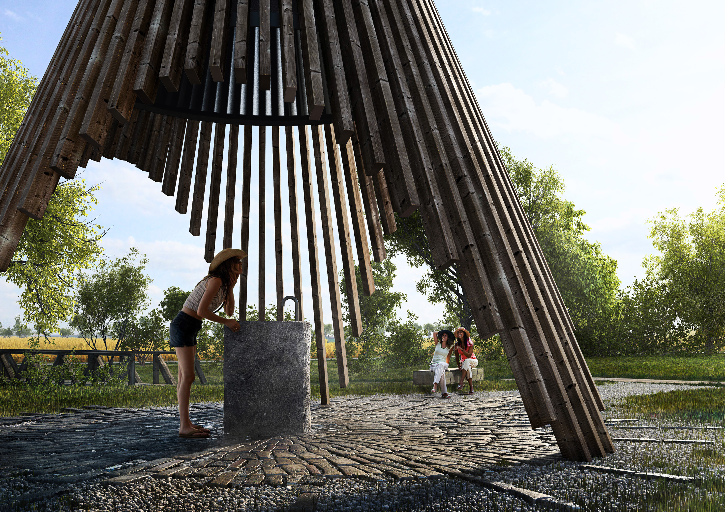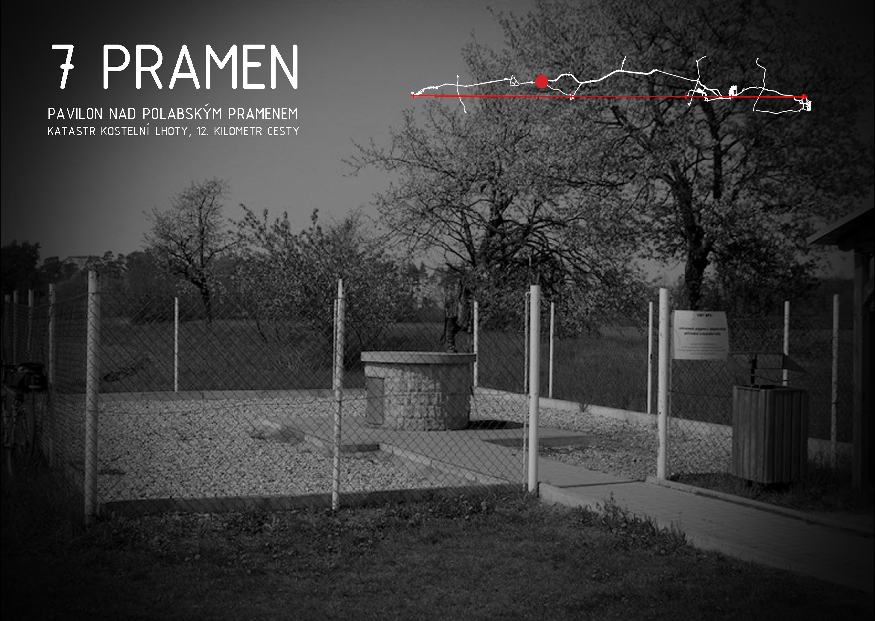 Pramen je součástí rodiny polabských pramenů. Další se nacházejí v Kersku, Sadské a především v Poděbradech, kde se připravuje známá Poděbradka. Současná úprava okolí pramene ve formě oplocené studny lemované zámkovou dlažbou ovšem neodpovídá potenciálu místa. Naopak konzervativní zastřešení pramene ve formě historizujícího pavilonku typické v tomto kontextu není rovněž žádoucí. Nový návrh bere v potaz typologii pavilonku, celkové vyznění je však současné a zapadá do série ostatní zásahů. Má formu kuželu, který je ze tří stran ořezán do půdorysu trojúhelníku. Vzniklé hyperbolické řezy kuželem pak tvoří vstupy ke zdroji vody. Dřevěné hranoly, spojené v horní části pomocí ocelových obručí tvoří nosnou i pohledovou konstrukci celého pavilonku, a naplňují tak předefinovanou formu. Vlastní zastřešení je tvořeno polykarbonátovou deskou připevněnou z vnitřní strany k ocelovým obručím.