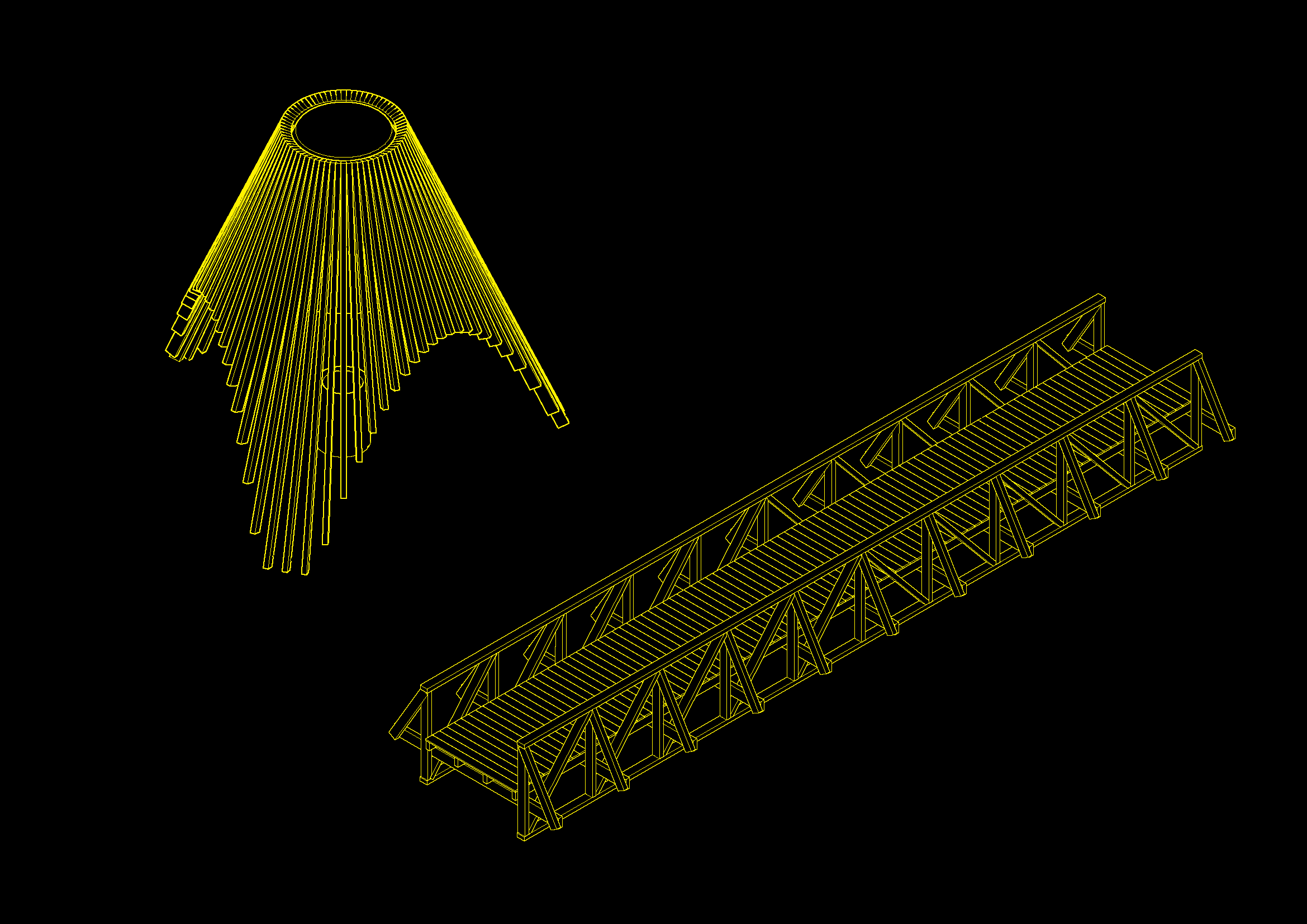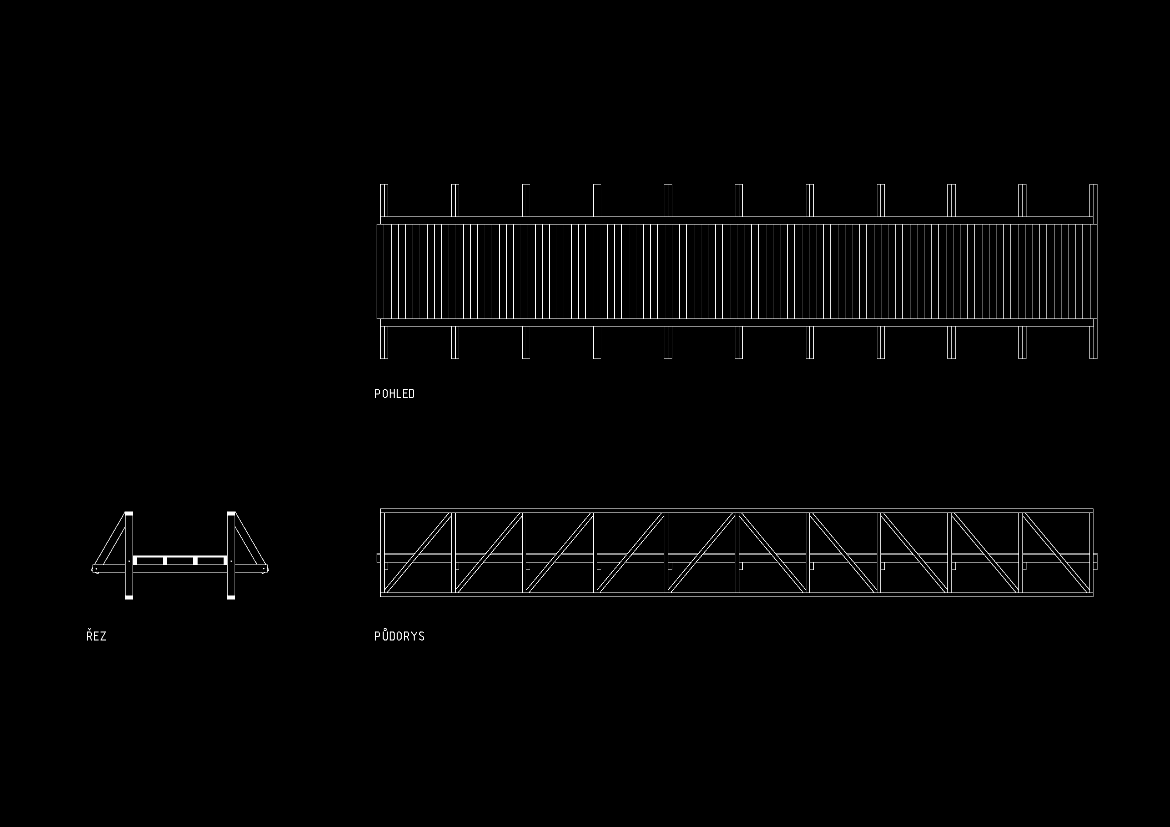 Most tvoří dřevěná příhradová konstrukce, která je zároveň zábradlím. V 1/3 výšky vazníku je na příčných trámech vynesena vlastní pochozí plocha. Příčné trámy jsou diagonálně provázány se zábradlím - nosnou příhradou, čímž je zajištěna pevnost zábradlí i zavětrování celé konstrukce.