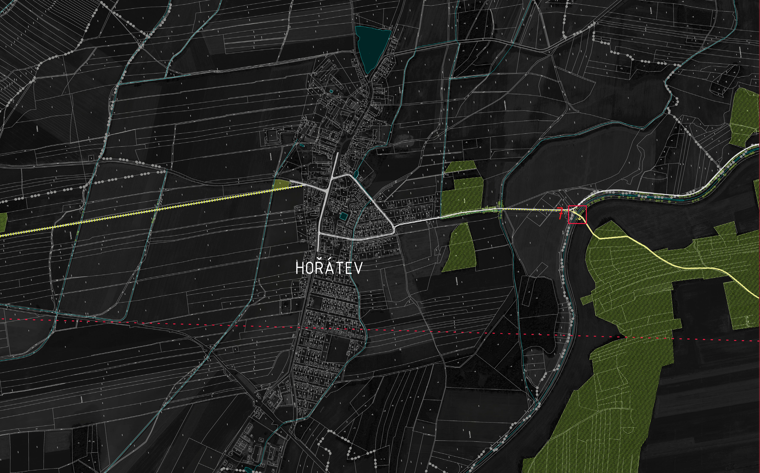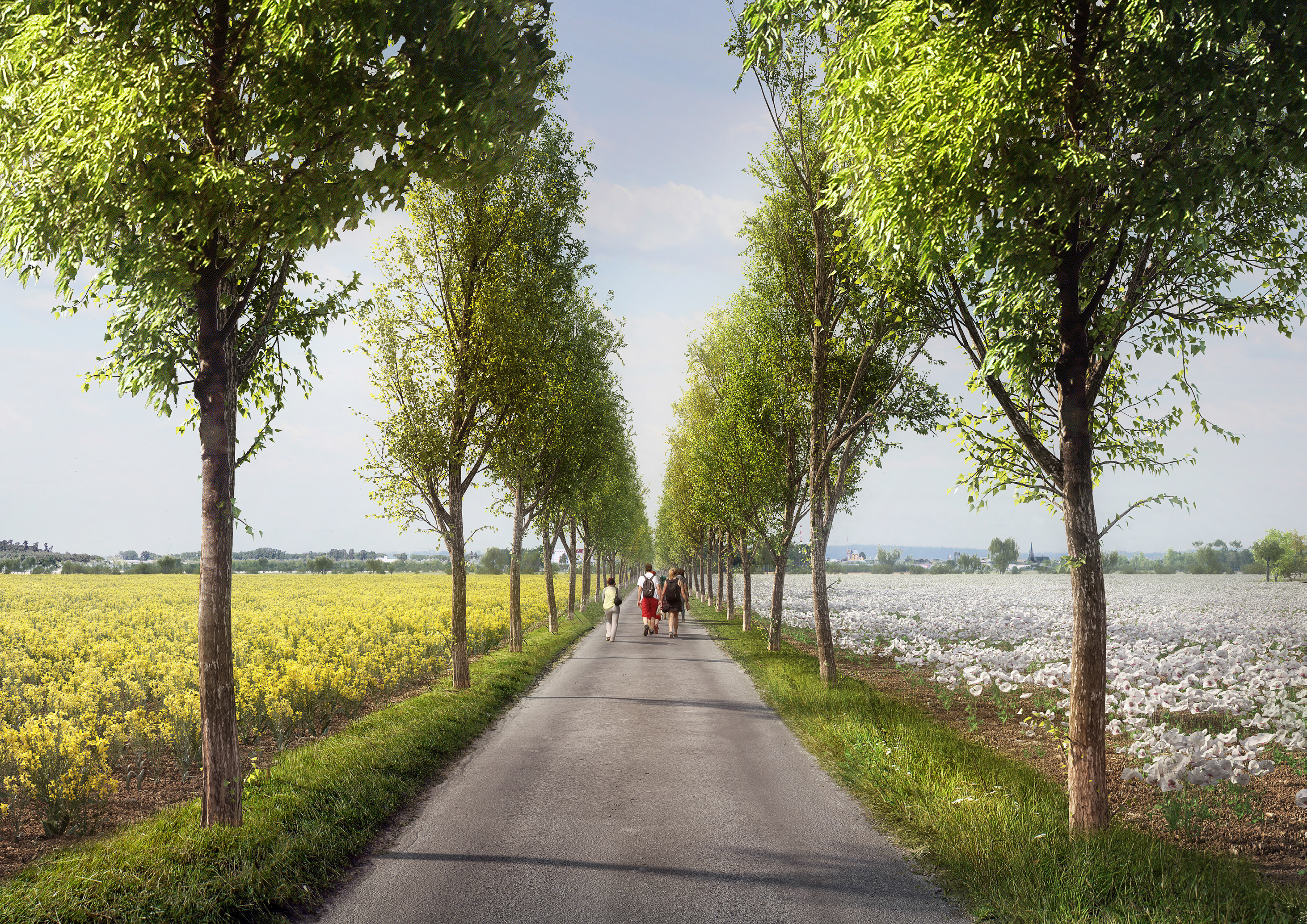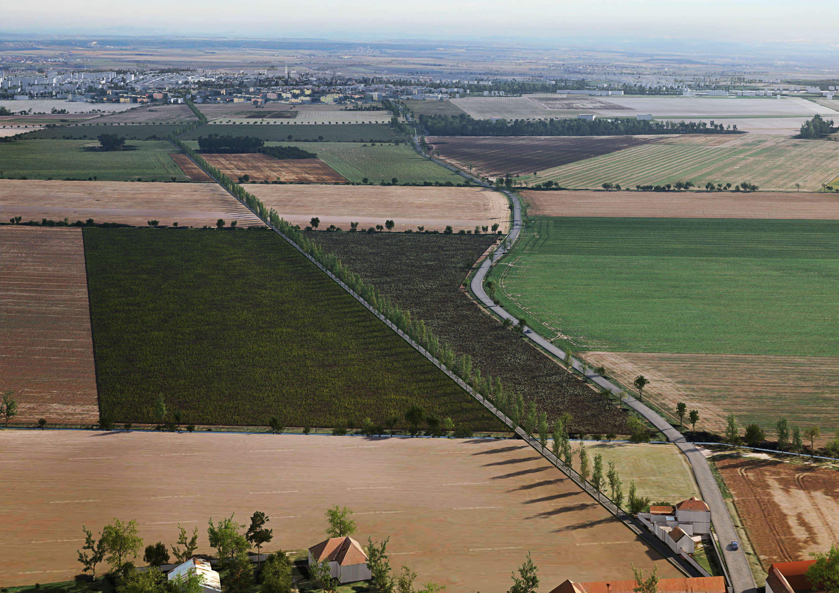 Protáhlý a přitom rovný pozemek obce definuje cestu, jejíž přímost je umocněna stromořadím vysázeným po obou stranách. V úvahu přichází topol, typický pro okolní krajinu, případně jiná, odolnější dřevina.