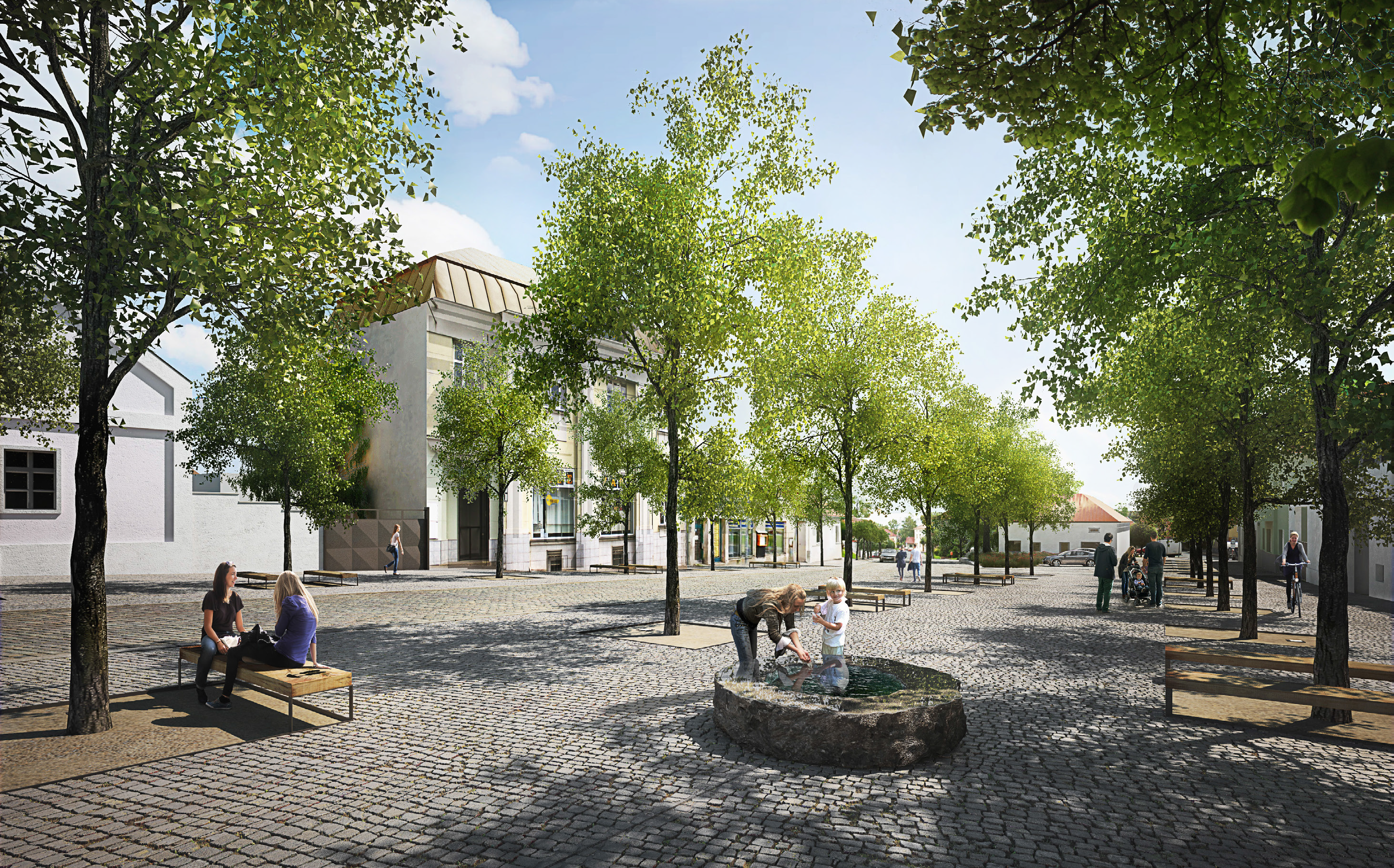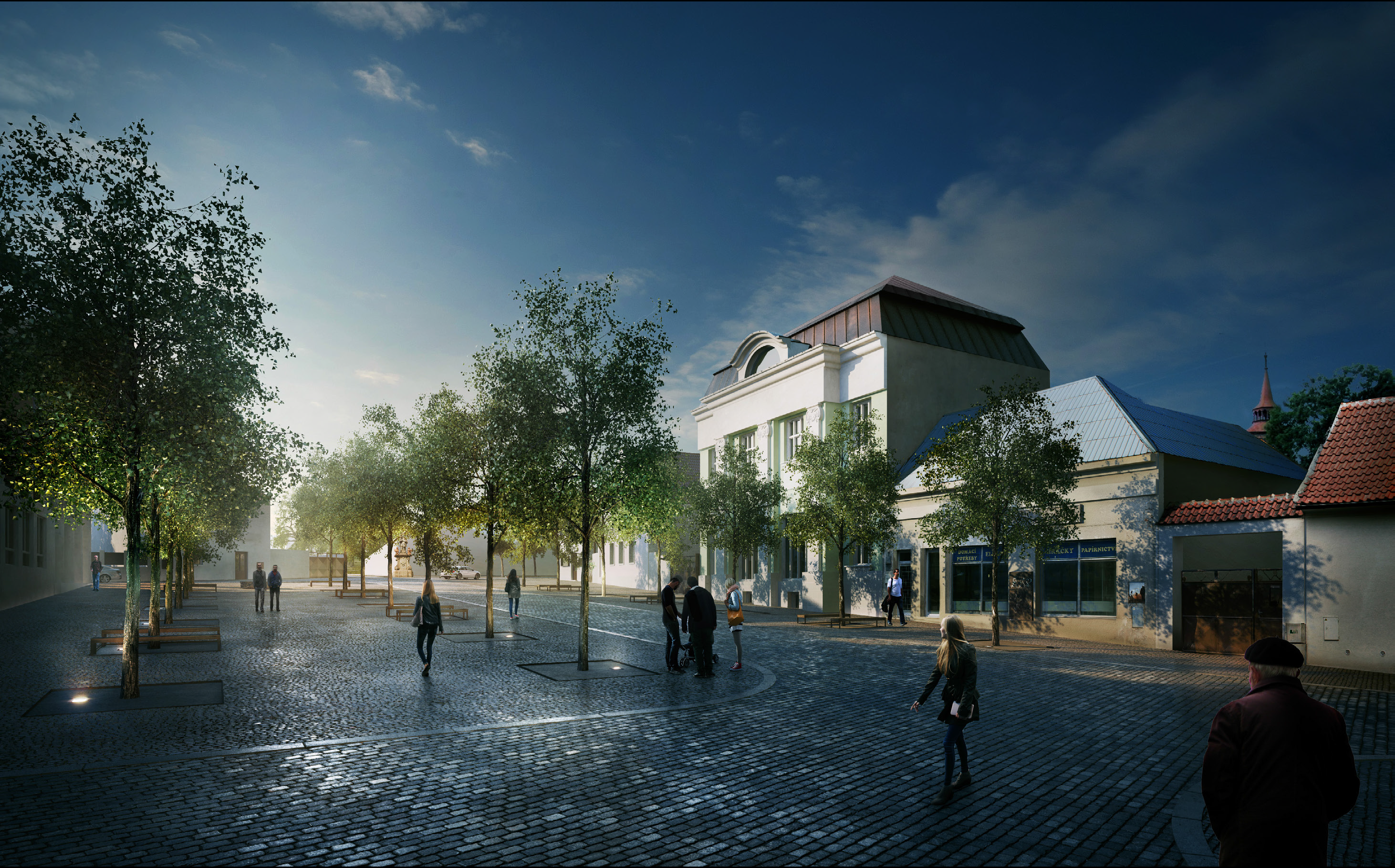 Návrh nového náměstí na místo navrací původní lipové stromořadí, které zde podle dostupných fotografií bylo v minulosti. Stávající komunikace je zklidněna a zúžena na nezbytnou šířku. V období konání posvícení či jiných slavností je možné tuto komunikaci dočasně uzavřít. V obci je plánován obchvat, a už dnes zde existují variantní možnosti objezdu náměstí kolem parku.