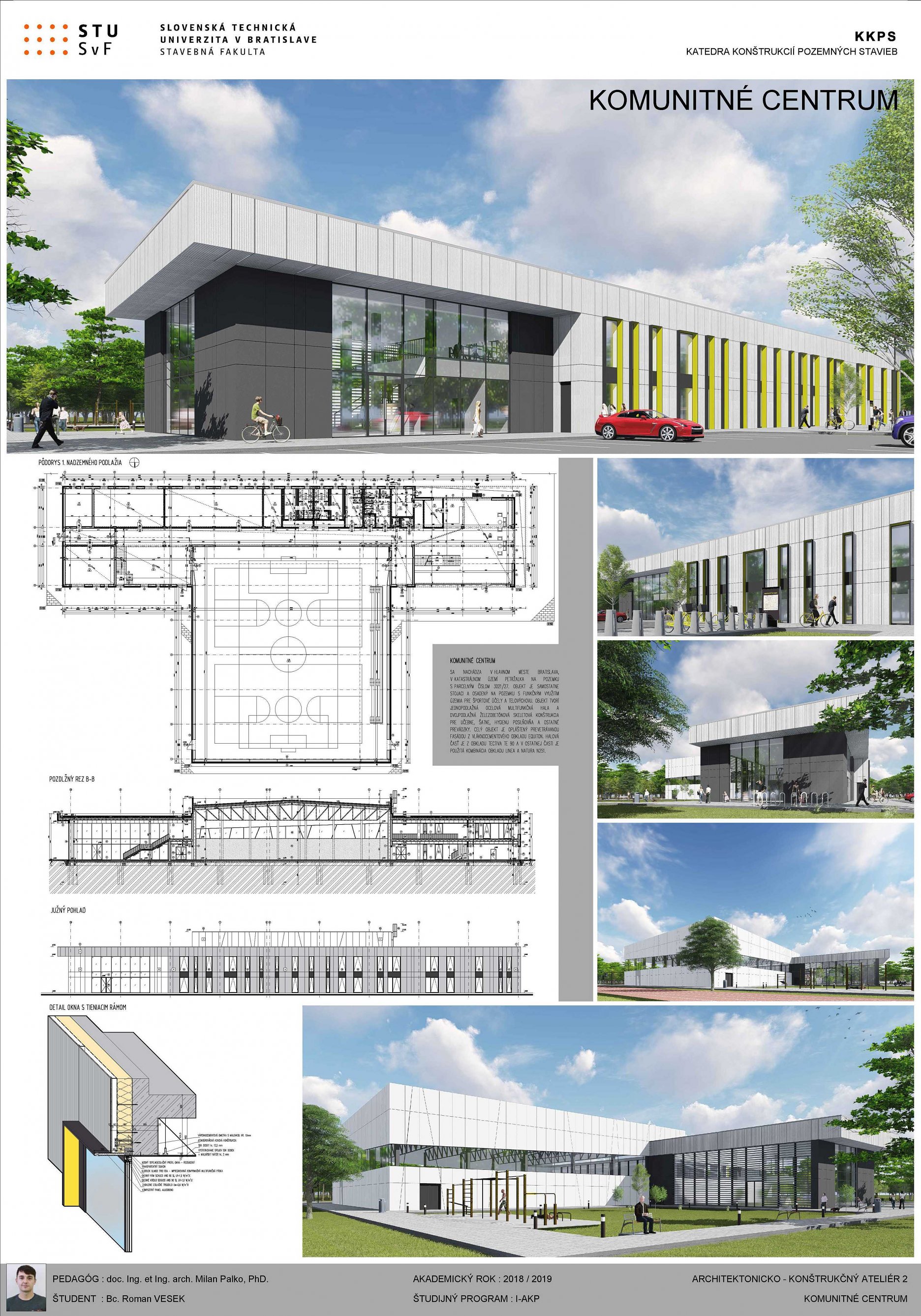Výhercom súťaže sa stal Roman Vesek s projektom komunitného centra a o projekte hovorí: „Do školskej súťaže som sa zapojil prvýkrát a bral som to ako výzvu. Vybral som si vzorový projekt zo zahraničia a prerobil som ho podľa svojich predstáv. Hlavným prvkom, ktorý som použil na administratívnej časti stavby, je fasádny panel EQUITONE [linea]. S týmto obkladom možno dosiahnuť zaujímavý vizuálny efekt, a to vďaka meniacemu sa uhlu dopadajúceho denného svetla.“ Objekt tvorí jednopodlažná oceľová multifunkčná hala a dvojpodlažná železobetónová skeletová konštrukcia pre učebne, šatne, posilňovňu a ďalšie prevádzky.