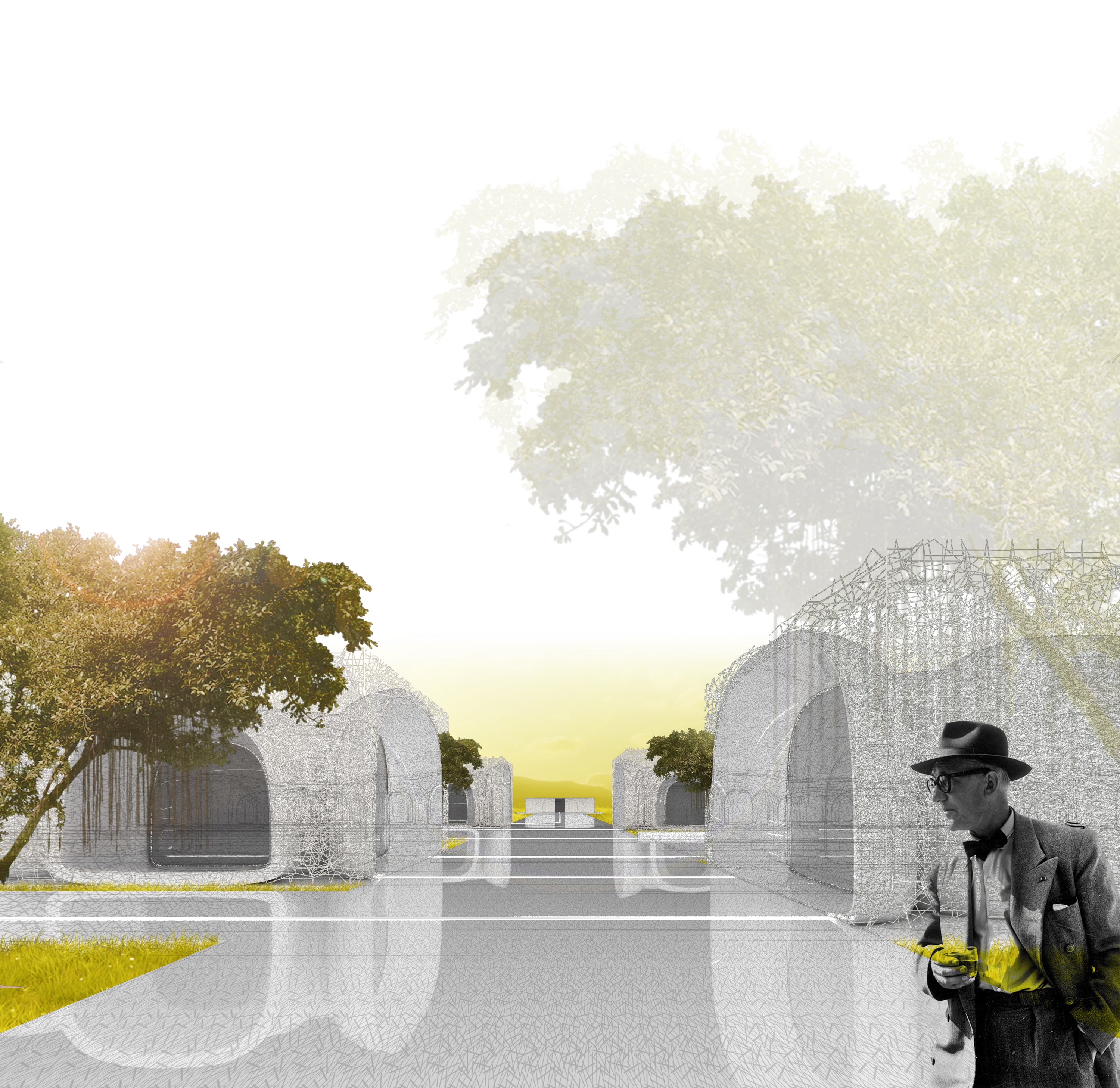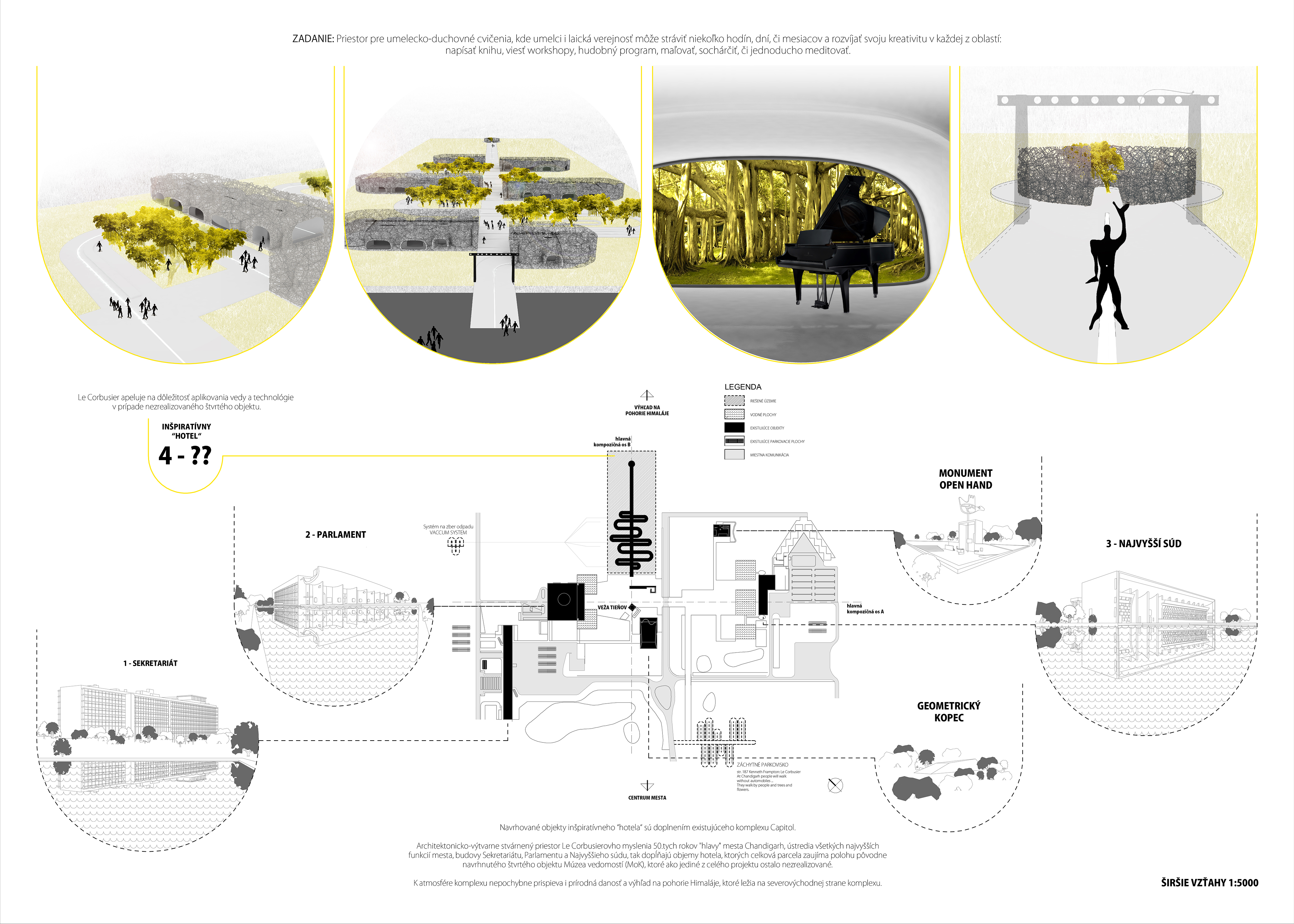 Samotný komplex je vybavený existujúcou ľahkou cestnou infraštruktúrou (malá sieť ciest a parkovacie plochy pred samotnými úradnými objektmi), čo považujem za pretavenie slov Le Corbusiera– "Ľudia Indie radi chodia bez áut a na pešo. Majú radi prechádzky okolo trávy, okolo kvetov." – v realitu. Projekt zahŕňa návrh jednej hlavnej záchytnej parkovacej plochy v južnej časti komplexu, ktorá sa nachádza v dostupnej vzdialenosti od všetkých objektov. Tak ako celkový návrh hotela koncipovaný ako produkt jedinej technológie - 3D tlačové zariadenie – tak aj pridružené objekty hotela ako objekt potrubného zberu odpadu, spomenutá plocha statickej dopravy, či neskoršie návrhy a dostavby sú koncipovane ako nekonečný proces tlače 3D zariadenia šíriaceho sa v komplexe, ktoré v závere prepojí Capitol, či Chandigarh jediným technologickým gestom. Vzhľadom na fakt, že areál inšpiratívneho hotela je tvorený viacerými solitérnymi objektmi situovanými na spoločnej promenáde, jeho hlavná kompozičná os sa odkazuje na jednu z dvoch hlavných osí pôvodného návrhu z dielne Le Corbusiera. Tento urbanisticko-kompozičný prístup vytvoril harmonickú súhru všetkých objemov komplexu, špeciálne citeľnú v priehľadoch a pohľadoch krajinou. Súčasný stav ponúka využitie hlavnej zhromažďovacej plochy námestia/pešej zóny ako nástupnej plochy aj pre areál inšpiratívneho hotela, a tak jeho získavame priame napojenie na existujúcu štruktúru a fungovanie. Komplex Capitol je miesto plné zelene, veľkoplošných peších ťahov i mnohých monumentov s výtvarnou hodnotou. A preto inšpiratívny hotel je nepochybne aj o mierke a vzťahu voči svojej lokalite. Miesto, ktoré sa svojou skromnou mierkou nesnaží konkurovať objemom okolitej architektúry Le Corbusiera. Snaží sa pochopiť jeho kvality a nie využiť, ale doplniť atmosféru a genia loci tohto komplexu.