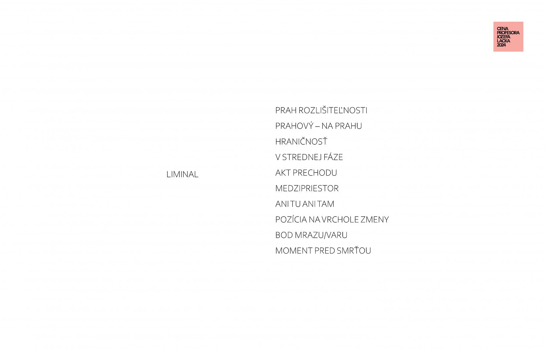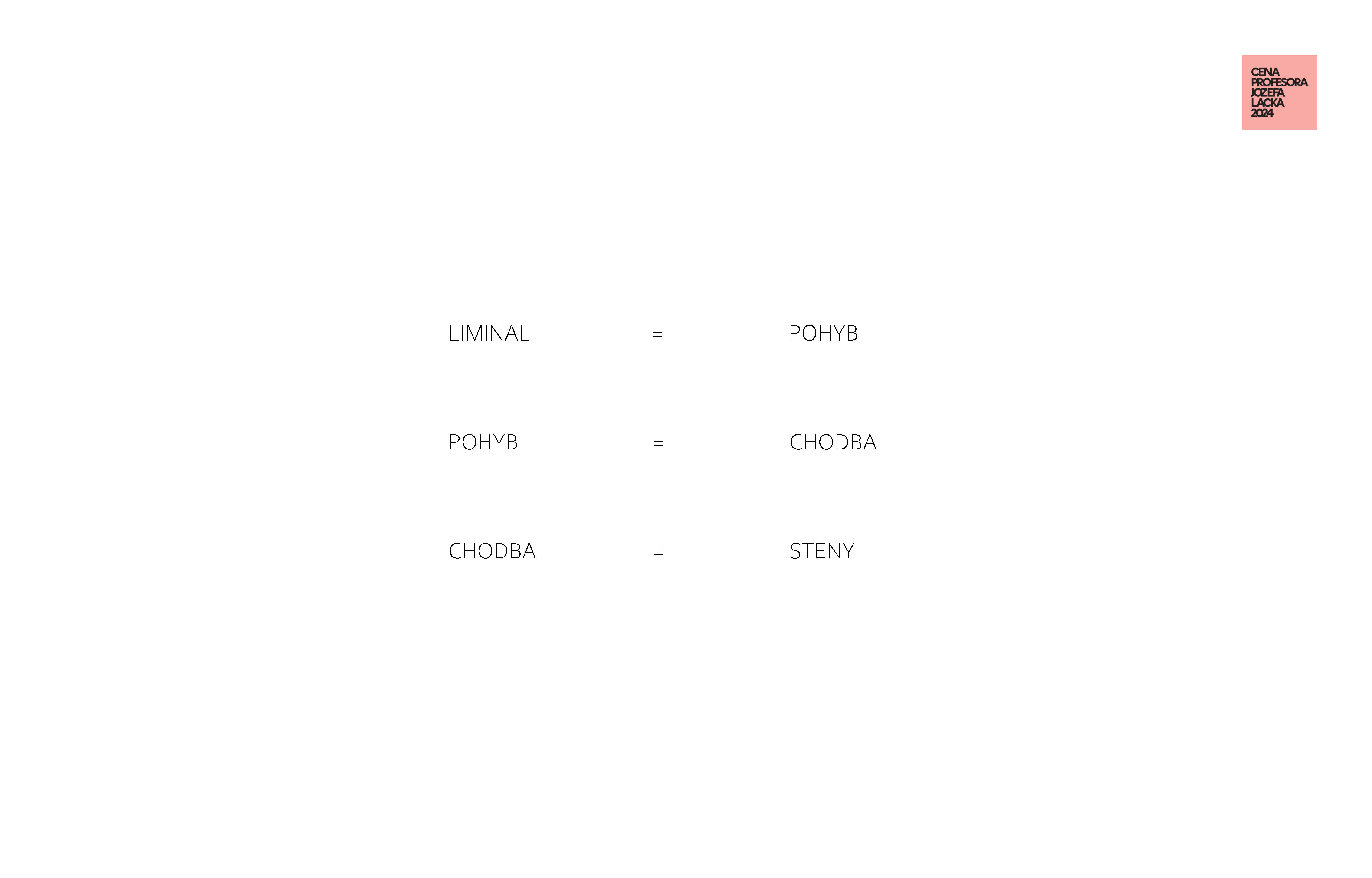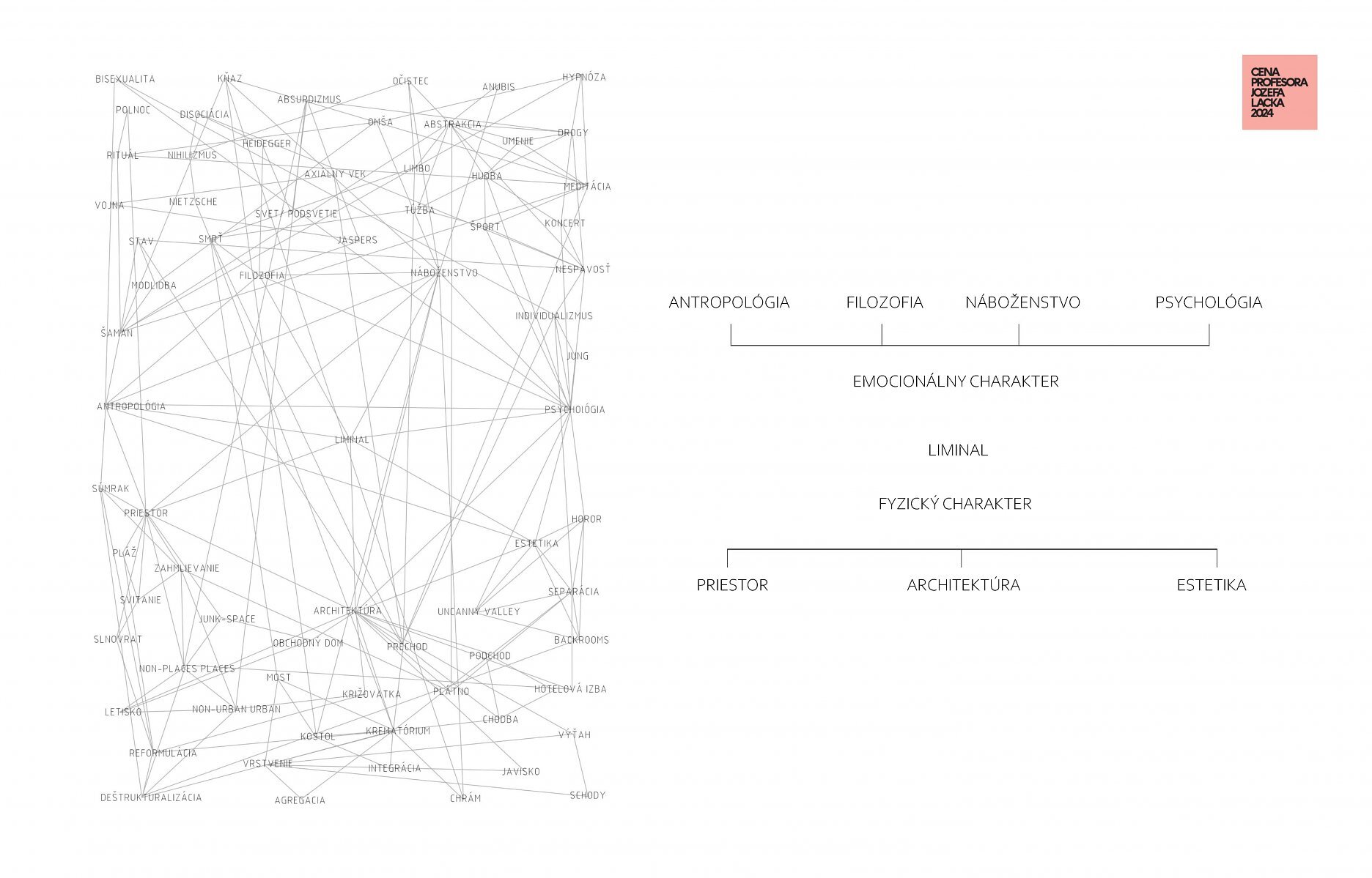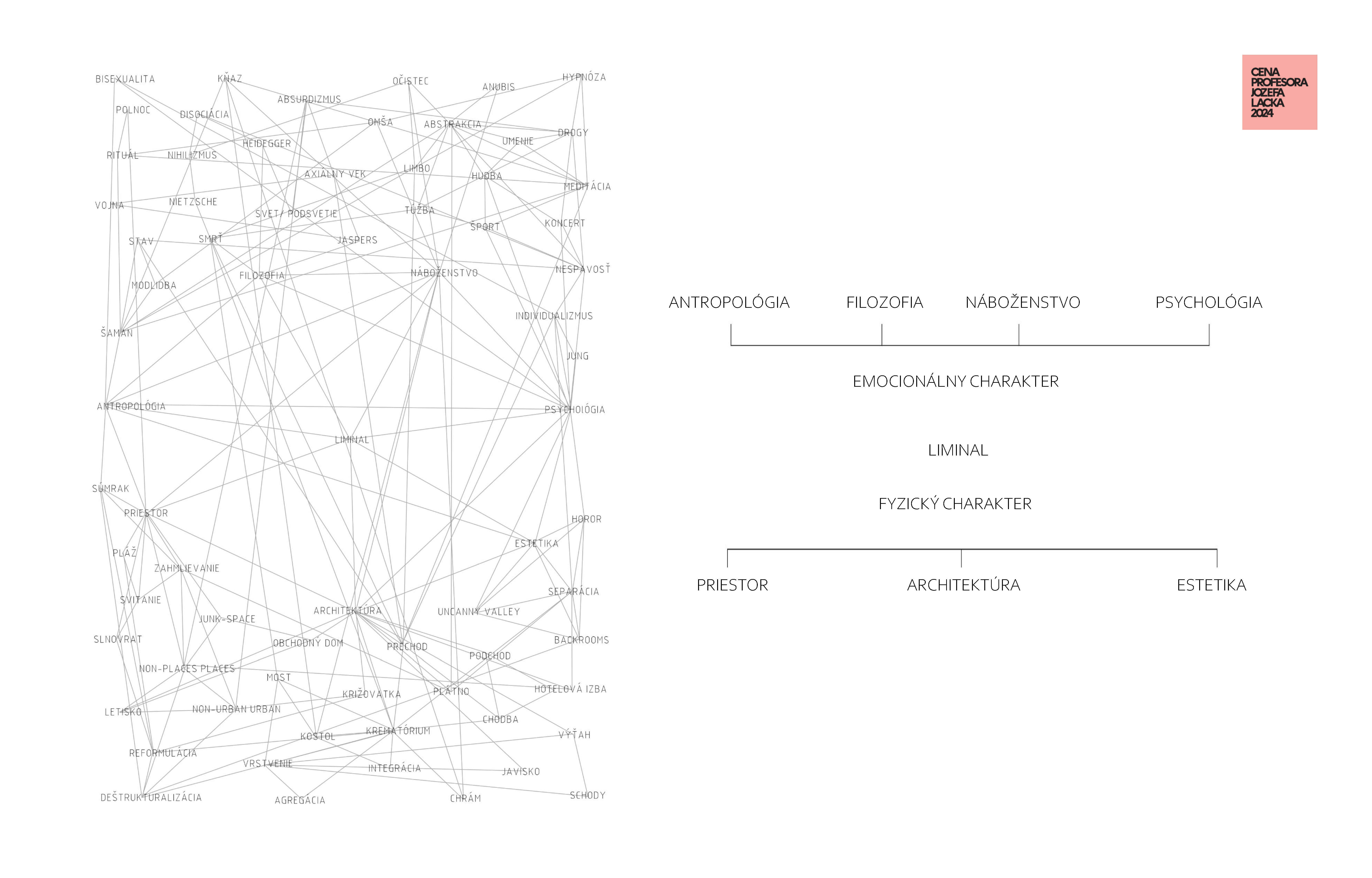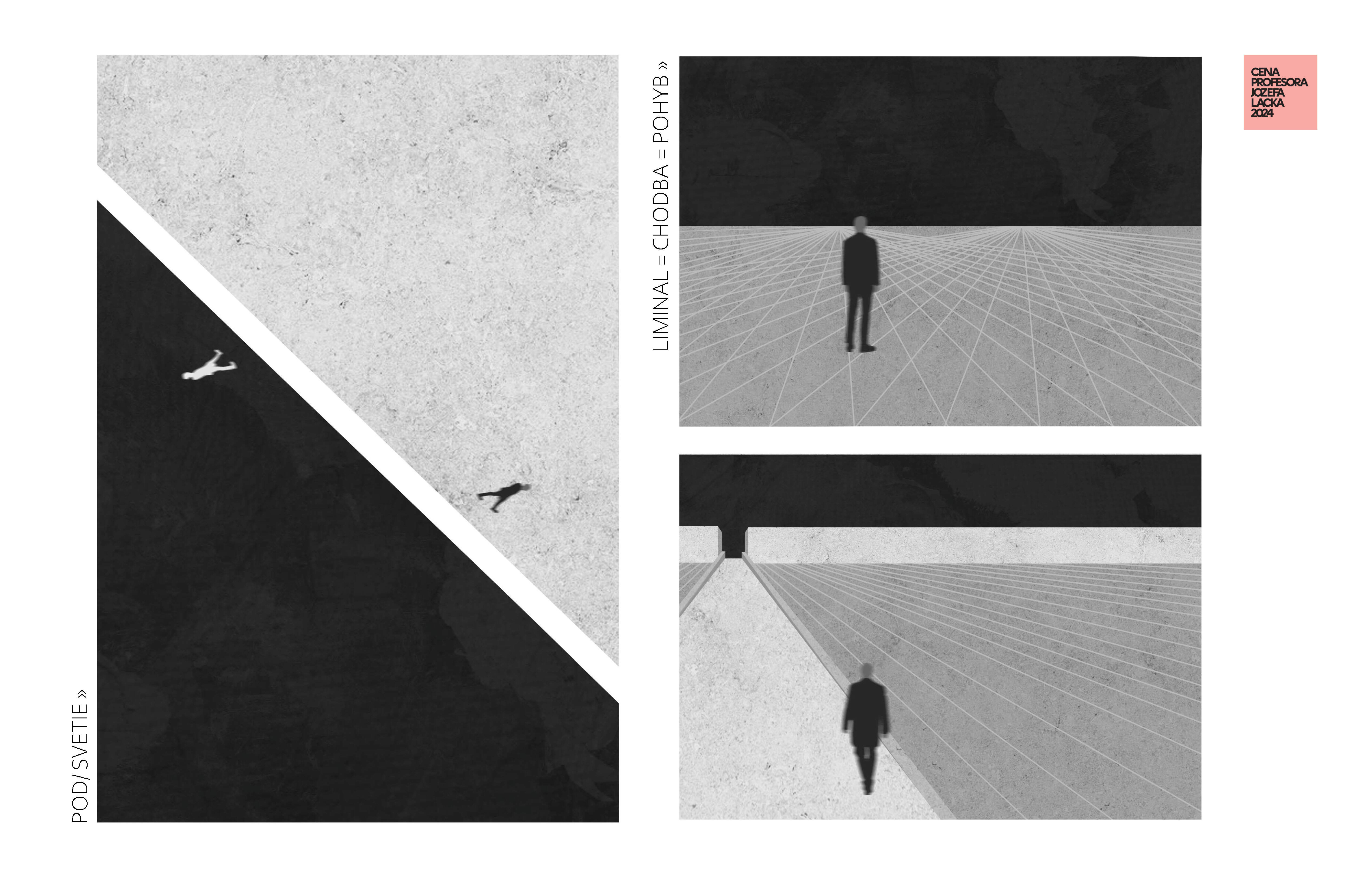 "Liminal / liminalita, z latinského slova limen (prah), je kvalita nejednoznačnosti, ktorá sa vyskytuje v strednej fáze medzi dvoma východiskovými bodmi. Diplomová práca zachytáva proces poznania prahových liminálnych javov. Rozpoznáva podobné aj odlišné vlastnosti takýchto fenoménov na individuálnej aj kolektívnej úrovni. Skúma manifestáciu hraničných fáz do fyzického prostredia a určuje ich všadeprítomnú univerzálnosť. Zachytáva emocionálnu reakciu človeka na prechodné priestory a ich následnú funkciu v oblasti architektúry.