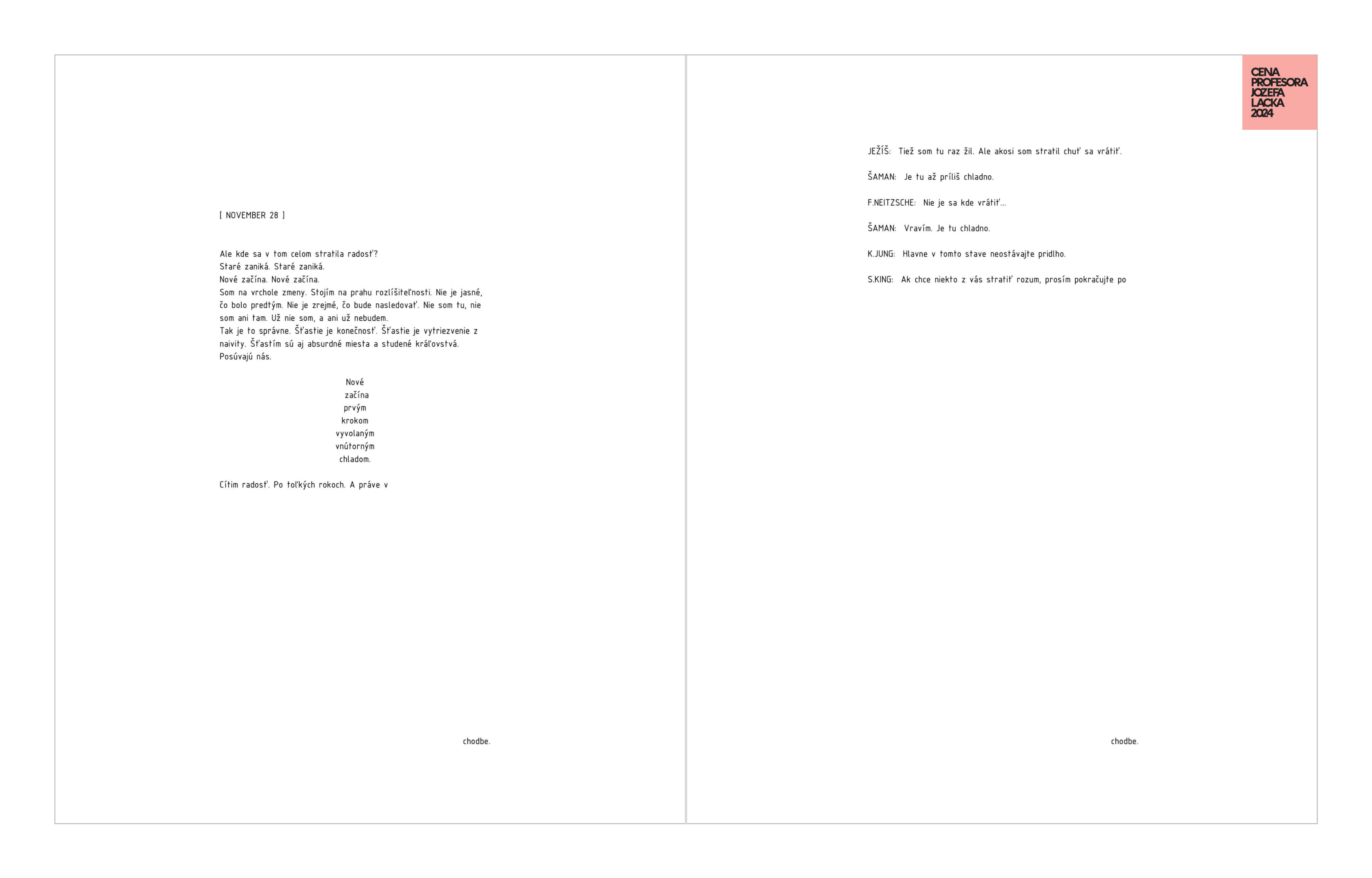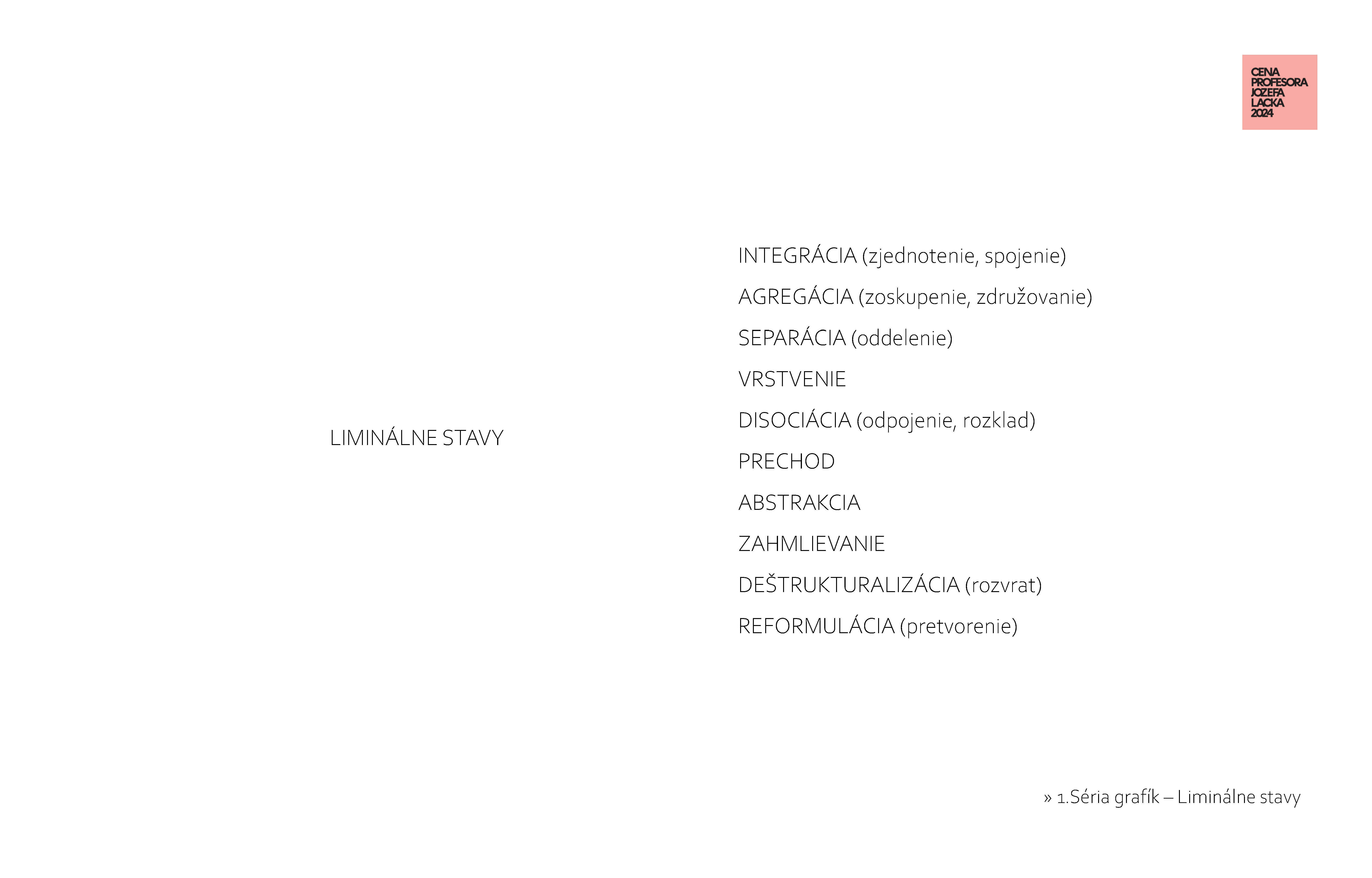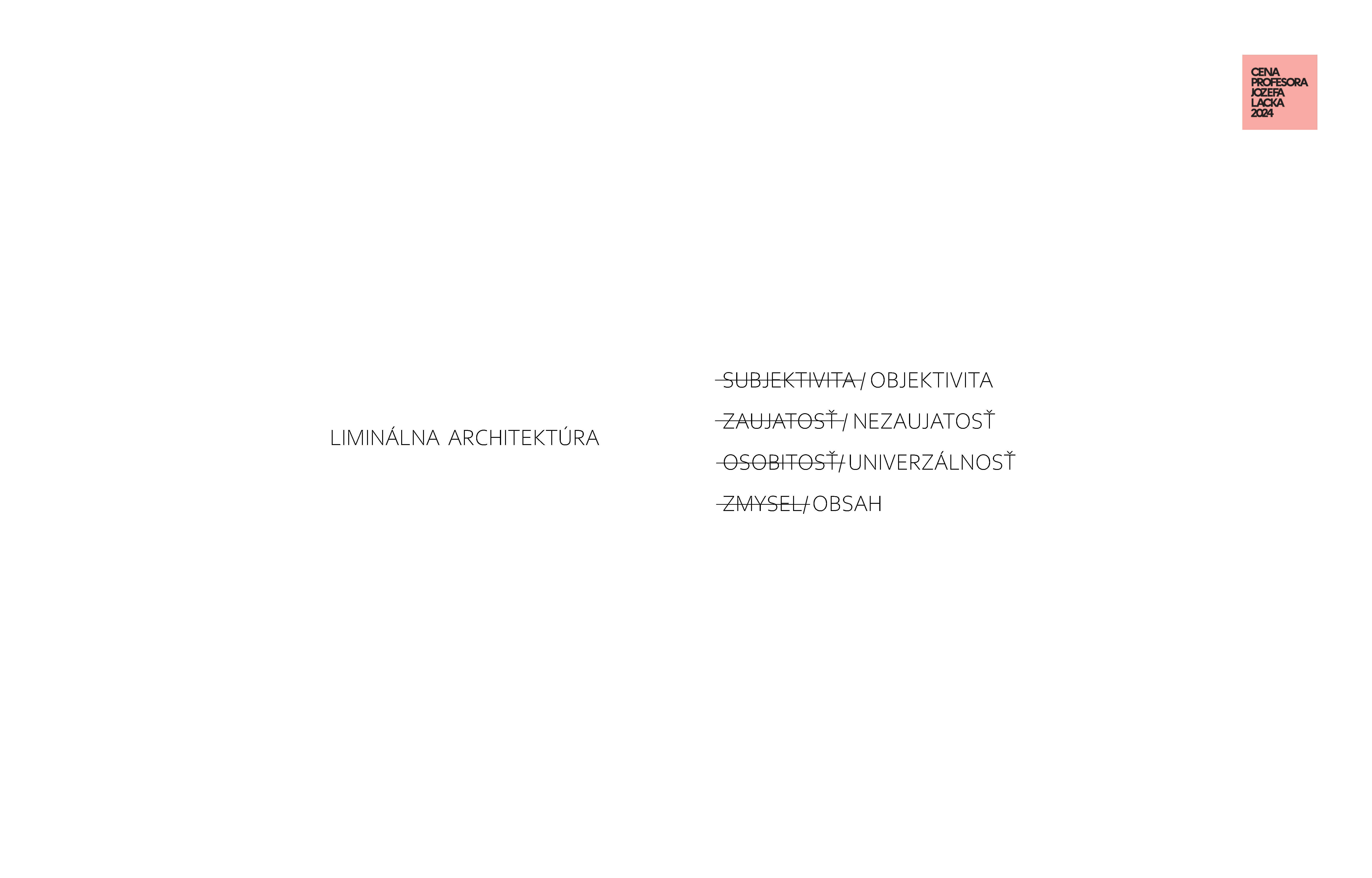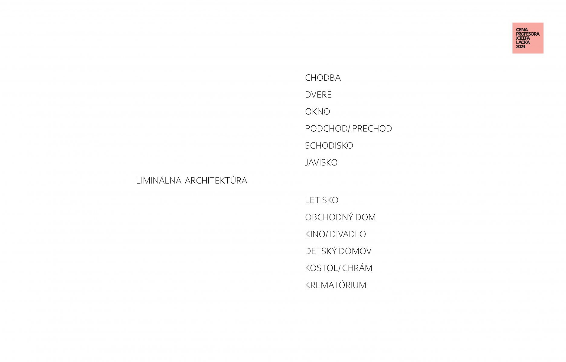 "Liminal / liminalita, z latinského slova limen (prah), je kvalita nejednoznačnosti, ktorá sa vyskytuje v strednej fáze medzi dvoma východiskovými bodmi. Diplomová práca zachytáva proces poznania prahových liminálnych javov. Rozpoznáva podobné aj odlišné vlastnosti takýchto fenoménov na individuálnej aj kolektívnej úrovni. Skúma manifestáciu hraničných fáz do fyzického prostredia a určuje ich všadeprítomnú univerzálnosť. Zachytáva emocionálnu reakciu človeka na prechodné priestory a ich následnú funkciu v oblasti architektúry.
