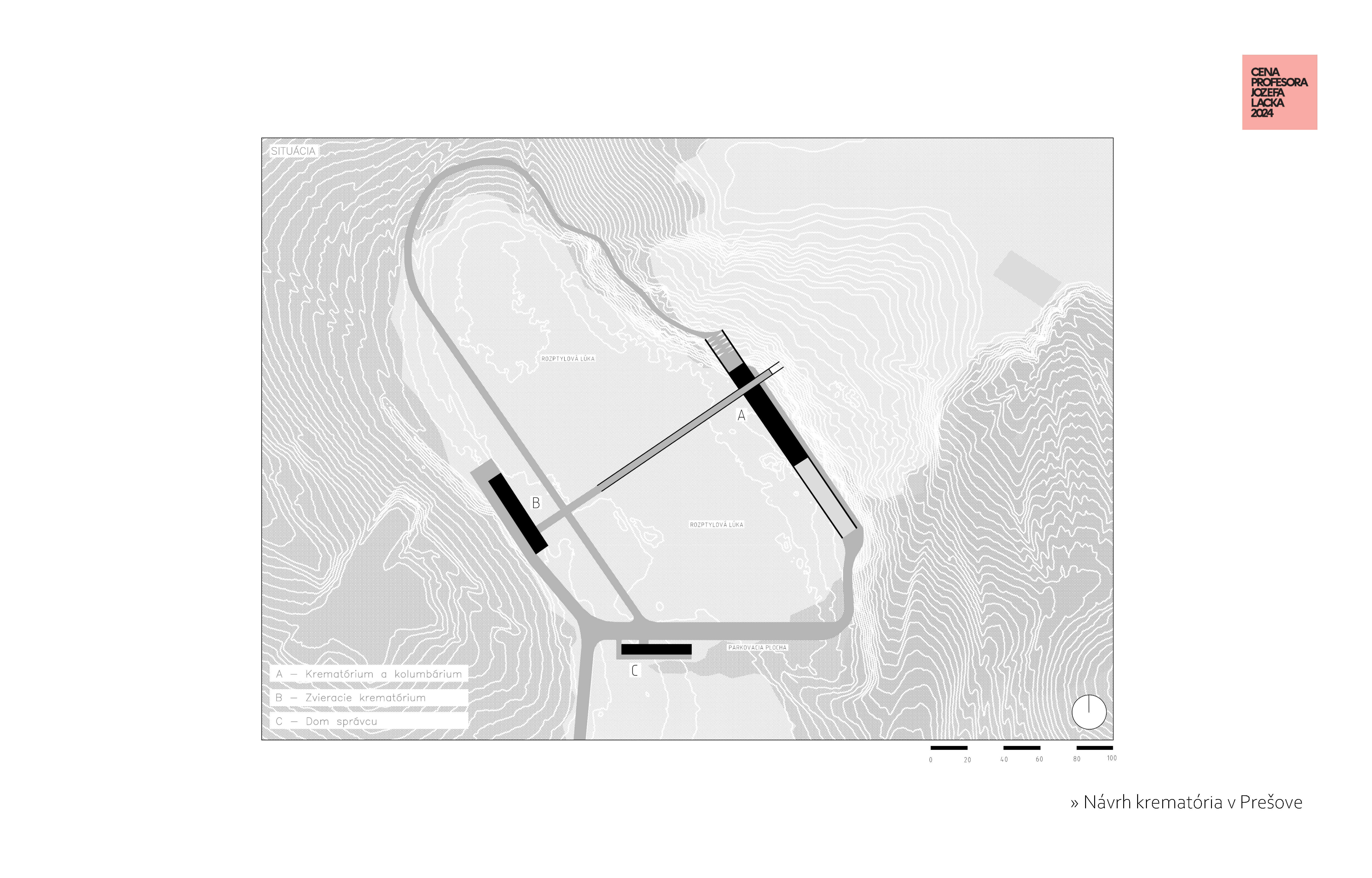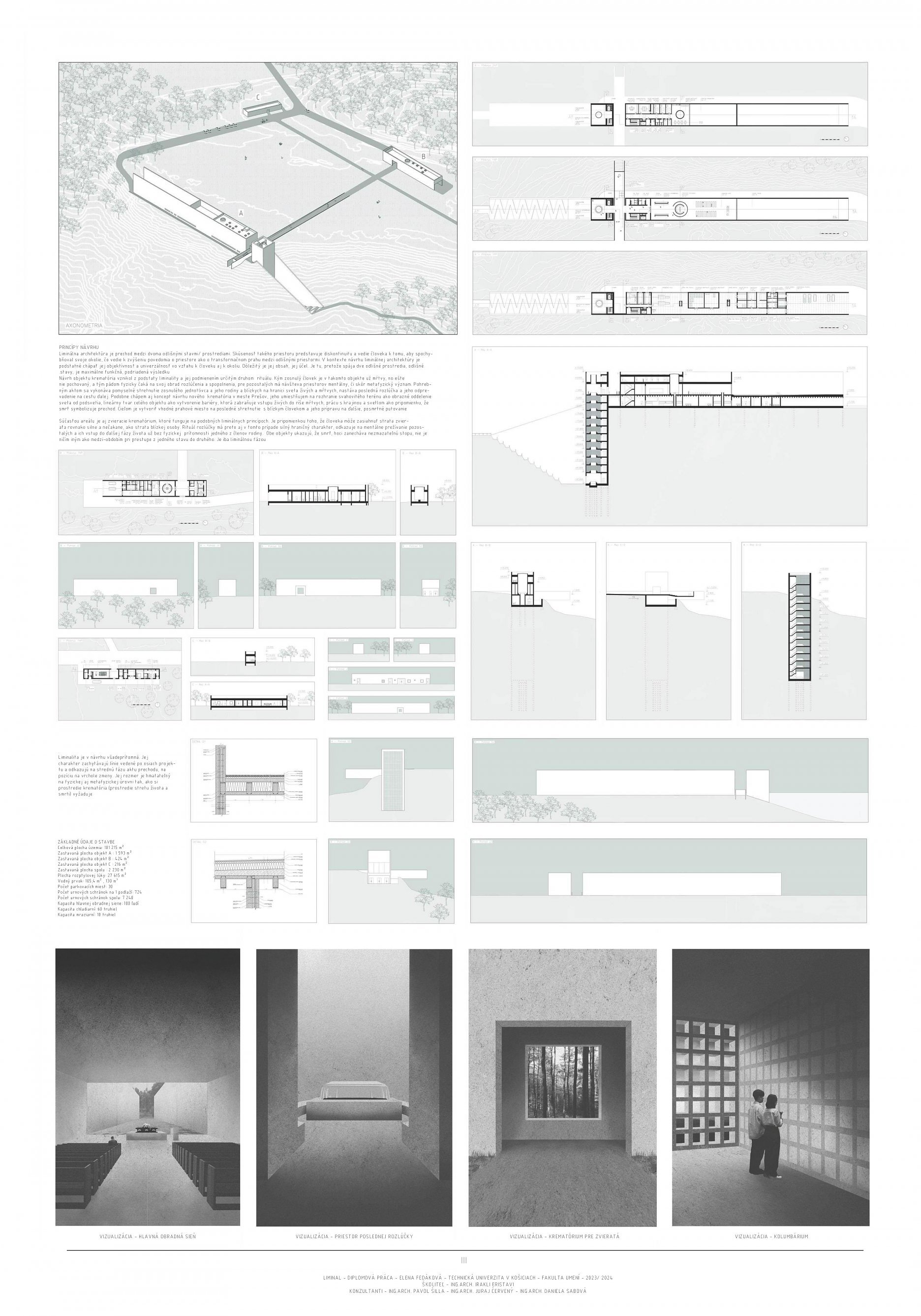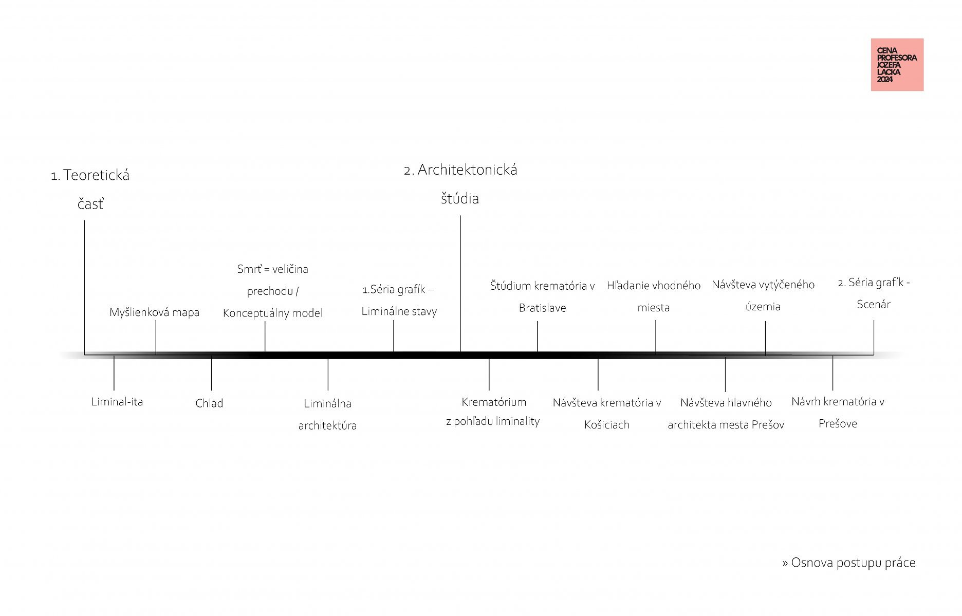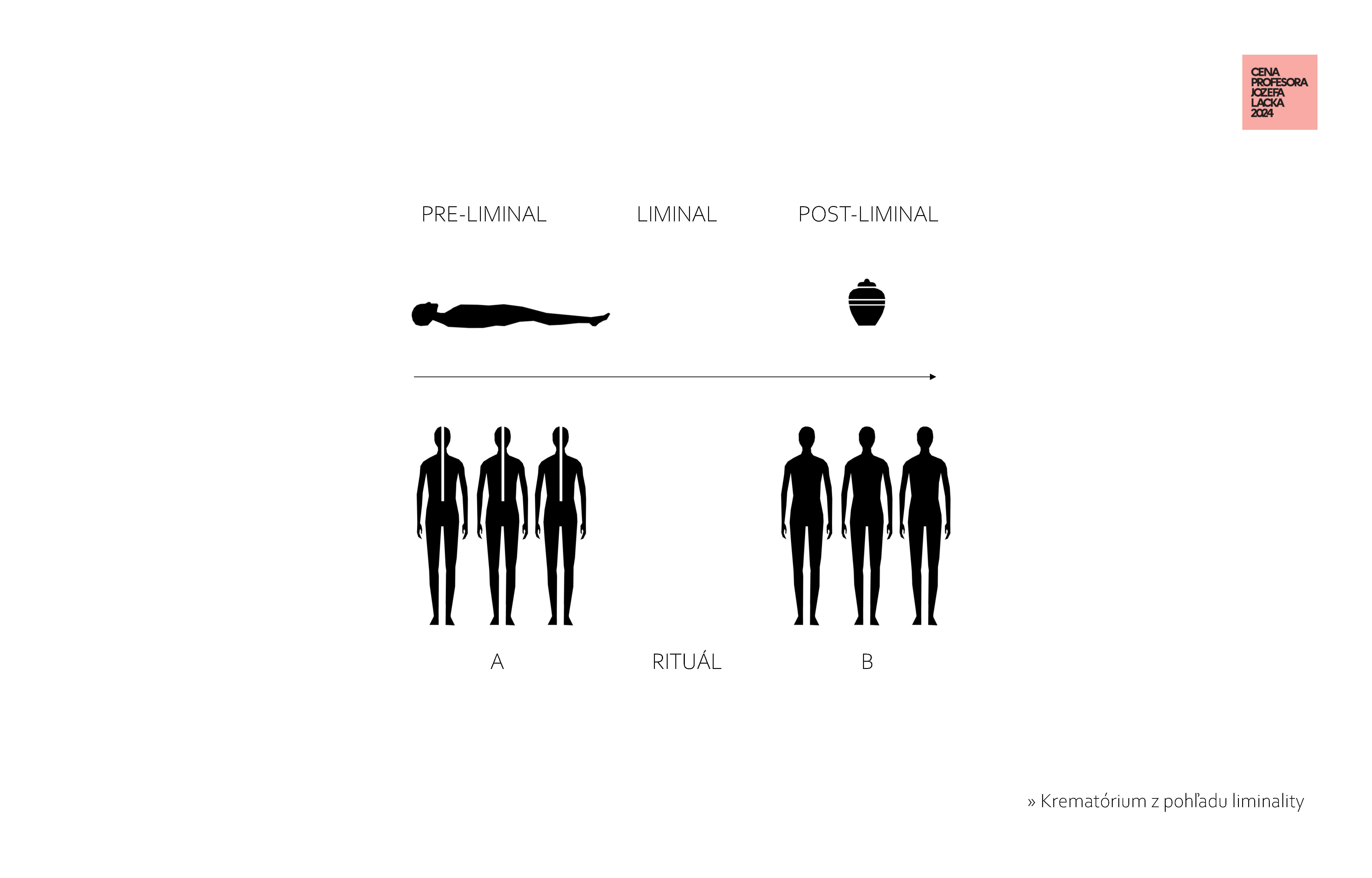 Výsledkom je návrh objektu krematória, ktorý vznikol z podstaty liminality a jej podmienením určitým druhom rituálu. Kým zosnulý človek je v takomto objekte už mŕtvy, no ešte nie pochovaný, a tým pádom fyzicky „čaká“ na svoj obrad rozlúčenia a spopolnenia, pre pozostalých má návšteva priestorov mentálny, či skôr metafyzický význam. Pohrebným aktom sa vykonáva pomyselné stretnutie zosnulého jednotlivca a jeho rodiny a blízkych na hranici sveta živých a mŕtvych. Podobne chápem aj koncept návrhu nového krematória v meste Prešov, jeho umiestňujem na rozhranie svahovitého terénu ako obrazné oddelenie sveta od podsvetia, lineárny tvar celého objektu ako vytvorenie bariéry, ktorá „zabraňuje“ vstupu do ríše mŕtvych, prácu s krajinou a svetlom ako pripomienku, že smrť symbolizuje prechod. Cieľom je vytvoriť vhodné prahové miesto na posledné stretnutie s blízkym človekom a jeho prípravu na ďalšie, posmrtné putovanie."