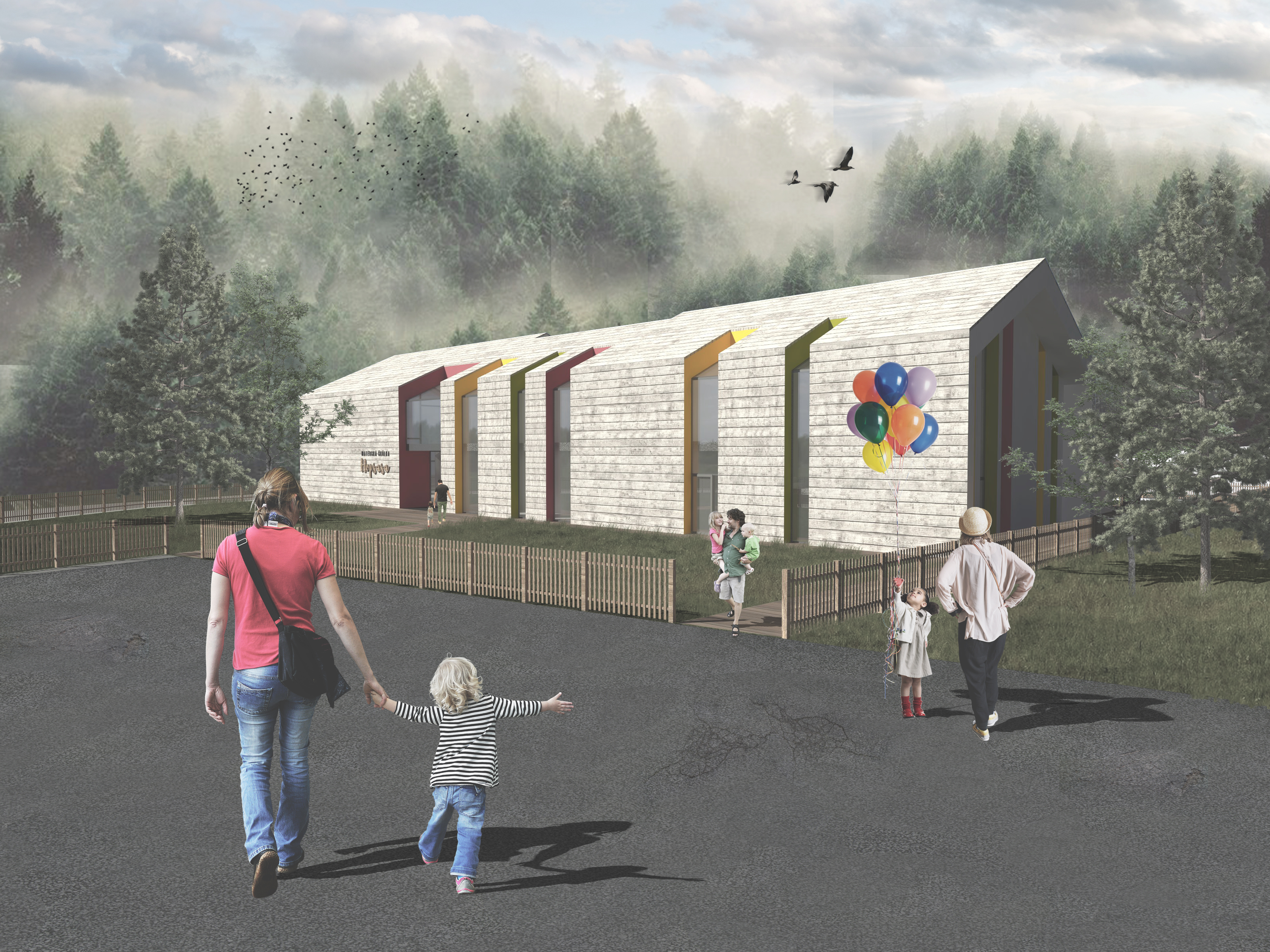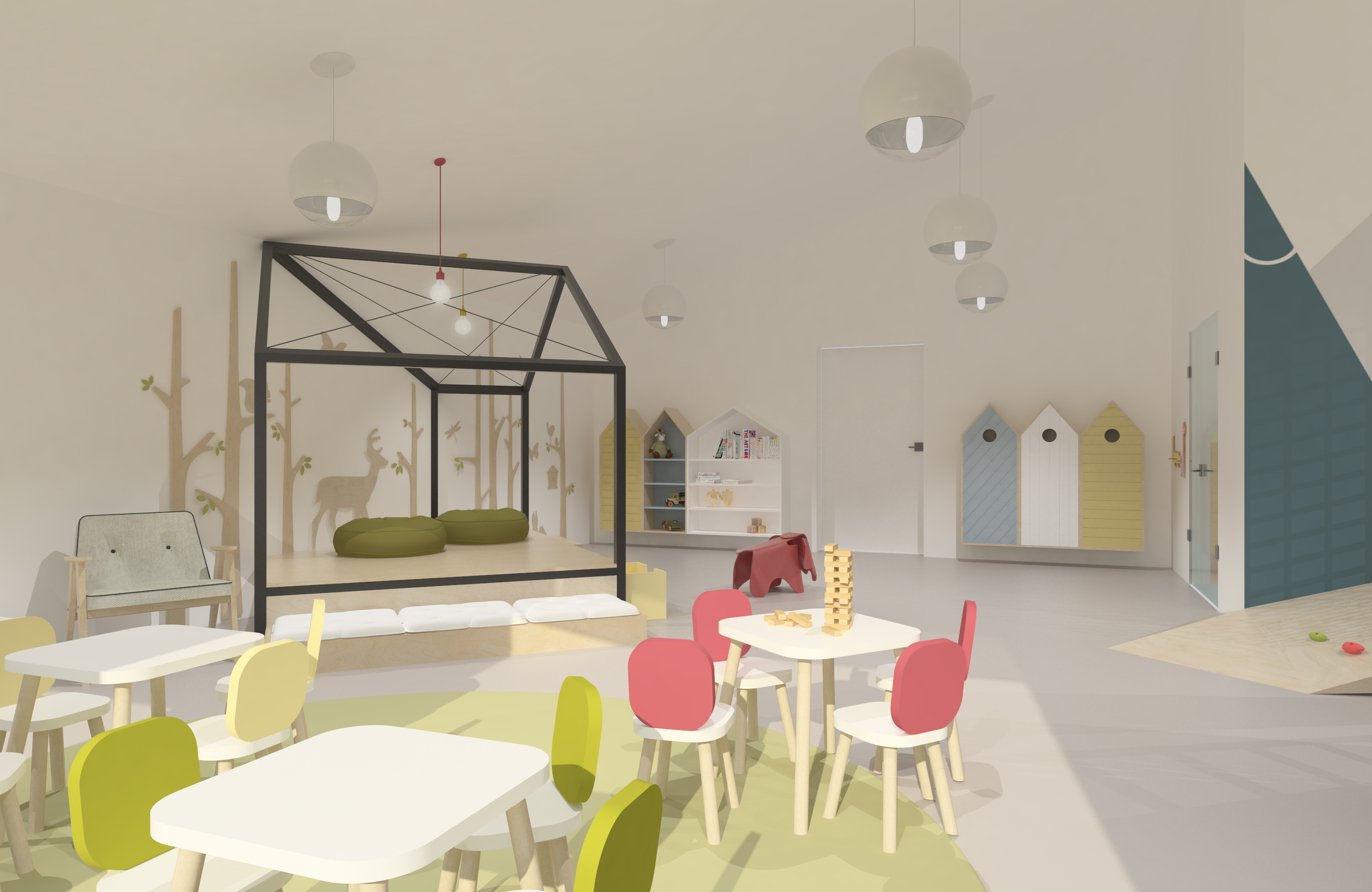 Budova sa nachádza v meste Dolný Kubín v tesnej blízkosti centra mesta a v jej dobrej nadväznosti na okolie. Budova je ľahko prístupná verejnou komunikáciou a v pešej dochádzkovej vzdialenosti od centra mesta len 5 minút. V okolí sa nachádza niekoľko športových areálov čo prispelo k výberu tejto lokality z hľadiska jeho využitia predovšetkým pre takýto typ budovy. Škôlka je určená pre deti od 3-6 rokov rozdelená do 3 tried. Celková kapacita je 40 detí. Cieľom bolo vytvorenie takých priestorov, ktoré budú rozvíjať fantáziu detí a nebudú ich limitovať. Vytvorila som tak hlavnú loď, ktorá dispozičným riešením ponúka veľa možností pre deti a tak nadobúda ďalšiu hodnotu a to využitie týchto priestorov aj počas nepriaznivých vonkajších podmienok. Hlavná loď je dvojpodlažná, v jednej časti podpivničená, ktorej súčasťou je veľké átrium, ktoré je možné tiež plne využívať na rôzne aktivity. Jednotlivé triedy, ktorých veľkosť je rozdielna a závisí od počtu detí a ich veku sa napájajú na hlavný priestor a ich spôsob napojenia pripomína ako keby boli do hlavnej lode „zarezané“. Z hľadiska konštrukcie je táto stavba v kombinácii muriva a lepených drevených nosníkov. Interiér je tak z tohto hľadiska ladený do dreva a materiálov jemu príbuzných aby tak vznikla harmónia s materiálmi použitými v exteriéri. Vybrané časti interiéru, ktoré som riešila v diplomovej práci sú predovšetkým priestory hlavnej lode bez technickej časti budovy vrátane kuchyne a z interiéru jednej typickej triedy, jej funkčného rozdelenia a riešenia v rámci stvárnenia v interiéri. Mojou snahou bolo vytvoriť pre deti taký priestor, ktorý poskytuje možnosť variácie, podporuje ich kreativitu a to všetko v duchu bezpečnosti a hygienických zásad.