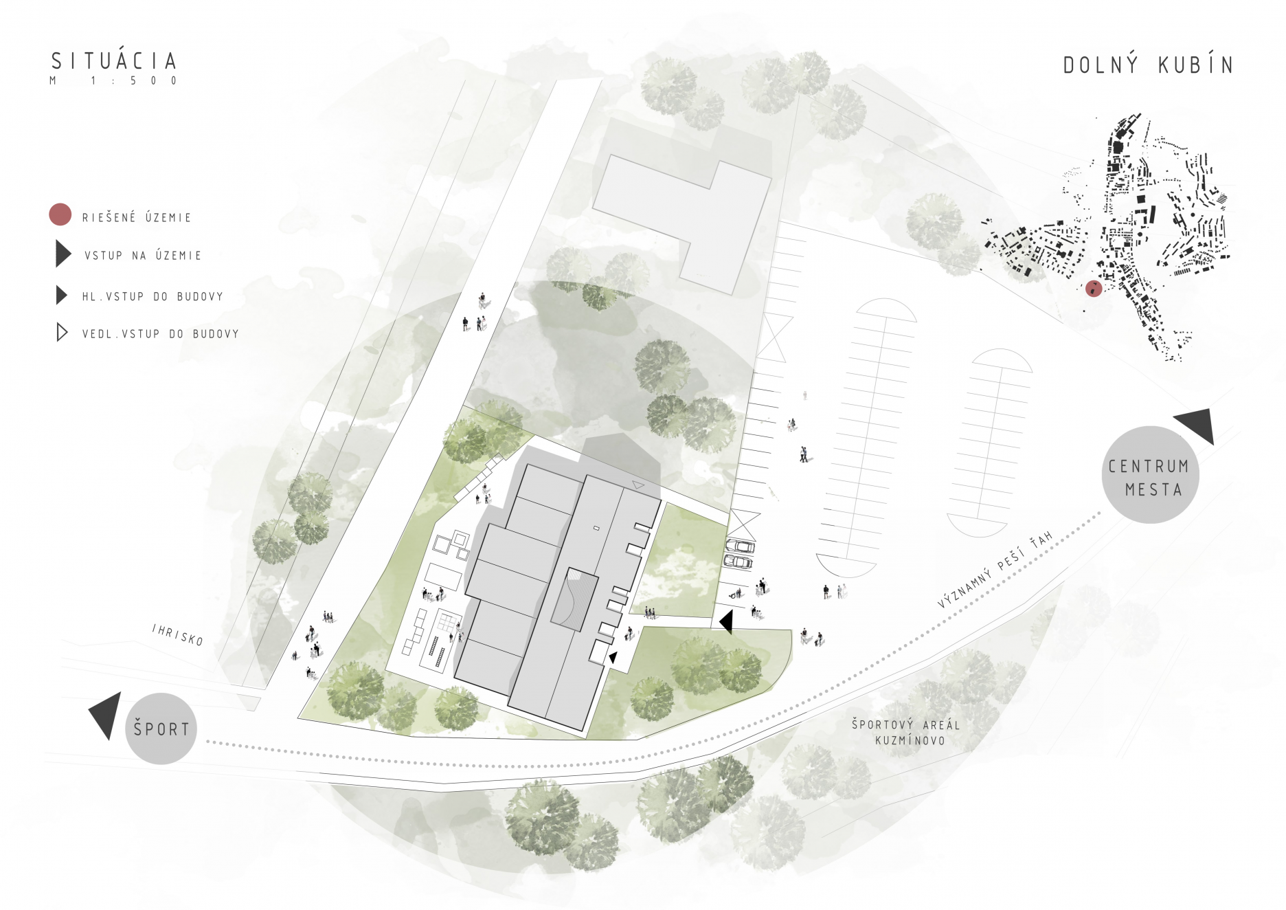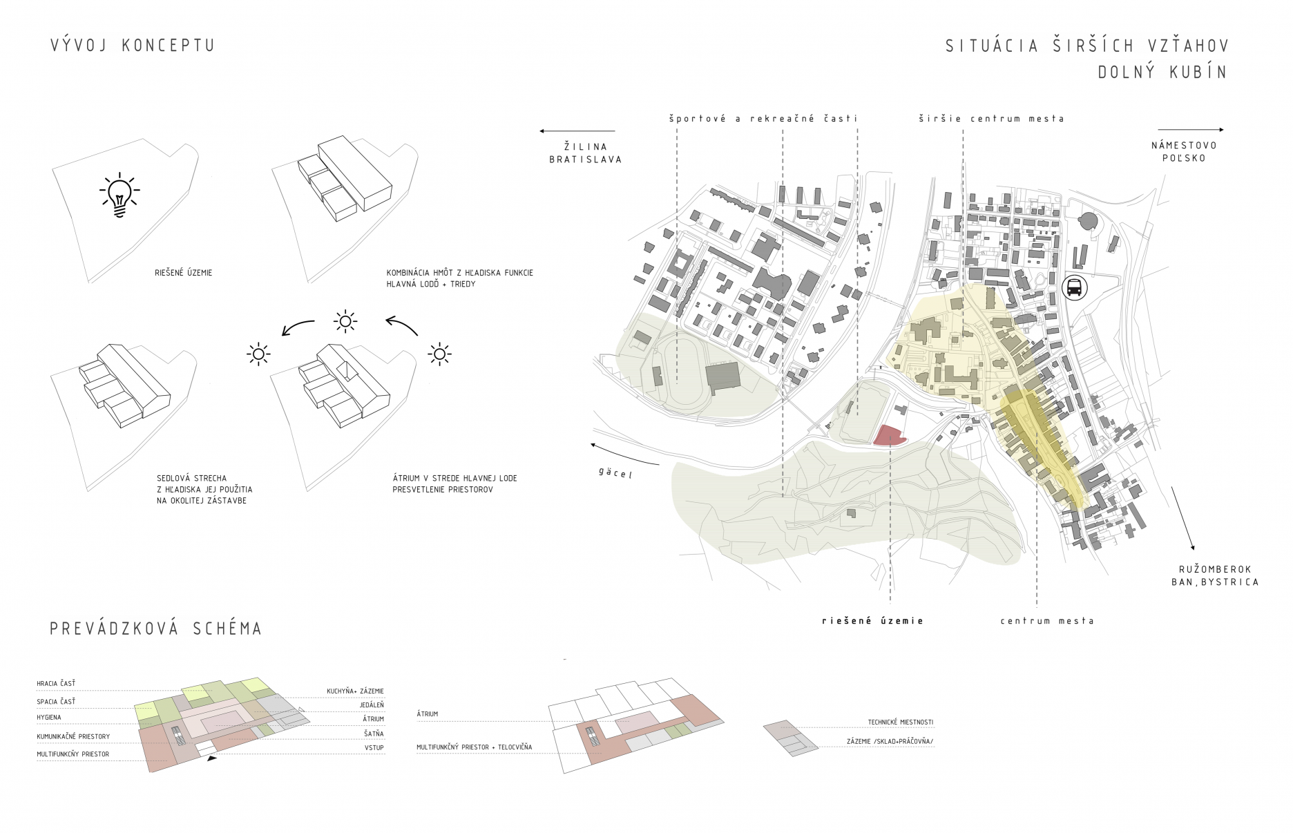 Pri navrhovaní budovy som vychádzala z hlavného cieľa a to prepojenia exteriéru s interiérom z hľadiska materiálového riešenia a vytvorenia tak ucelenej harmónie ako celku. Nakoľko budova je situovaná v časti mesta, ktorá je vo výbornej nadväznosti na rekreáciu a šport, rovnako som sa snažila o prepojenie vonkajších priestorov budovy a podporiť tak aktivity, ktoré môžu deti vykonávať vonku.