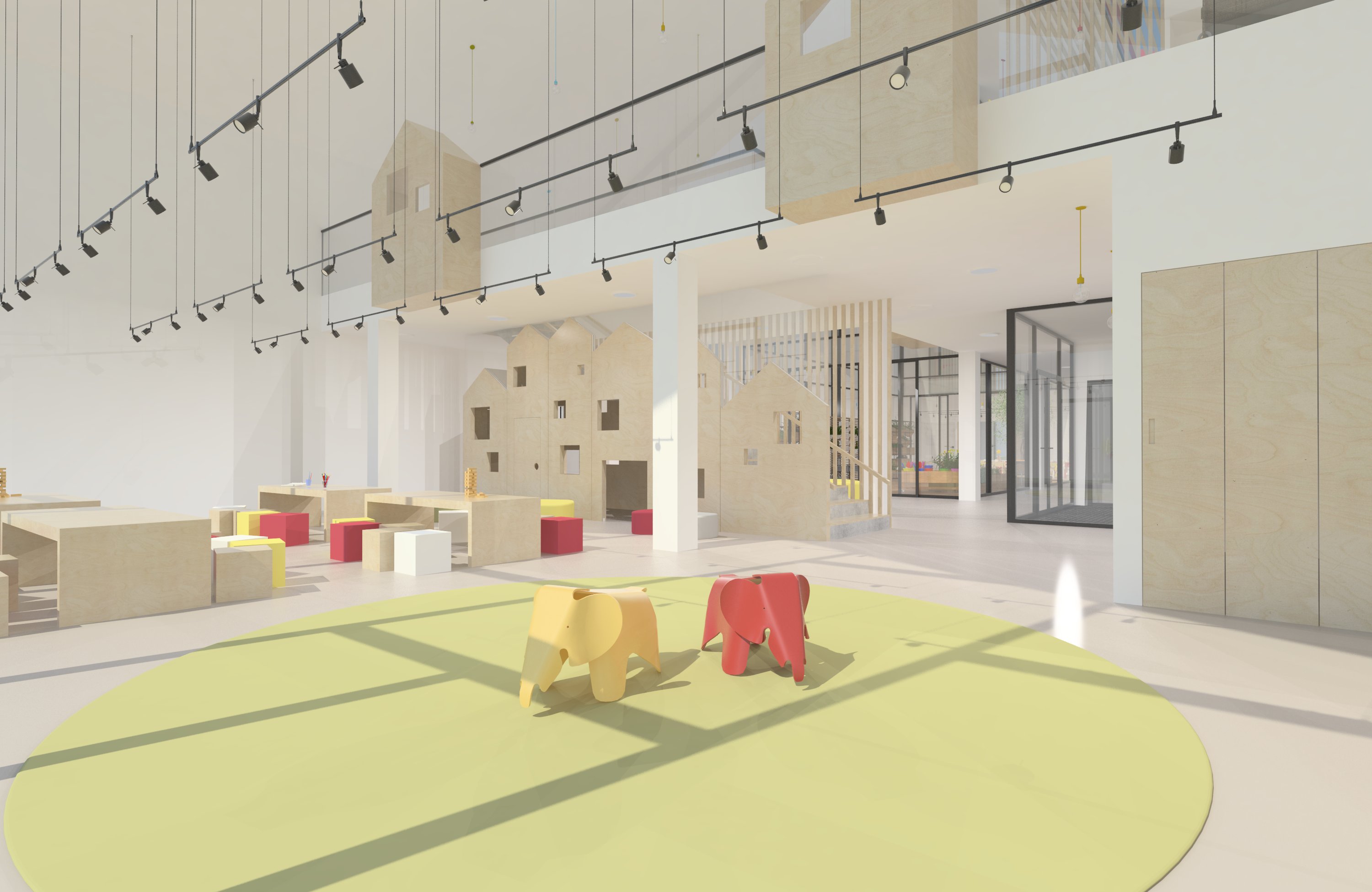 Vstup je situovaný v severovýchodnej časti dvojpodlažnej budovy, do ktorej sa vchádza cez presklené zádverie. Šatňa je priamo napojená na zádverie a tvorí tak filter medzi interiérom a exteriérom budovy. Zo zádveria sa vchádza do vstupnej časti škôlky, na ktorú sa napája multifunkčný priestor a átrium. Tieto priestory sú otvorené cez dve podlažia, vďaka čomu je dispozícia vzdušná a podporuje ľahkú orientáciu v priestore.