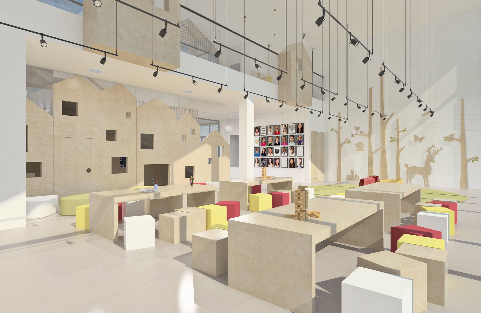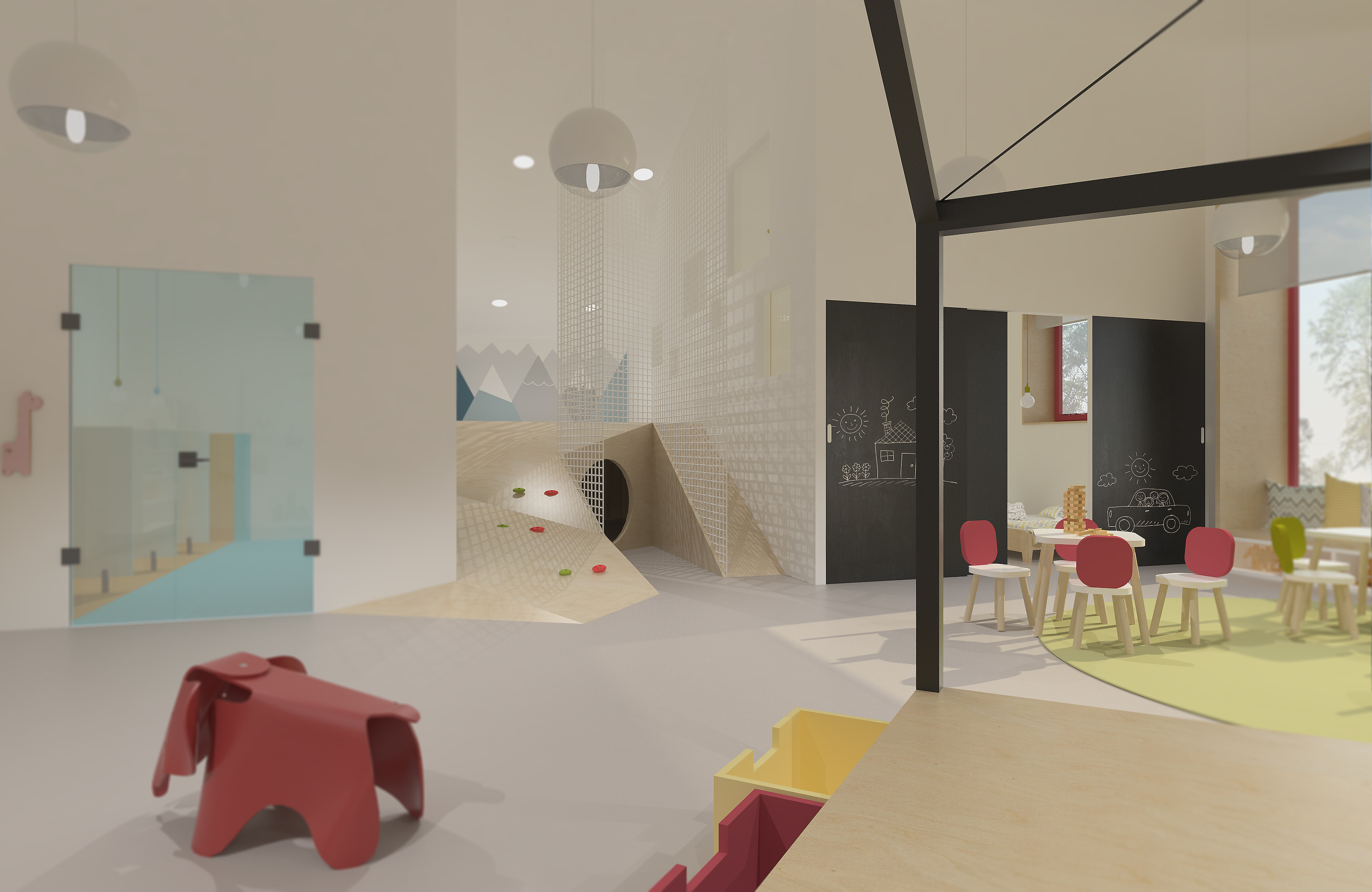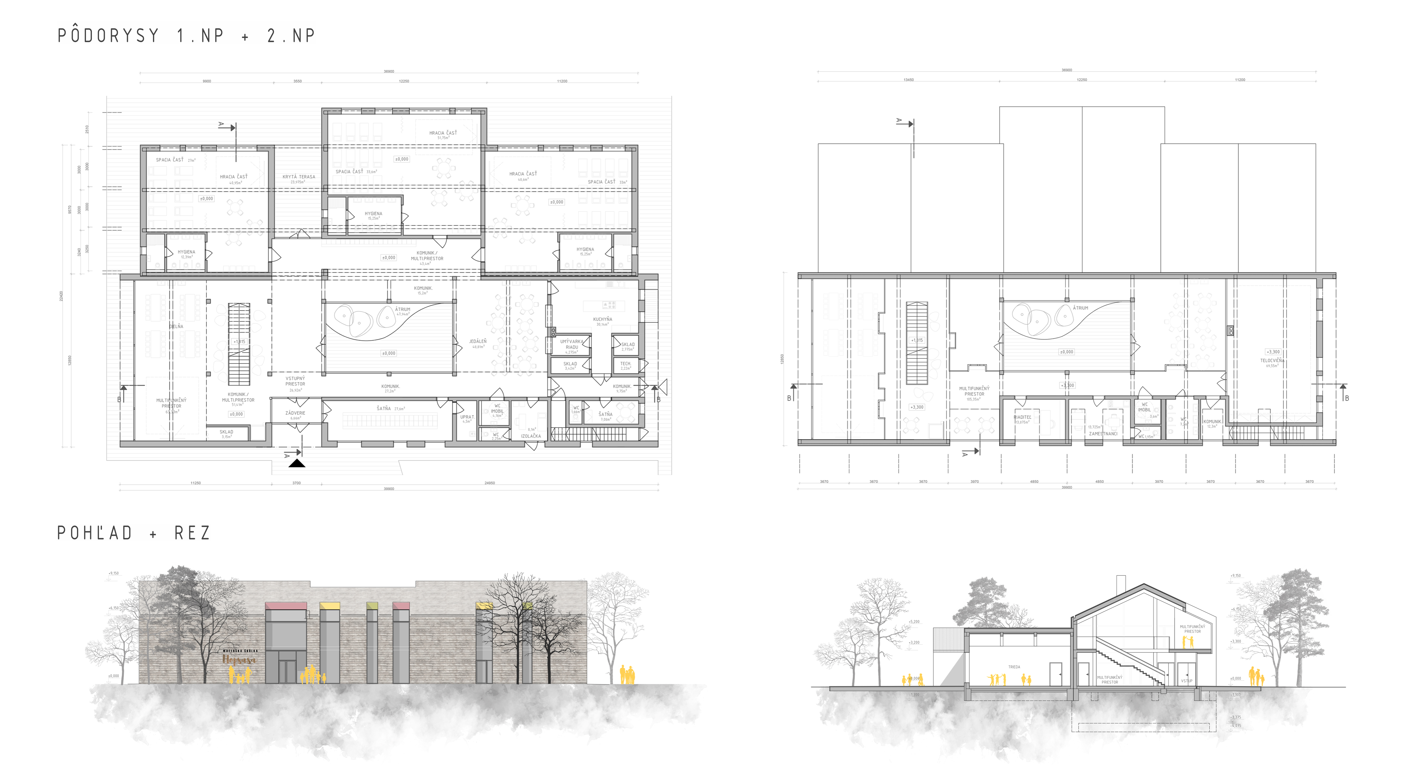Budova pozostáva z dvoch častí, ktoré na seba priamo nadväzujú. Mojou snahou bolo vytvoriť pre deti taký priestor, ktorý poskytuje možnosť variácie, podporuje ich kreativitu a to všetko v duchu bezpečnosti a hygienických zásad. Hlavná loď je dvojpodlažná, v jednej časti podpivničená, ktorej súčasťou je veľké átrium. To je „srdcom“ tohto priestoru. Na vstupnom podlaží je priestor viacúčelového charakteru, šatňa situovaná pri vstupe a jedáleň, ktorá je súčasťou otvoreného priestoru. Technické zázemie a kuchyňa sú v blízkej nadväznosti na jedáleň. Jednotlivé triedy, ktorých veľkosť je rozdielna a závisí od počtu detí a ich veku sa napájajú na hlavný priestor. Každá trieda je rozdelená na 3 zóny- hracia, spacia časť a hygiena. Na druhom nadzemnom podlaží sa nachádzajú herné priestory, vedenie škôlky a telocvičňa.