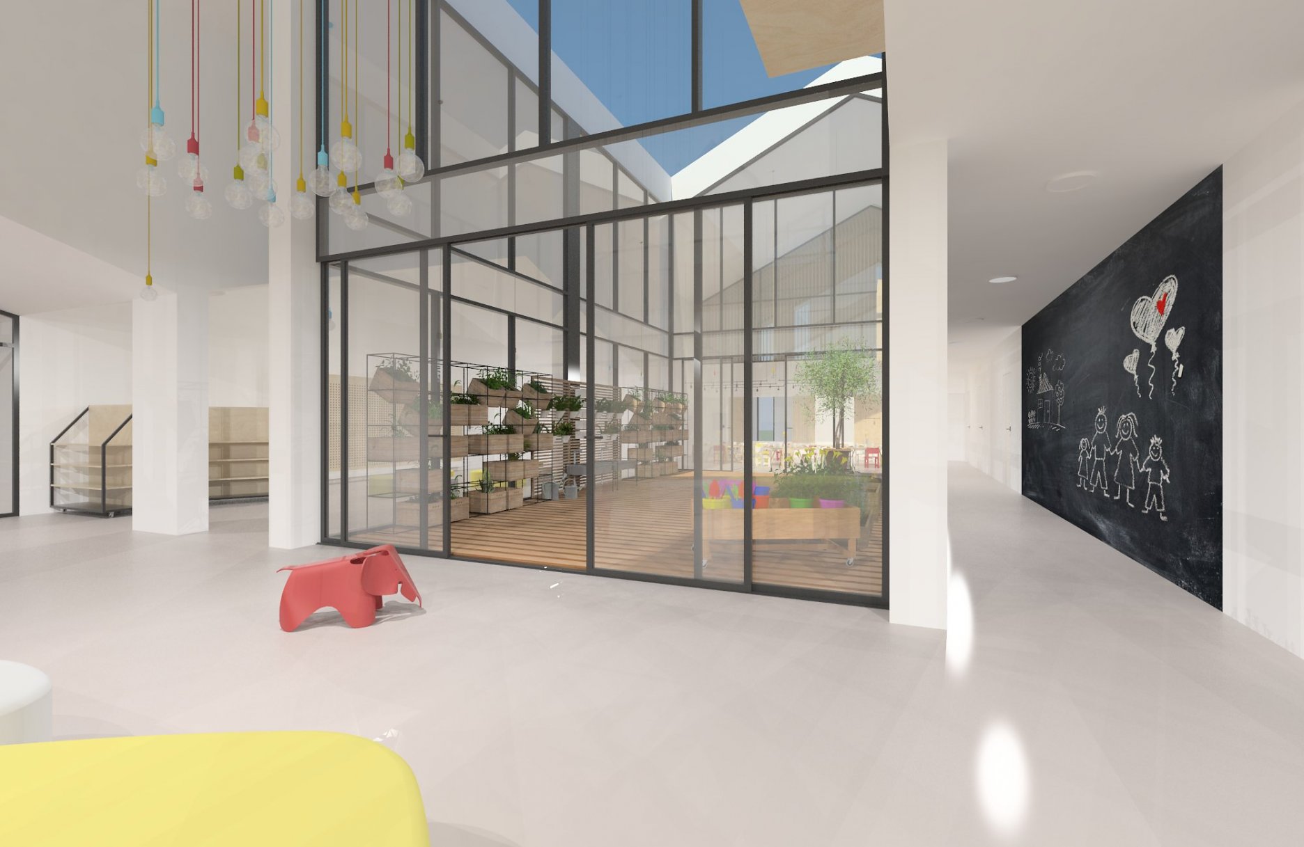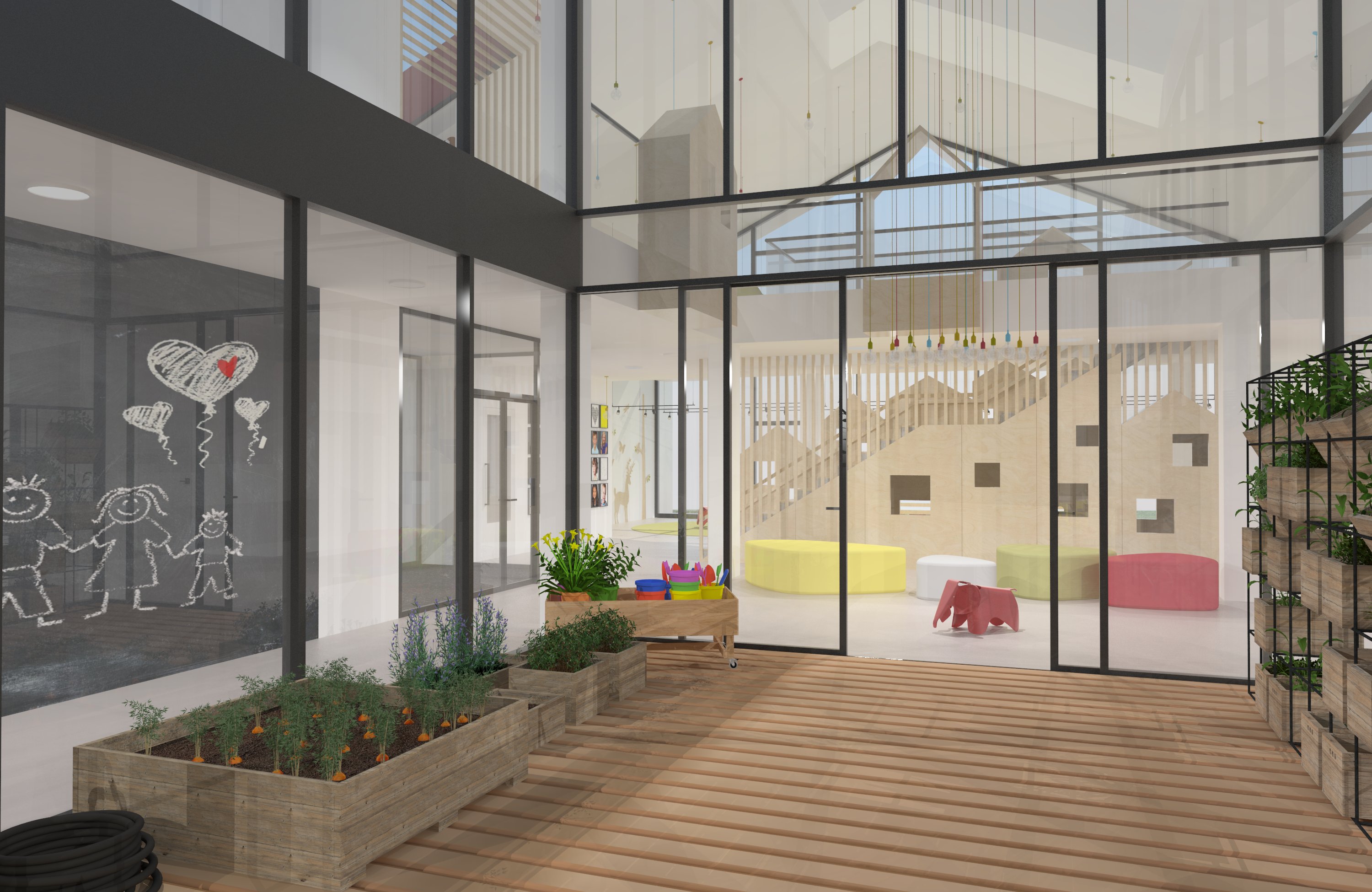 Átrium, ktoré je akýmsi srdcom budovy, má umožnený vstup z dvoch strán, a to zo vstupnej časti a z jedálne, čím je podporené jeho využitie v čase priaznivého počasia. Okrem tohto využitia a presvetlenia vnútorných častí budovy, slúži aj ako miesto na pestovanie zeleniny a ovocia. Jedáleň, ktorá nemá špecifické vyčlenenie v priestore, priamo nadväzuje na technický úsek škôlky a na izolačnú miestnosť, ktorá má samostatný vstup z exteriéru budovy.