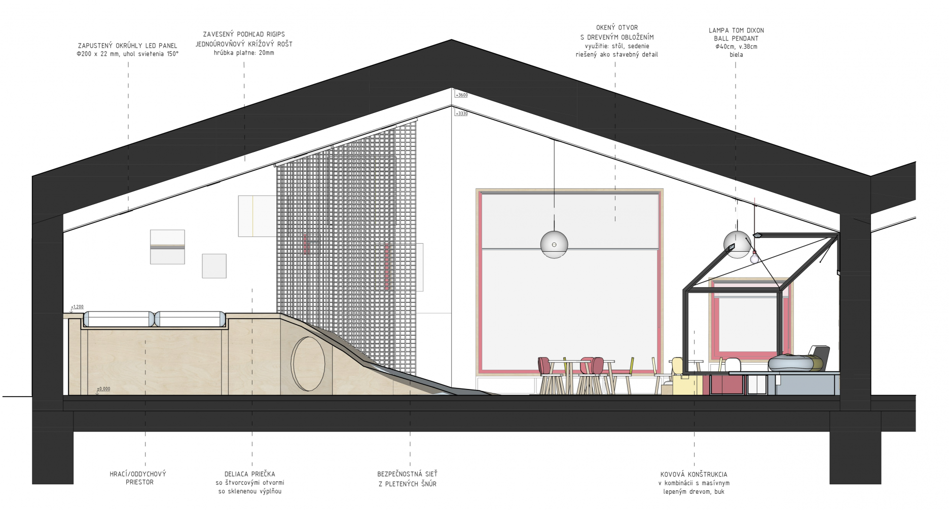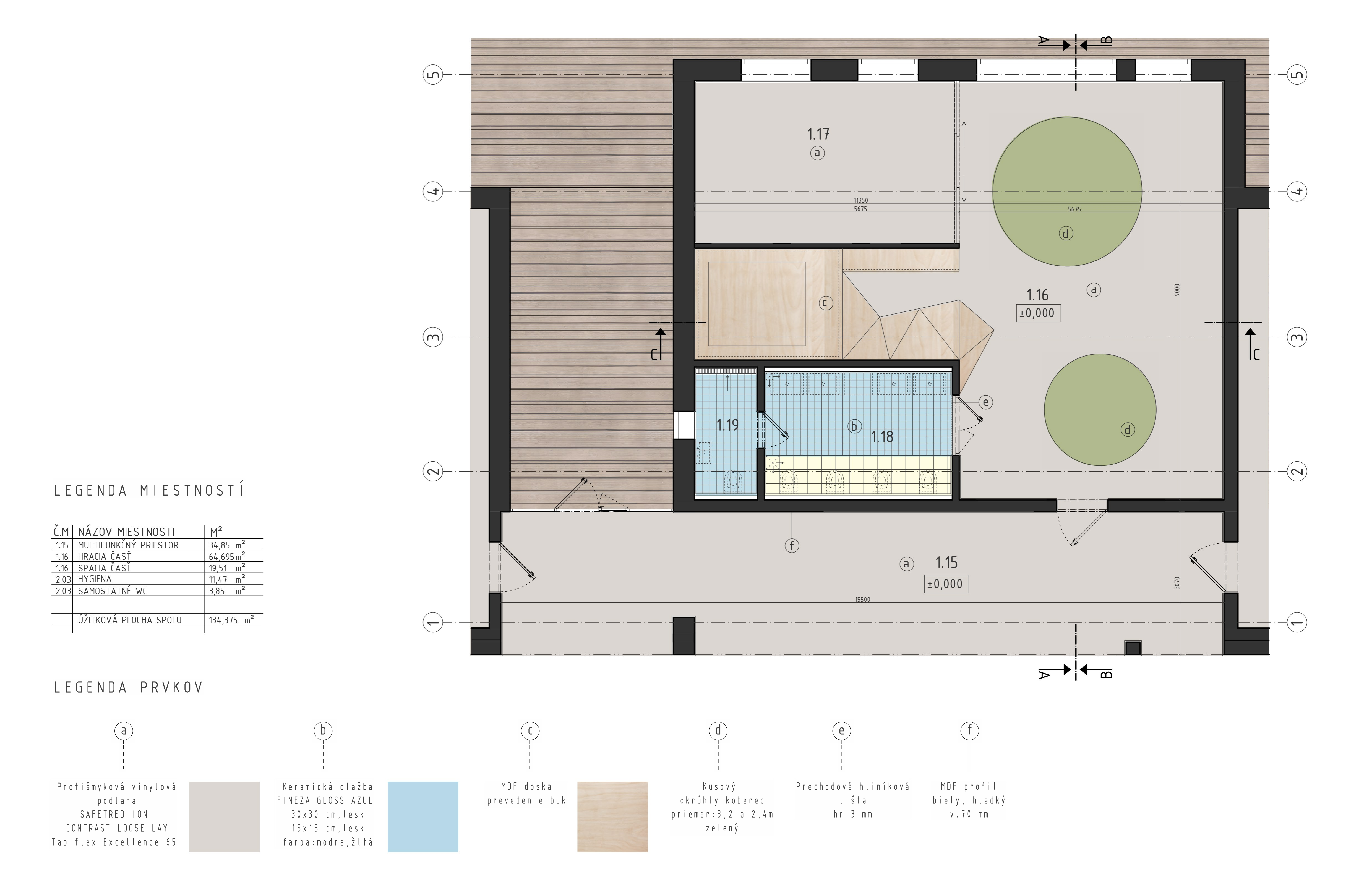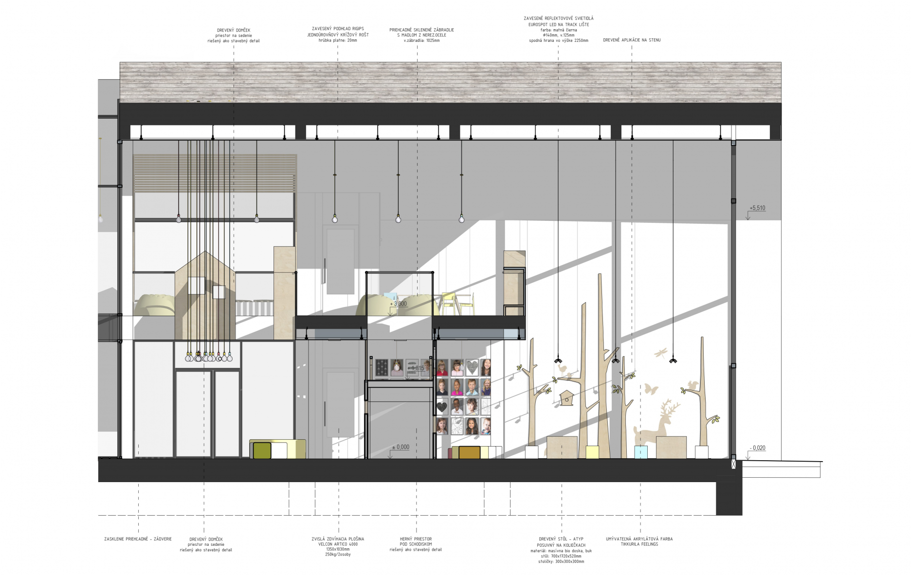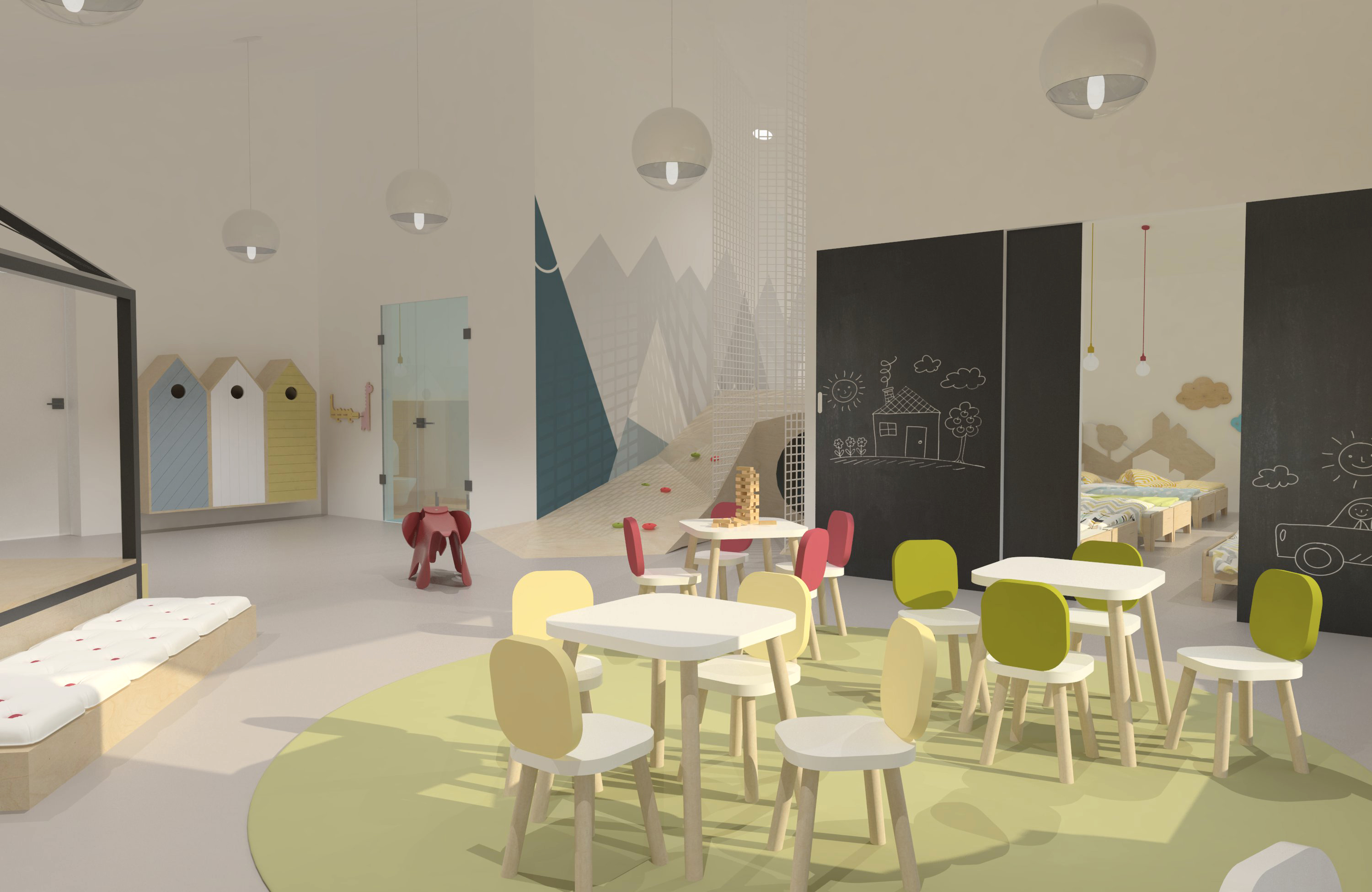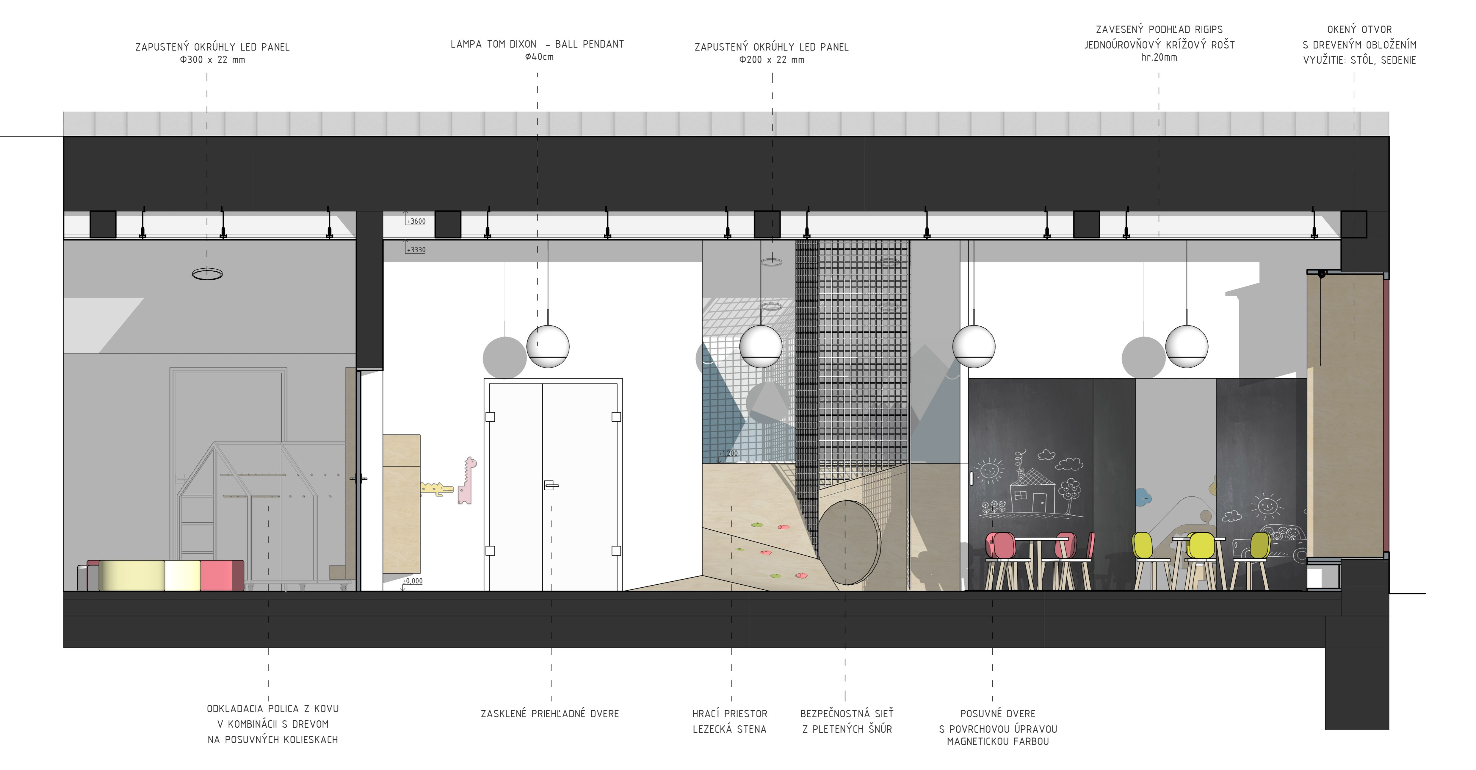 Na tomto podlaží sa nachádzajú aj jednotlivé triedy, ktoré priamo nadväzujú na vyššie spomenuté priestory. Každá trieda je rôzne veľká, nakoľko to závisí od počtu a veku detí. Pri vstupe do triedy je na strane situovaná hygiena s presklenými dverami, aby bola zabezpečená kontrola zo strany vychovávateľa. V rámci hygieny je navrhnuté aj samostatné wc a sprcha. Zvyšok triedy je rozdelený na multifunkčnú a spaciu časť. Tá je od hracej oddelená priečkou a posuvnými dverami, čo jednoznačne oddeľuje tieto priestory. Trieda je navrhnutá tak aby podporila rôzne tipy aktivít pre deti. Z tohto hľadiska je tak trieda pomyselne rozdelená na miesto, kde sa deti môžu realizovať, kresliť si, pozerať rozprávky a z hernej časti, ktorá pozostáva z dvoch úrovní prepojenými lezeckou stenou.