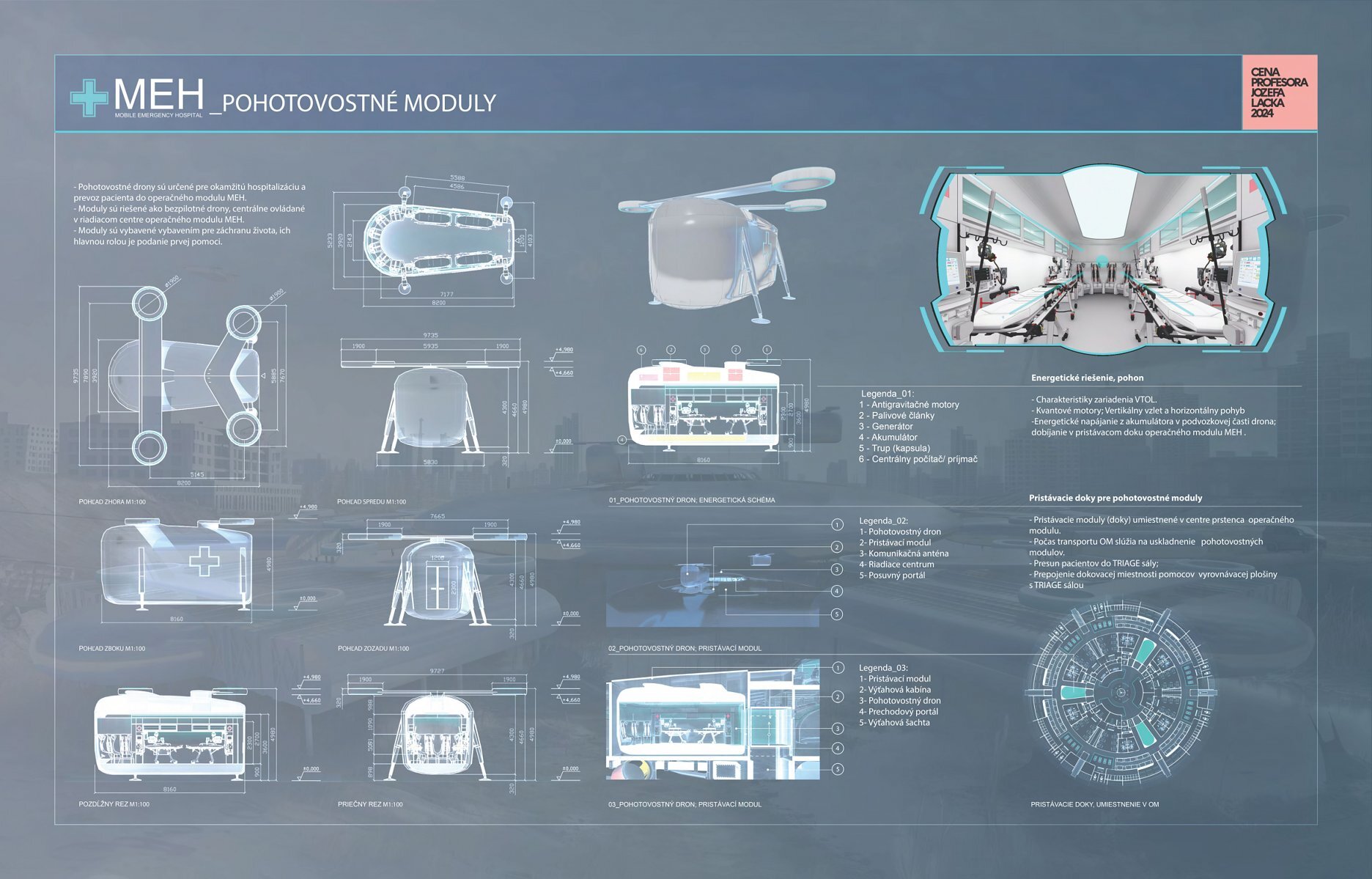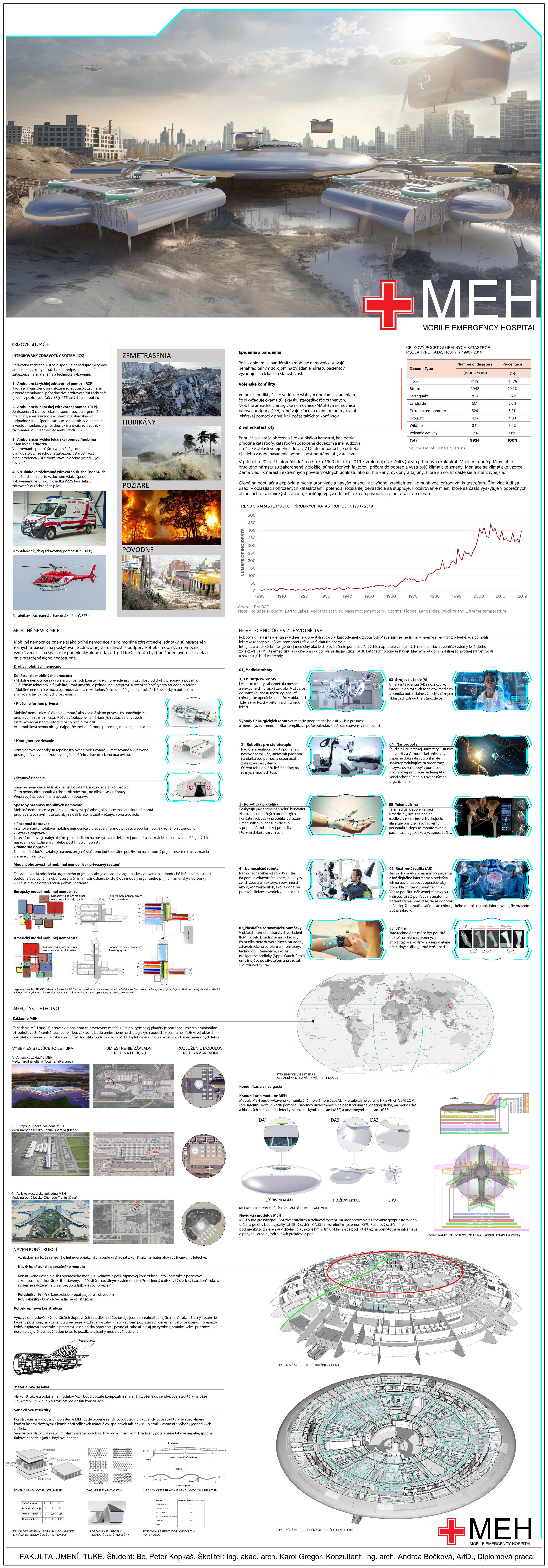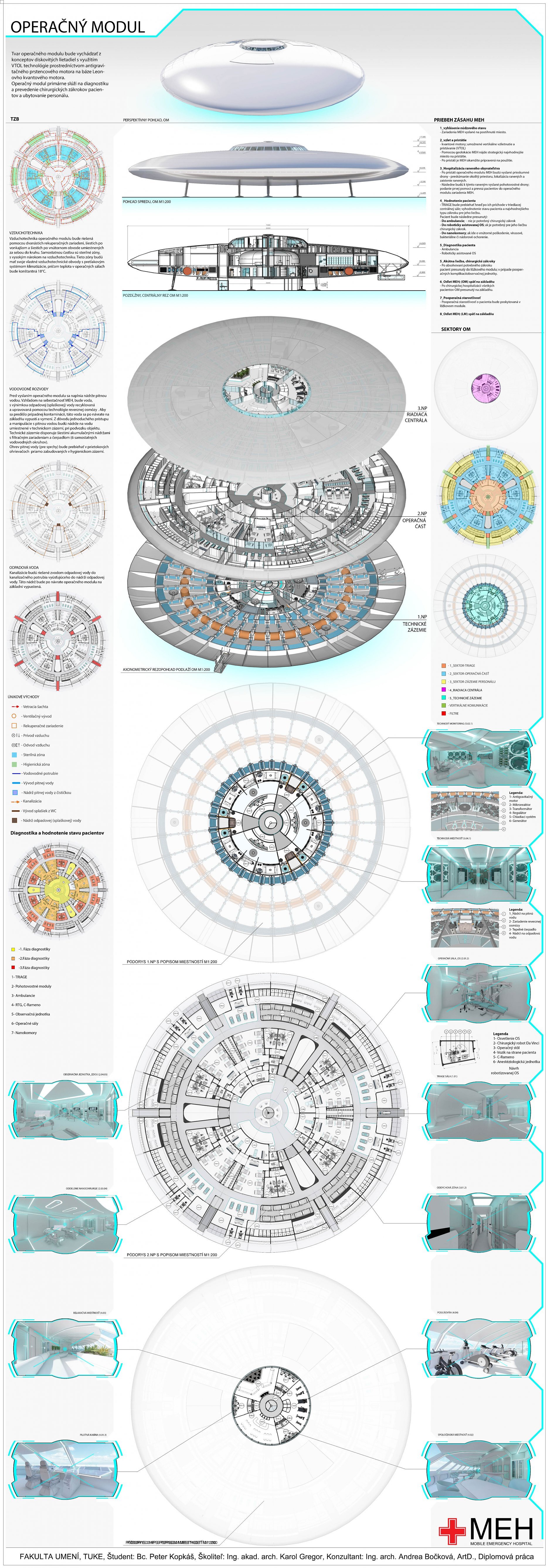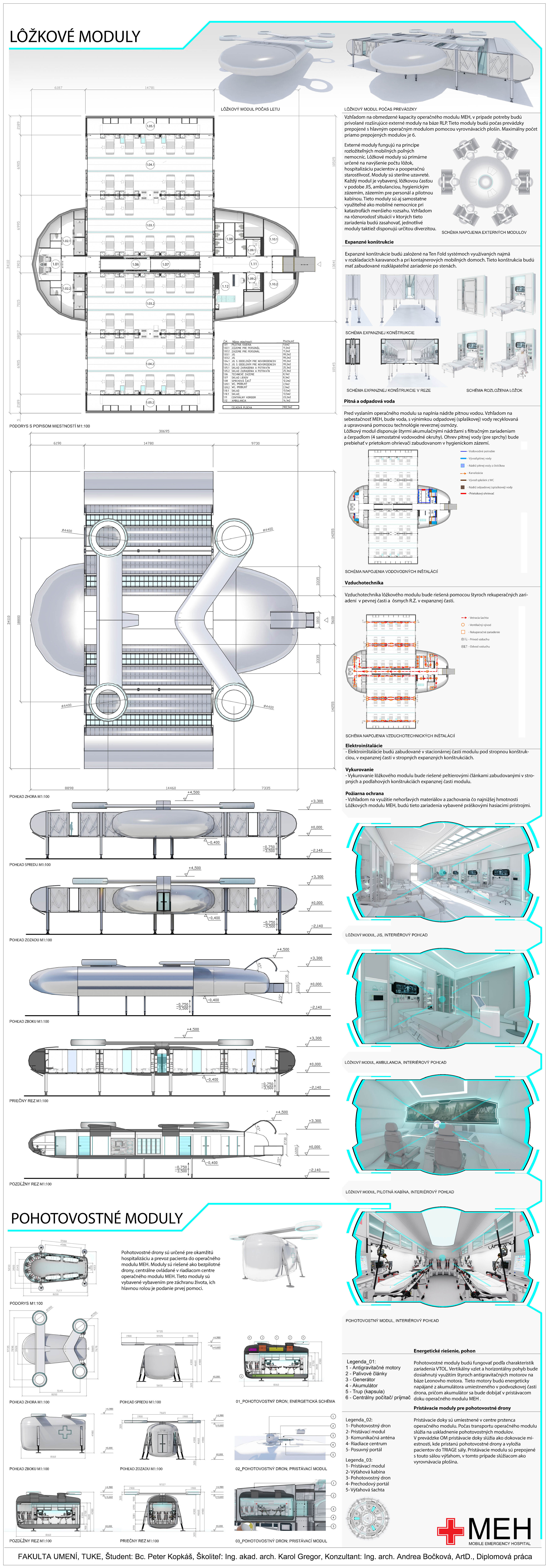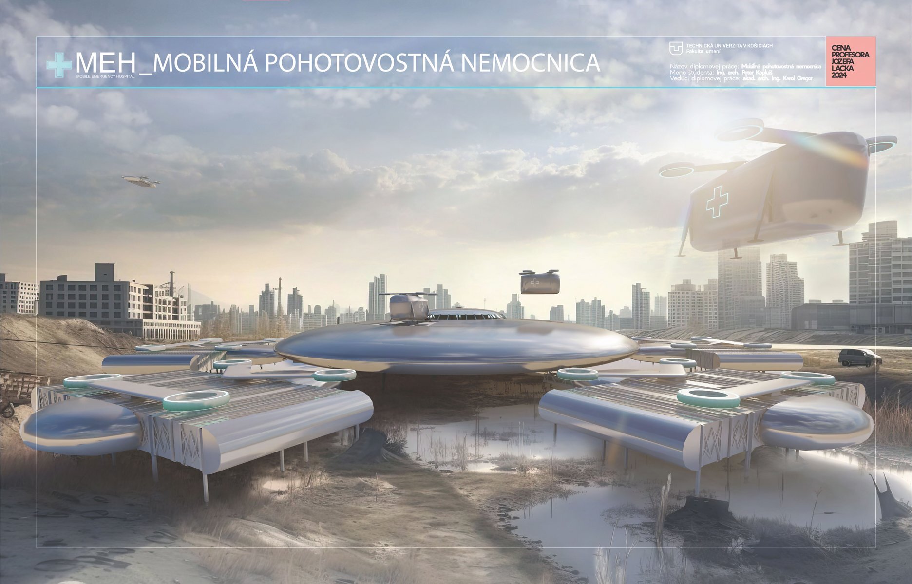 Dnes priblížime prácu "Mobilná pohotovostná nemocnica", ktorá vznikla na pôde Fakulty umení TU v Košiciach pod vedením Karola Gregora. Diplomant Peter Kopkáš sa venuje problematike akútnej hospitalizácie obyvateľstva počas krízových situácii. Hlavným cieľom práce je vytvorenie návrhu prototypu mobilnej pohotovostnej nemocnice (Mobile Emergency Hospital - MEH), ktorá je vizionárskym objektom spájajúcim architektúru s leteckou technikou.