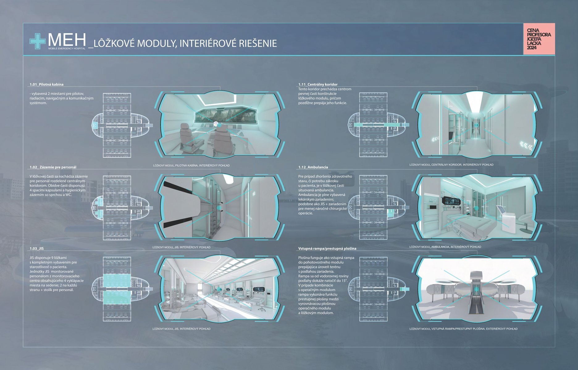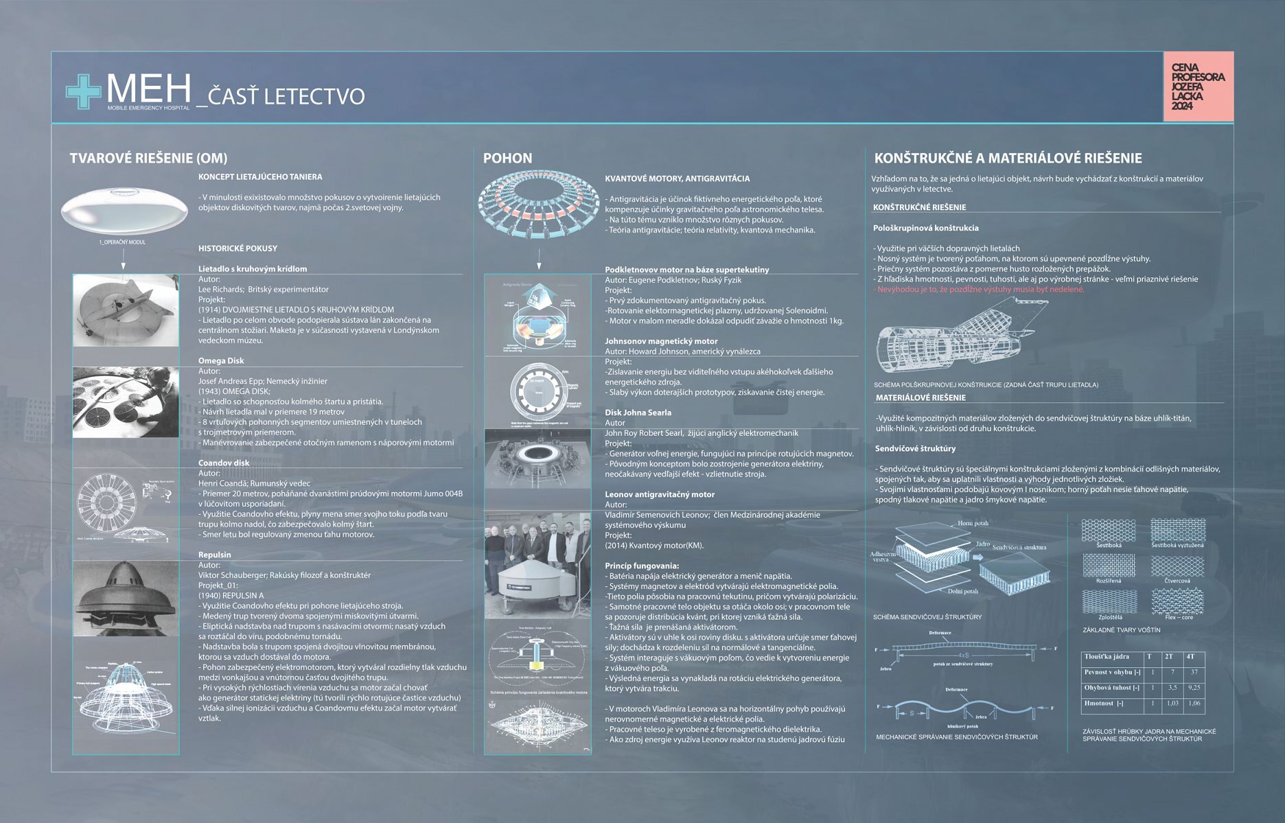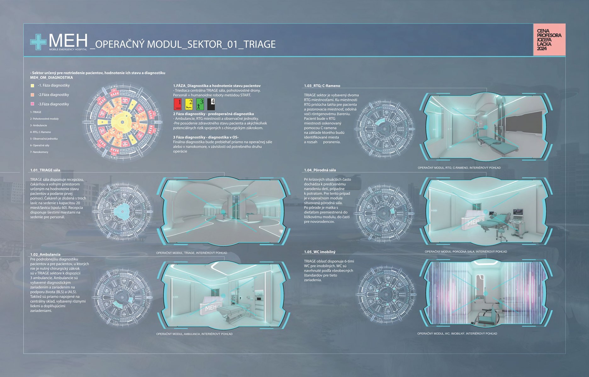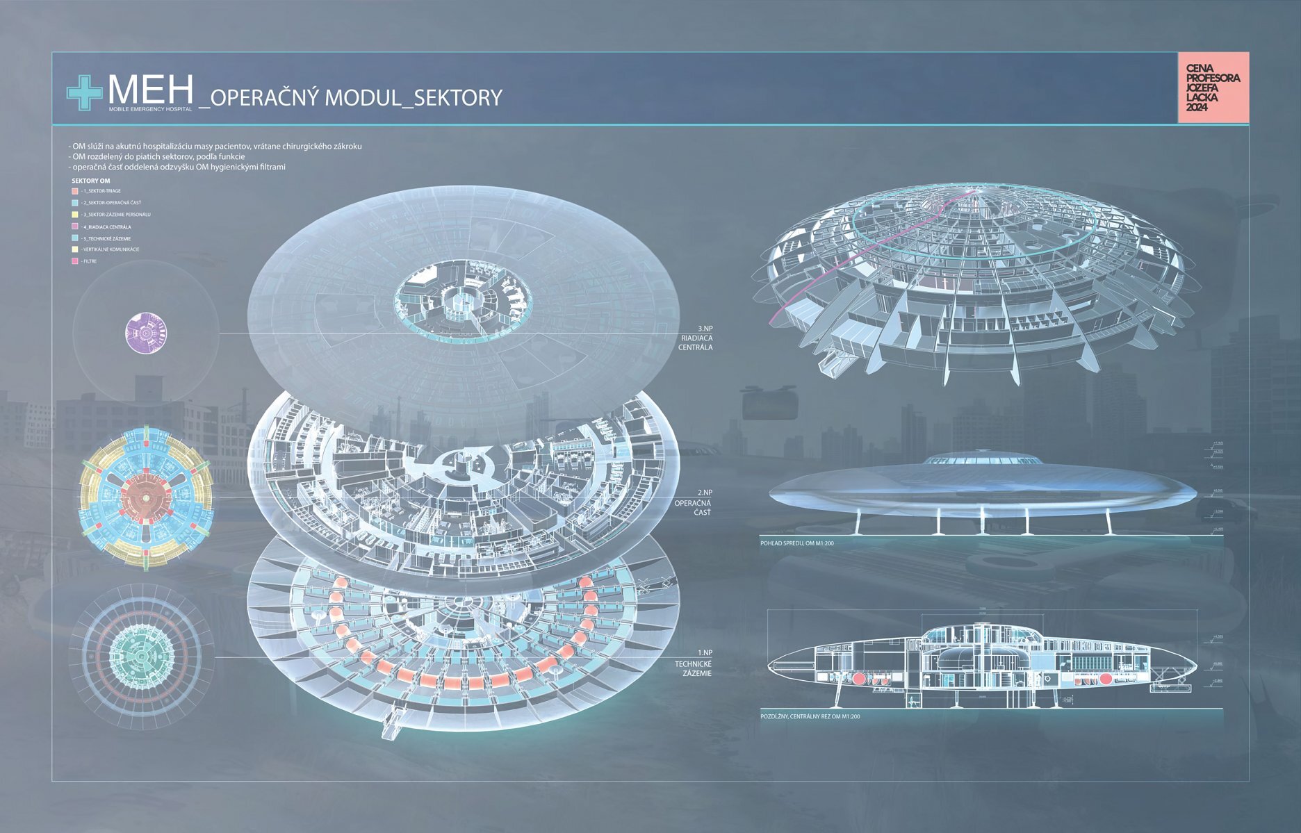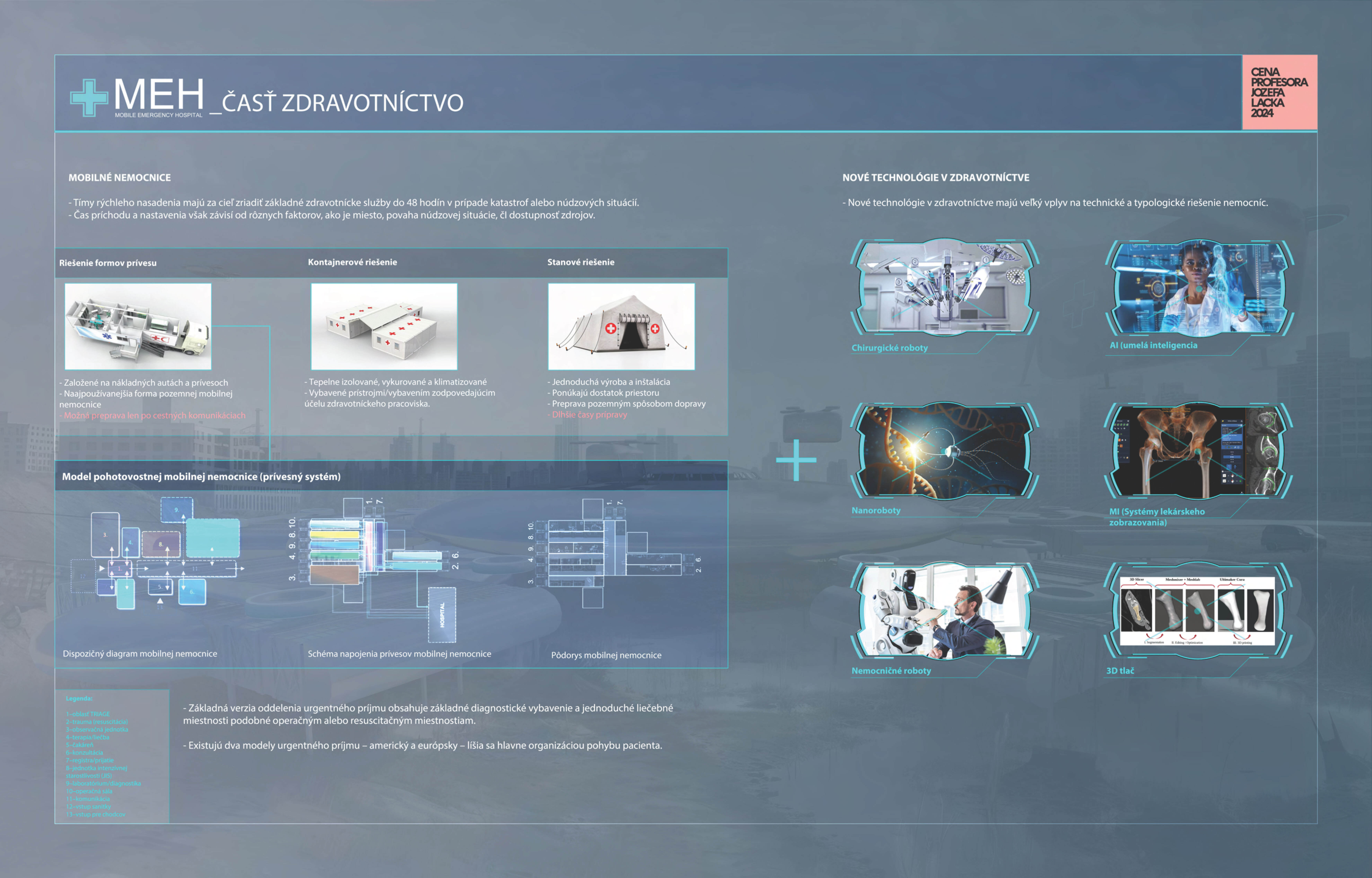 Dnes priblížime prácu "Mobilná pohotovostná nemocnica", ktorá vznikla na pôde Fakulty umení TU v Košiciach pod vedením Karola Gregora. Diplomant Peter Kopkáš sa venuje problematike akútnej hospitalizácie obyvateľstva počas krízových situácii. Hlavným cieľom práce je vytvorenie návrhu prototypu mobilnej pohotovostnej nemocnice (Mobile Emergency Hospital - MEH), ktorá je vizionárskym objektom spájajúcim architektúru s leteckou technikou.