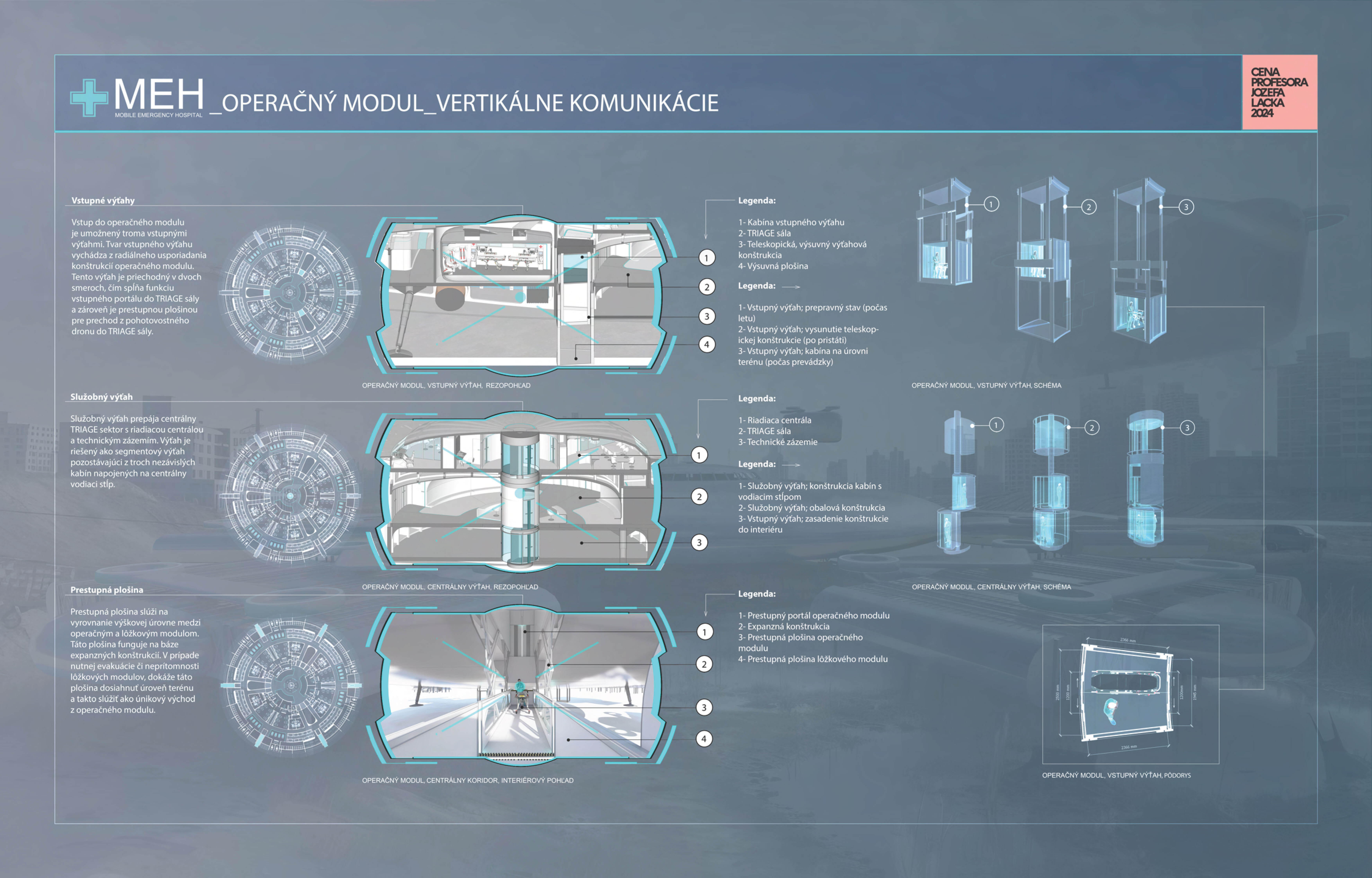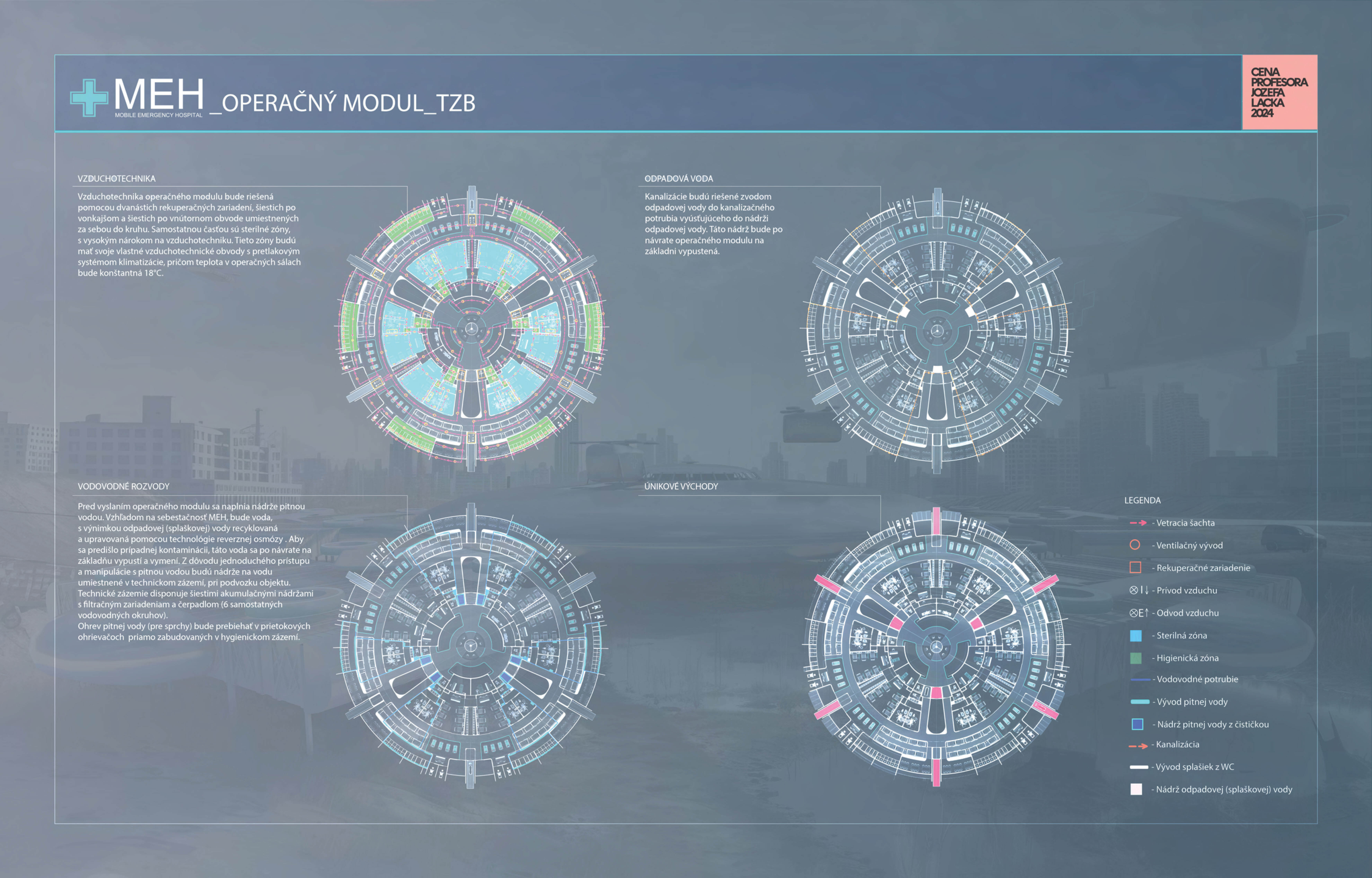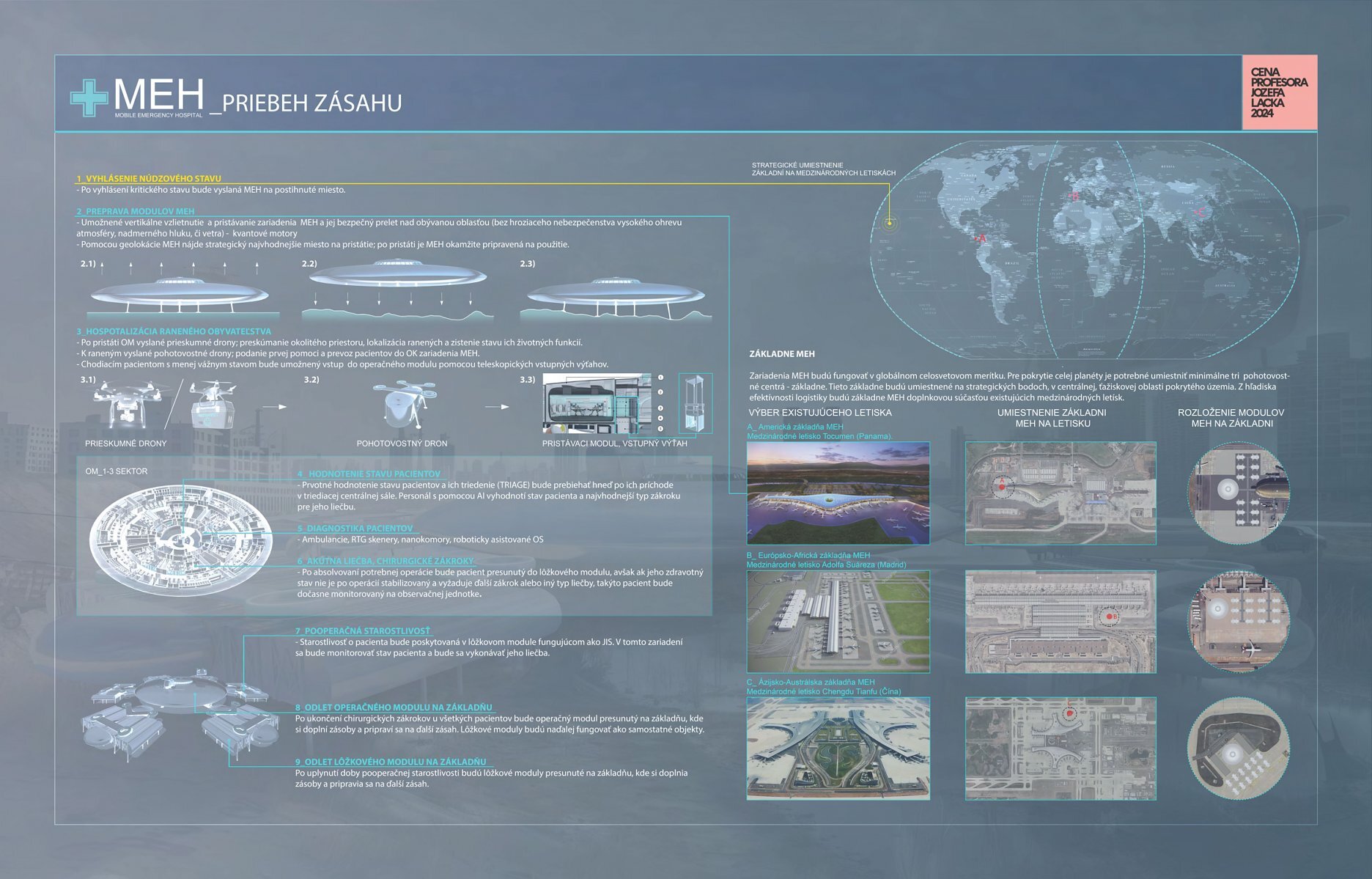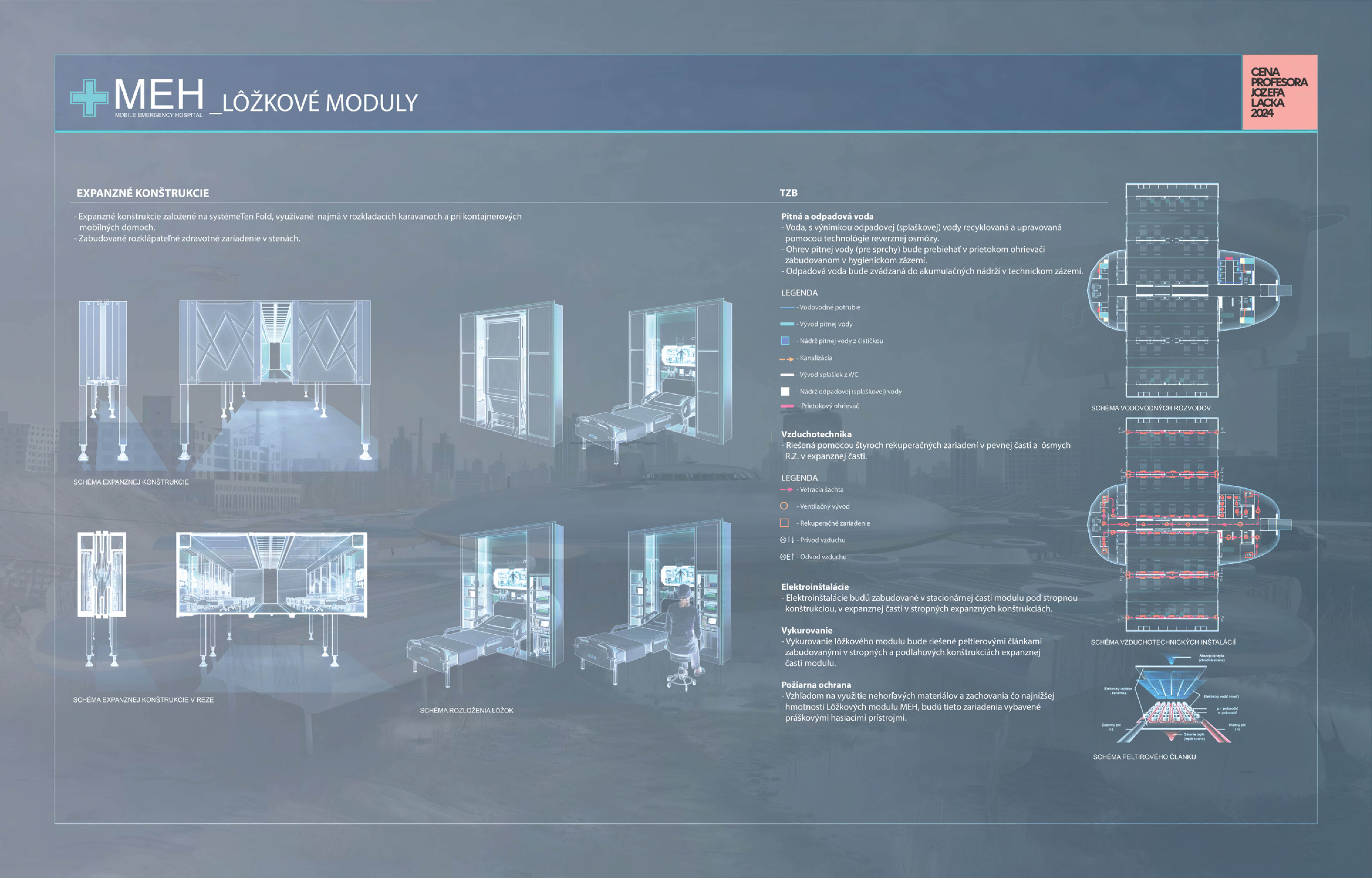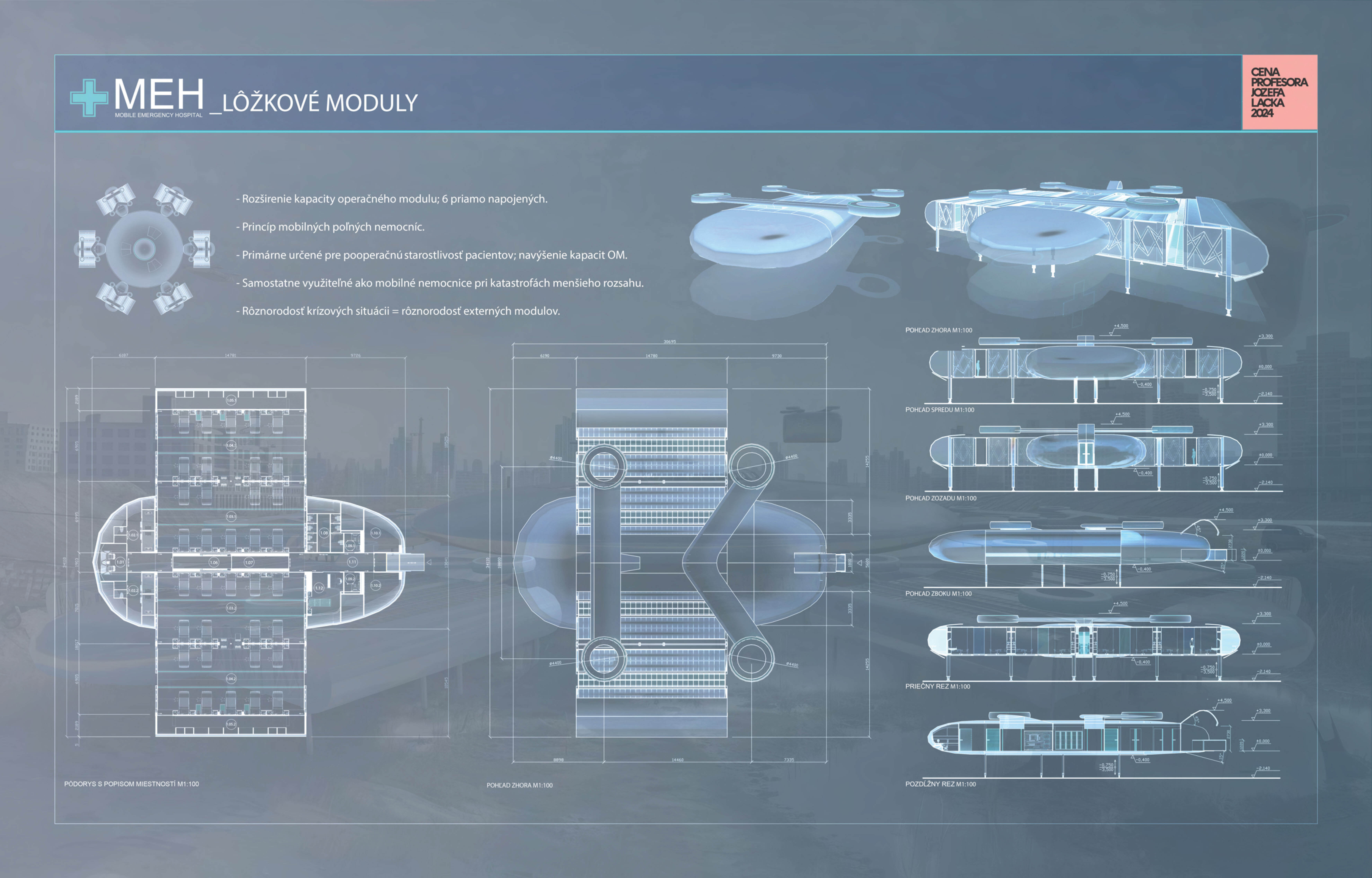 Dnes priblížime prácu "Mobilná pohotovostná nemocnica", ktorá vznikla na pôde Fakulty umení TU v Košiciach pod vedením Karola Gregora. Diplomant Peter Kopkáš sa venuje problematike akútnej hospitalizácie obyvateľstva počas krízových situácii. Hlavným cieľom práce je vytvorenie návrhu prototypu mobilnej pohotovostnej nemocnice (Mobile Emergency Hospital - MEH), ktorá je vizionárskym objektom spájajúcim architektúru s leteckou technikou.