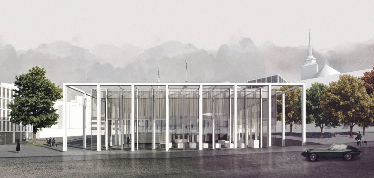 a) objem pavilónu vstupu je je orientovaný rovnobežne s významným hráčom v tomto urbanizme- Janáčkovým divadlom. Roh budovy, kde sa nachádza schodisko spájajúce starú a novú galérie, je orientovaný na osi tohto spojenia. Umiestnený je približne v strede pozemku pre dosiahnutie priestoru ako pre pavilón, tak aj pre historickú fasádu paláca a vytvorenie verejného priestoru, cez ktorý prechádzajú aj hlavné pešie ťahy. Tento verejný priestor je vymedzený naviac objemom polyfunkčného objektu galérie - verejnými funkciami, čo mu dáva predpoklad bohatého verejného života. Pavilón leží na rozmedzí 2 typov stvárnenia pozemku, medzi verejným spevneným povrchom námestia a zachovaným zeleným parkom.