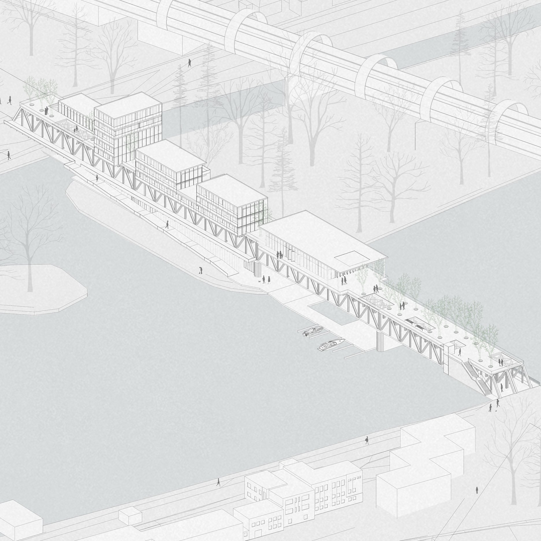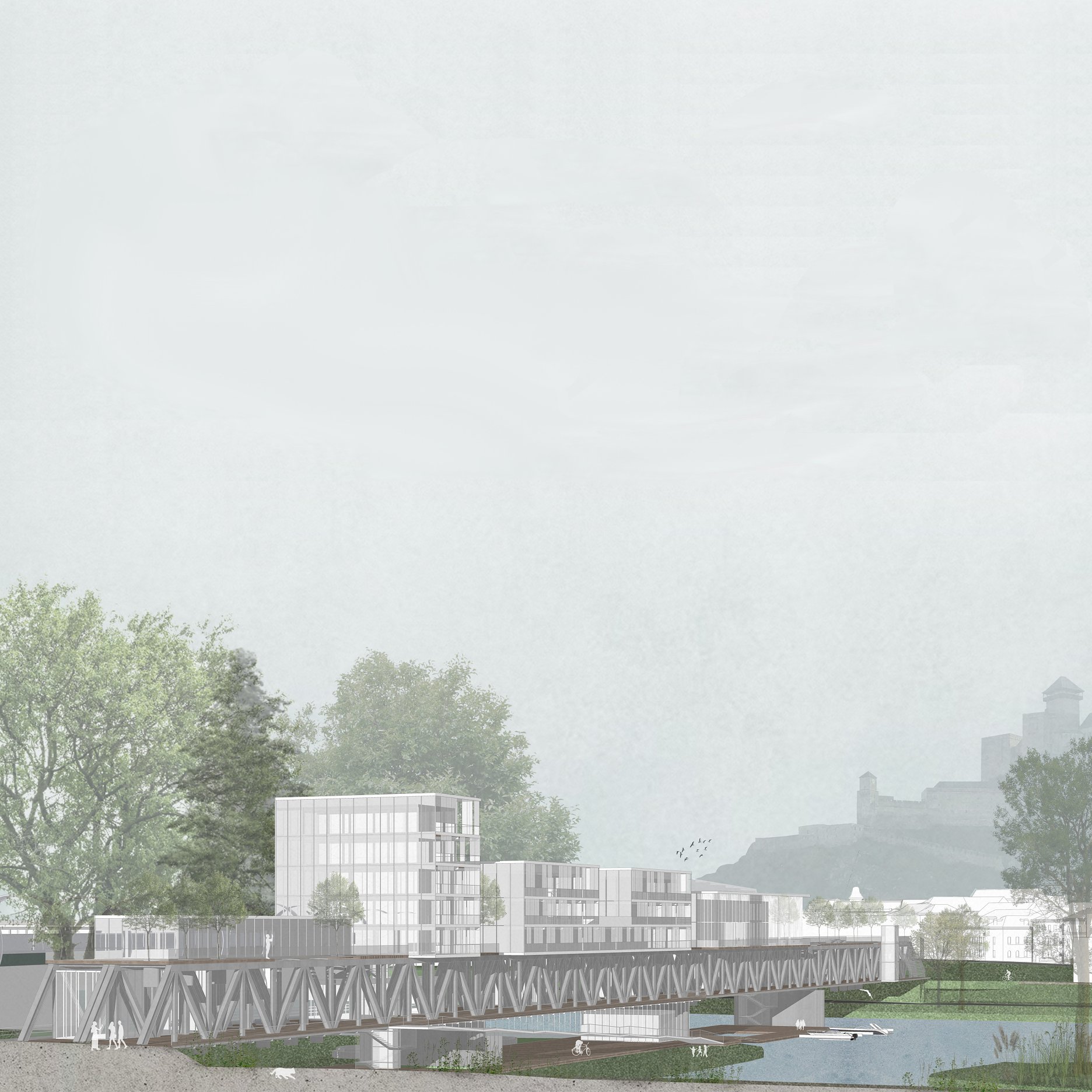 Na základe čítania historického a urbanistického kontextu autorka rešpektuje oceľovú priehradovú konštrukciu a dopĺňa ju ľahkými oceľovo-drevenými objemami s transparentnými fasádami. Program vkladá priamo do konštrukcie aj pod most: galériu s kaviarňou, čitárne, učebne, ateliéry, rezidenčné jednotky a multifunkčnú sieň. Návrh súčasne rieši bezbariérové napojenia, využitie podmostia a jemné krajinárske zásahy.